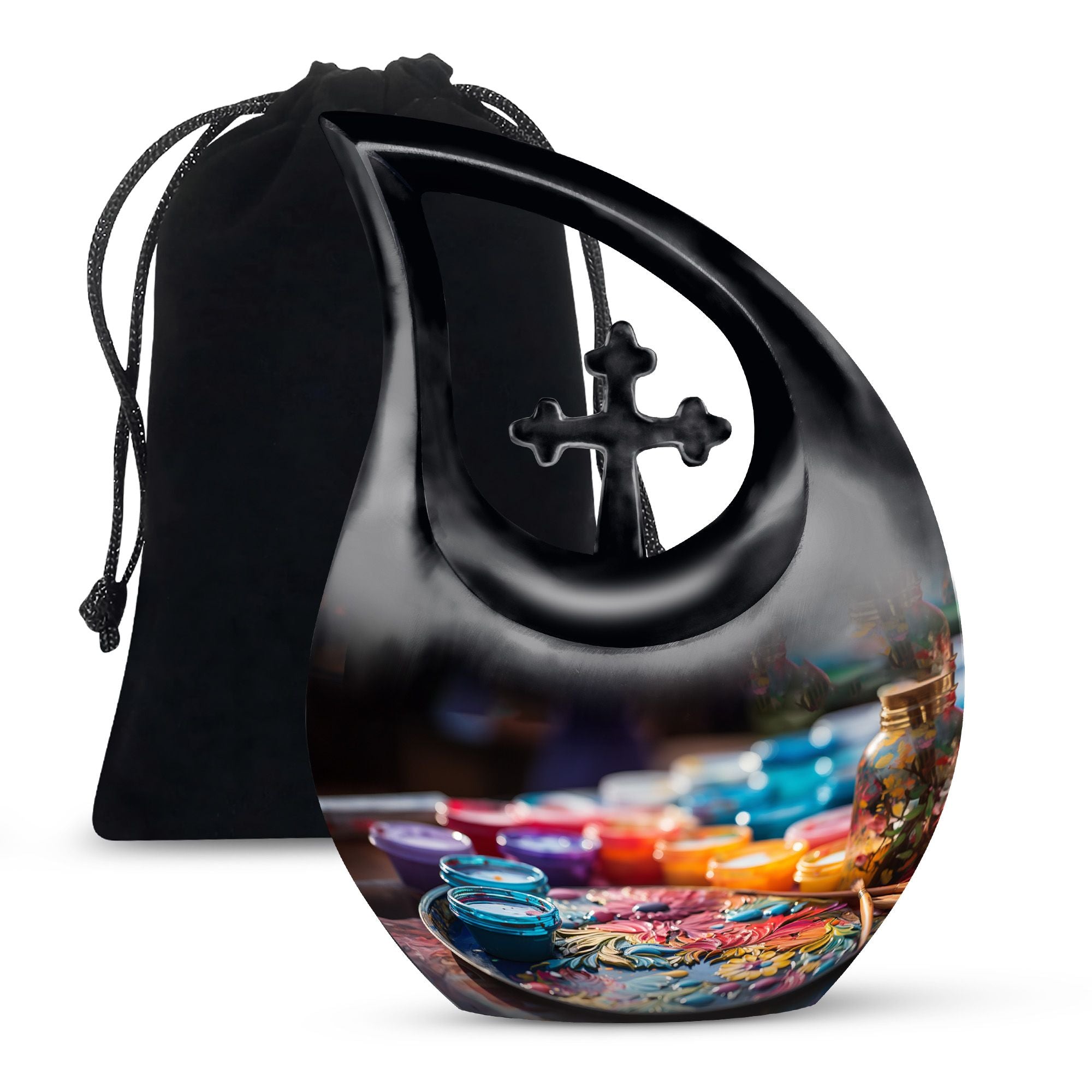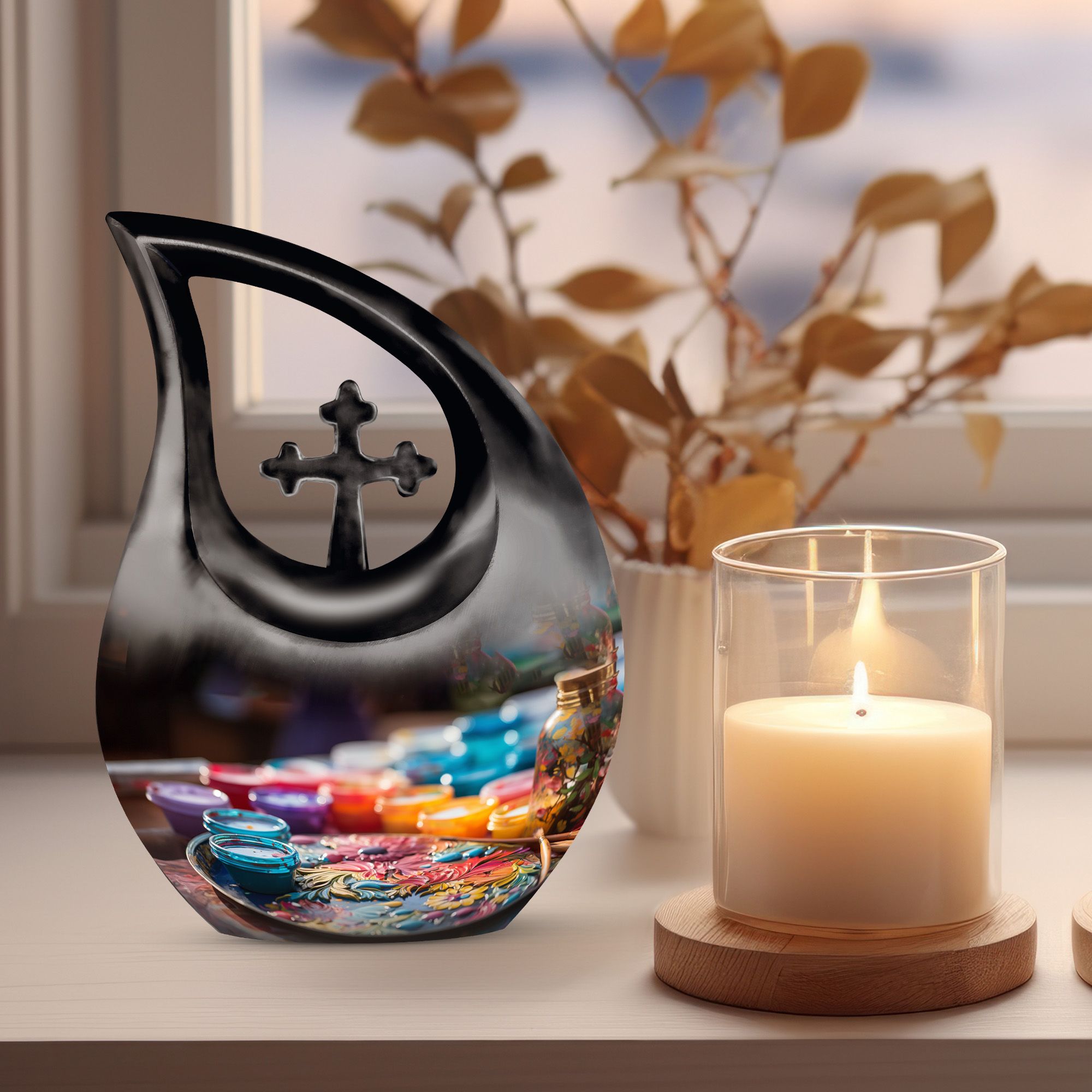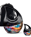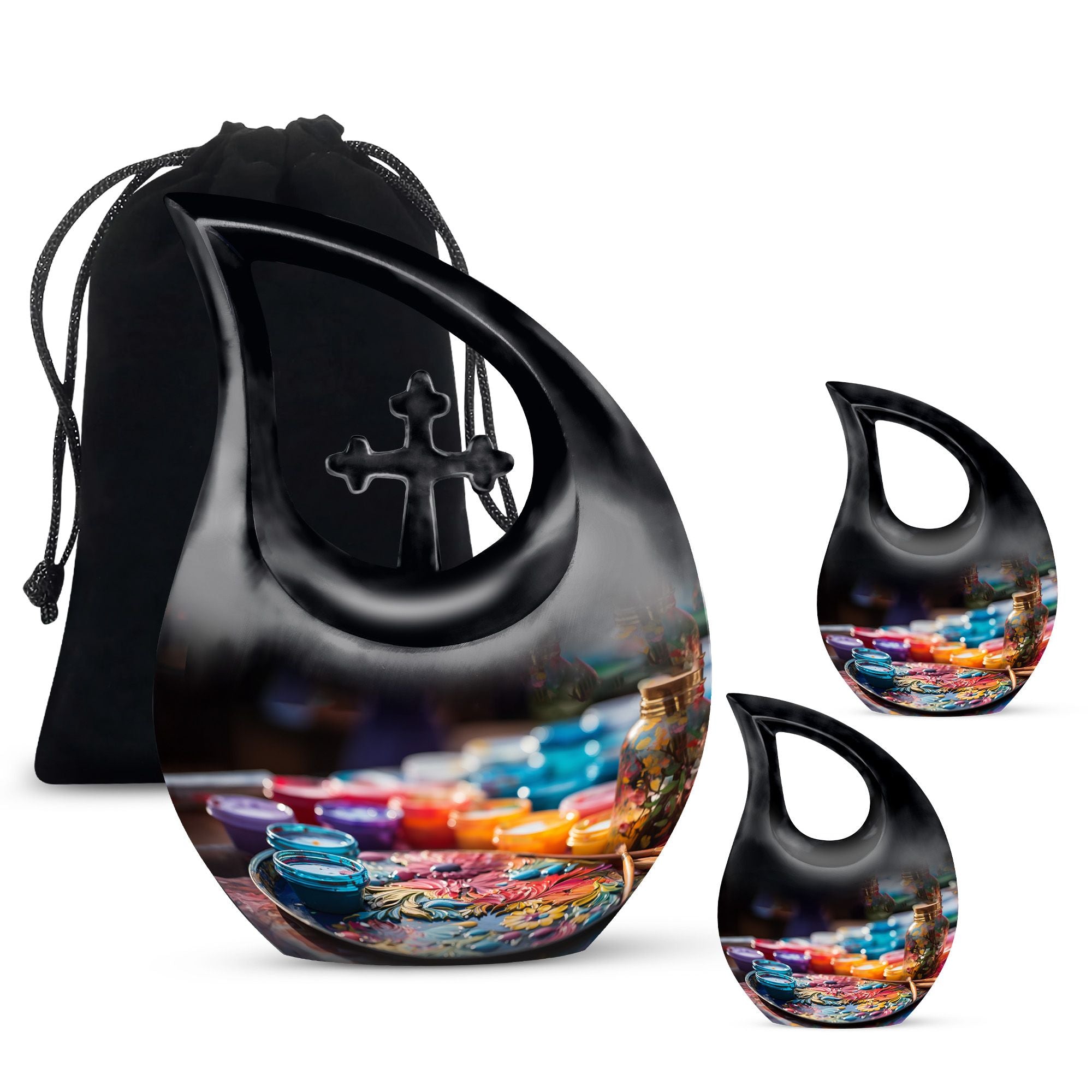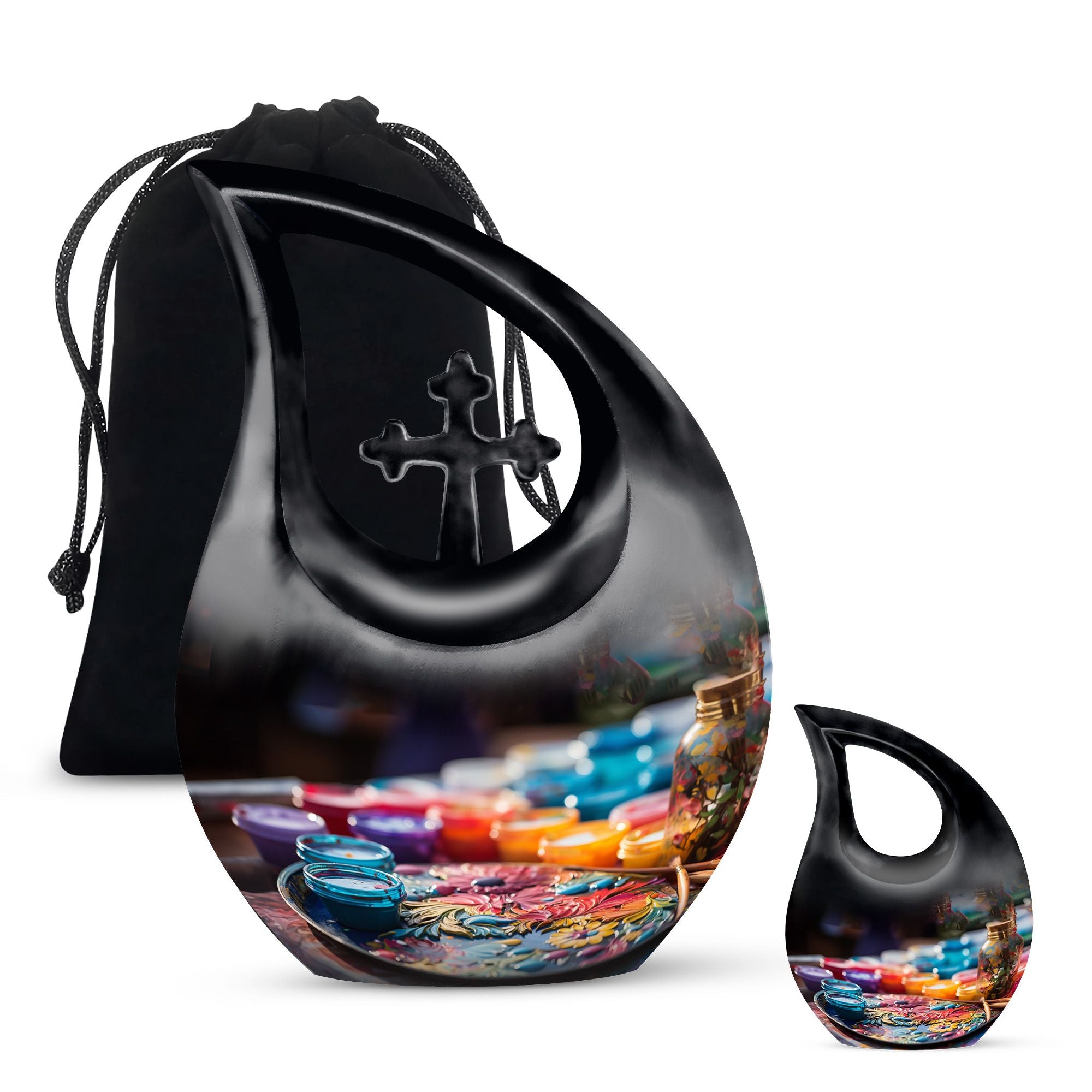 This matching large-and-keepsake set allows family members to share memorial pieces while honoring the artistic soul of the person they loved. Its expressive artwork and vibrant colors create a meaningful presence in any memorial space.