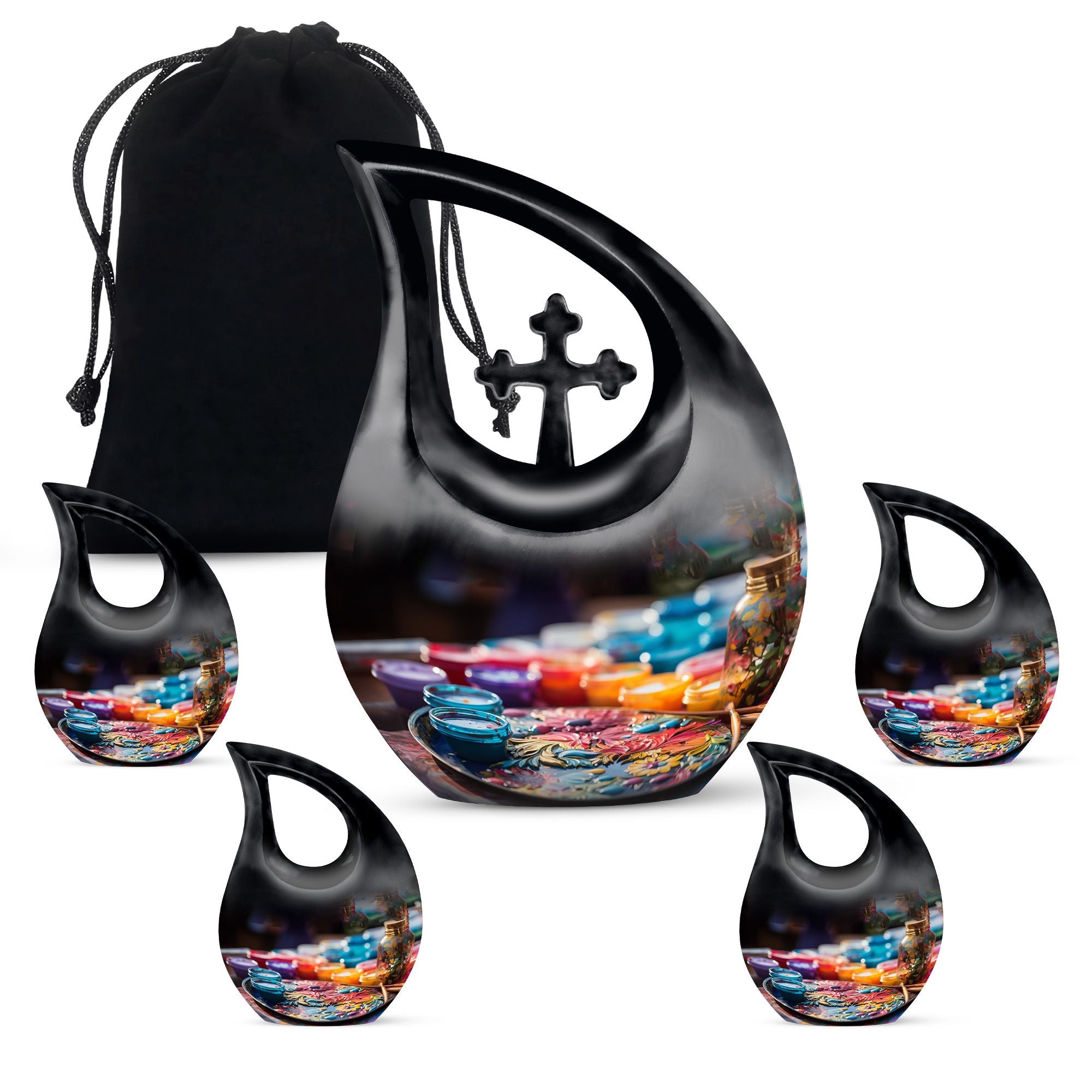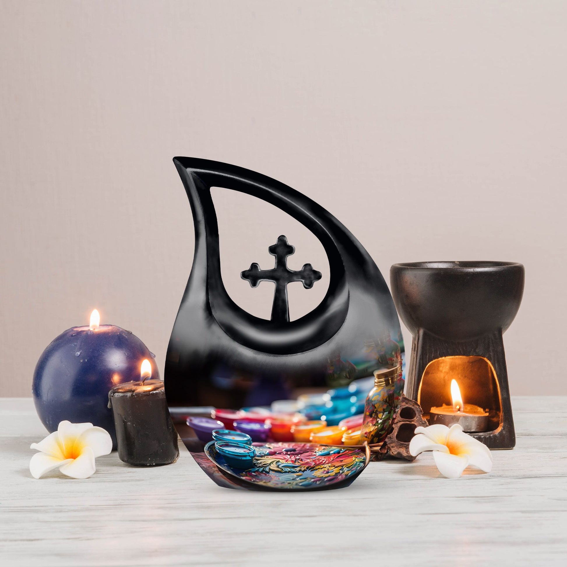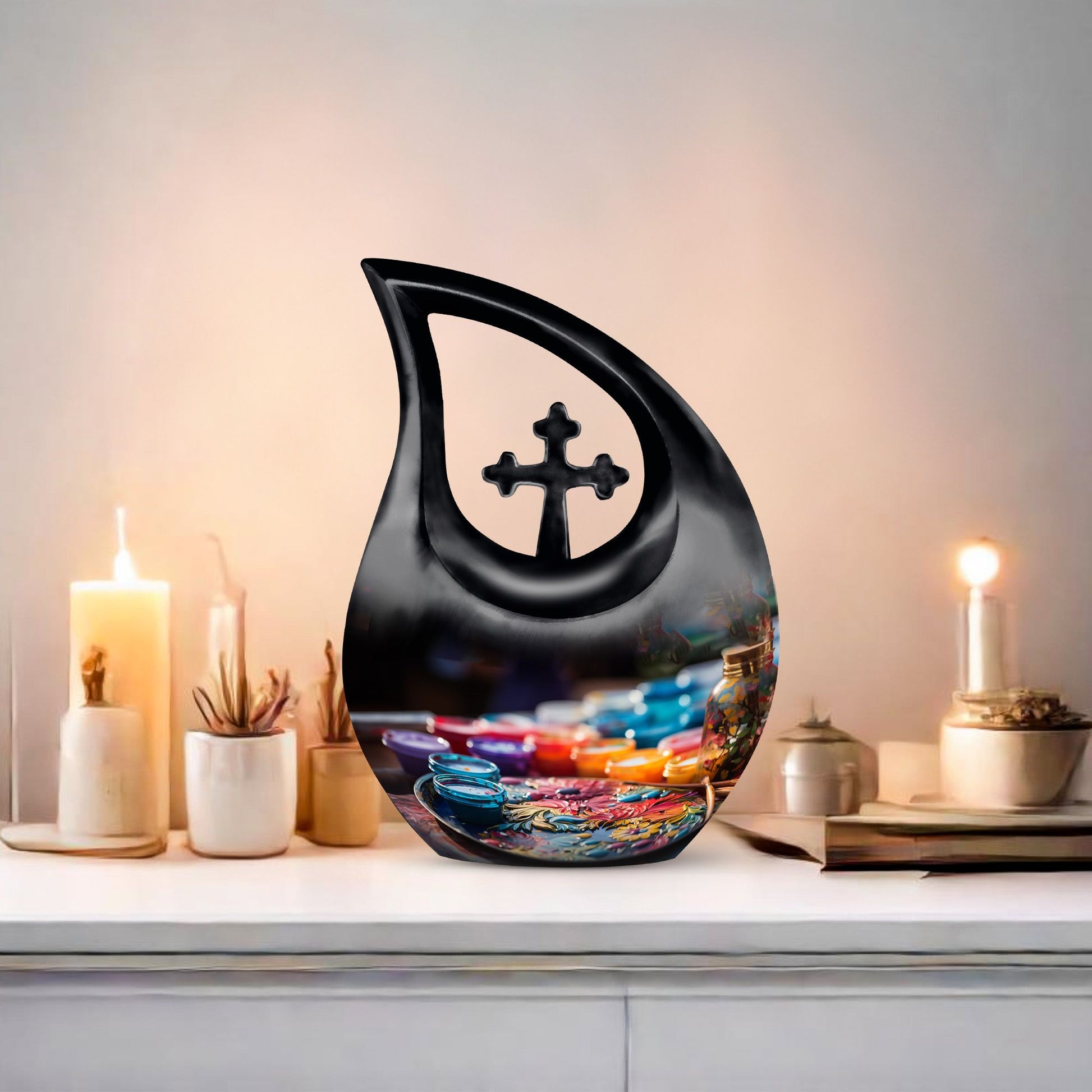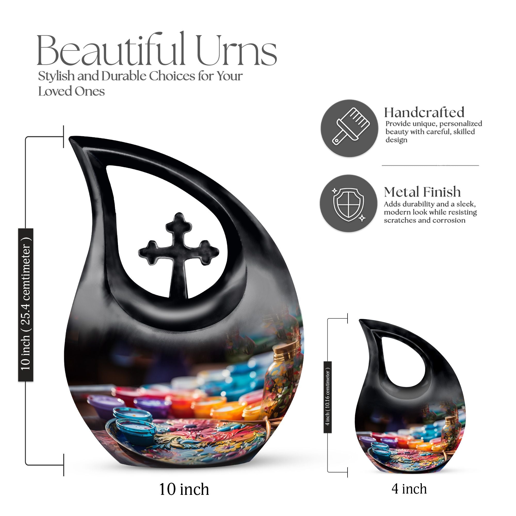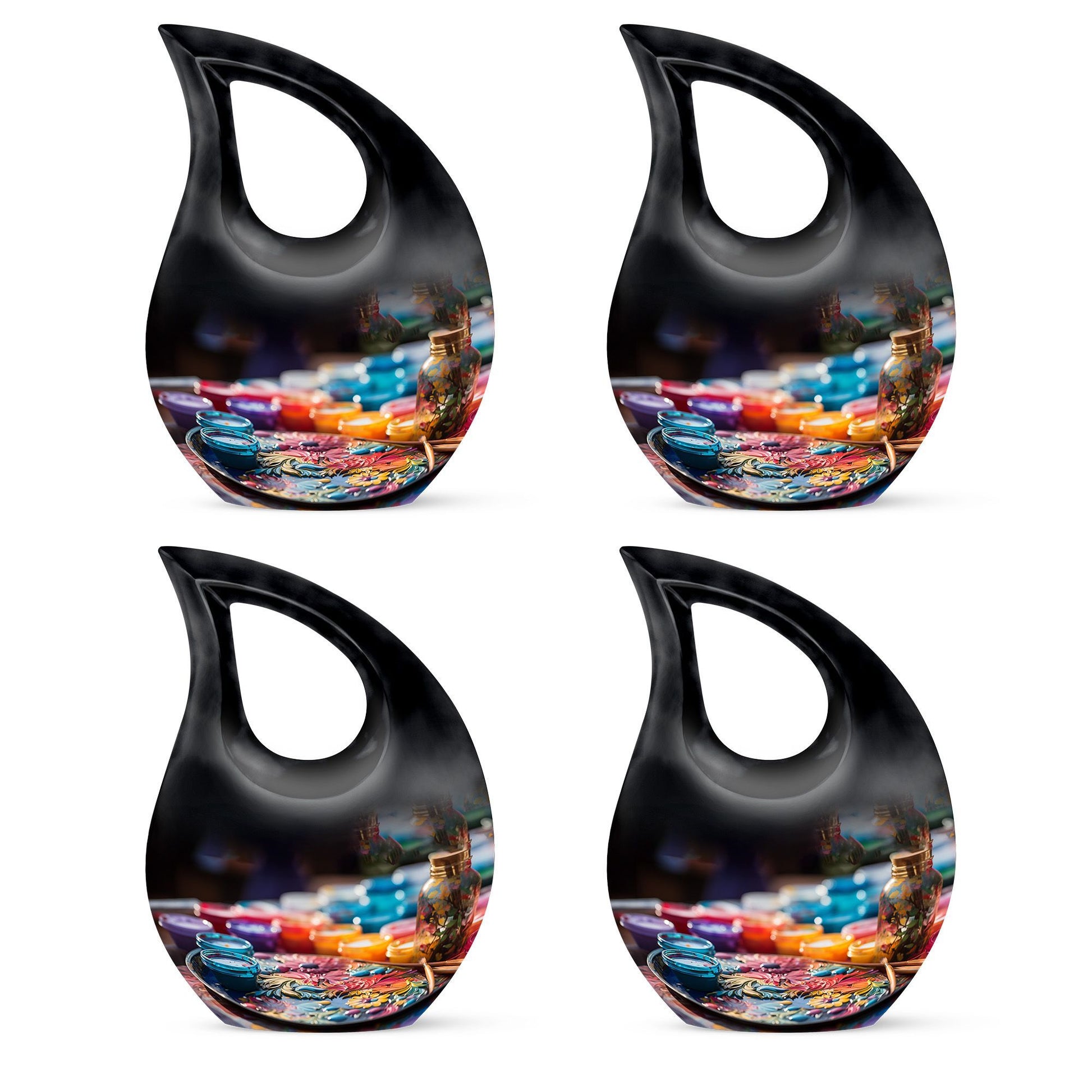 This matching large-and-keepsake set allows family members to share memorial pieces while honoring the artistic soul of the person they loved. Its expressive artwork and vibrant colors create a meaningful presence in any memorial space.