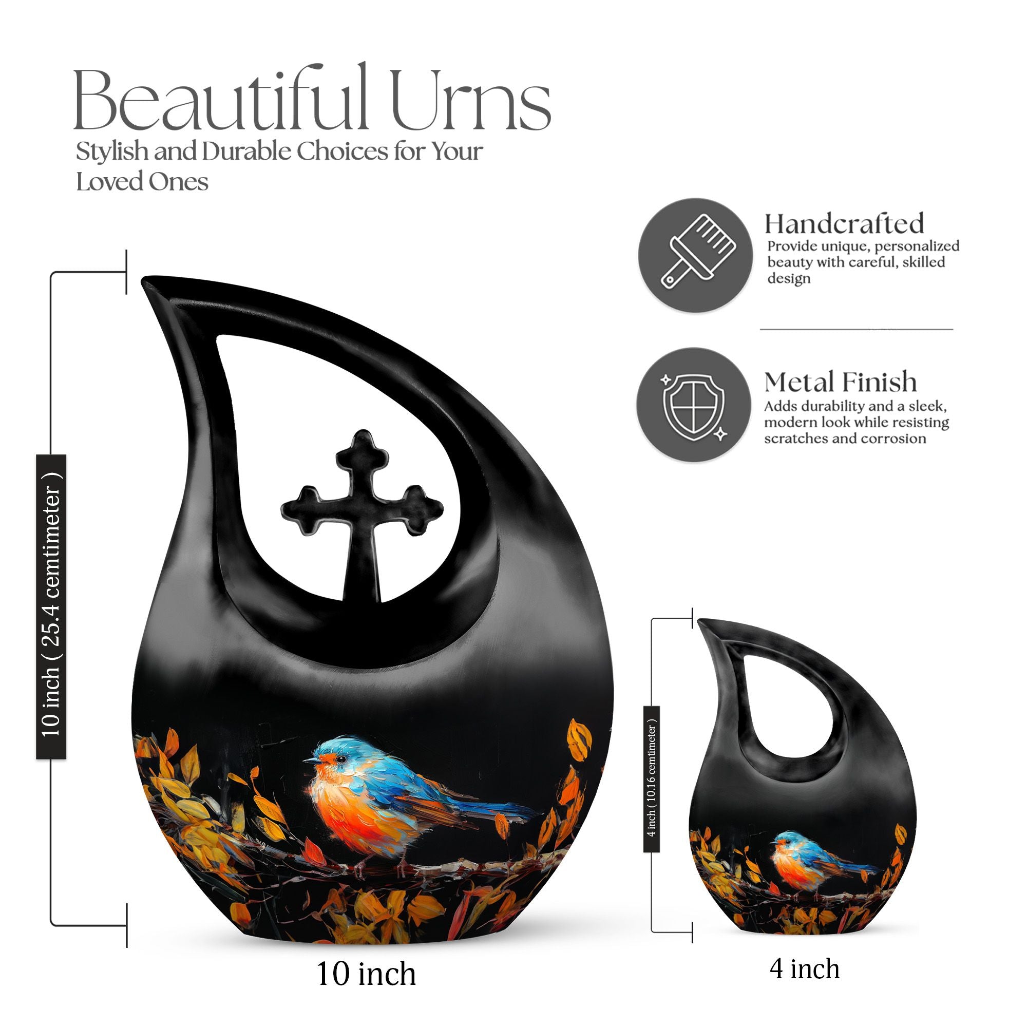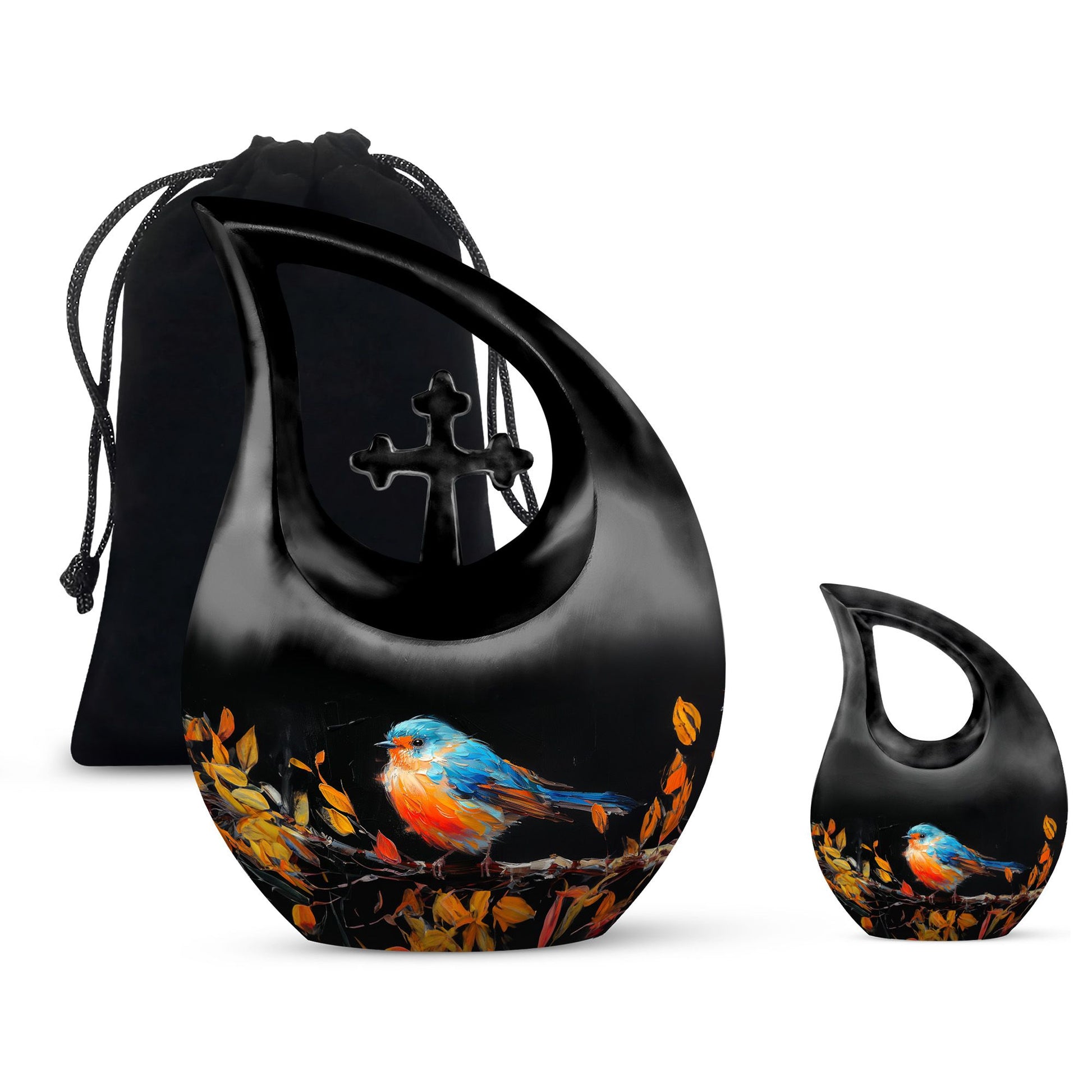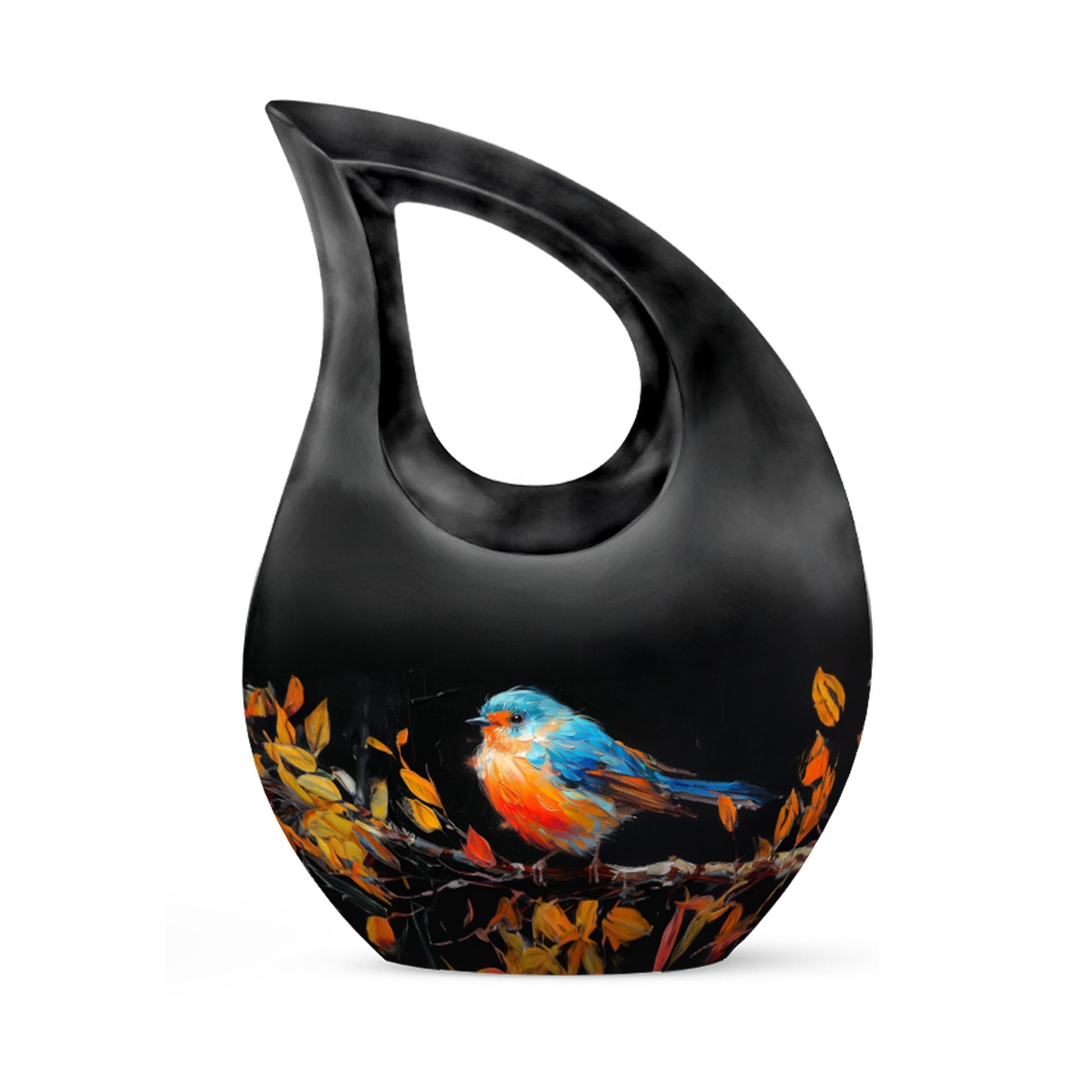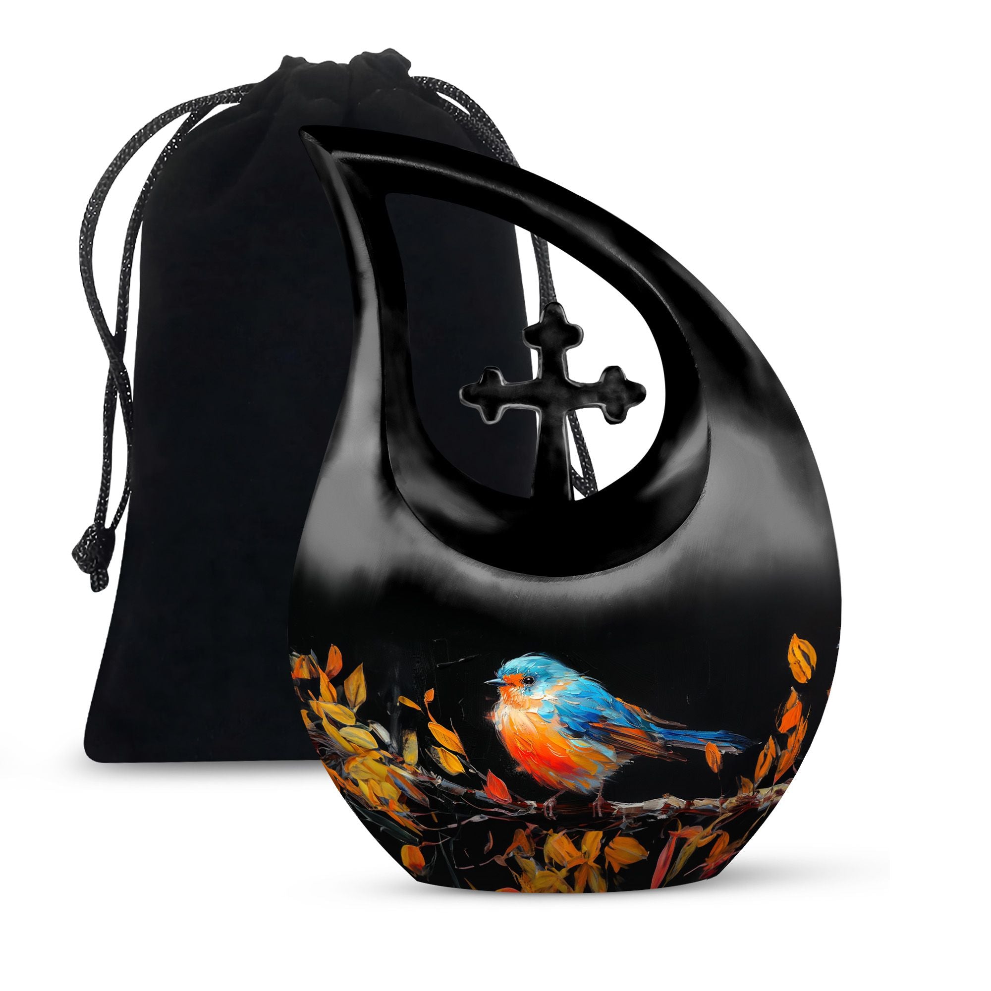 Celebrate the life of your dearly departed with our Autumnal Brushstroke Bird Urn. This singular piece, measuring 10 inches in height, is perfect for adults and seniors in search of dignified memorial ceremony supplies. Crafted from robust Aluminium, this urn weighs a sturdy 3.3 pounds offering you confidence in its durability. Ideal for those looking for large urns, this variety holds an impressive capacity of 200 cubic inches. The urn's unique theme blends the solace of autumn with a delicate bird motif, all housed in a graceful cross-drop design. Beyond its aesthetic appeal, we offer personalization options allowing you to engrave names, a special way to keep your loved ones' memory alive. Accompanied by a velvet pouch, preserving the ashes becomes convenient and honorific. Whether you are on the lookout for keepsake cremation urns, religious urns, funeral urns for sale, or urns that can be buried, our Autumnal Brushstroke Bird Urn stands as a testament to your love and remembrance.