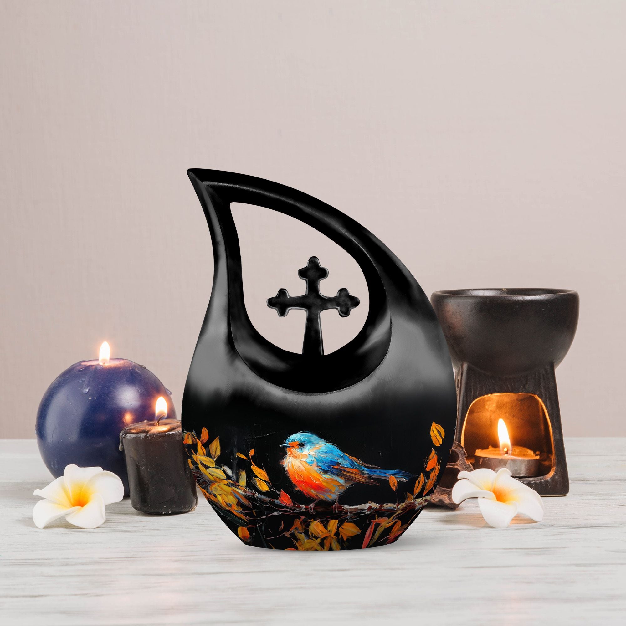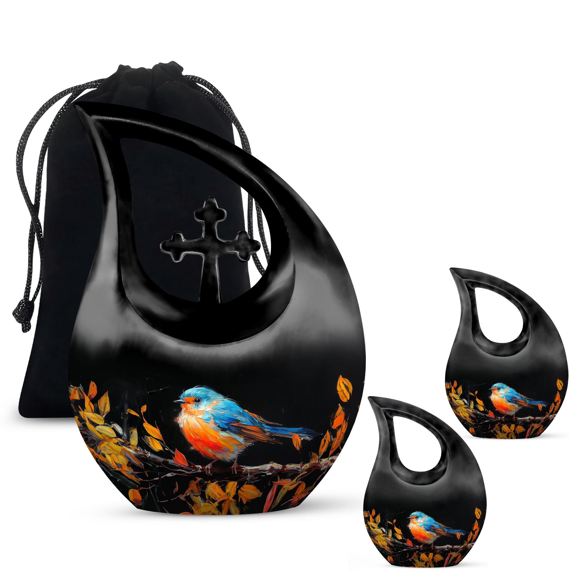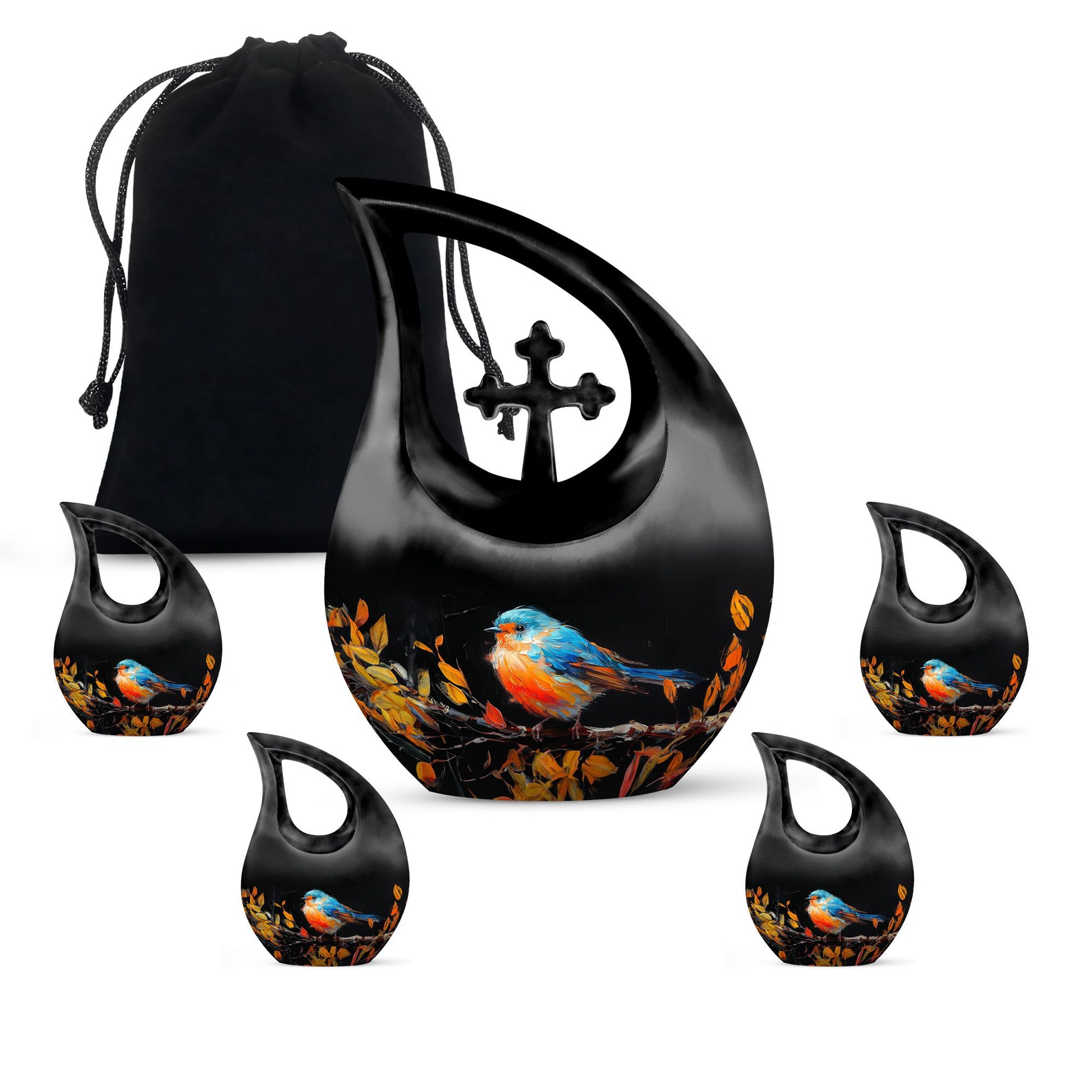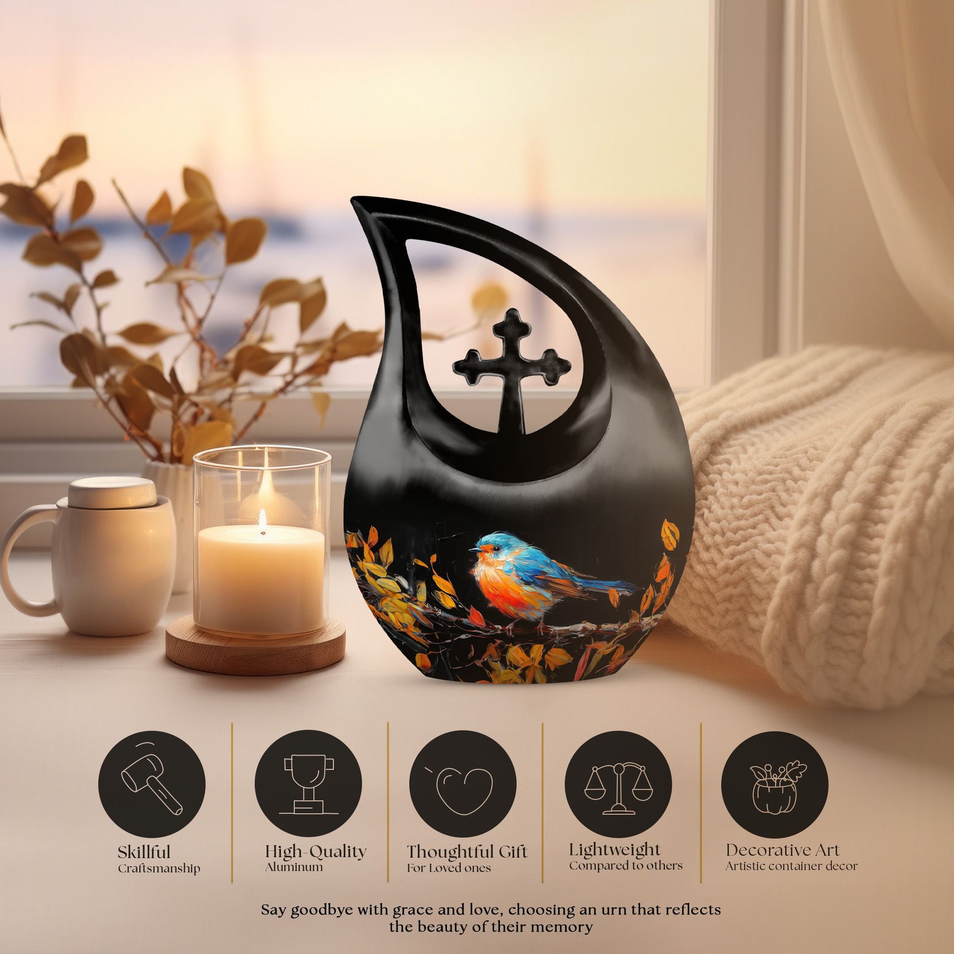 Celebrate the life of your dearly departed with our Autumnal Brushstroke Bird Urn. This singular piece, measuring 10 inches in height, is perfect for adults and seniors in search of dignified memorial ceremony supplies. Crafted from robust Aluminium, this urn weighs a sturdy 3.3 pounds offering you confidence in its durability. Ideal for those looking for large urns, this variety holds an impressive capacity of 200 cubic inches. The urn's unique theme blends the solace of autumn with a delicate bird motif, all housed in a graceful cross-drop design. Beyond its aesthetic appeal, we offer personalization options allowing you to engrave names, a special way to keep your loved ones' memory alive. Accompanied by a velvet pouch, preserving the ashes becomes convenient and honorific. Whether you are on the lookout for keepsake cremation urns, religious urns, funeral urns for sale, or urns that can be buried, our Autumnal Brushstroke Bird Urn stands as a testament to your love and remembrance.
