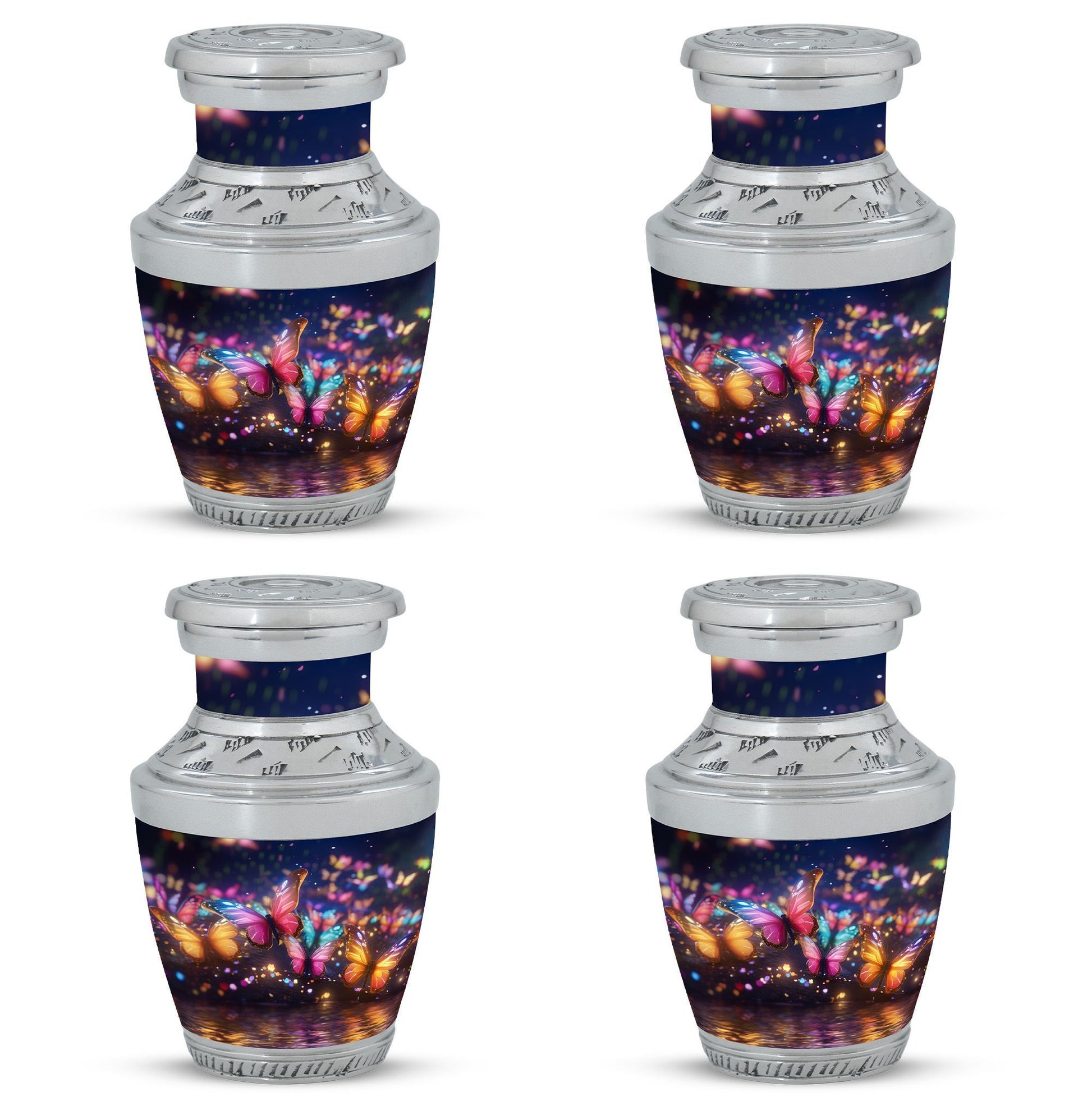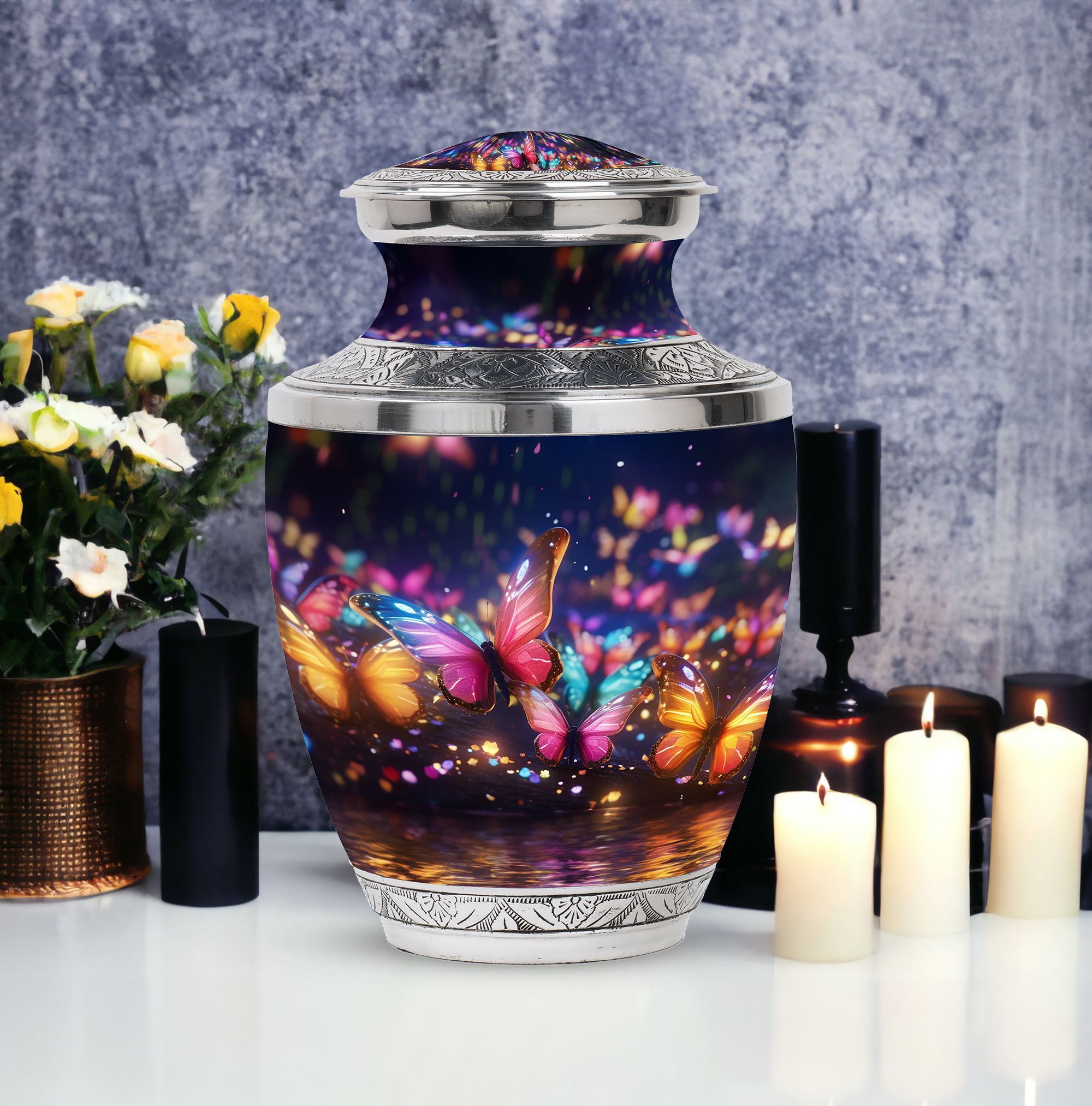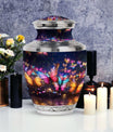 Exhibit your graceful tribute to a lost loved one with our meticulously constructed 'Butterflies in Forest Memorial Urn'. Specifically designed for adult and senior citizens seeking for an elegant repository, this cremation urn renders more than the mere retention of ashes. Standing 10 inches high with a weight of 3.3 pounds, the 3-Inch urn boasts a captivating capacity of 200 cubic inches. Crafted from robust Aluminium, our 'Classic Urn' design delivers both glamour and durability, a timeless memorial piece for your cherished memories . Along with the urn comes a refined velvet pouch, providing a sophisticated enclosure for the ashes. Personalize it with engraved names to add a warm, personal touch. Immerse yourself in the symbolism of the 'Butterflies in Forest Memorial Urn.