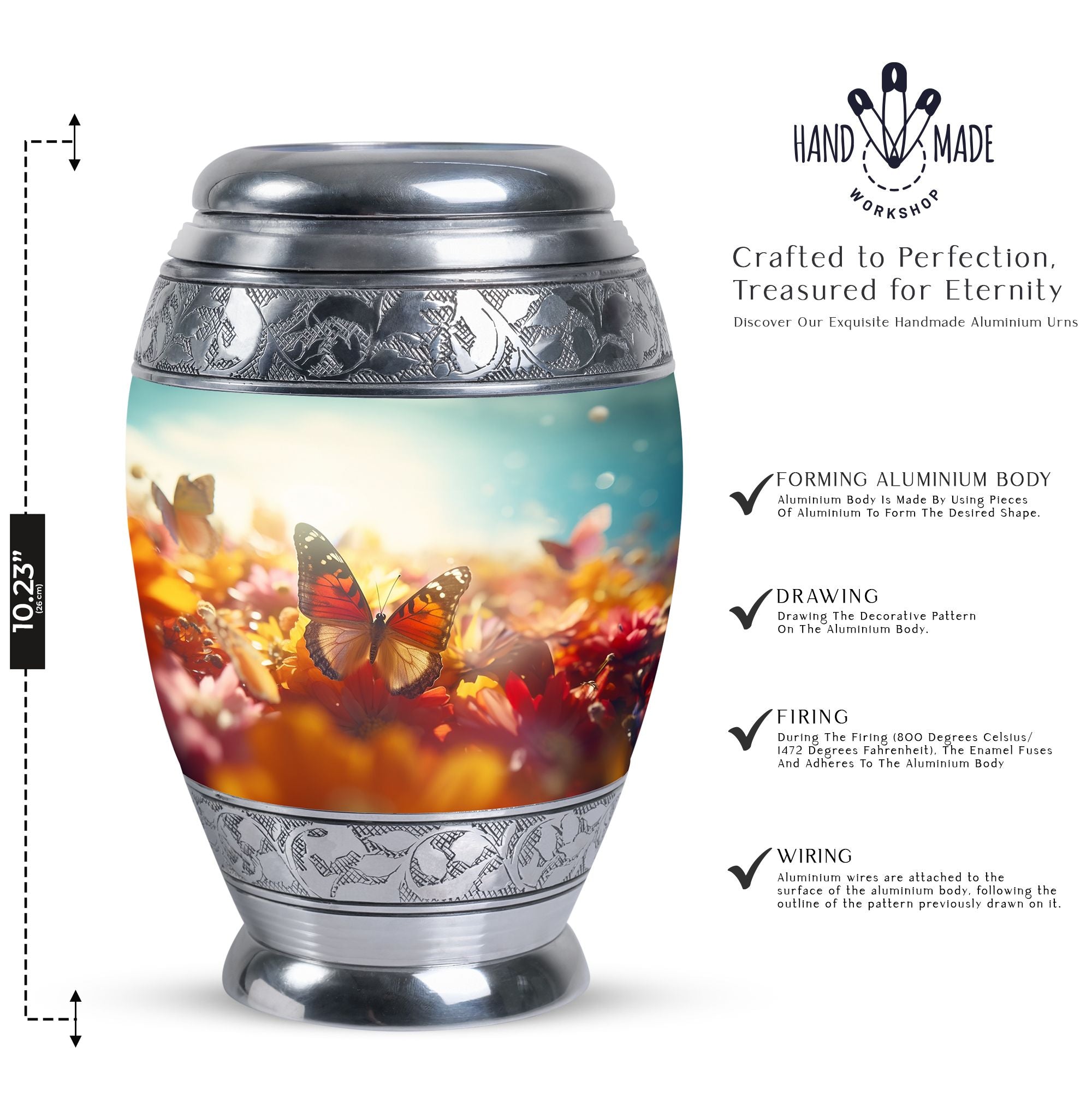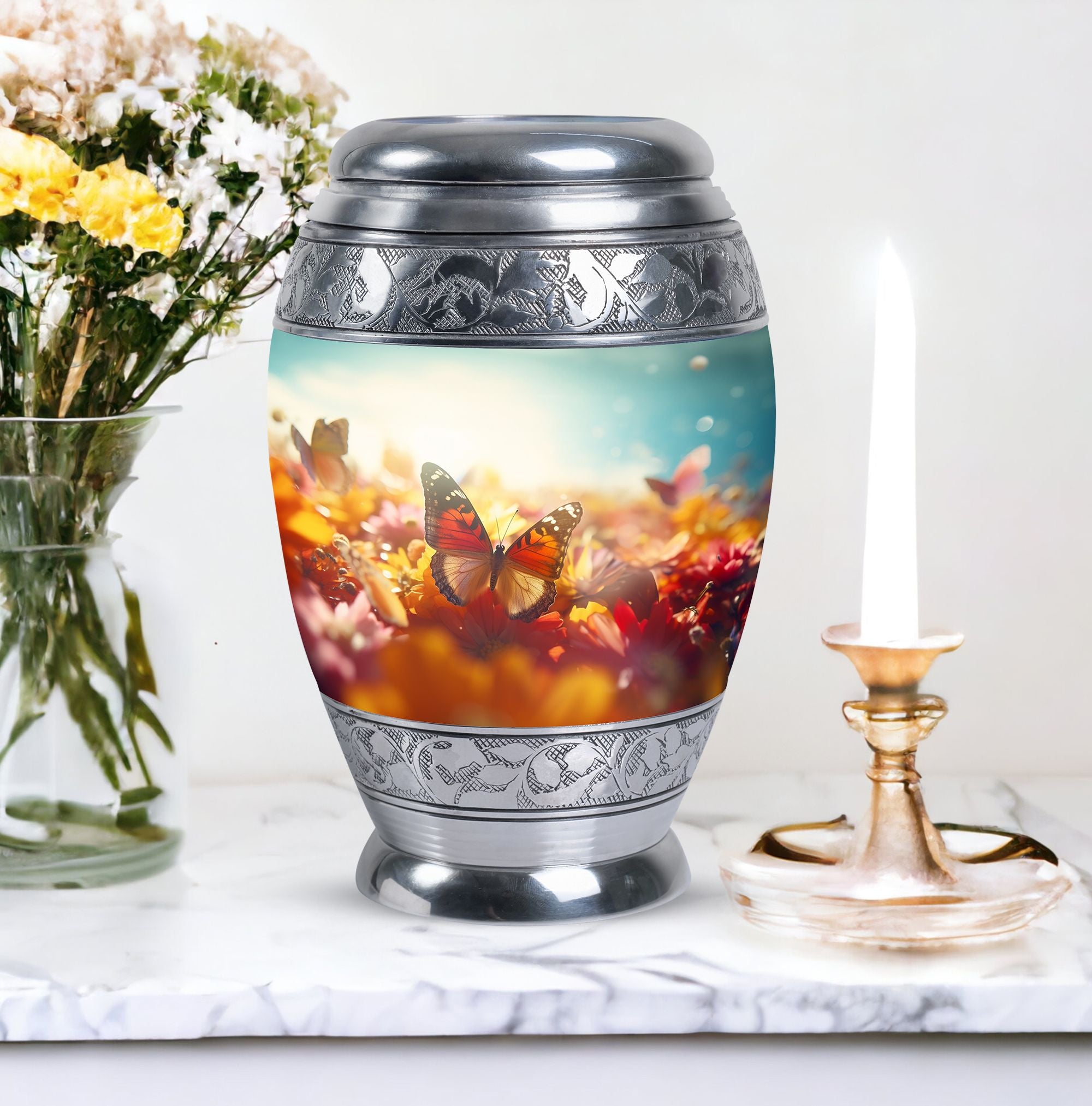 Behold the beauty of our Butterflies Urn for Ashes, a magnificent memorial piece fashioned for adult cremains. Reverently crafted with exquisite detail, this piece serves as an endearing tribute and a serene resting place for the remains of loved ones. The iridescent butterflies finely embellished on the urn symbolize enduring spirit, making it a poignant pick for preserving precious memories. A cost-effective yet dignified choice, it makes for an affordable alternative to customary funeral urns for ashes. As an integral part of your mourning process, this urn offers profound sentiments, serving as an eternal resting place for your cherished individual. Perfect for those seeking to pay respectful homage without compromising on aesthetics or budget, this urn encompasses the heartfelt sentiments associated with a dearly departed life. Optimized for the search terms 'cheap urns for human ashes' and 'urn ashes', pinpoint our Butterfly Urn in your search for a well-appointed memorial urn with ease.