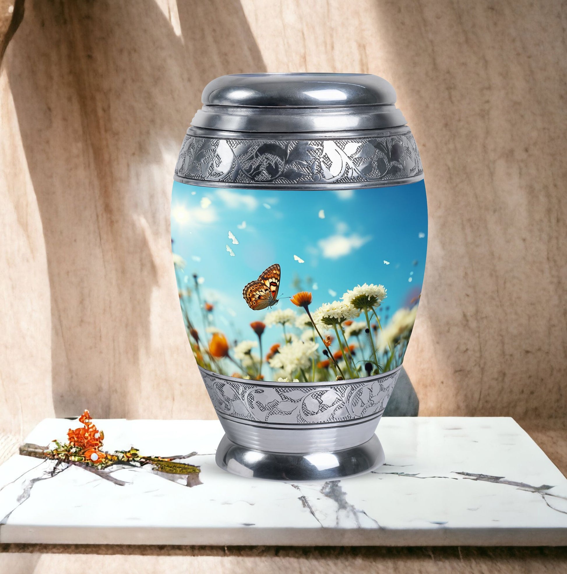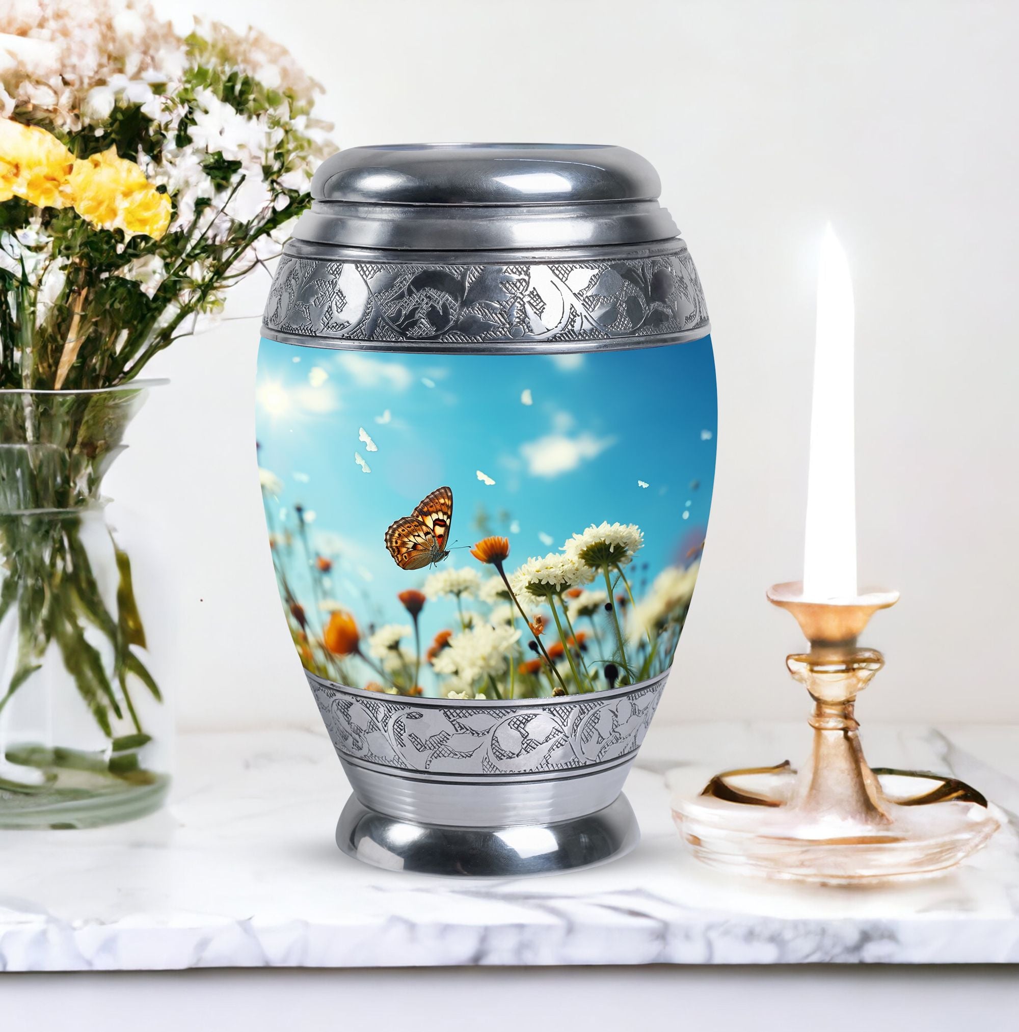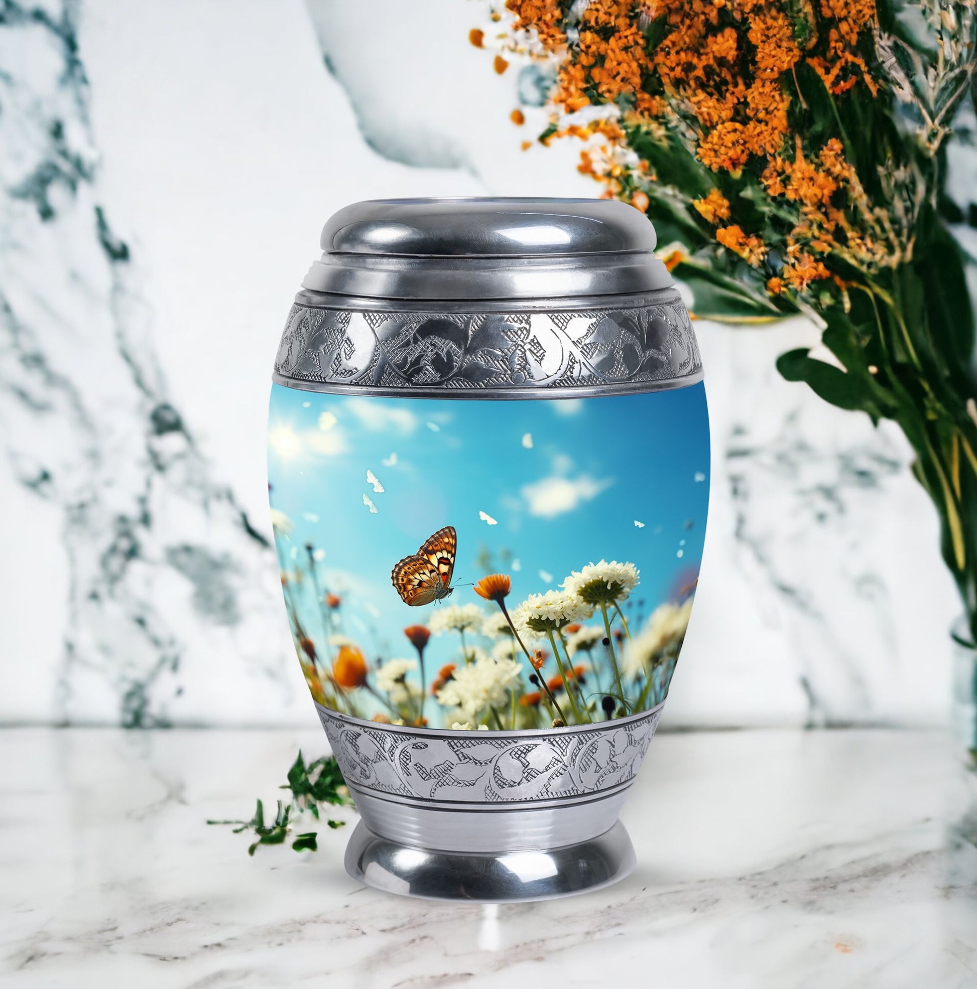 Experience tranquility in times of sorrow with our ‘Butterflies Morning Urn’. Subtly adorned with decorative motifs, this Adult Cremation Urn stands as a peaceful testament to the life of your loved one. Crafted with meticulous care, it provides an elegant, dignified manner to pay respect and fondly remember those who have passed. Designed to hold Memorial Urns for Human Ashes, this urn signifies a promise that even after the farewell, their memory will continue to flutter in your heart like morning butterflies. Seamlessly blending in with your home decor, it brings an element of tranquility, offering comfort in the presence of their memoir. This isn't just a cremation urn, but a thoughtful tribute cherishing the completion of a life well-lived. Our Butterflies Morning Urn is a perfect choice for ensuring the preservation of precious memories.