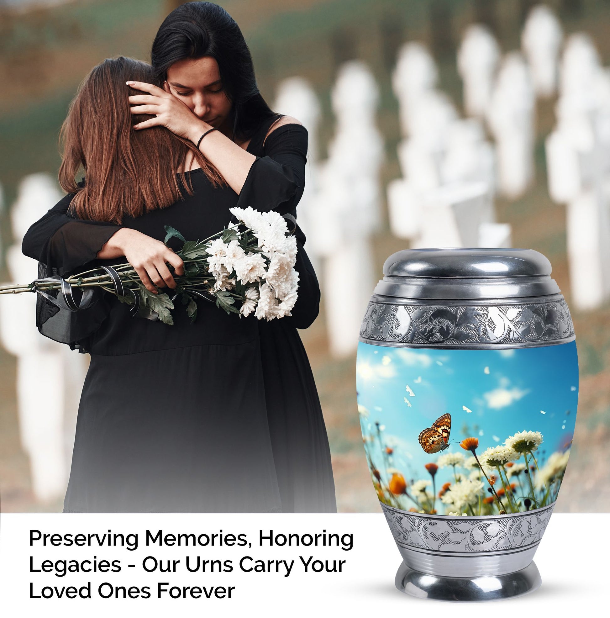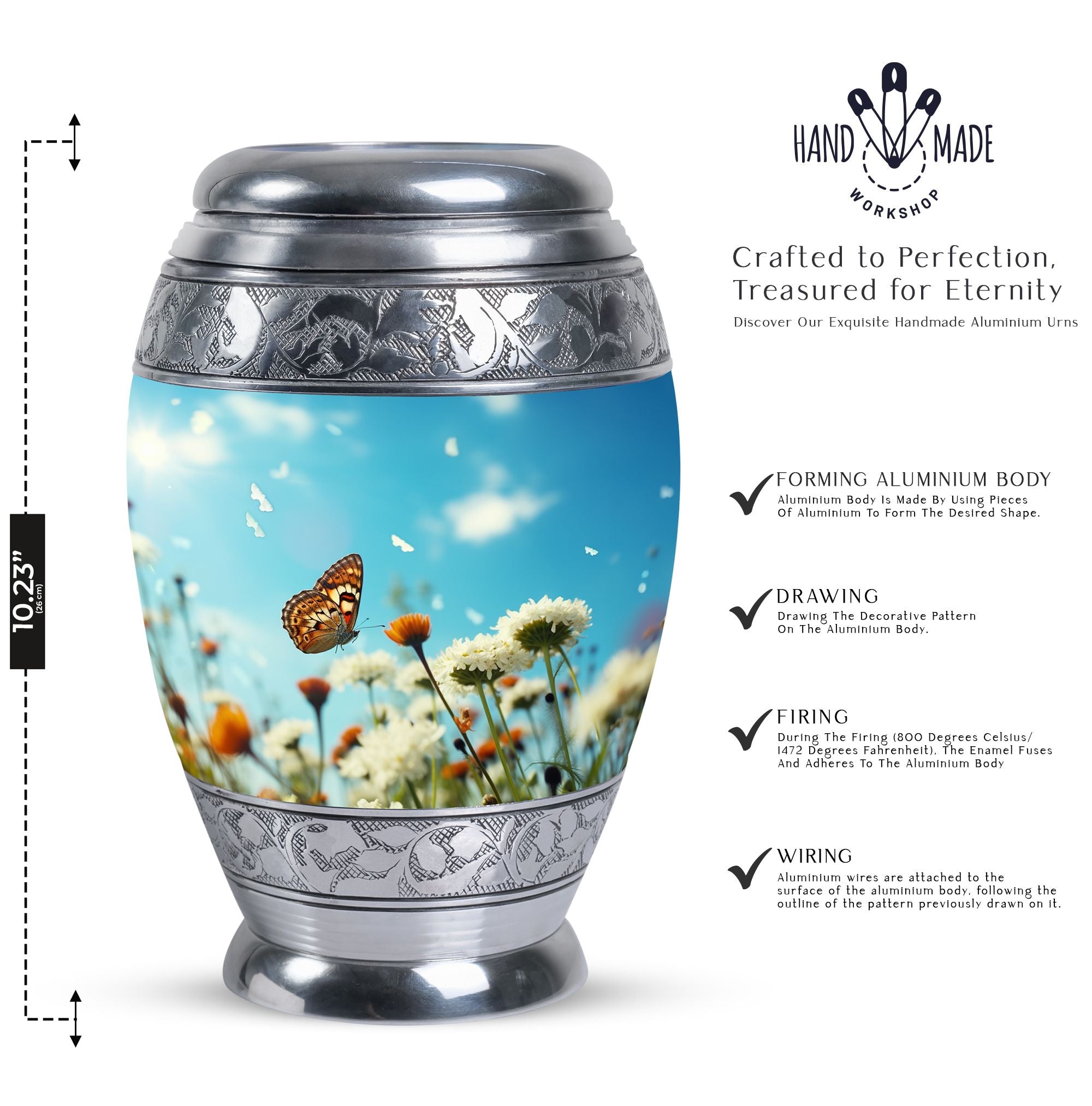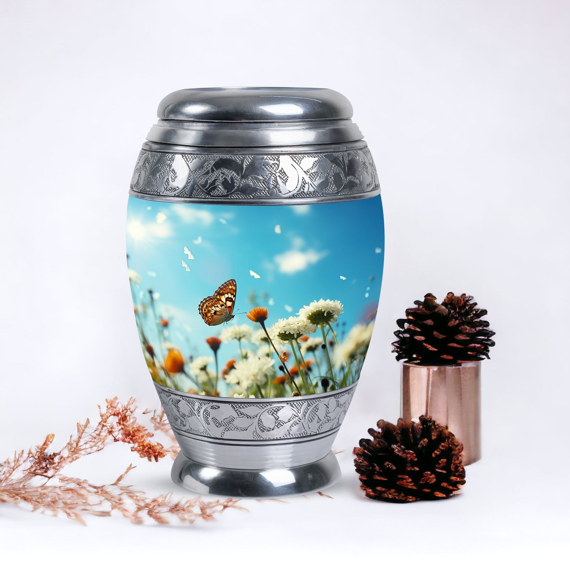 Experience tranquility in times of sorrow with our ‘Butterflies Morning Urn’. Subtly adorned with decorative motifs, this Adult Cremation Urn stands as a peaceful testament to the life of your loved one. Crafted with meticulous care, it provides an elegant, dignified manner to pay respect and fondly remember those who have passed. Designed to hold Memorial Urns for Human Ashes, this urn signifies a promise that even after the farewell, their memory will continue to flutter in your heart like morning butterflies. Seamlessly blending in with your home decor, it brings an element of tranquility, offering comfort in the presence of their memoir. This isn't just a cremation urn, but a thoughtful tribute cherishing the completion of a life well-lived. Our Butterflies Morning Urn is a perfect choice for ensuring the preservation of precious memories.