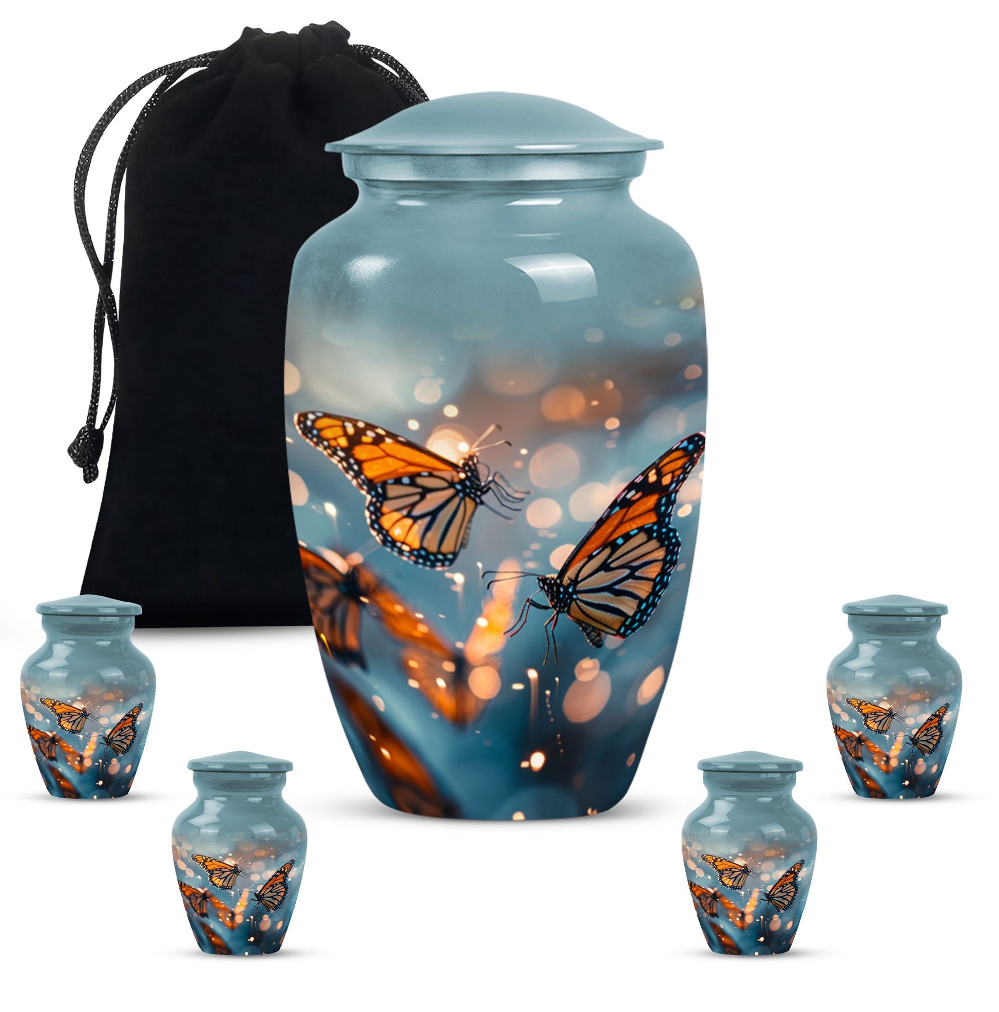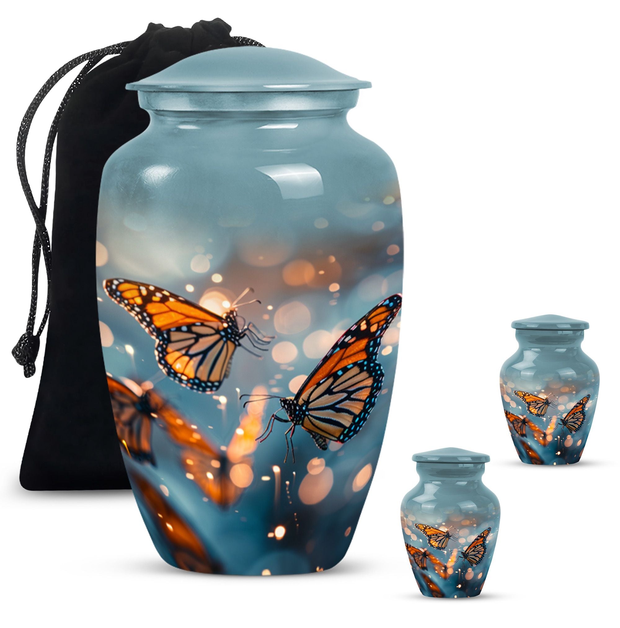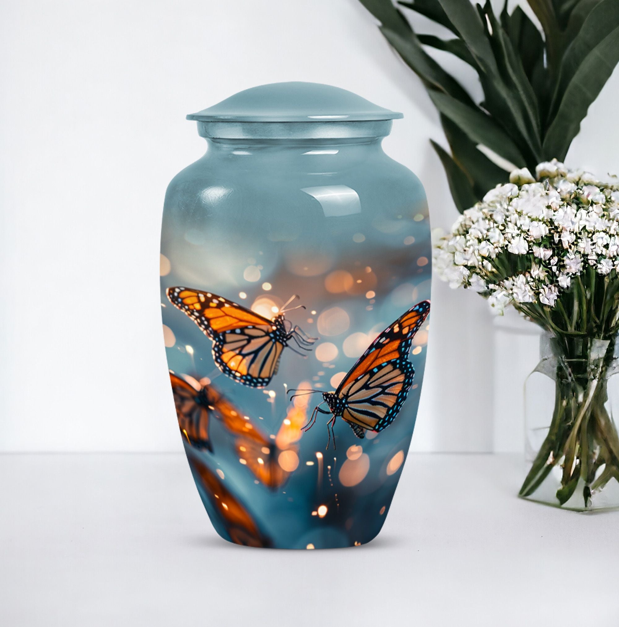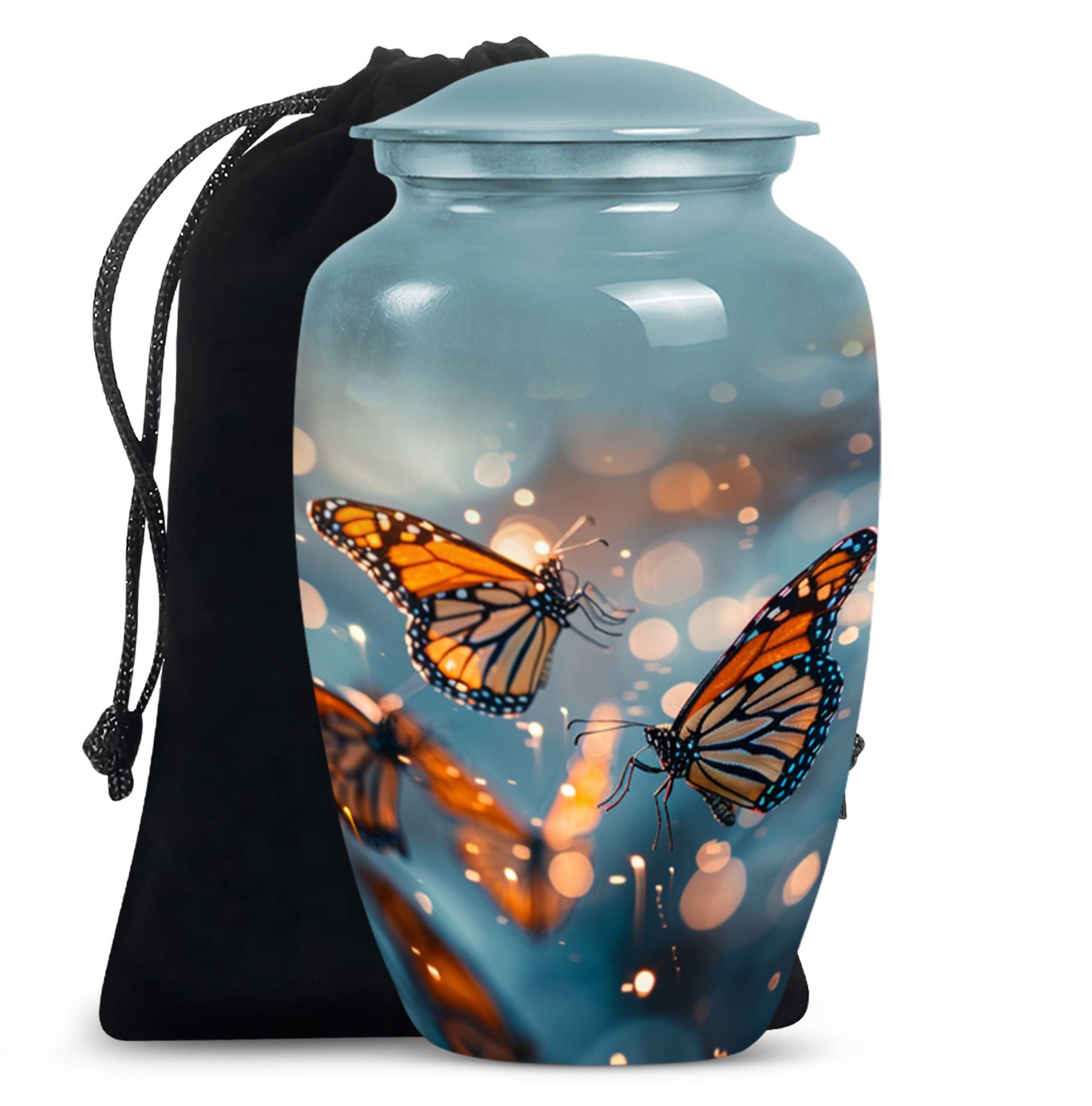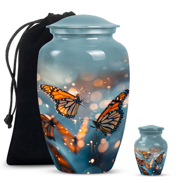 Honor your loved one with our distinct, butterfly urn. Crafted from sturdy aluminium, this memorial human urn for ashes is substantial enough, weighing 3.3 pounds, with the capacity of holding up to 200 cubic inches. This 10-inch large urn marries function and aesthetics, with its abstract theme appealing to the discerning eye. Each purchase comes with a velvet pouch, providing a secure containment for ashes. Add a personal touch by customizing this adult burial urn with engraved names, making this piece not just a memorial funeral urn, but a cherished keepsake of adored ones. Given its proportions and durability, it can comfortably hold the ashes of love and make a fitting tribute. This is ideal for those seeking memorial urns that effortlessly combine beauty, sentiment, and longevity.