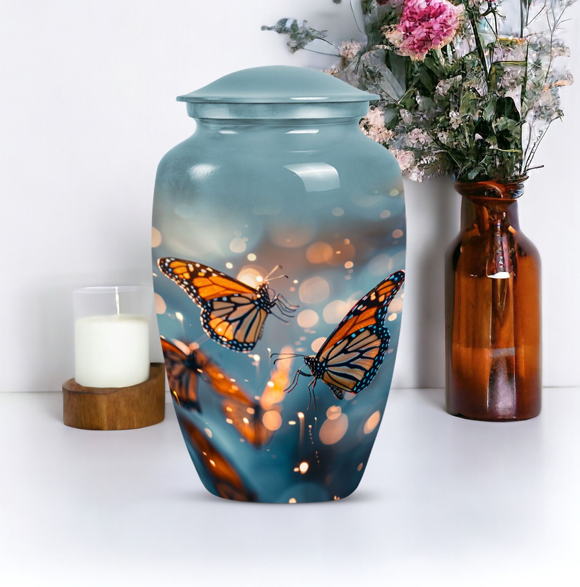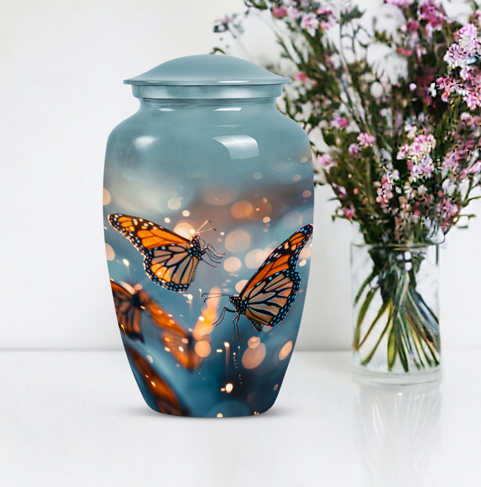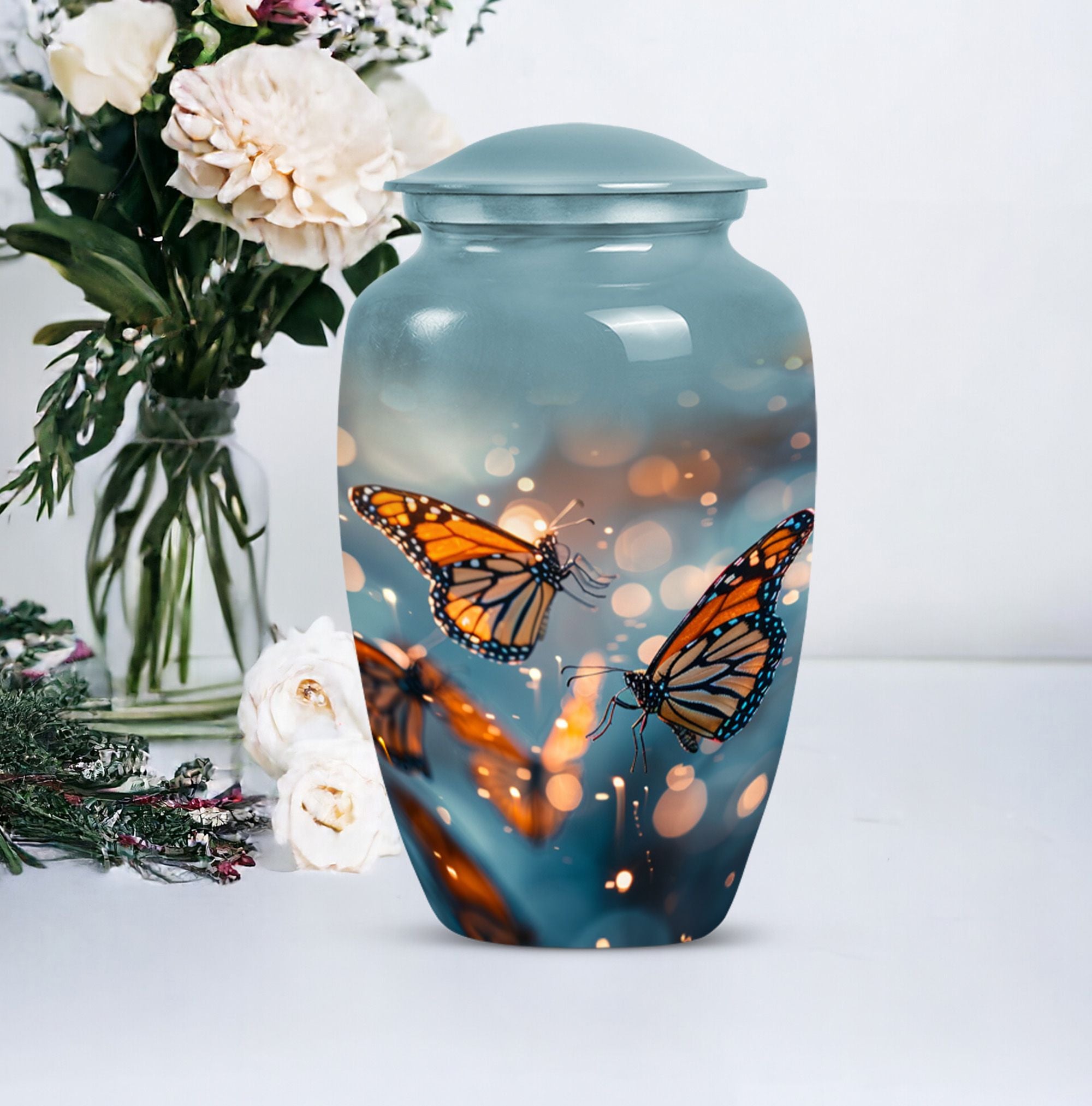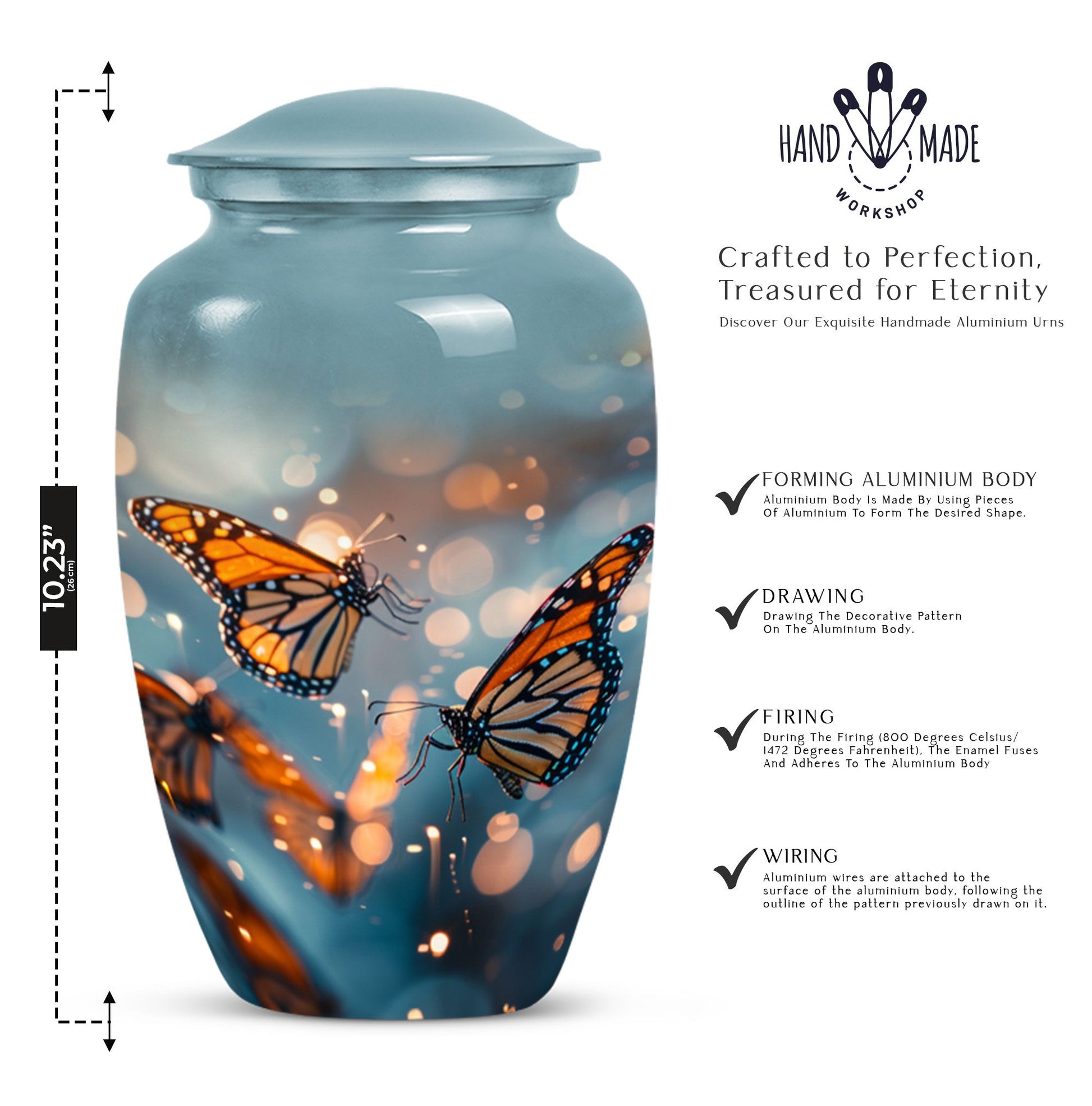 Honor your loved one with our distinct, butterfly urn. Crafted from sturdy aluminium, this memorial human urn for ashes is substantial enough, weighing 3.3 pounds, with the capacity of holding up to 200 cubic inches. This 10-inch large urn marries function and aesthetics, with its abstract theme appealing to the discerning eye. Each purchase comes with a velvet pouch, providing a secure containment for ashes. Add a personal touch by customizing this adult burial urn with engraved names, making this piece not just a memorial funeral urn, but a cherished keepsake of adored ones. Given its proportions and durability, it can comfortably hold the ashes of love and make a fitting tribute. This is ideal for those seeking memorial urns that effortlessly combine beauty, sentiment, and longevity.