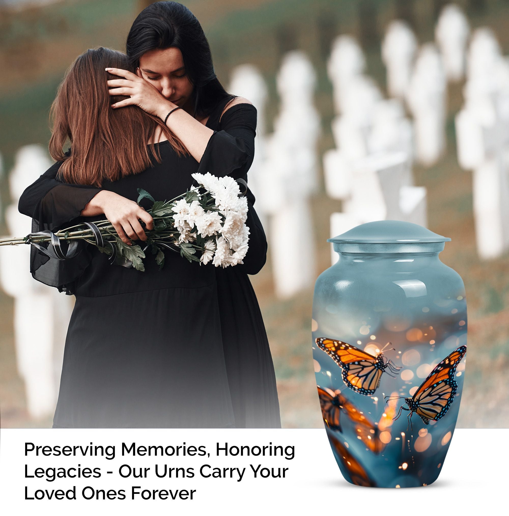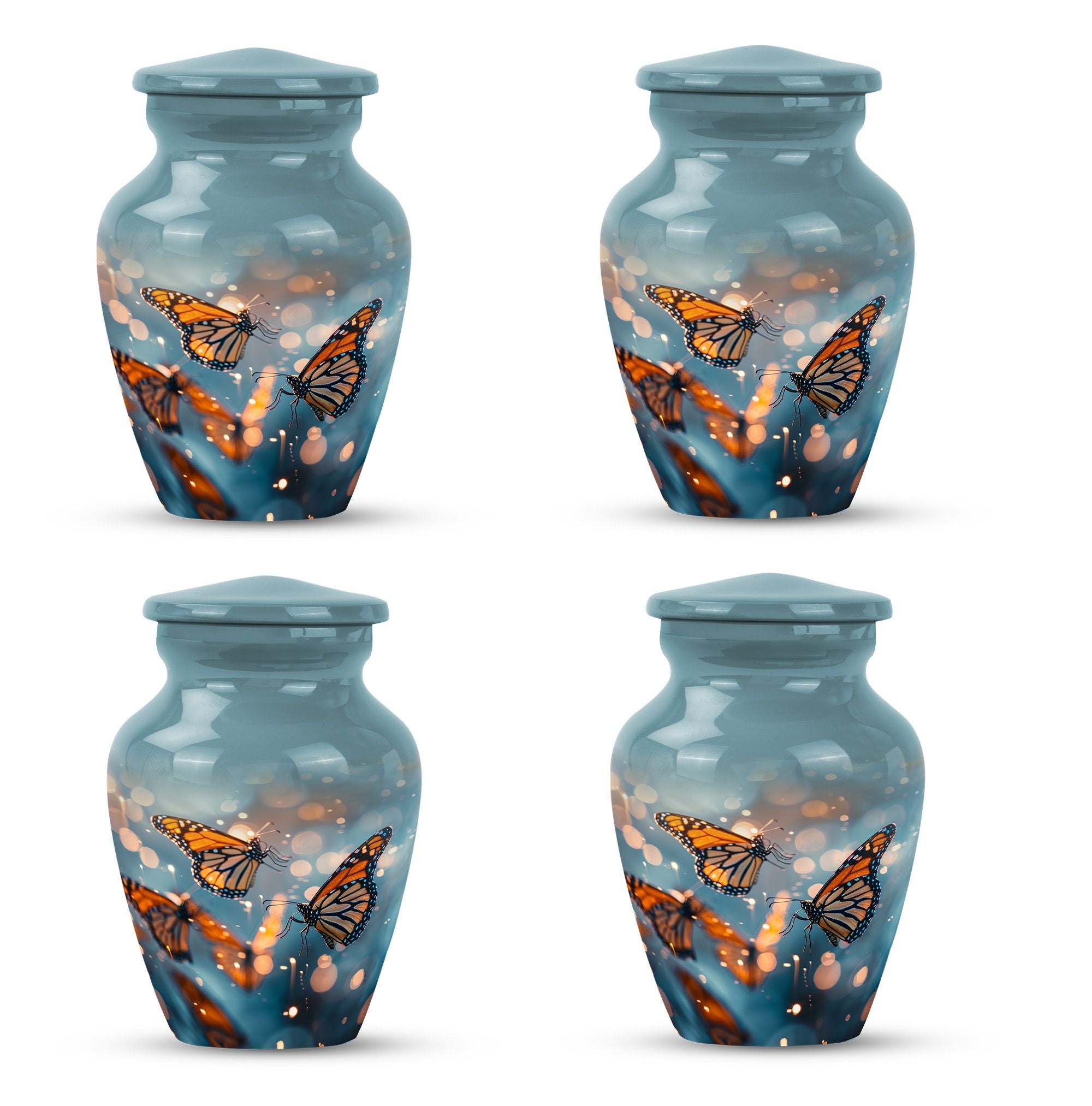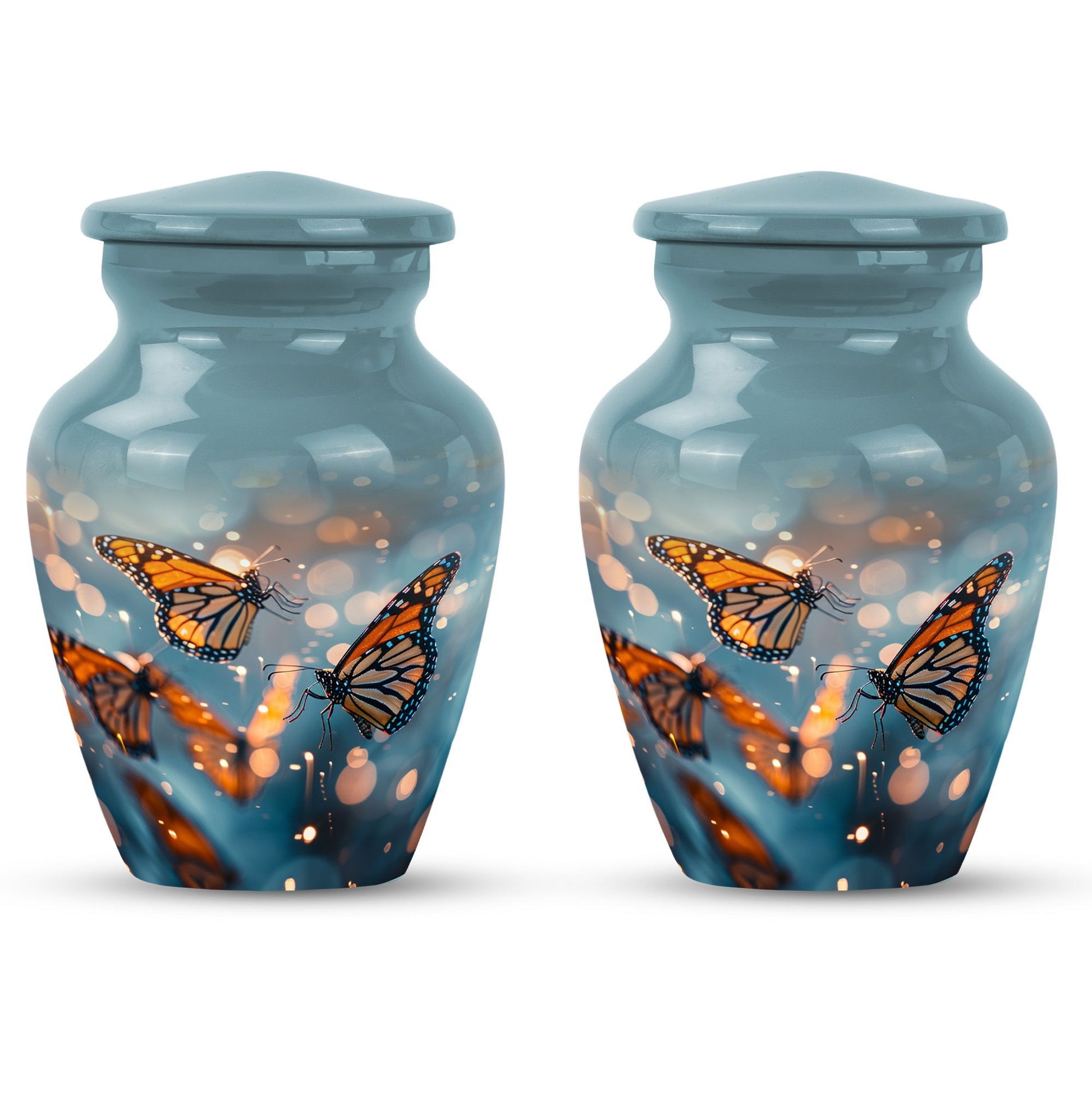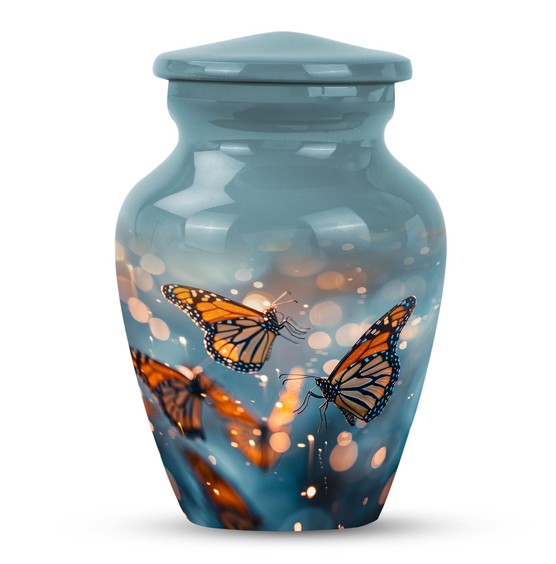 Honor your loved one with our distinct, butterfly urn. Crafted from sturdy aluminium, this memorial human urn for ashes is substantial enough, weighing 3.3 pounds, with the capacity of holding up to 200 cubic inches. This 10-inch large urn marries function and aesthetics, with its abstract theme appealing to the discerning eye. Each purchase comes with a velvet pouch, providing a secure containment for ashes. Add a personal touch by customizing this adult burial urn with engraved names, making this piece not just a memorial funeral urn, but a cherished keepsake of adored ones. Given its proportions and durability, it can comfortably hold the ashes of love and make a fitting tribute. This is ideal for those seeking memorial urns that effortlessly combine beauty, sentiment, and longevity.