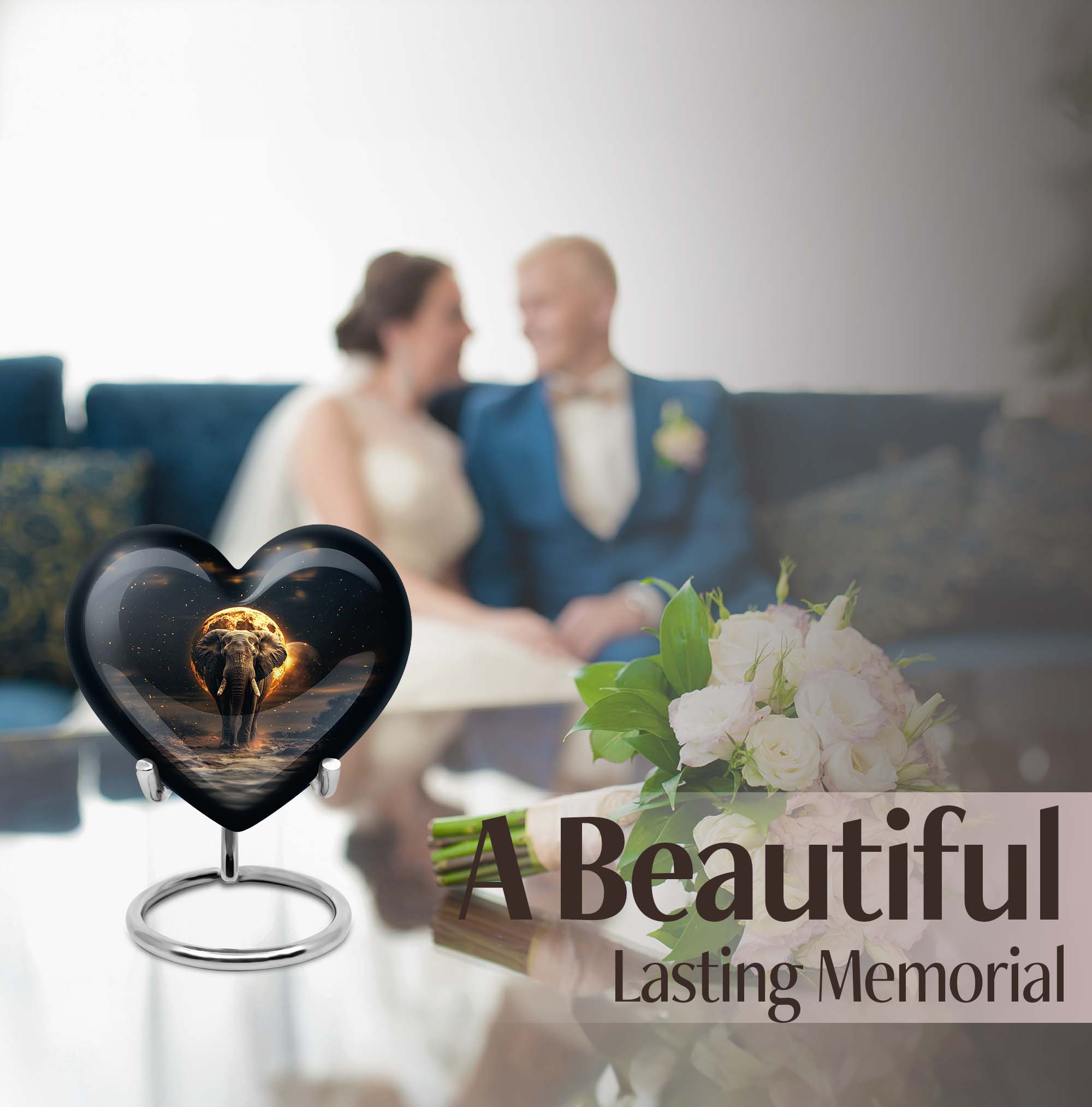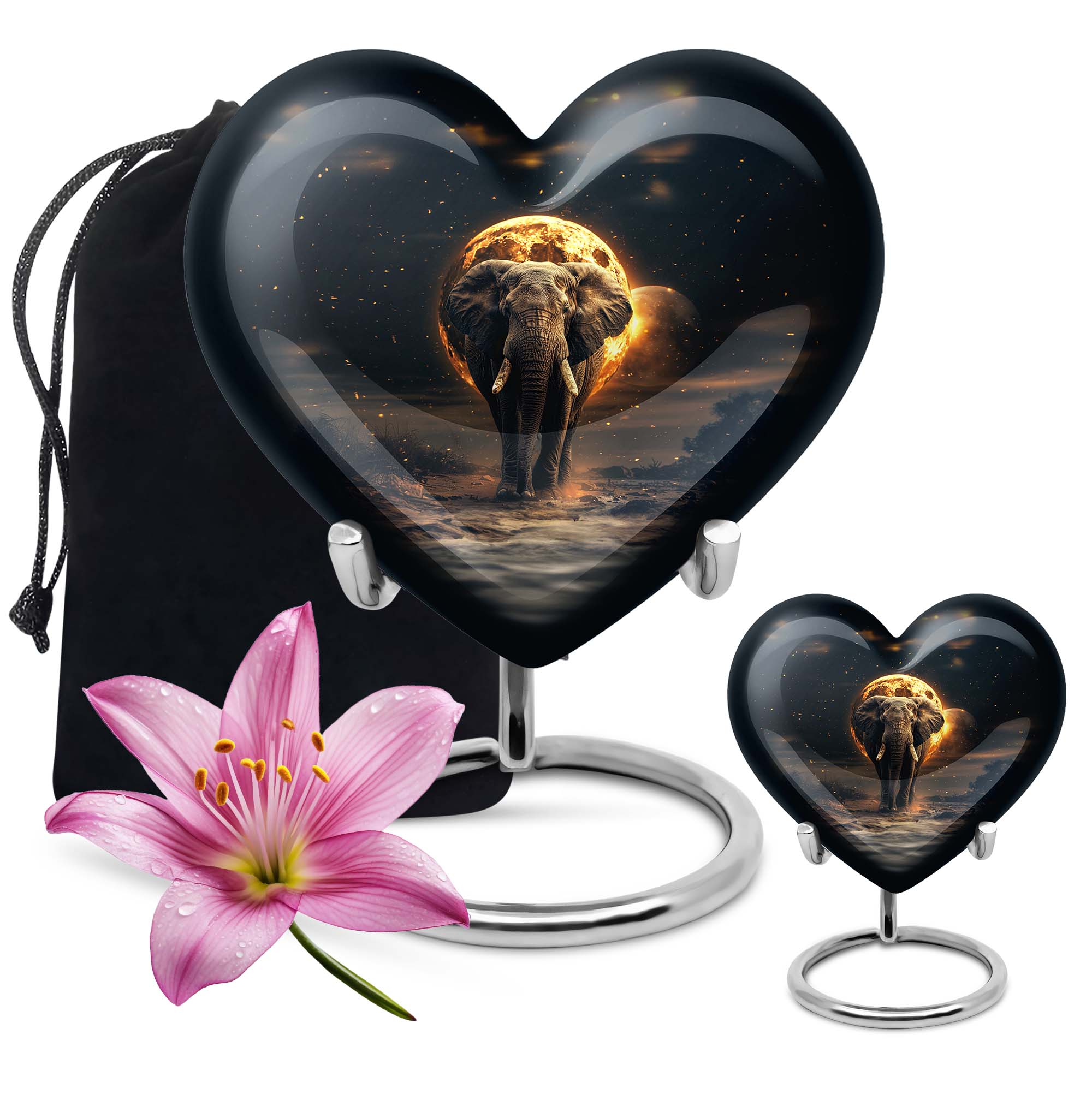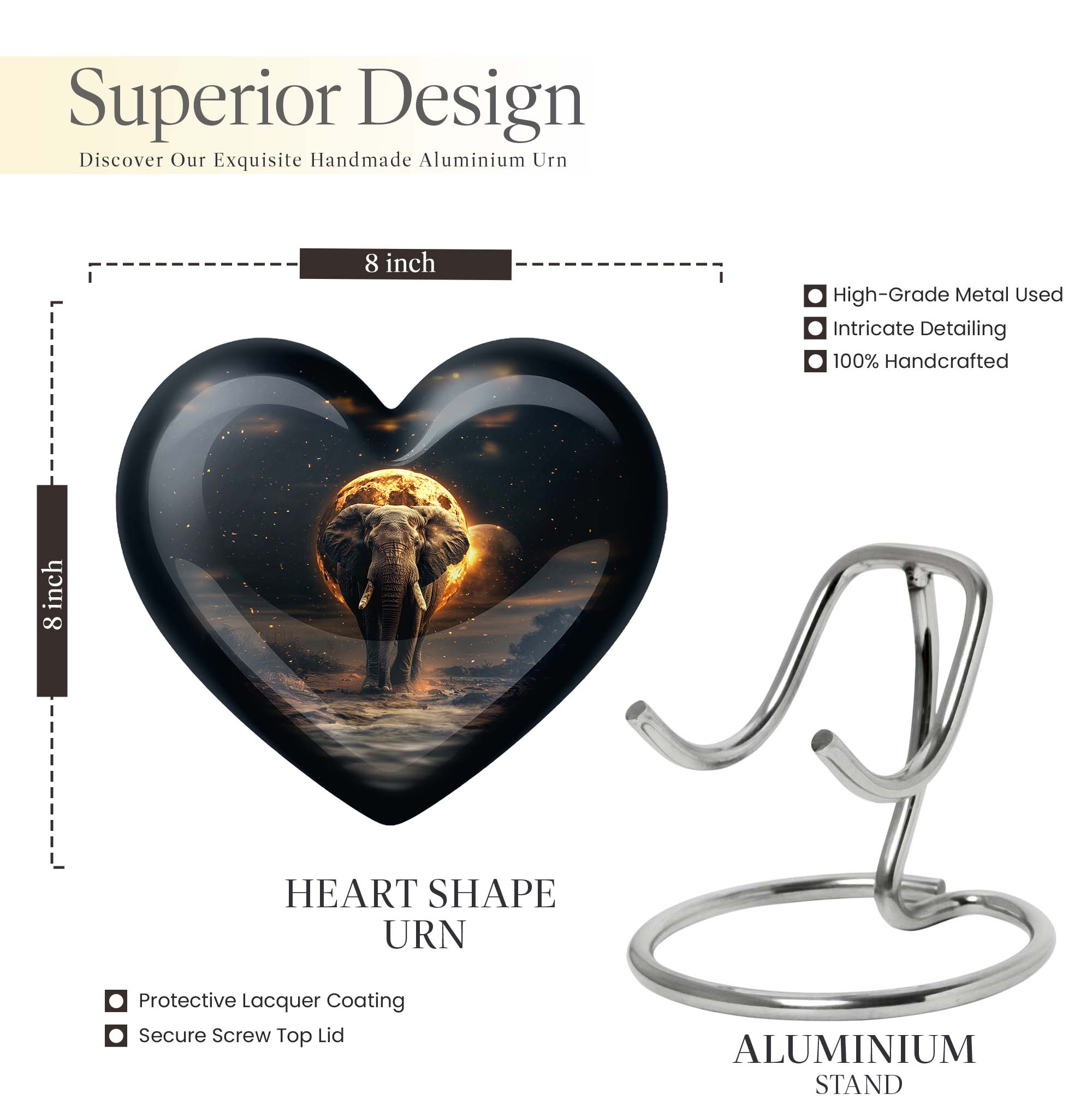Treasure the memory of your loved one with our exquisite 10-inch Elephant Urn, a large, meticulously crafted funeral urn for females and males alike. This striking memorial piece is fashioned from high-quality aluminium, contributing to a comforting weight of 3.3 pounds. Graced with a captivating Elephant theme, our urn captivates with its softened edges and durable construction. Its large capacity comfortably accommodates 200 cubic inches of ash to keep your beloved close. The urn comes with a comforting velvet pouch, providing an elegant containment solution for the ashes. Moreover, it grants you the prerogative to personalize it with engraved names, making it a distinctive piece of memory. Shaped urn stands and other various types of elegant adult cremation urns are available for selection. Our grand Elephant Urn seamlessly amalgamates aesthetics with emotions, offering a dignified commemoration for your dearly departed. Standout keywords for this product include 'Memorial Urns', 'Cremation Urns for Men & Women', and 'Metal Large Urn'.