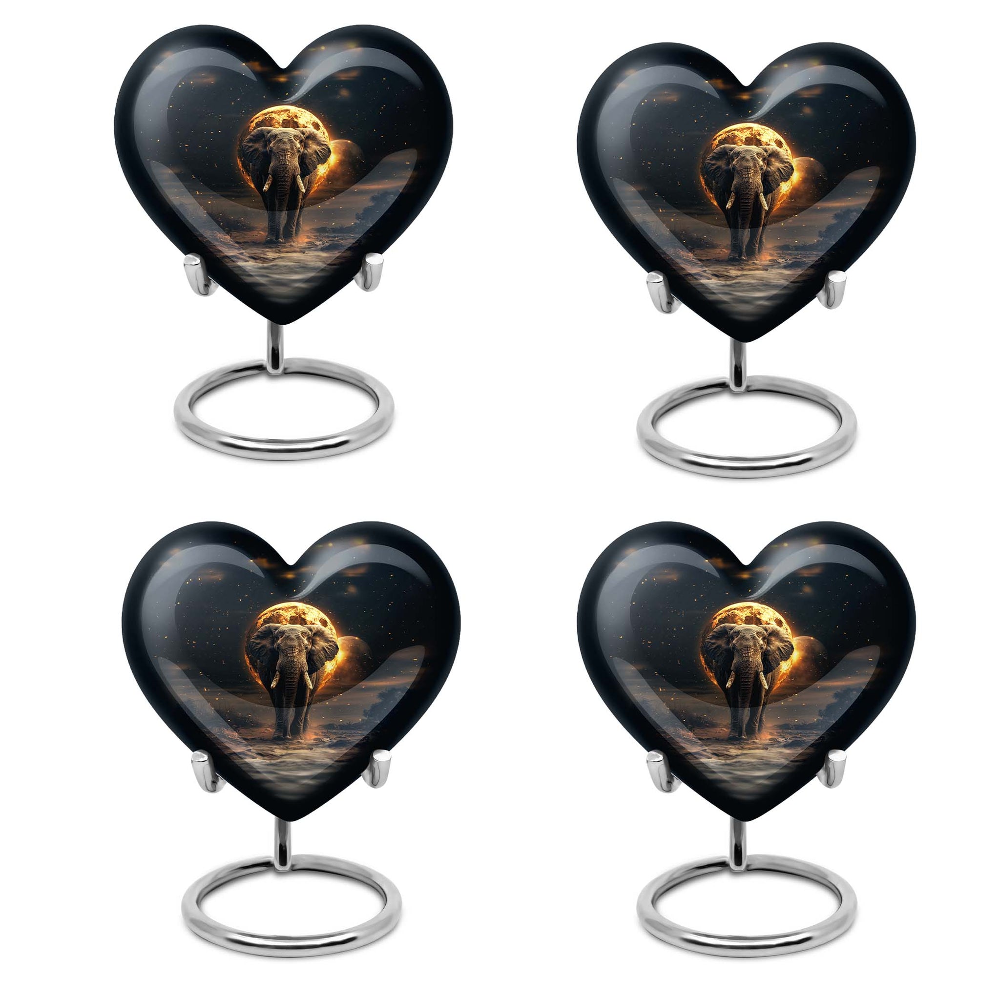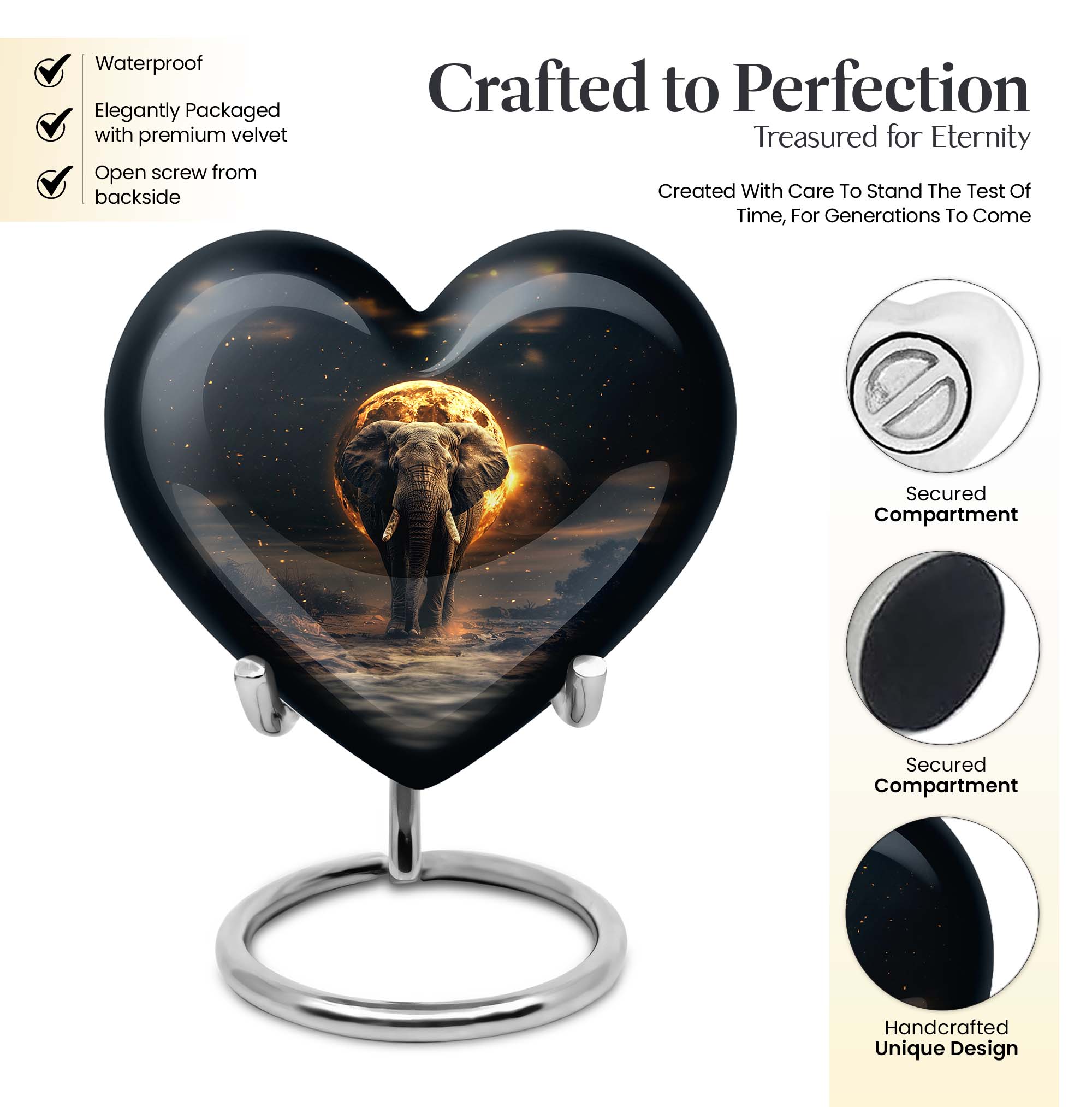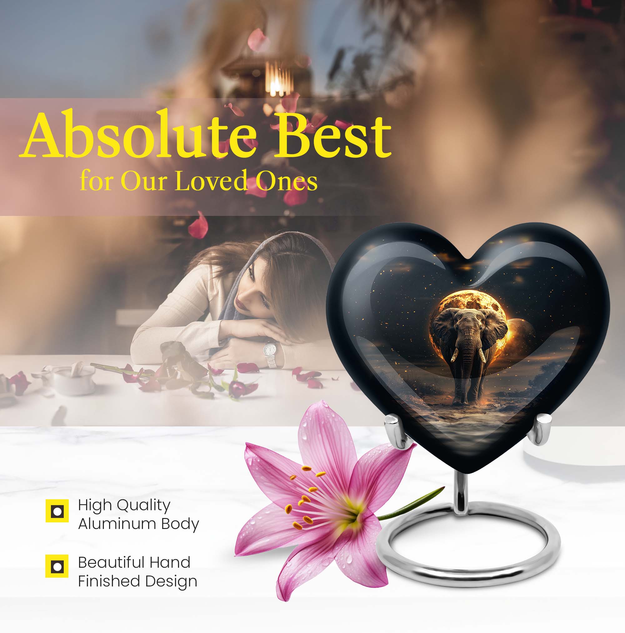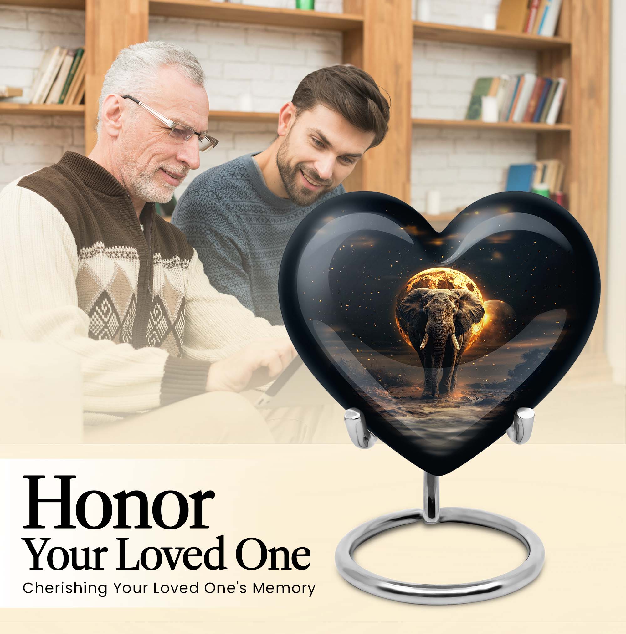 Treasure the memory of your loved one with our exquisite 10-inch Elephant Urn, a large, meticulously crafted funeral urn for females and males alike. This striking memorial piece is fashioned from high-quality aluminium, contributing to a comforting weight of 3.3 pounds. Graced with a captivating Elephant theme, our urn captivates with its softened edges and durable construction. Its large capacity comfortably accommodates 200 cubic inches of ash to keep your beloved close. The urn comes with a comforting velvet pouch, providing an elegant containment solution for the ashes. Moreover, it grants you the prerogative to personalize it with engraved names, making it a distinctive piece of memory. Shaped urn stands and other various types of elegant adult cremation urns are available for selection. Our grand Elephant Urn seamlessly amalgamates aesthetics with emotions, offering a dignified commemoration for your dearly departed. Standout keywords for this product include 'Memorial Urns', 'Cremation Urns for Men & Women', and 'Metal Large Urn'.