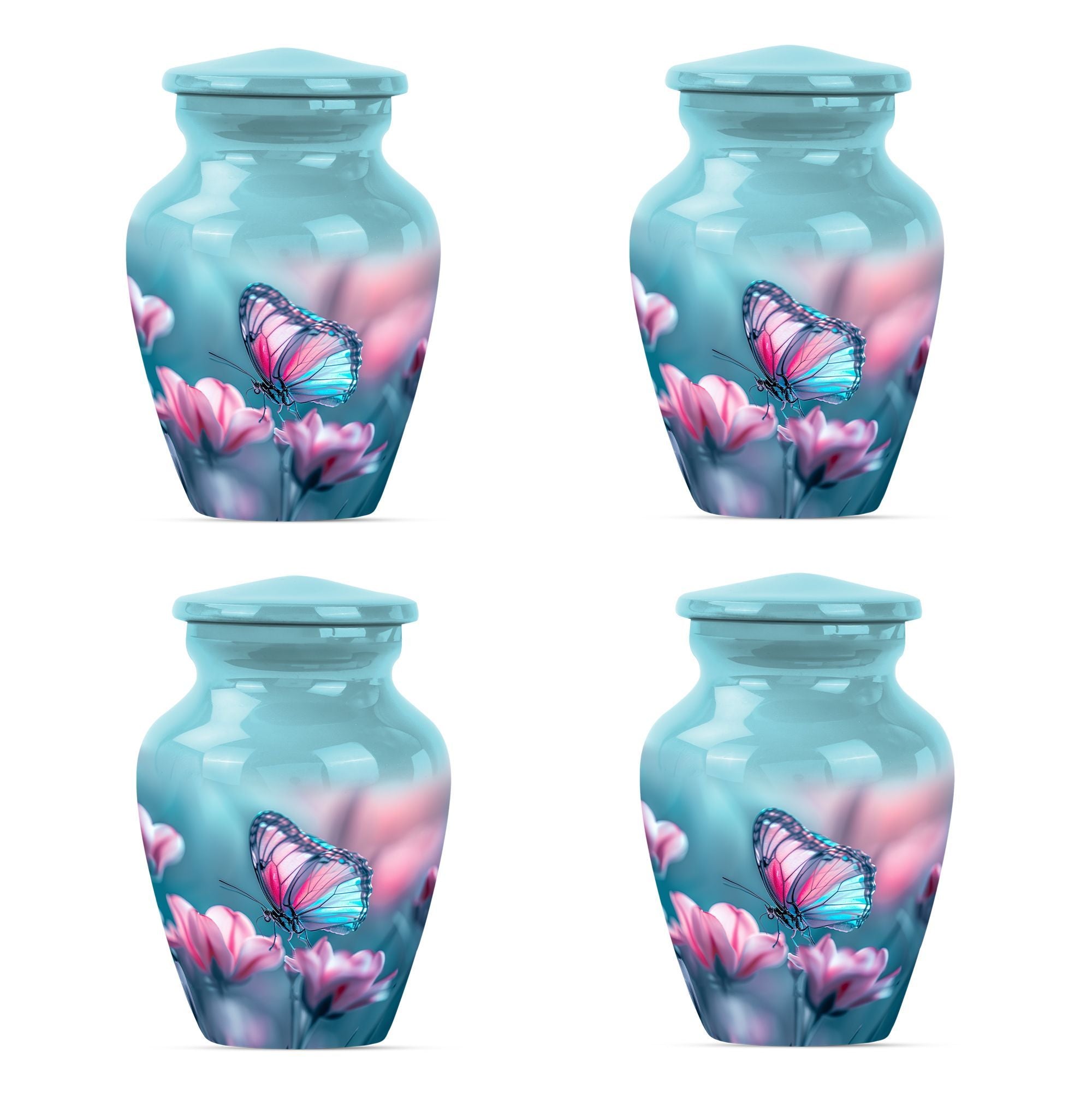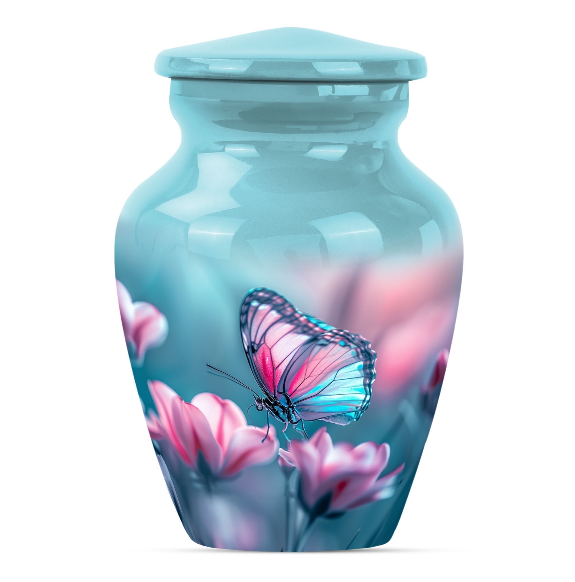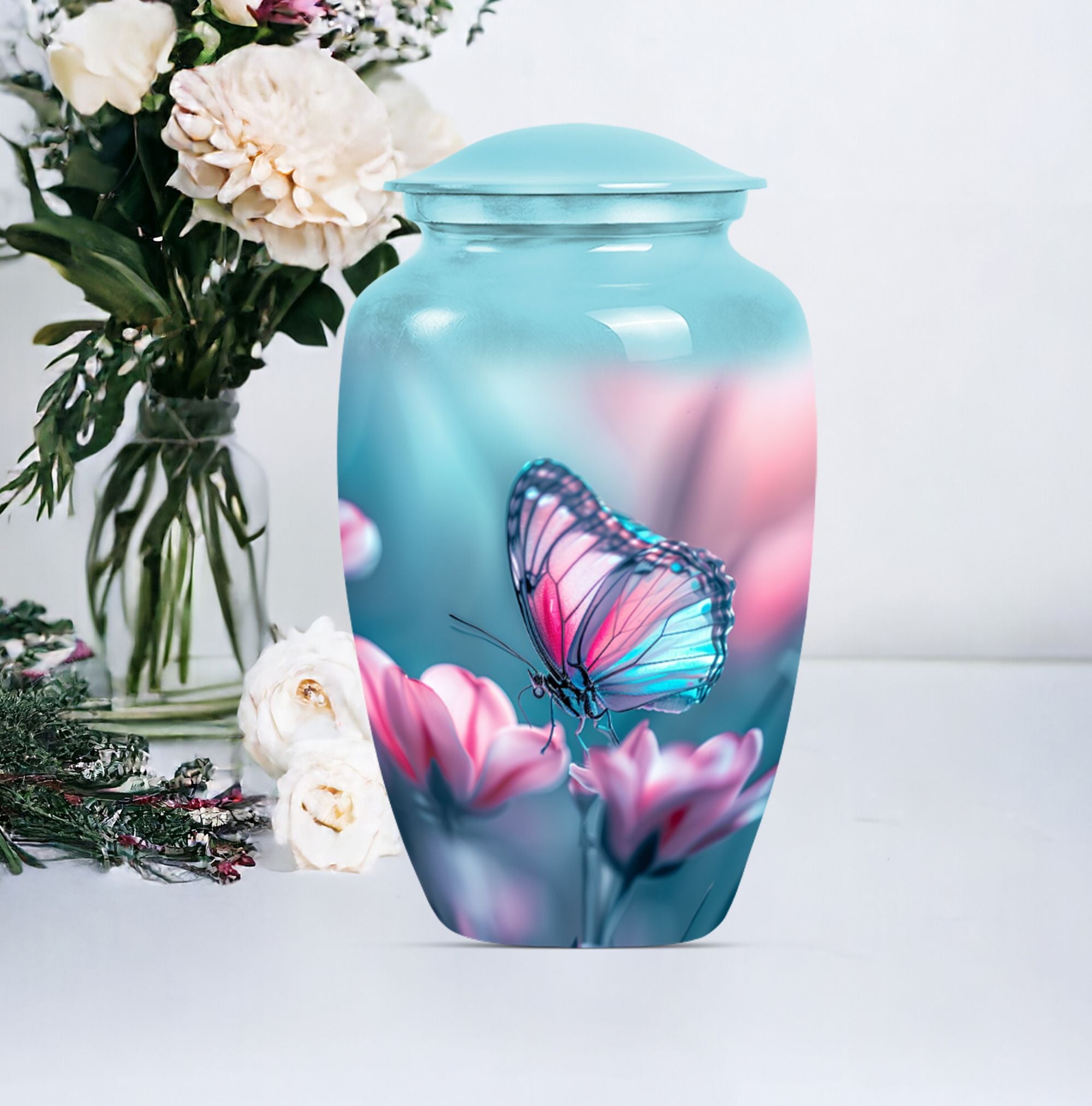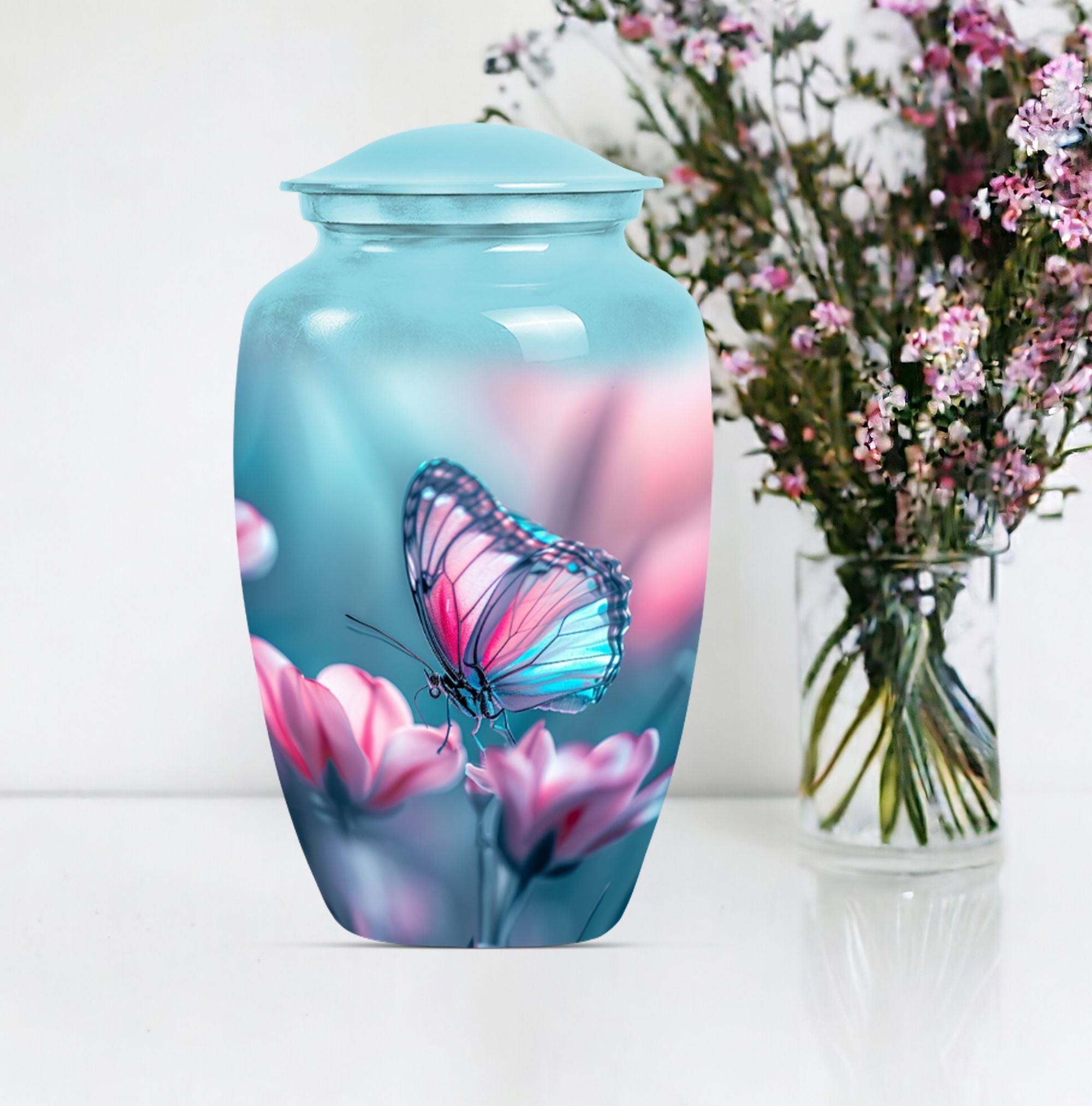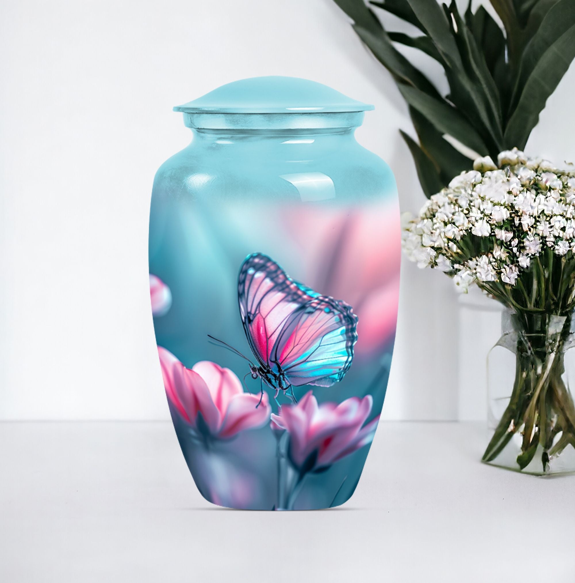 We present to you our large 10-inch butterfly urn, delicately crafted with aluminum, a perfect option for memorial ceremonies and an exquisite substitute for funeral burial urns for adult human ashes. Weighing just 3.3 pounds and standing 10 inches tall, its capacity is ample for safe containment, accommodating up to 200 cubic inches of ashes. The elegance and serenity reflected in the butterfly theme impeccably echo the everlasting memory of your loved one. As an added personal touch, customization options are available to engrave names on the urn, making it an even more intimate memorial tribute. The urn comes with a velvet pouch, ensuring secure storage and respect for the sacred contents. With its utility and significance, it can serve as a shaped shelf, a burial large urn, or a keepsake for human ashes. These exceptional characteristics place these urns as a compelling choice for those looking for burial alternatives, turning the mourning period into a celebration of the life lived. This distinctive butterfly urn will resonate with all those searching for 'memorial urns' or 'cremation urn human ashes.'
