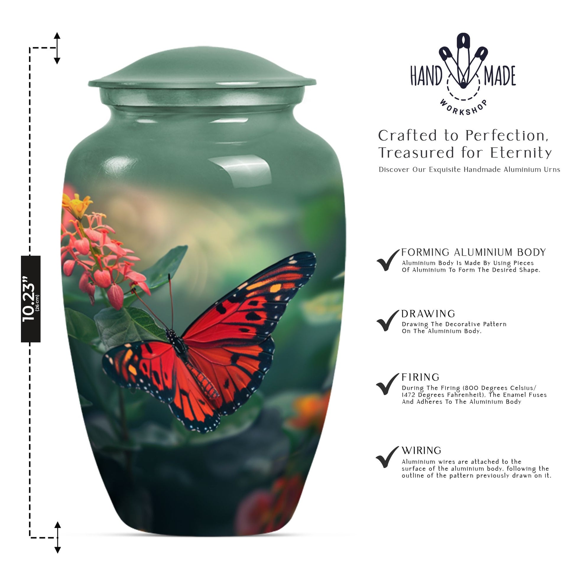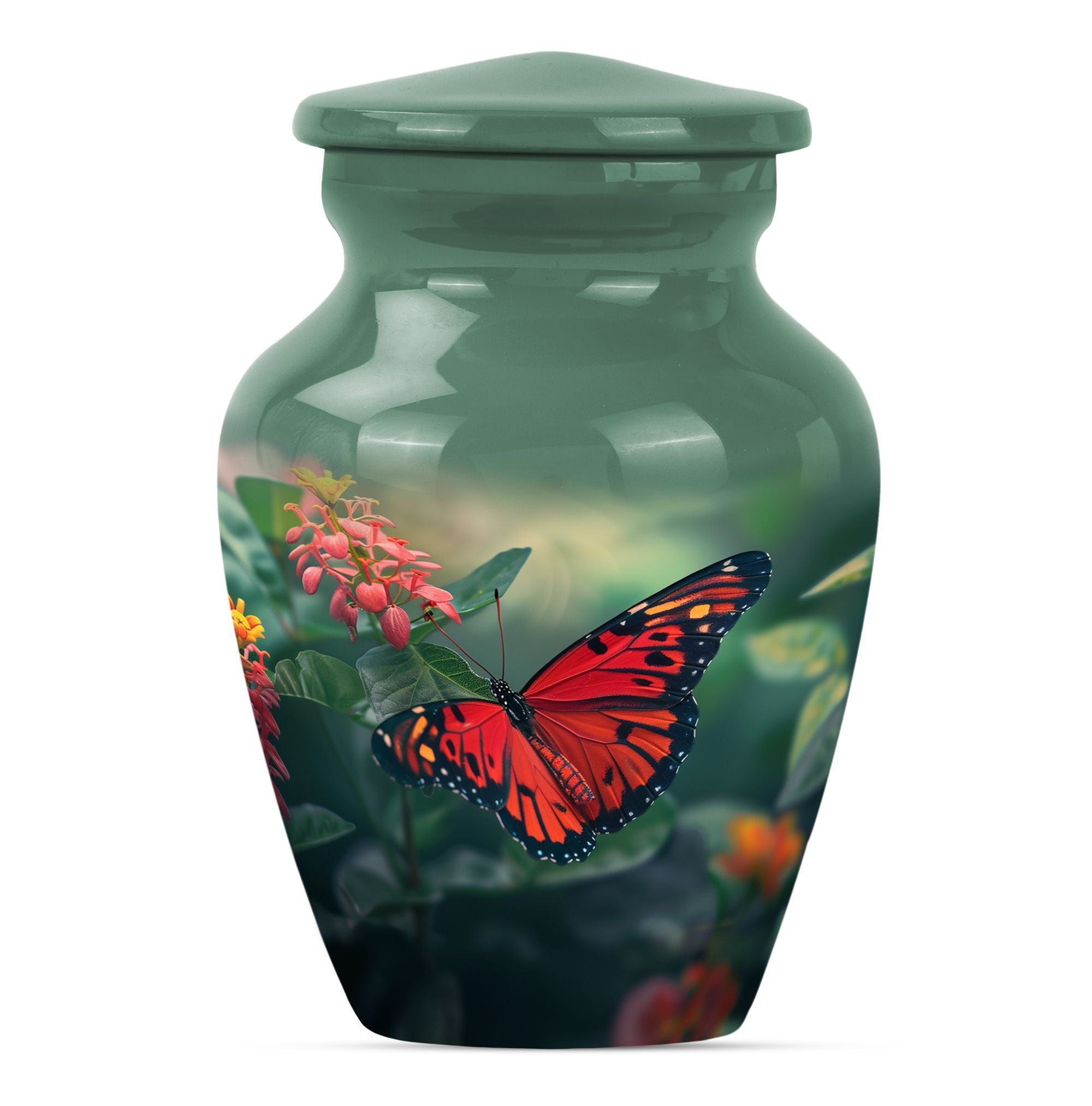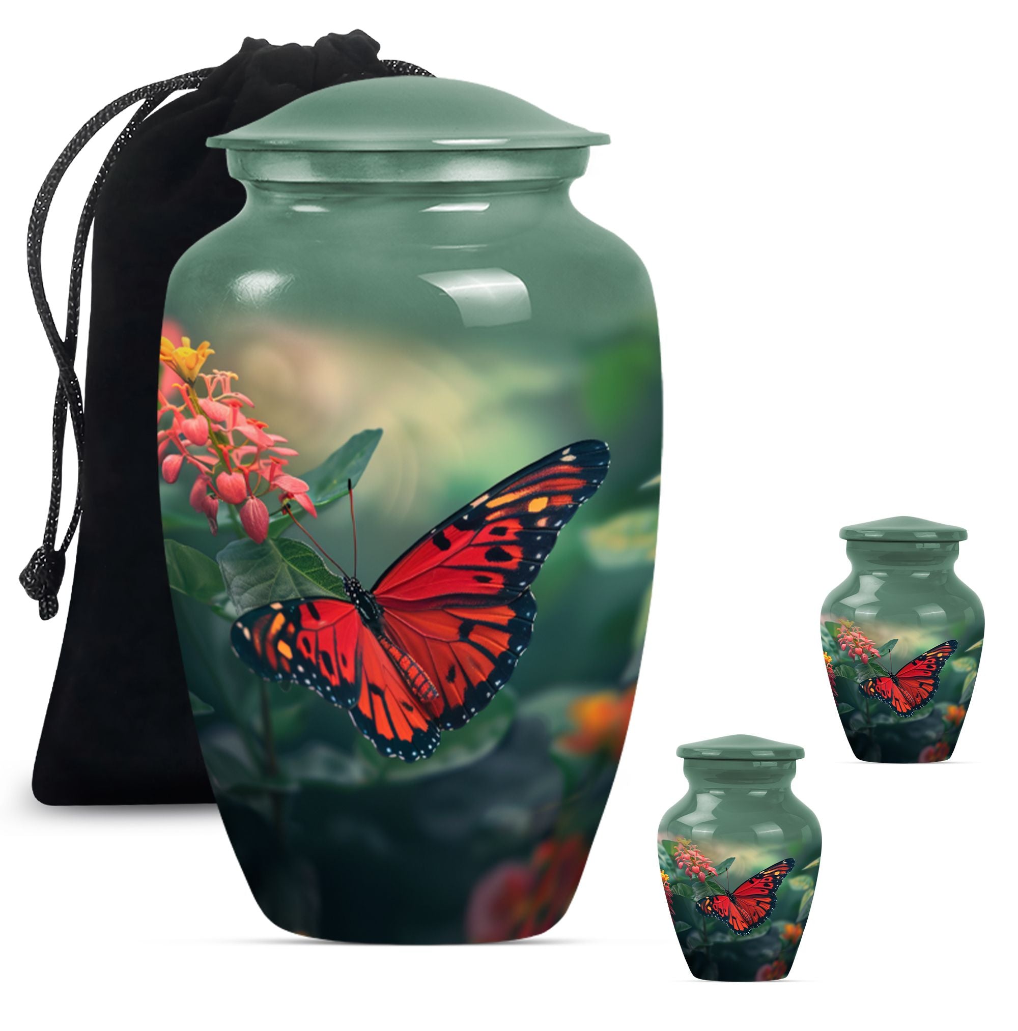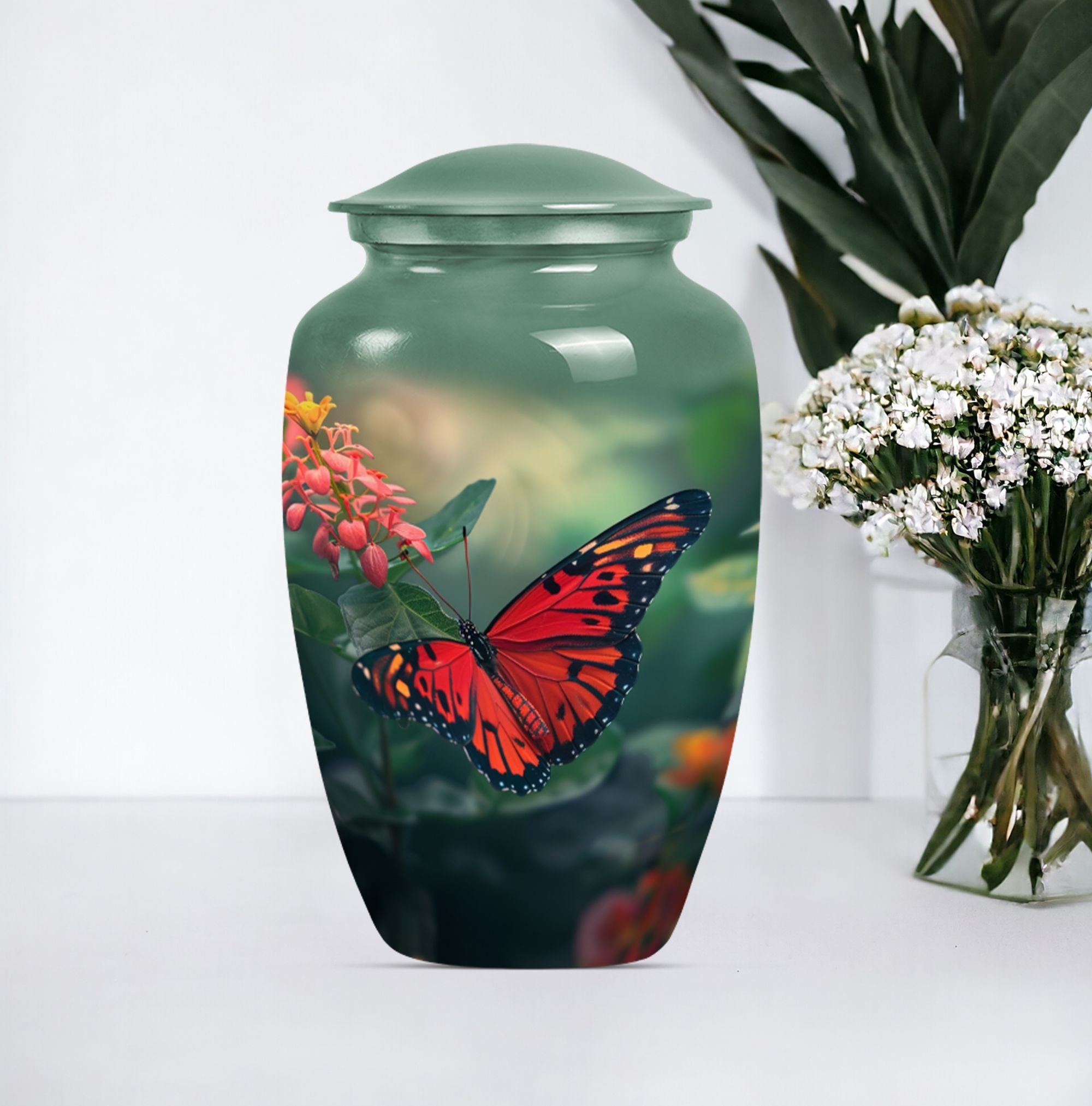 This butterfly-themed Large Urn is the ideal choice for those in search of cremation funeral urns that prioritize the beauty, dignity, and respect of late loved ones. Immaculately designed, the urn stands at 10 inches in height and boasts the timeless allure of classic urn design. Its body is wrought from sturdy aluminium, giving it a modest weight of 3.3 pounds. The urn has a decent capacity of 200 cubic inches, ample space for the secure containment of ashes. The urn comes with a soft velvet pouch for the parting ceremony and subsequent storage of the ashes. Personalized engraving of names is available as a unique, memorable tribute to the deceased. Human urn ashes or cremation urns for human ashes adult male seamlessly align with its design. Explore the comfort of the beautiful butterfly cremation urn, a heartfelt piece evoking remembrance, peace, and love. Stand apart with funeral decorative urns that are much more than simply urns for ashes.