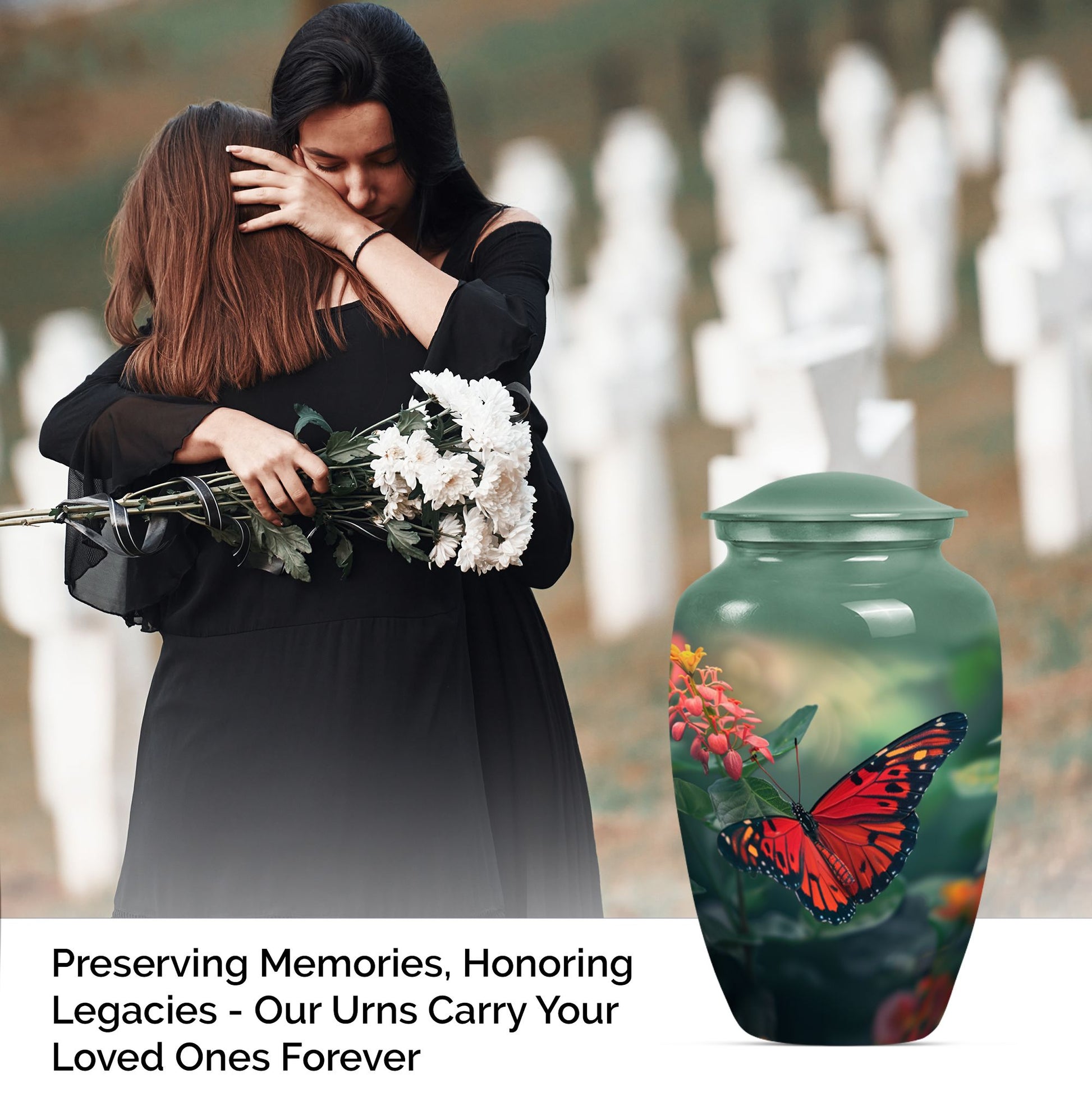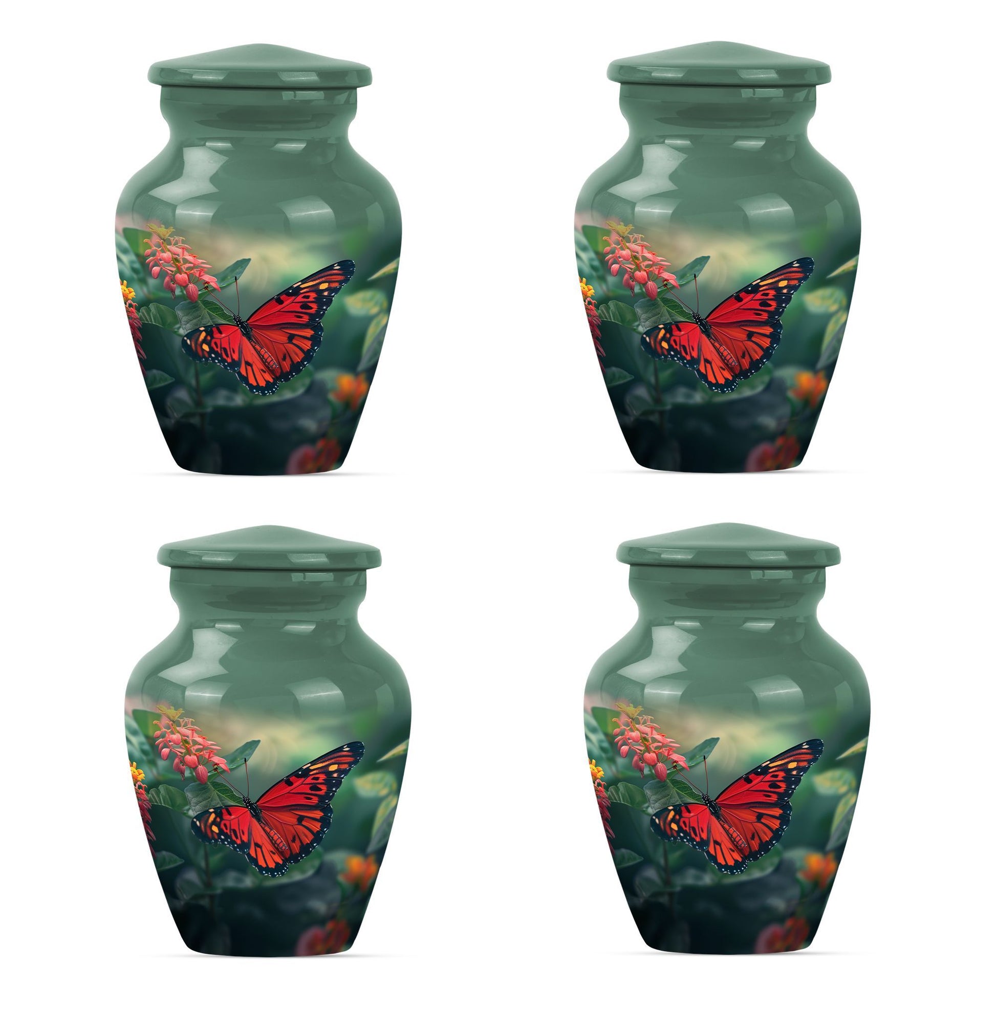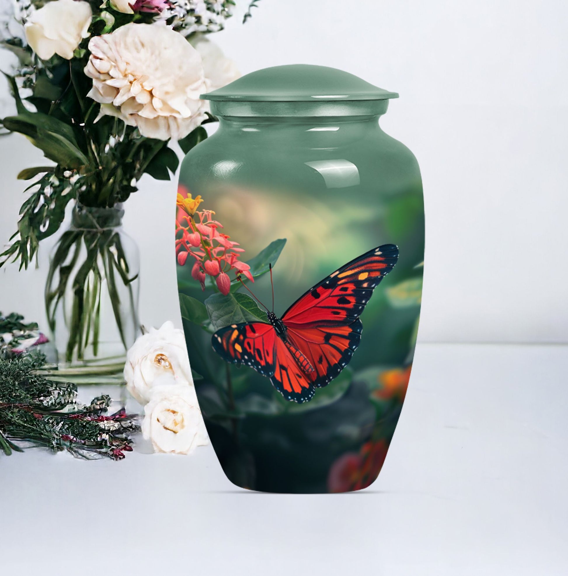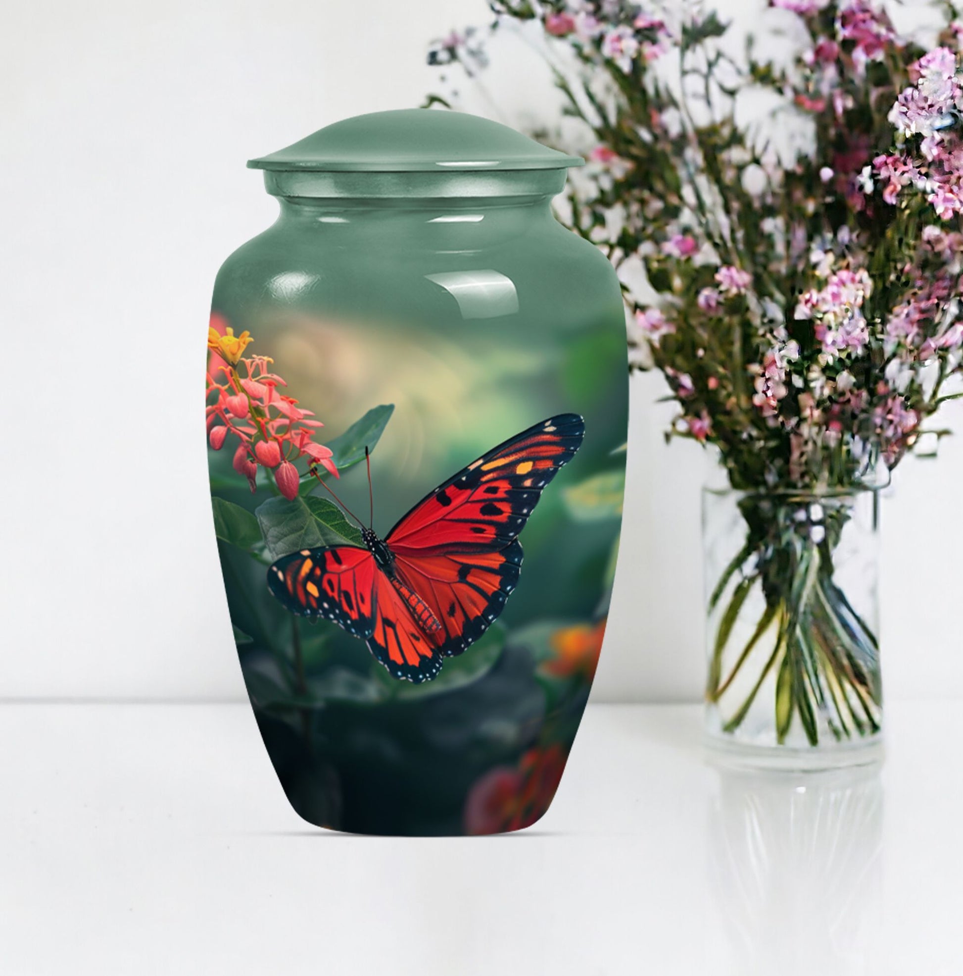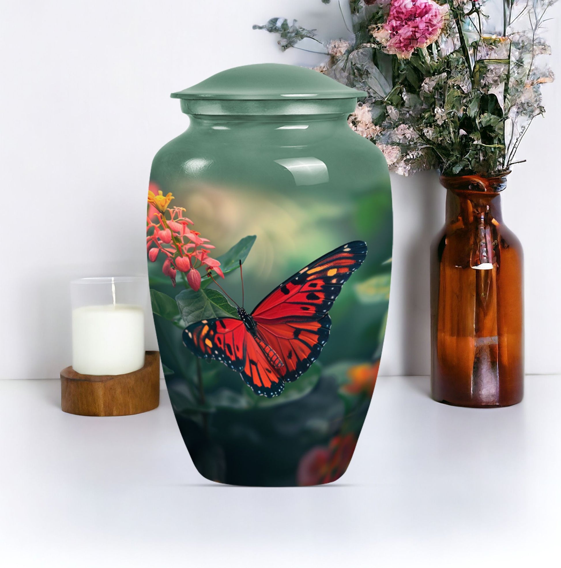 This butterfly-themed Large Urn is the ideal choice for those in search of cremation funeral urns that prioritize the beauty, dignity, and respect of late loved ones. Immaculately designed, the urn stands at 10 inches in height and boasts the timeless allure of classic urn design. Its body is wrought from sturdy aluminium, giving it a modest weight of 3.3 pounds. The urn has a decent capacity of 200 cubic inches, ample space for the secure containment of ashes. The urn comes with a soft velvet pouch for the parting ceremony and subsequent storage of the ashes. Personalized engraving of names is available as a unique, memorable tribute to the deceased. Human urn ashes or cremation urns for human ashes adult male seamlessly align with its design. Explore the comfort of the beautiful butterfly cremation urn, a heartfelt piece evoking remembrance, peace, and love. Stand apart with funeral decorative urns that are much more than simply urns for ashes.