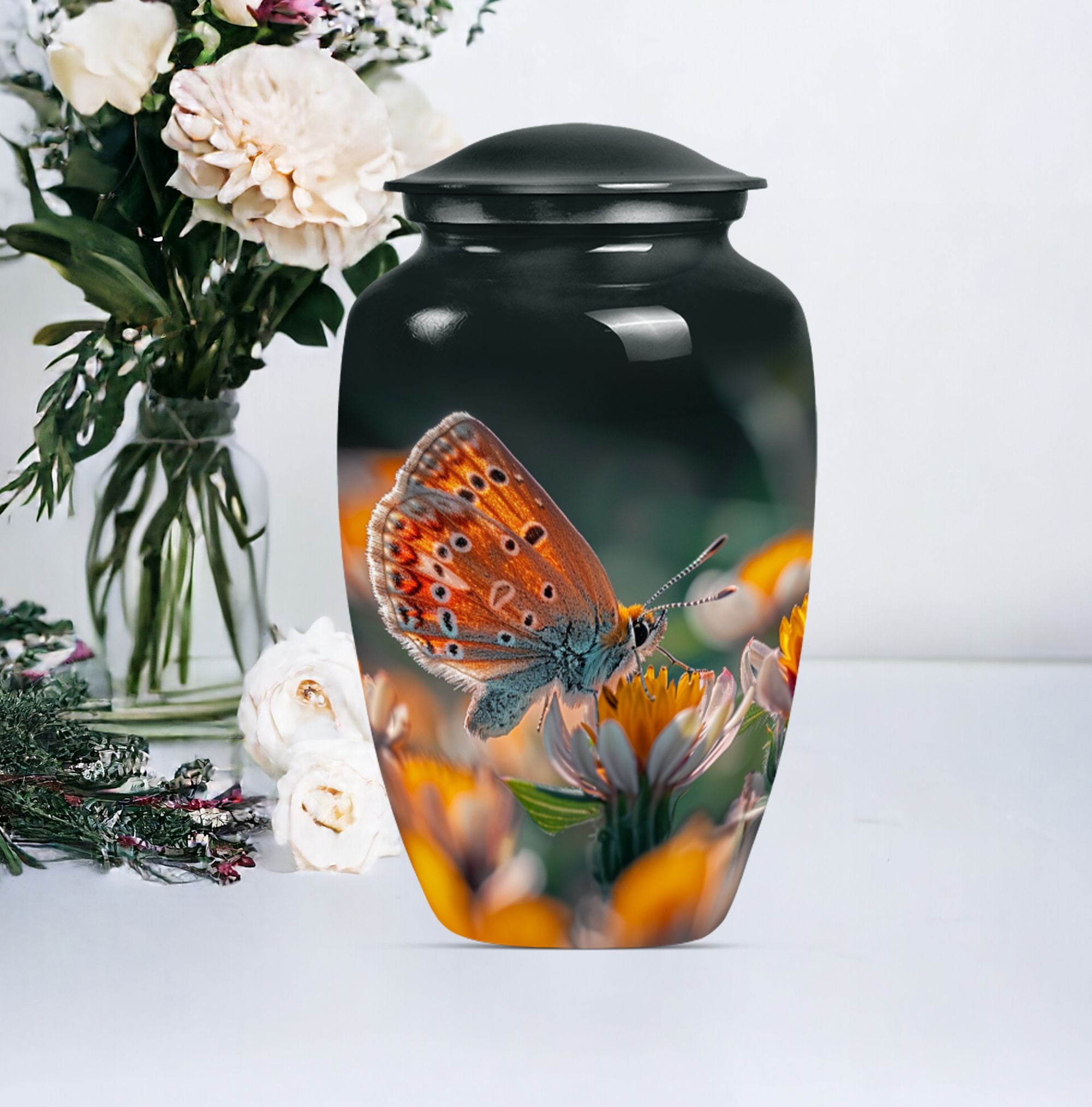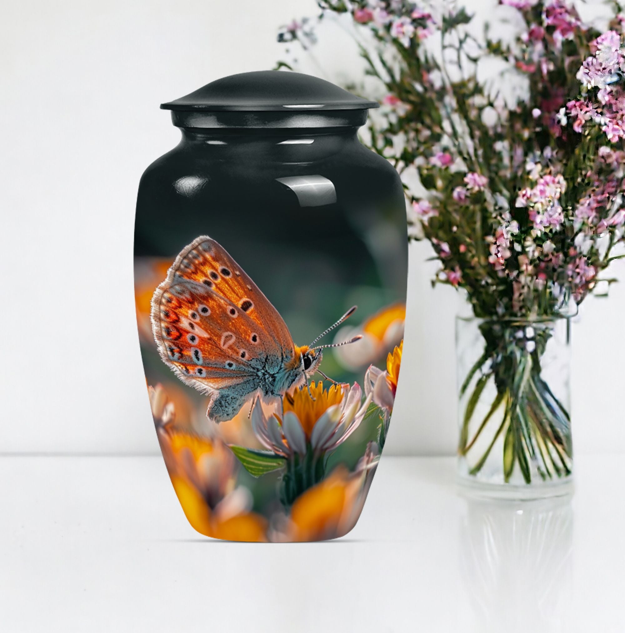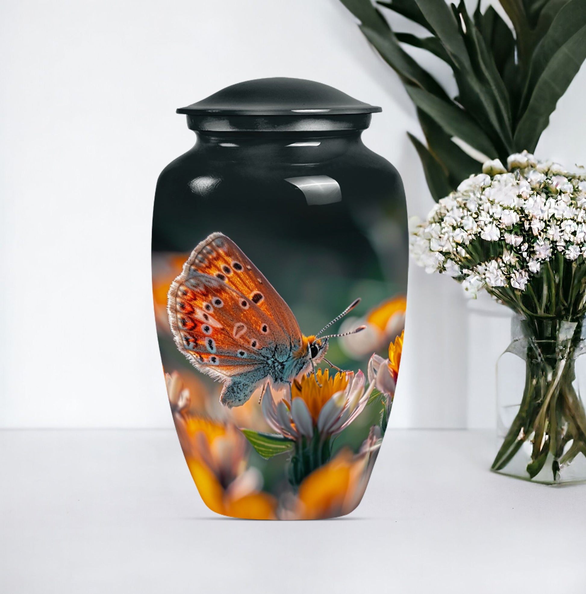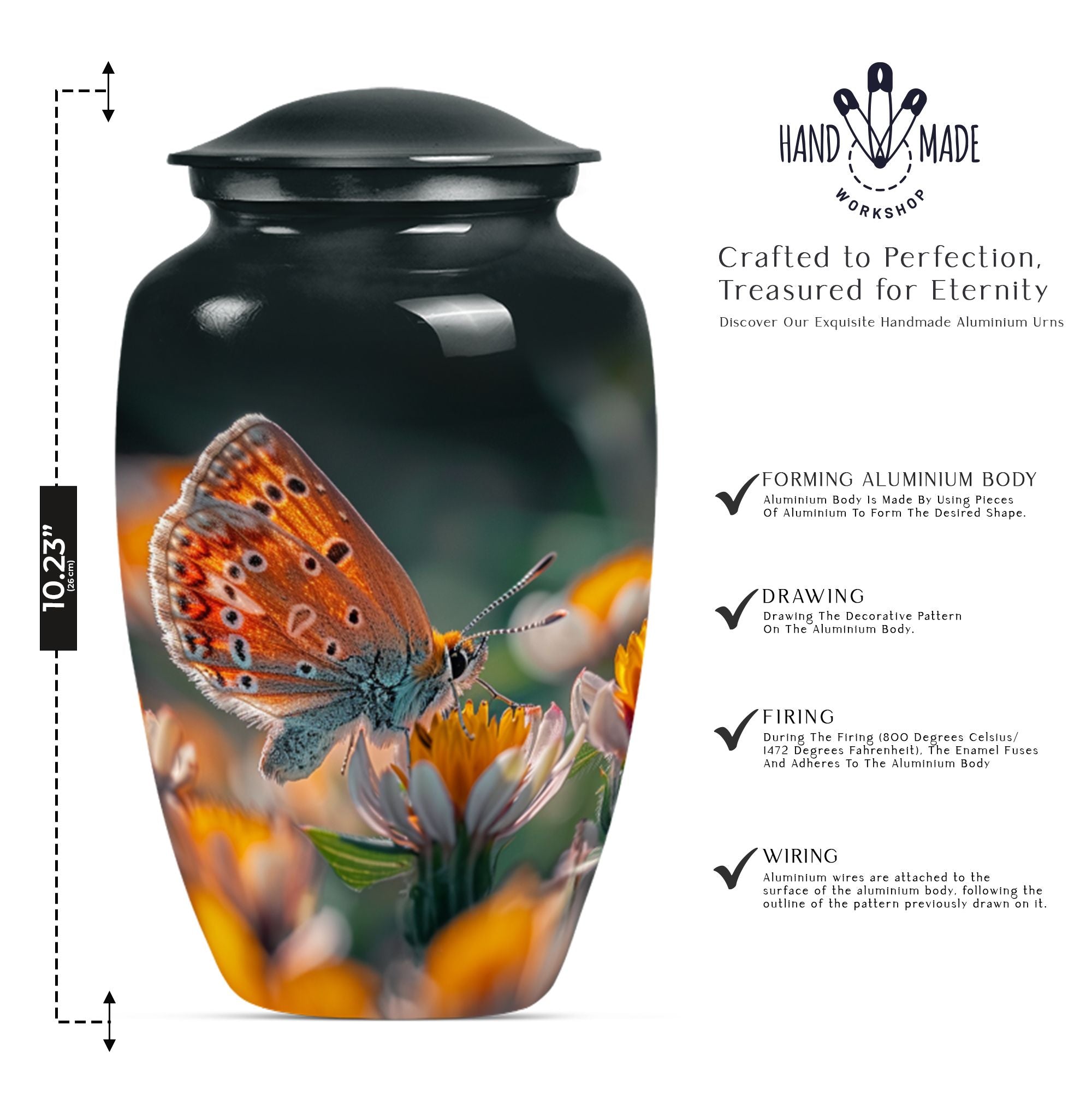 Experience a touching, individualized tribute to your departed loved ones with this 10-inch butterfly urn, an epitome of refined simplicity. Our cremation urn for human ashes melds the highest quality Aluminium material with a remarkable Classic Urn design, making it quintessential for life's final memorable journey. Weighing a sturdy 3.3 pounds and offering a 200 cubic-inch capacity, this funeral urn is designed to carefully preserve the essence of an adult or senior life. The Butterfly theme imprints nature's beauty, conveying hope and renewal amidst life's cycle. The urn comes with a velvet pouch to cradle the ashes thereby, ensuring the contained sanctity of your loved one's memory. We provide a facility to bring in a personal touch by engraving names. This large urn unites sentimental value and aesthetic charm, making it a perfect choice for memorial urns. Search phrases hinting 'cremation urns for men', 'funeral urns for women', and 'funeral urns ashes' sync beautifully with this pristine product. In the cycle of life and death, let this urn be a token of love, memory, and honor.