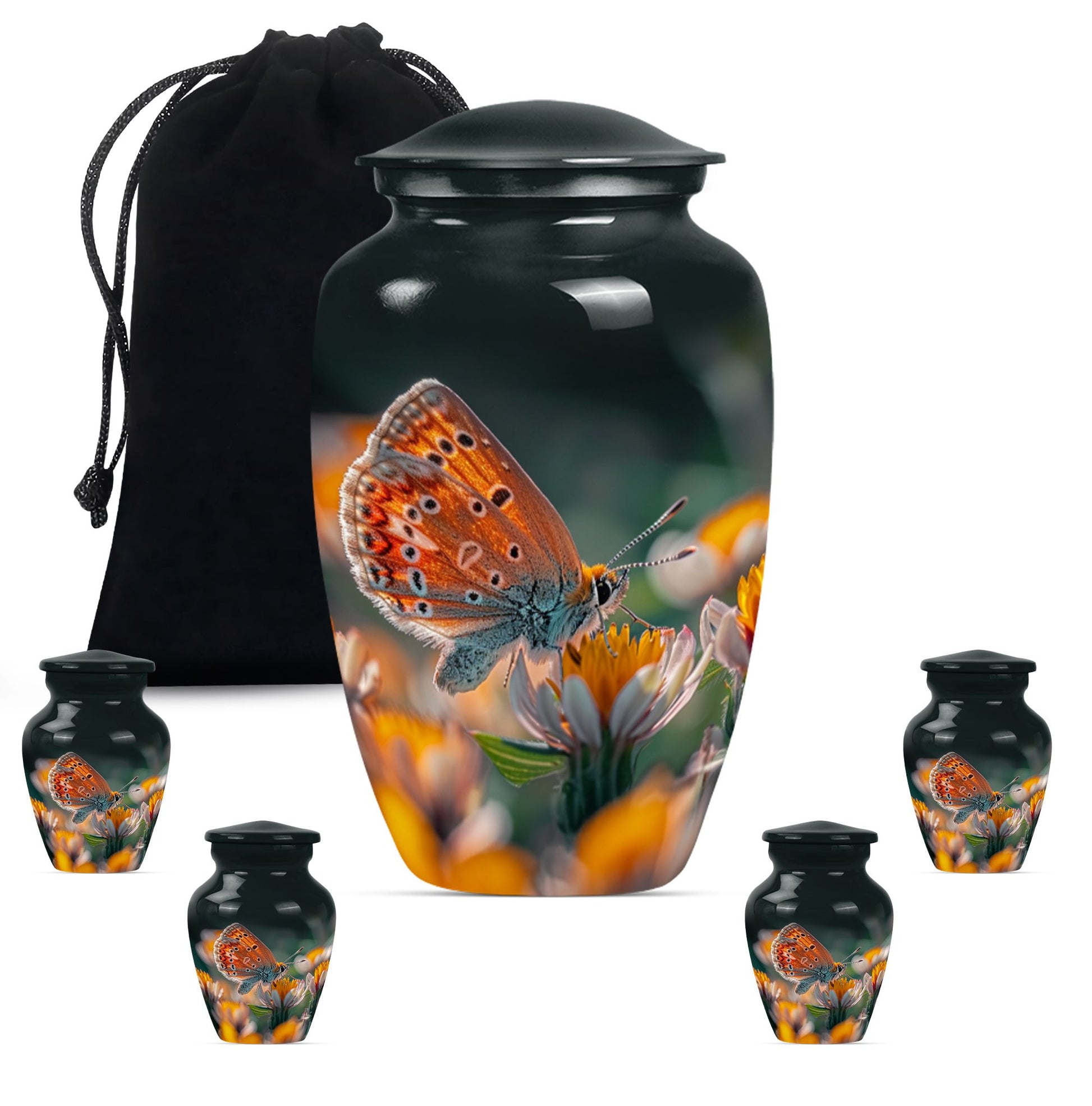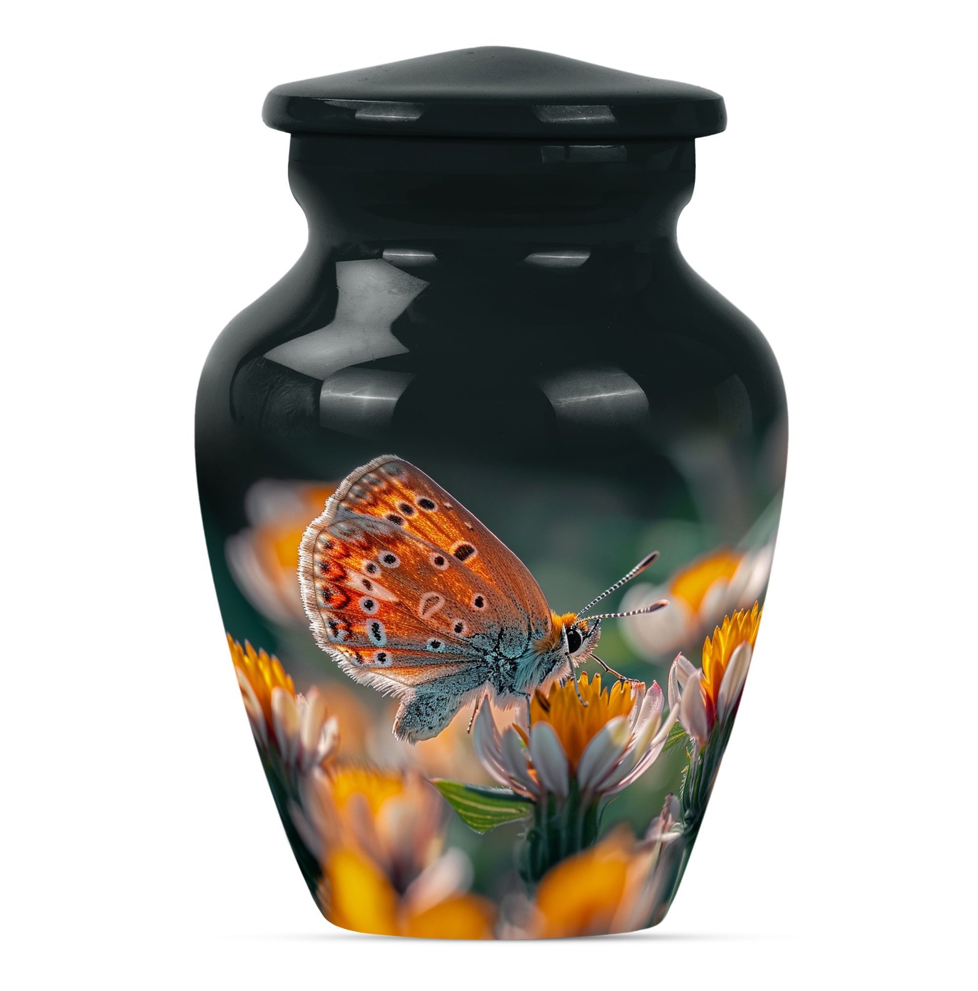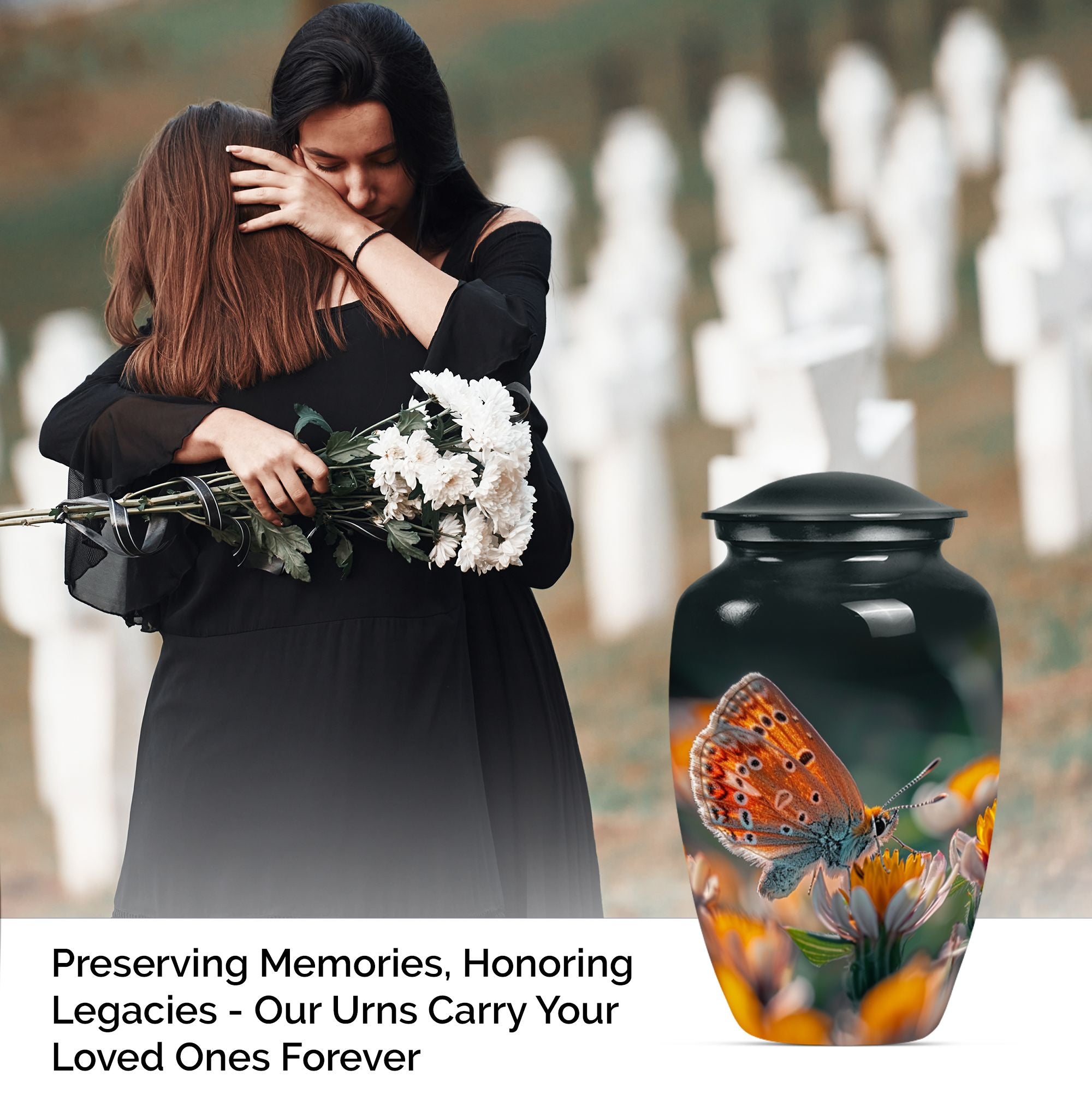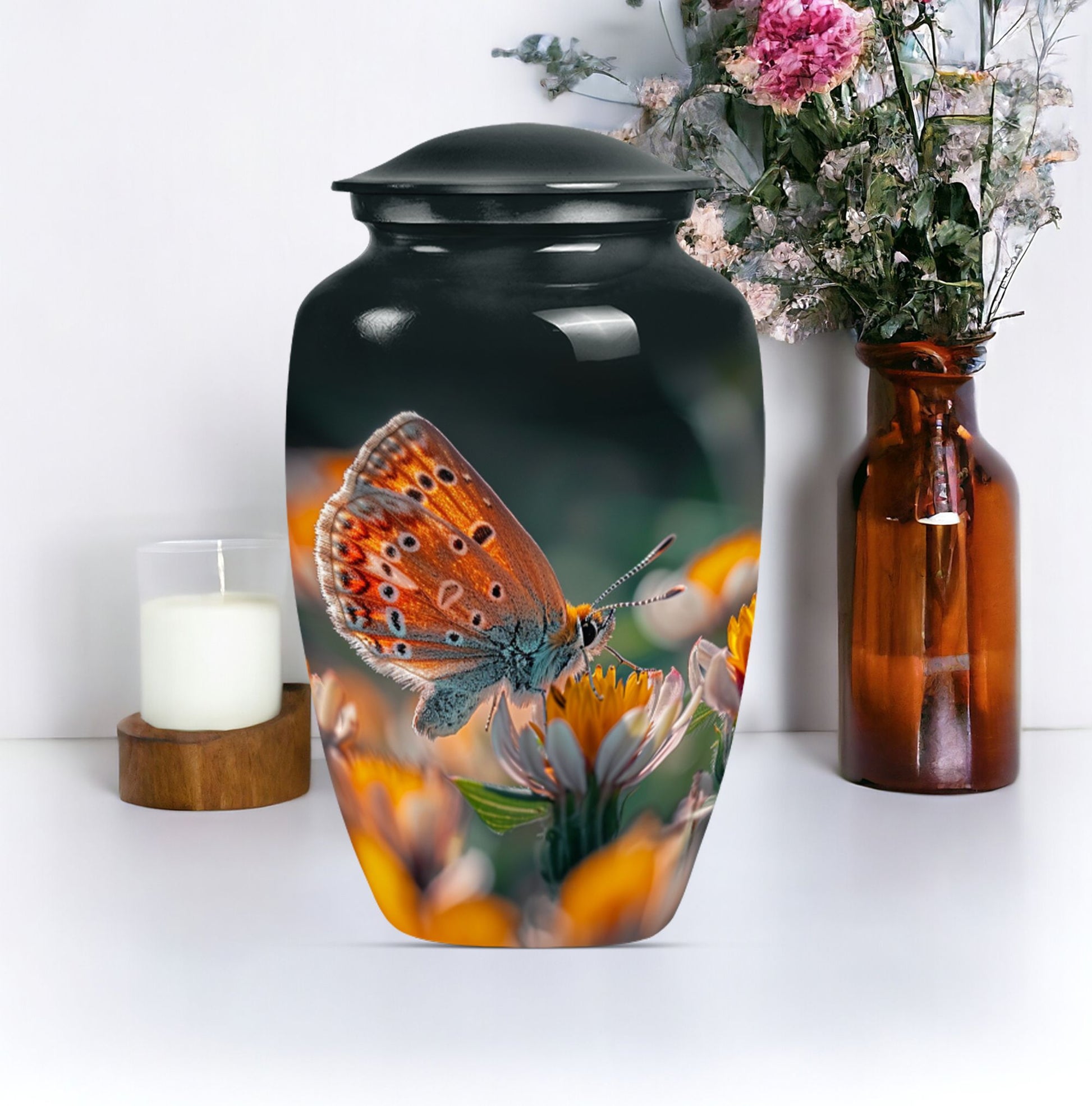 Experience a touching, individualized tribute to your departed loved ones with this 10-inch butterfly urn, an epitome of refined simplicity. Our cremation urn for human ashes melds the highest quality Aluminium material with a remarkable Classic Urn design, making it quintessential for life's final memorable journey. Weighing a sturdy 3.3 pounds and offering a 200 cubic-inch capacity, this funeral urn is designed to carefully preserve the essence of an adult or senior life. The Butterfly theme imprints nature's beauty, conveying hope and renewal amidst life's cycle. The urn comes with a velvet pouch to cradle the ashes thereby, ensuring the contained sanctity of your loved one's memory. We provide a facility to bring in a personal touch by engraving names. This large urn unites sentimental value and aesthetic charm, making it a perfect choice for memorial urns. Search phrases hinting 'cremation urns for men', 'funeral urns for women', and 'funeral urns ashes' sync beautifully with this pristine product. In the cycle of life and death, let this urn be a token of love, memory, and honor.