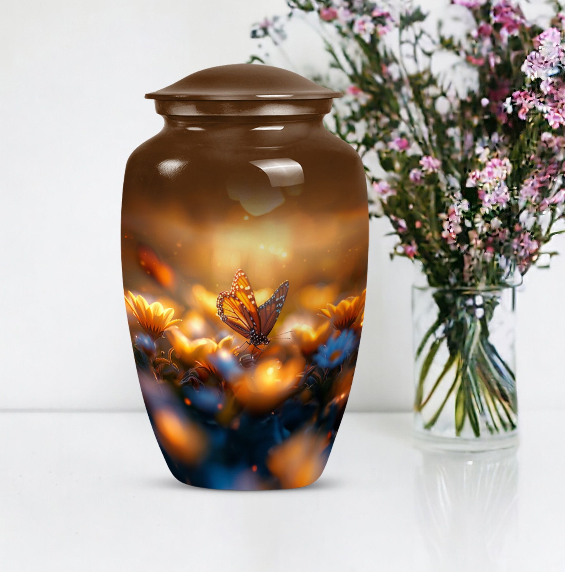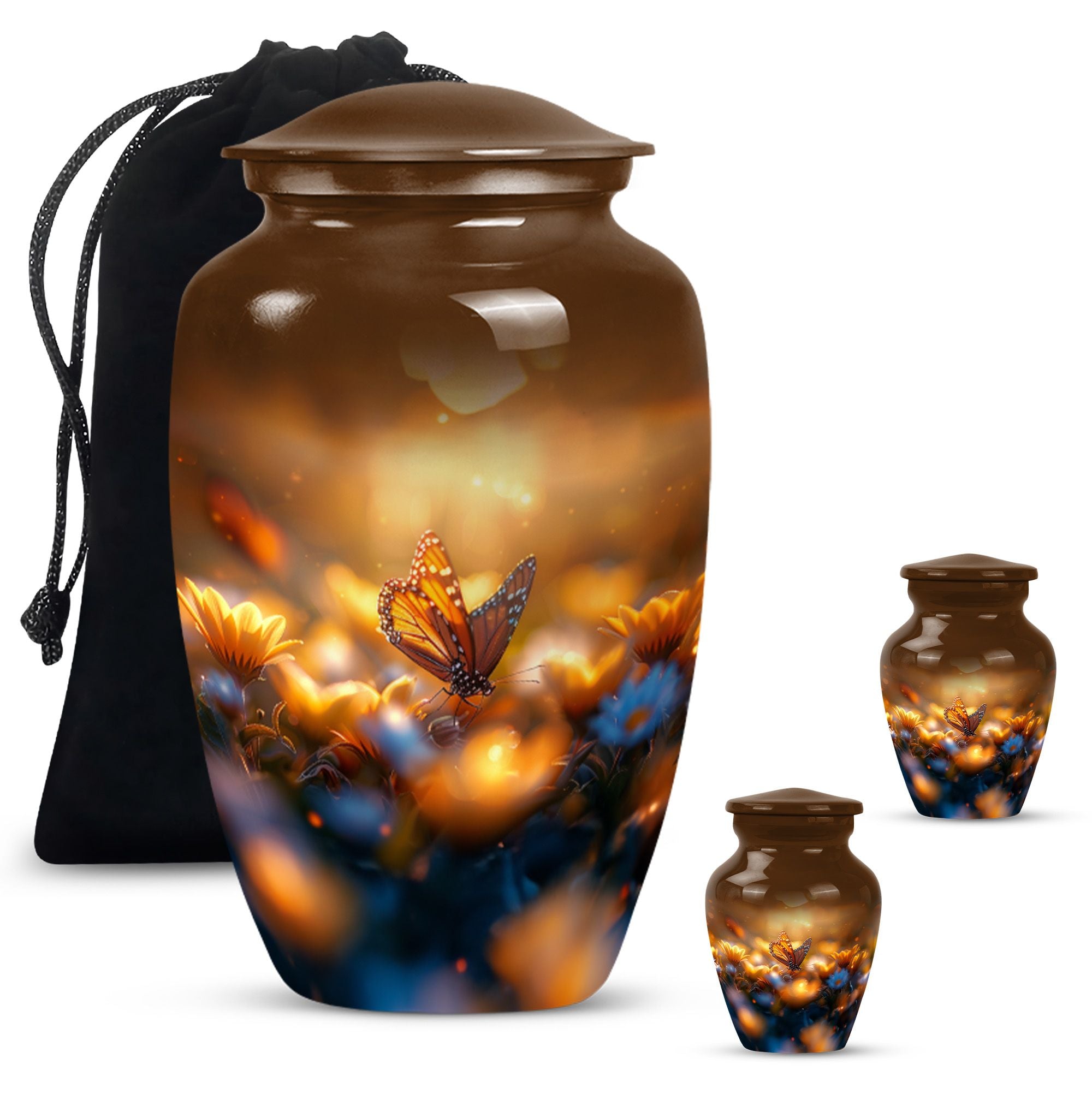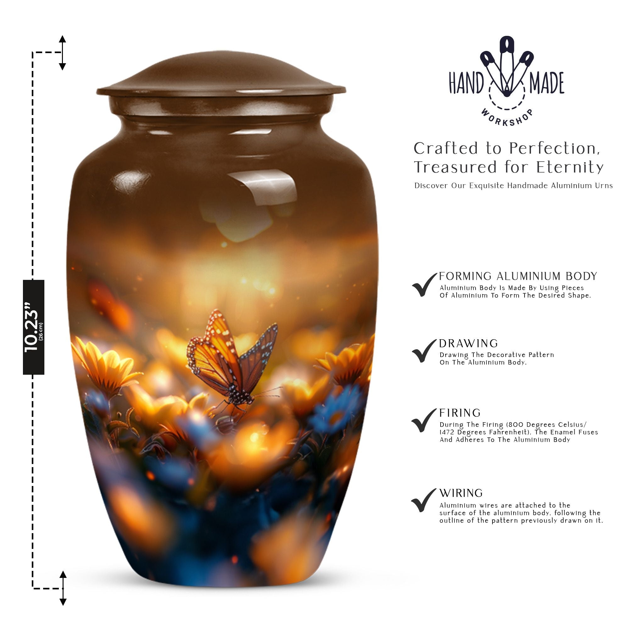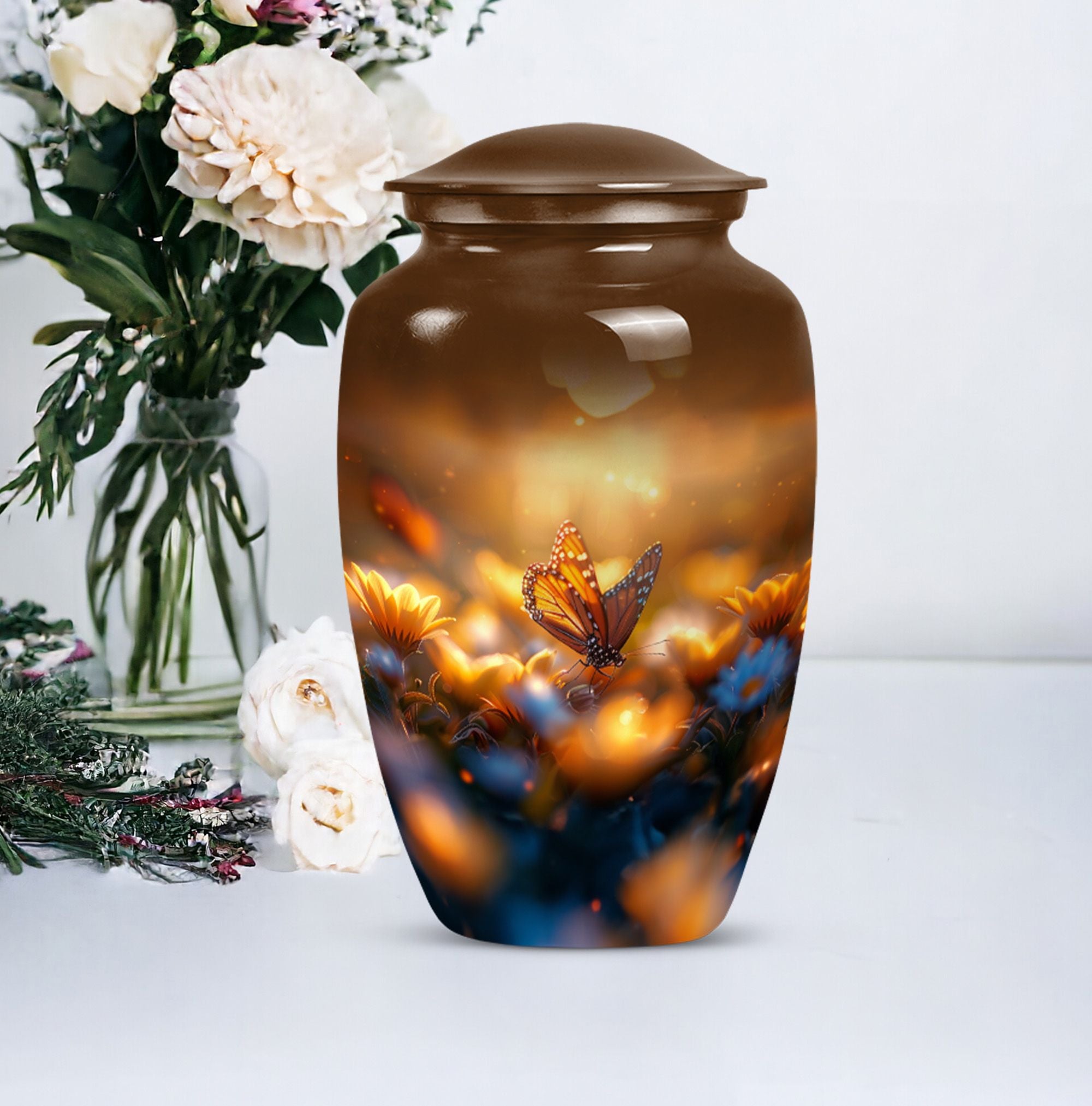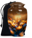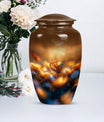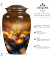 Evoke tranquility and remembrance with our distinguished 10-inch Butterfly Urn. Exuding eternal serenity, this large burial funeral urn is designed exclusively for adult ashes, be it for men or women. Etched with an abstract theme, this robust aluminium urn has an inherent strength to withstand burial in ground. It creates a captivating memorial for your loved one, elevating the traditional farewell ceremony to a profound emotional connection. The urn has an optimal capacity of 200 cubic inches, making it suitable for containing an average adult’s ashes comfortably. It weighs about 3.3 pounds, ensuring stability yet ease in handling. We also offer an opportunity to personalize this urn with engraved names, adding a unique touch to honor the cherished memory of your dear one. Included in your order is a soft velvet pouch specifically to maintain and contain the ashes. This cremation urn, often referred as 'memorial urn,' hence creating a timeless tribute to your beloved. Keywords include butterfly urn, burial funeral urns, large urn for ashes, ash adult ashes, women urn, earn cremation and metal urns, for a full range of the search options.