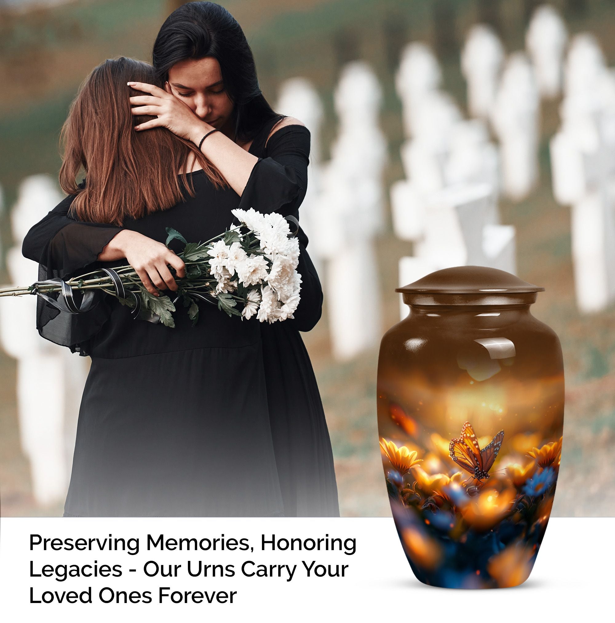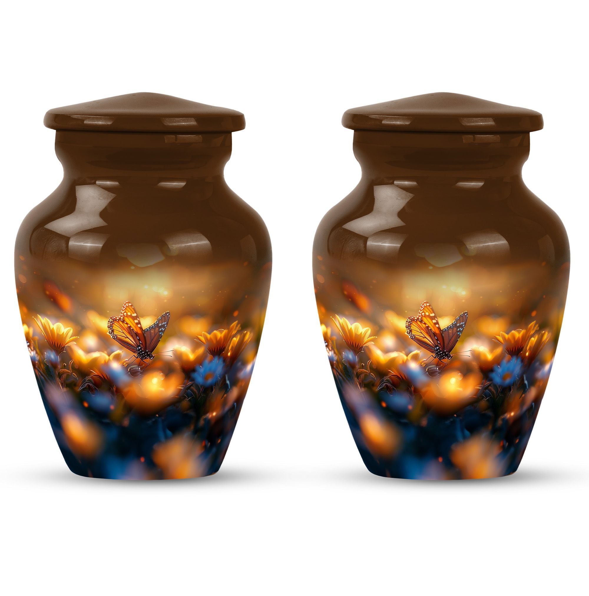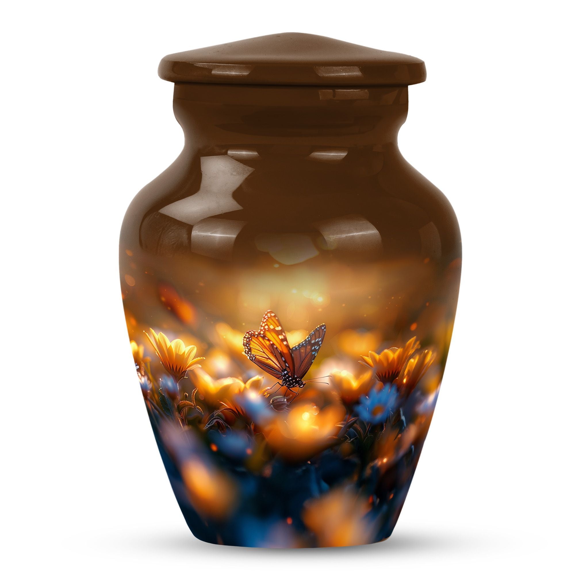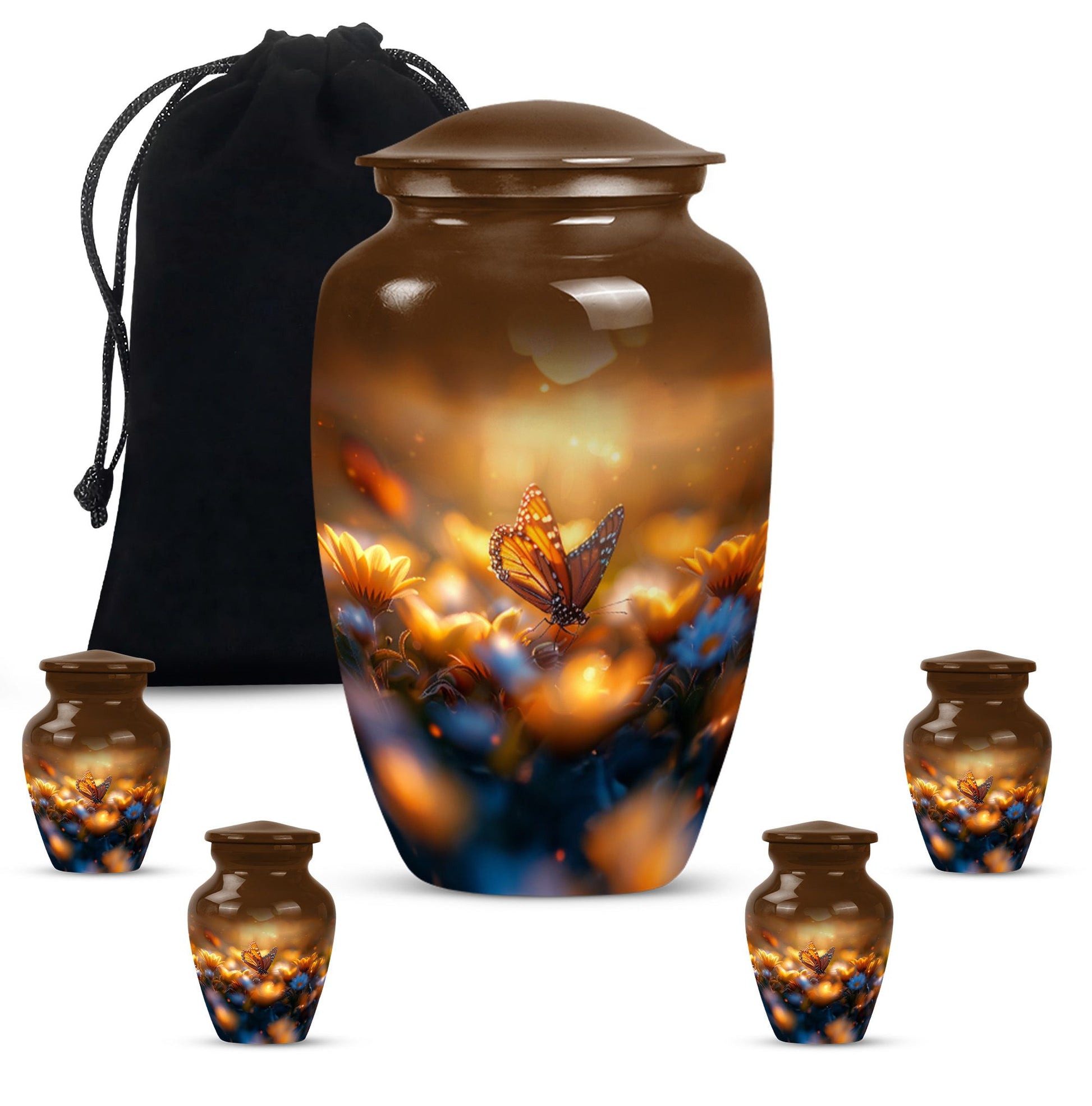 Evoke tranquility and remembrance with our distinguished 10-inch Butterfly Urn. Exuding eternal serenity, this large burial funeral urn is designed exclusively for adult ashes, be it for men or women. Etched with an abstract theme, this robust aluminium urn has an inherent strength to withstand burial in ground. It creates a captivating memorial for your loved one, elevating the traditional farewell ceremony to a profound emotional connection. The urn has an optimal capacity of 200 cubic inches, making it suitable for containing an average adult’s ashes comfortably. It weighs about 3.3 pounds, ensuring stability yet ease in handling. We also offer an opportunity to personalize this urn with engraved names, adding a unique touch to honor the cherished memory of your dear one. Included in your order is a soft velvet pouch specifically to maintain and contain the ashes. This cremation urn, often referred as 'memorial urn,' hence creating a timeless tribute to your beloved. Keywords include butterfly urn, burial funeral urns, large urn for ashes, ash adult ashes, women urn, earn cremation and metal urns, for a full range of the search options.