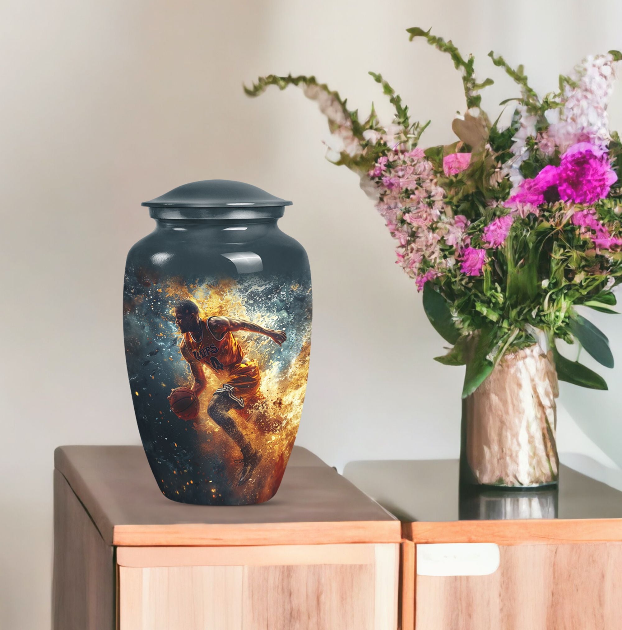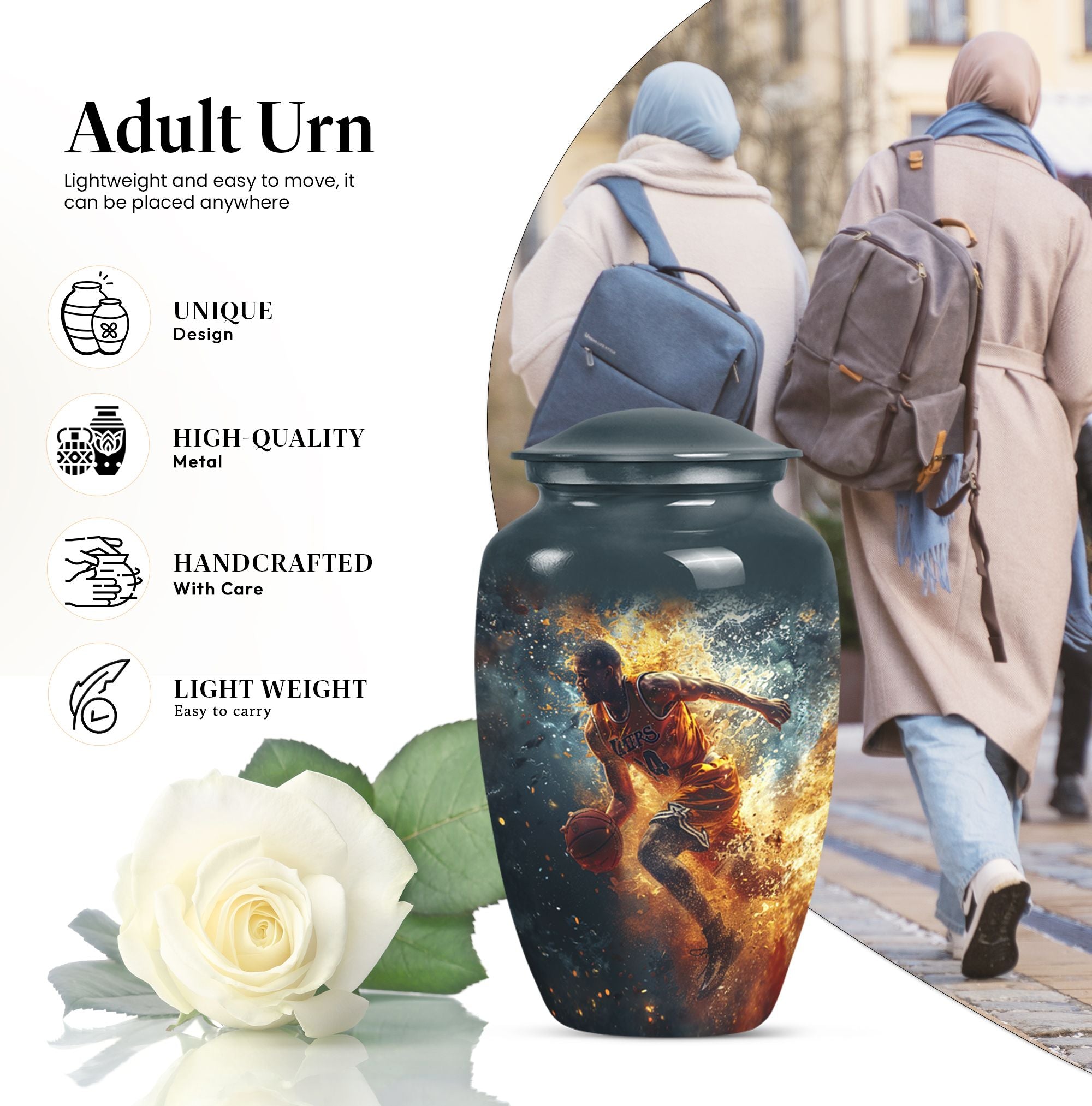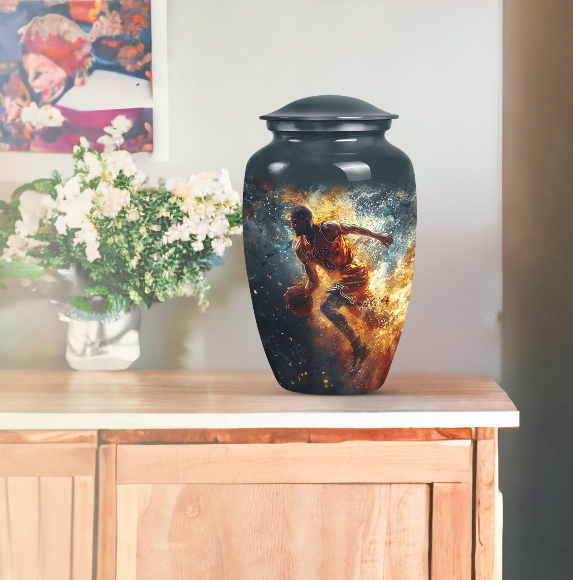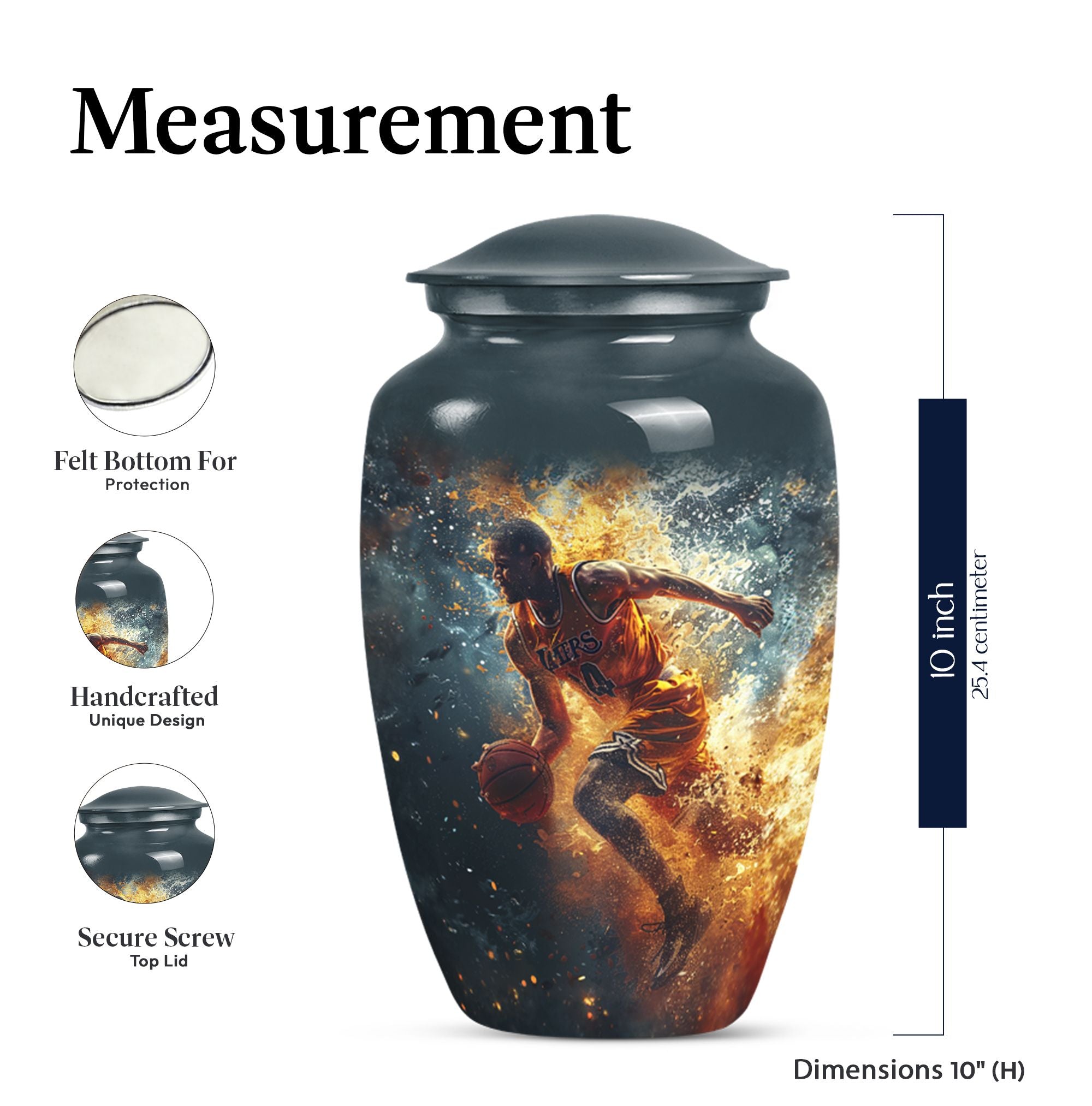 Honor the memory of your loved ones with our 10-inch basketball urn. This large urn made of durable aluminium is designed to securely hold up to 200 cubic inches of burial ashes. Weighing just under 3.3 pounds, it's a substantial and sturdy choice for safely preserving cremation remains. The shimmer of the aluminium material aptly reflects the homage and respect you still hold for them. In preparation for memorial ceremonies, the urn comes neatly packaged in a velvet pouch, ensuring that the containment of ashes is both respectful and elegant. We offer the added touch of personalization - engrave the names of your loved ones for a truly unique tribute. Our butterfly theme provides a gentle reminder of the beauty and transience of life. This cremation urn is specifically designed for adults and seniors, and is an elegant selection within urns for cremation ashes. Its classic urn style fits seamlessly within your home decor, acting as a subtle remembrance of your loved one. Please note that the design is pre-fixed and any customization applies only to the name engraving.