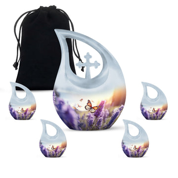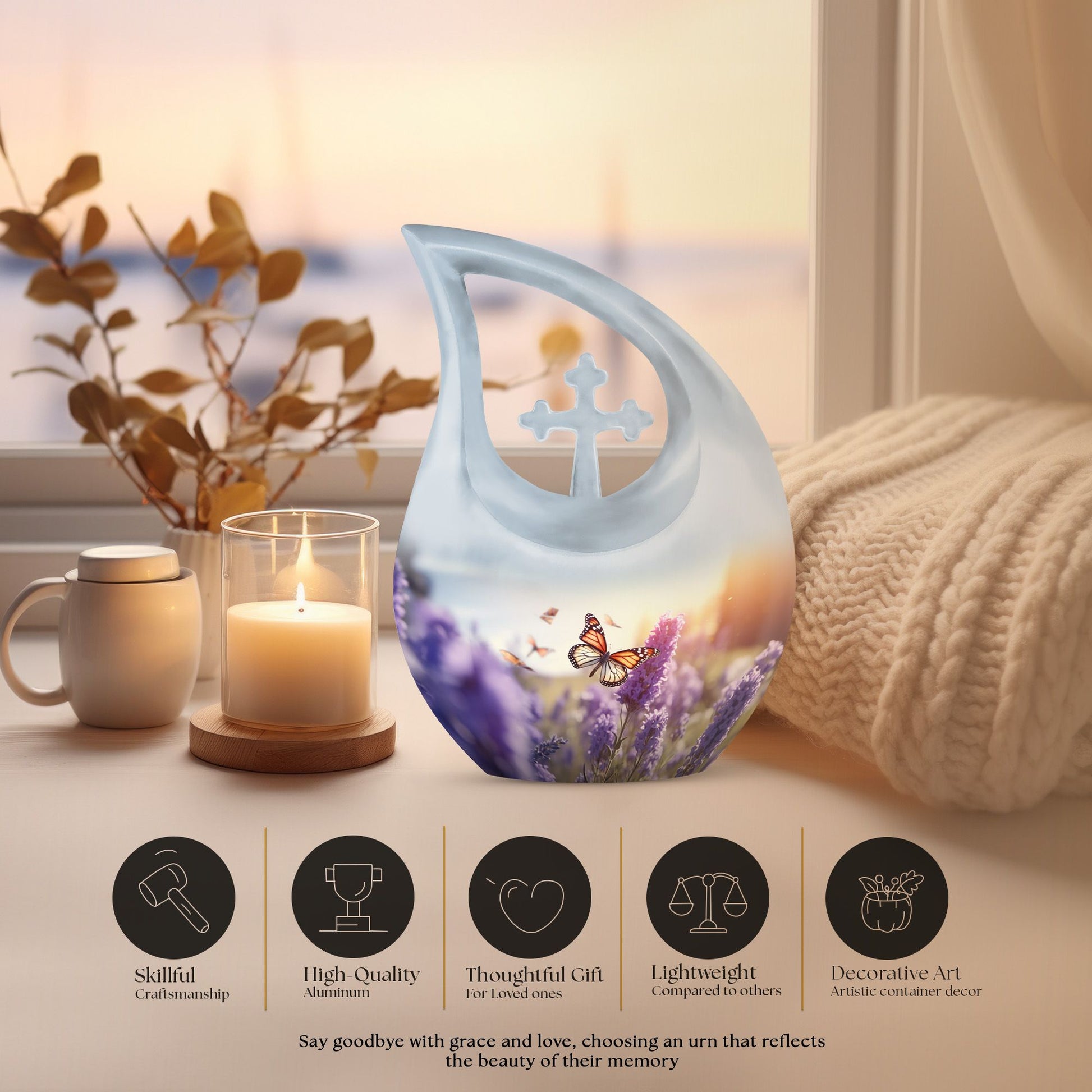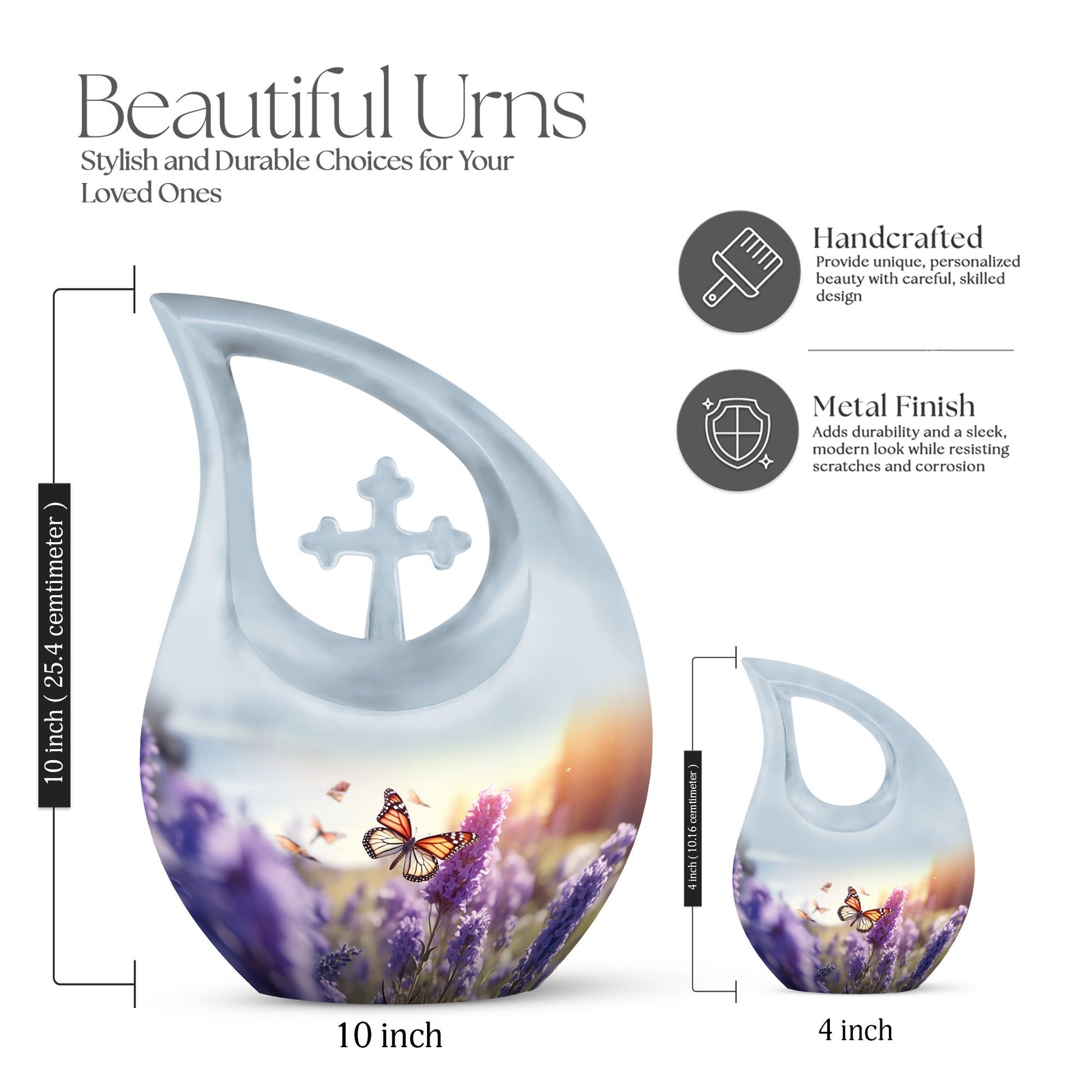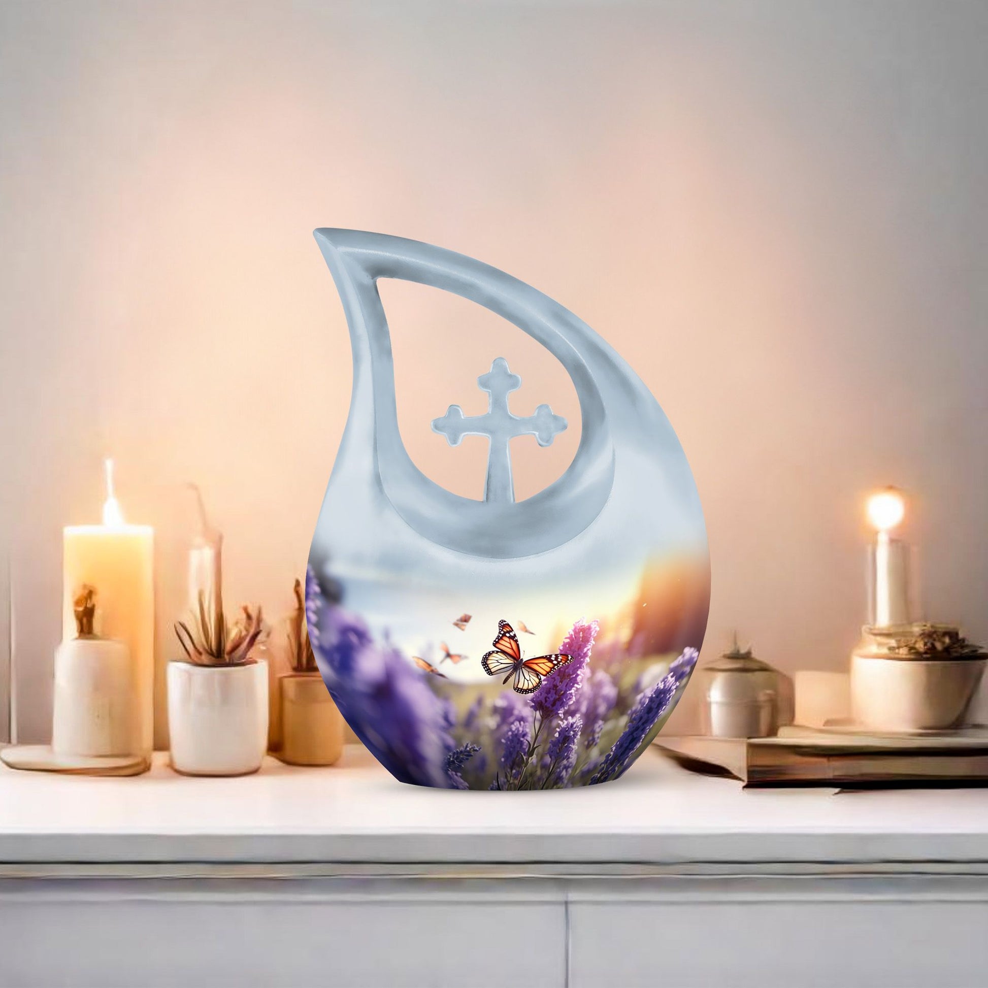 Crafted from premium aluminium, this 10 inch urn features delicate purple florals with a radiant butterfly in flight—creating a gentle, elegant design that resonates with remembrance. The secure screw-top lid ensures safe preservation of ashes, while its fine craftsmanship makes it suitable as a central display piece or paired with coordinating small keepsake urns for human ashes, small decorative urn, or other urns for ashes small keepsake options for family sharing.