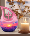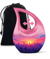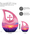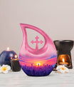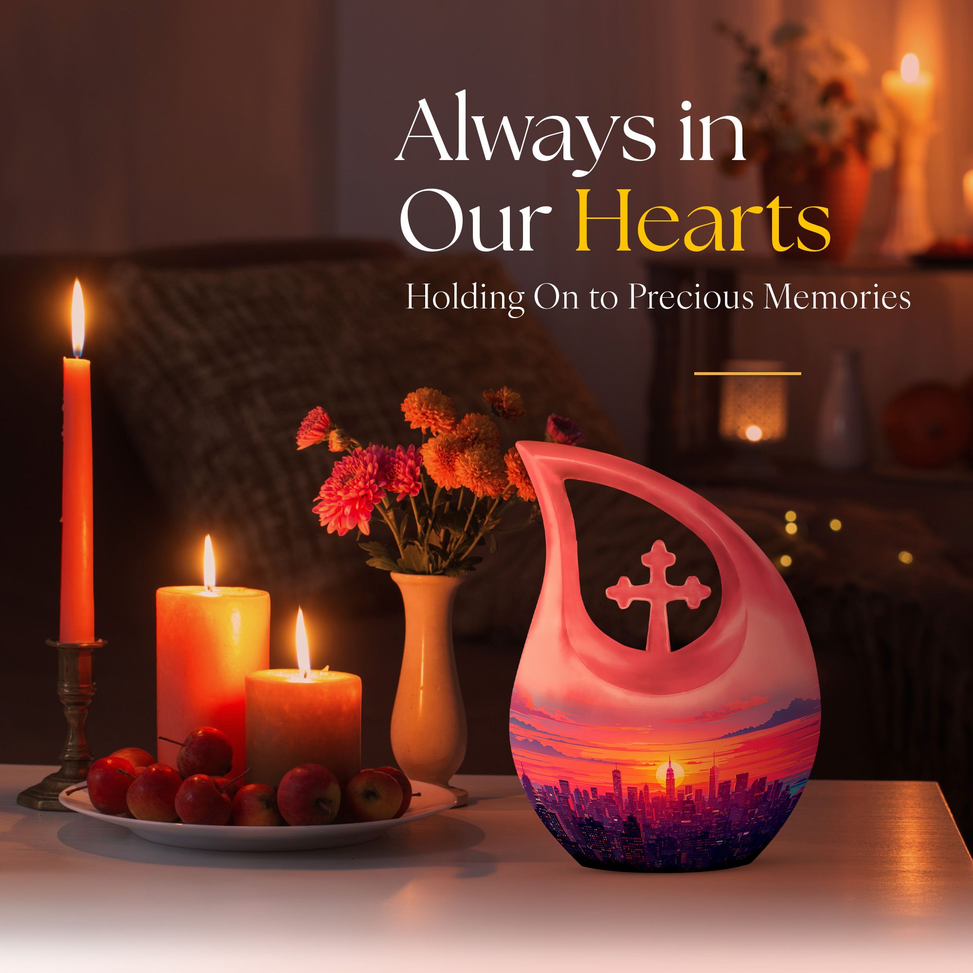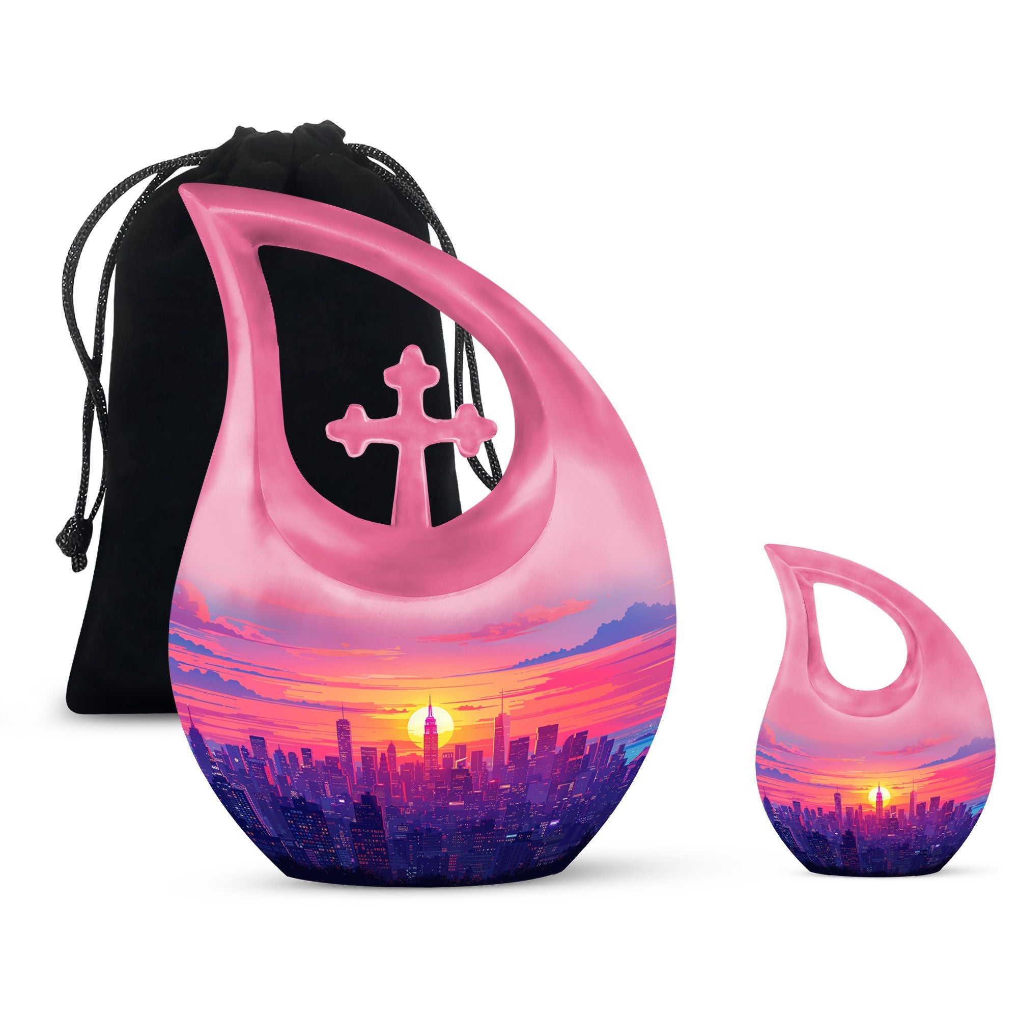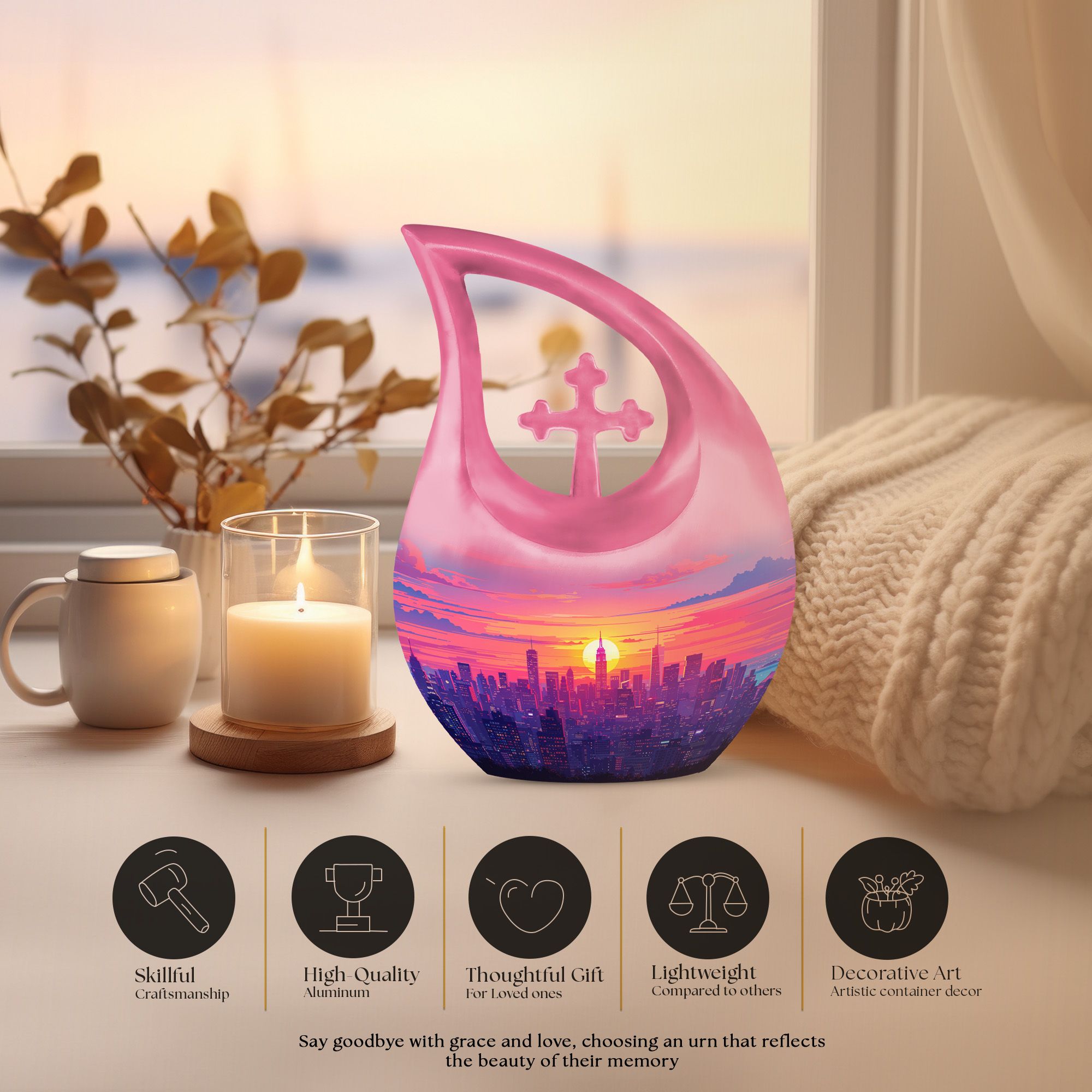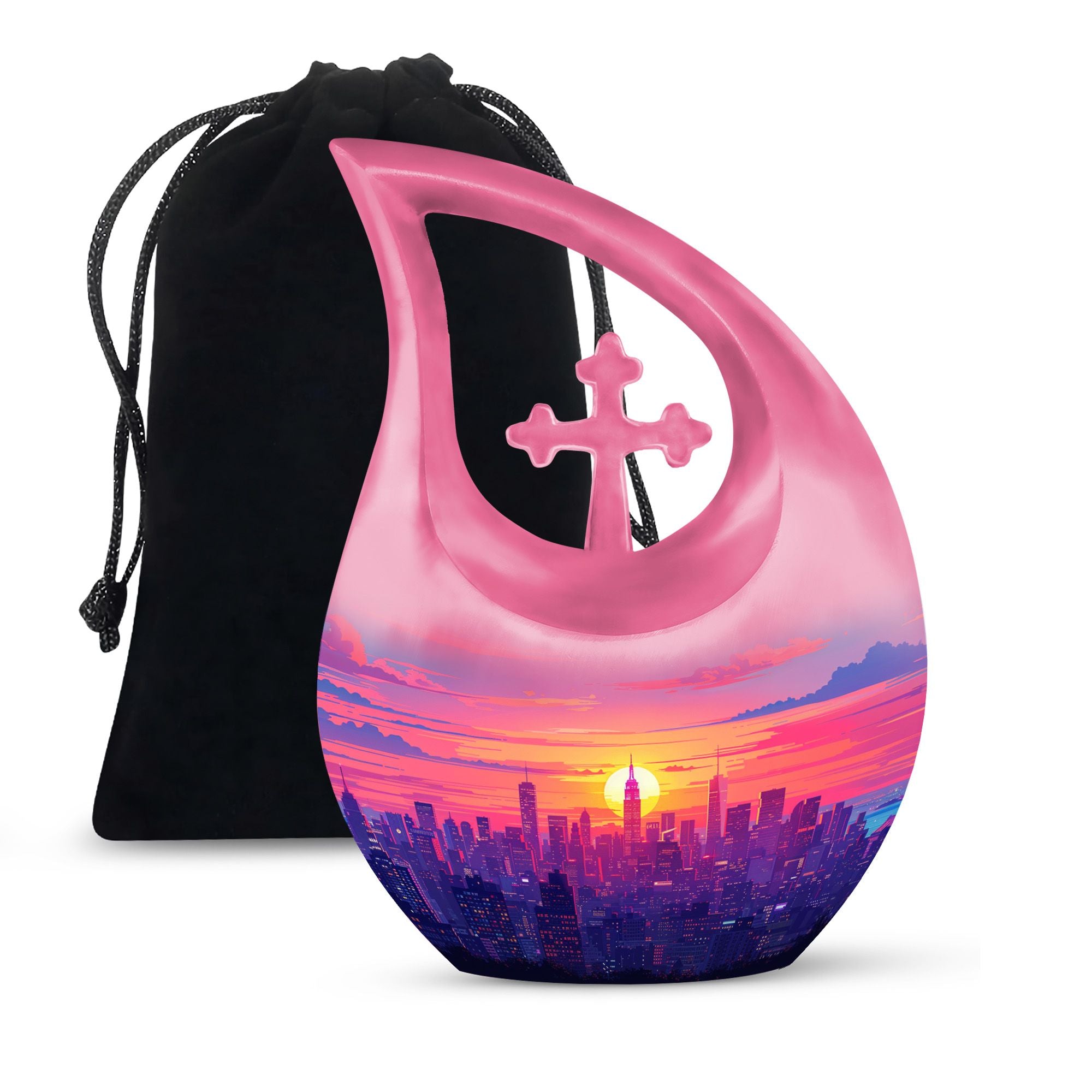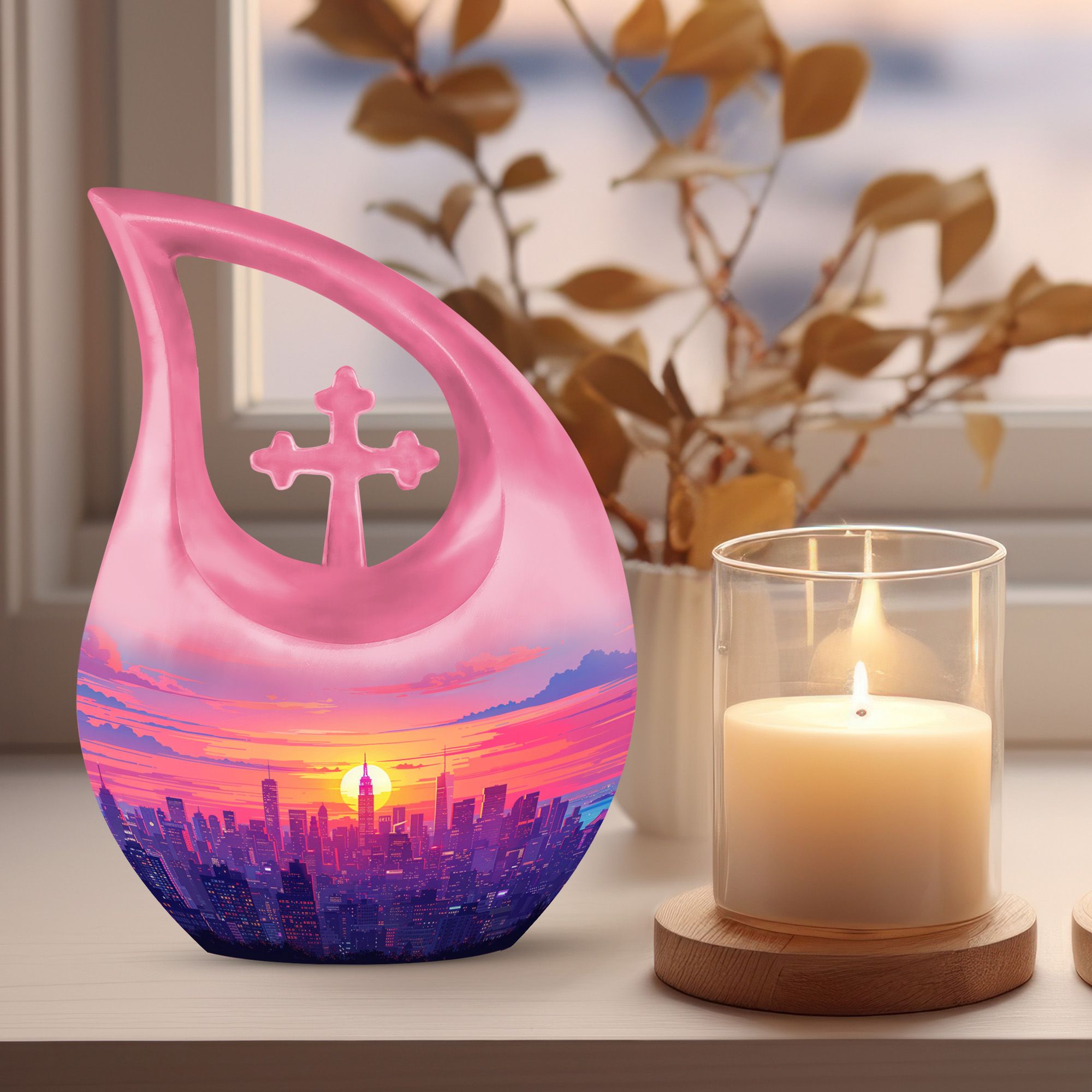 The Pink Sunset Cityscape Urn with Cross Design is a touching tribute to a cherished soul, created to hold memories as beautifully as it holds ashes. Its gentle pink tones and serene cityscape pattern evoke calmness, while the delicate cross signifies faith and everlasting love. This large urn for adult ashes serves as a meaningful way to honor a life well-lived and deeply loved.