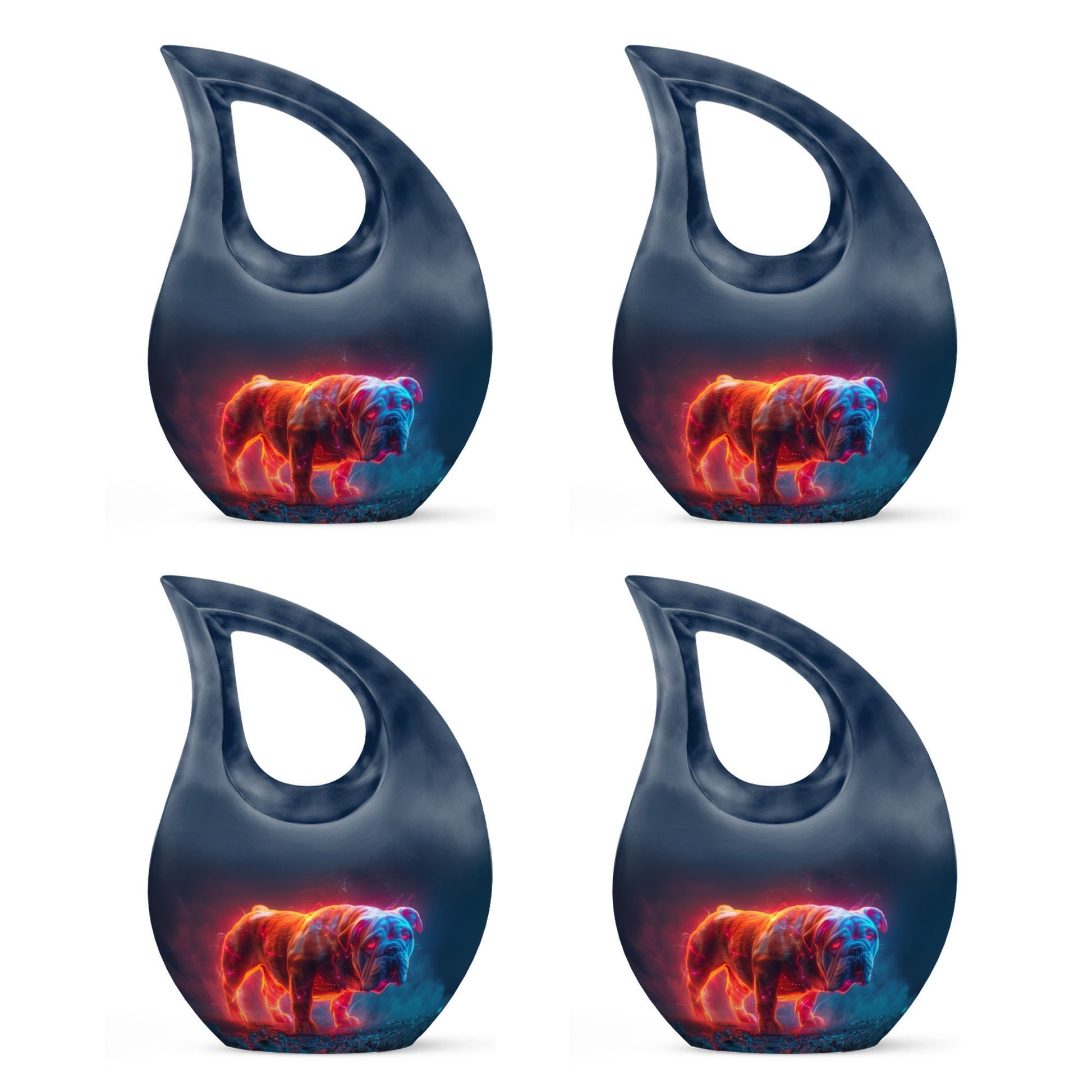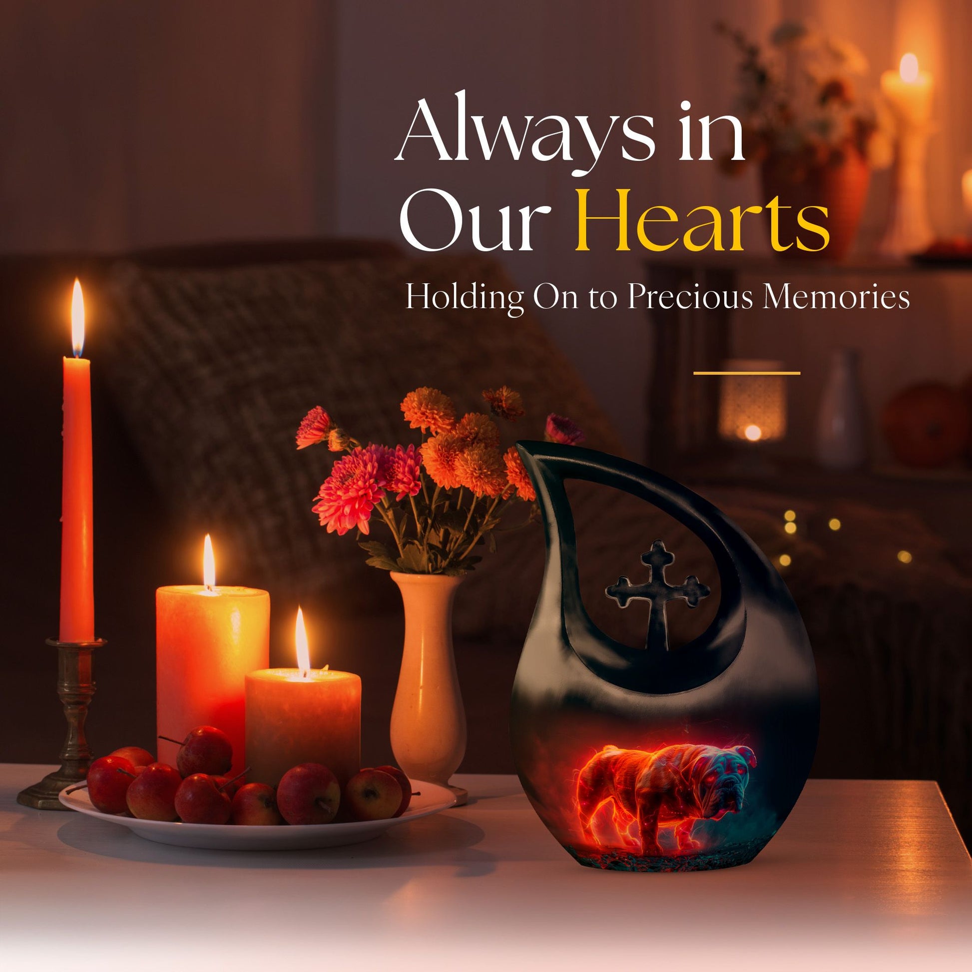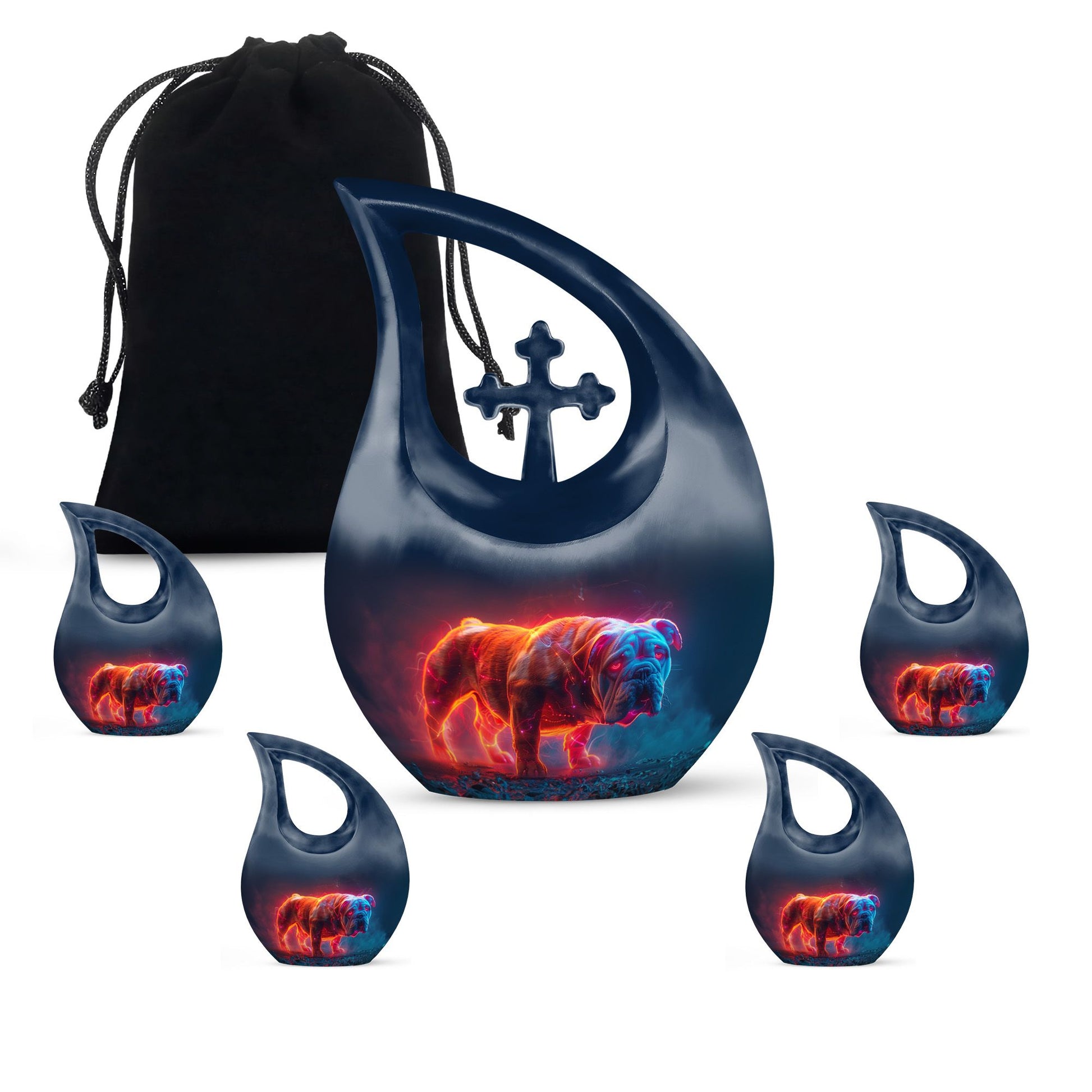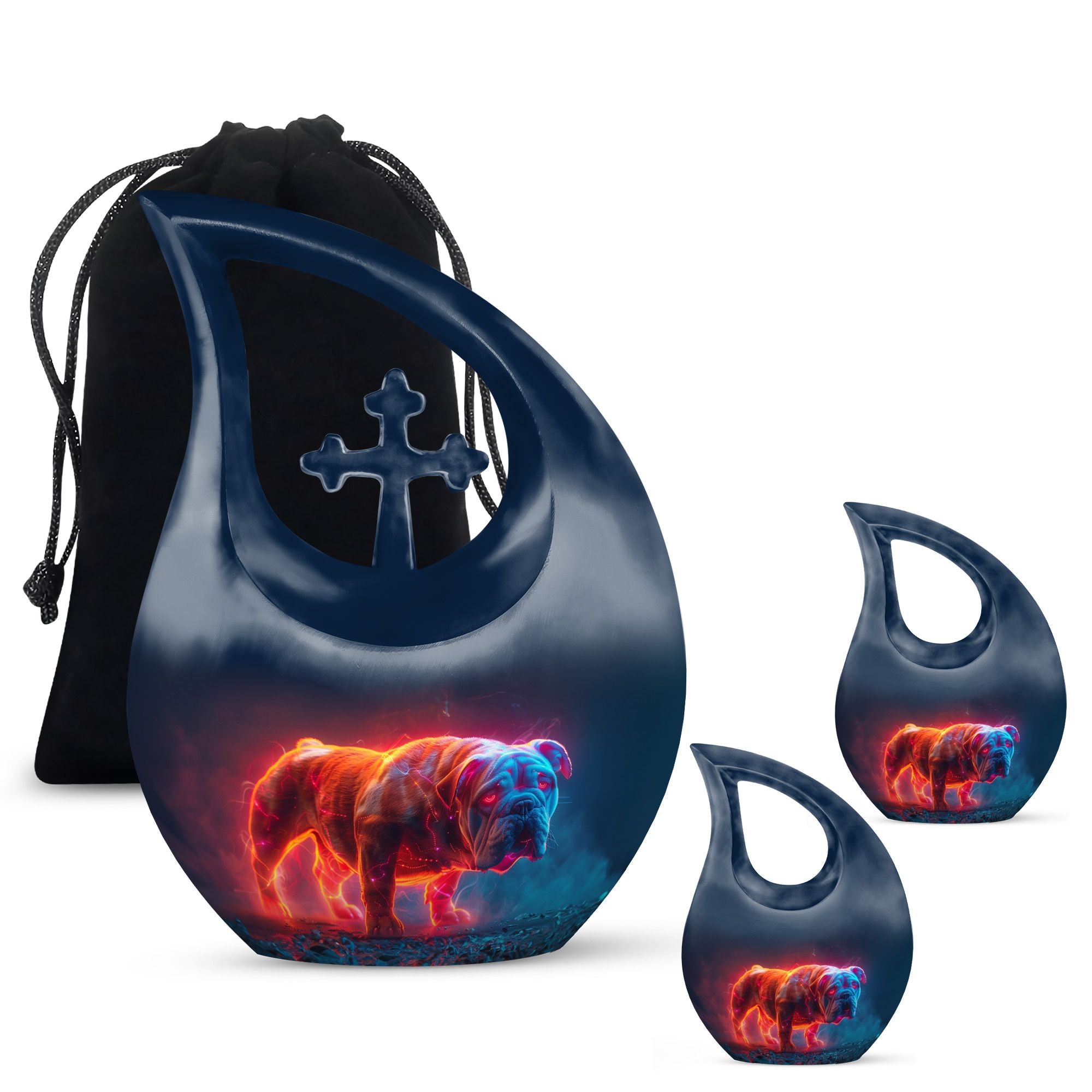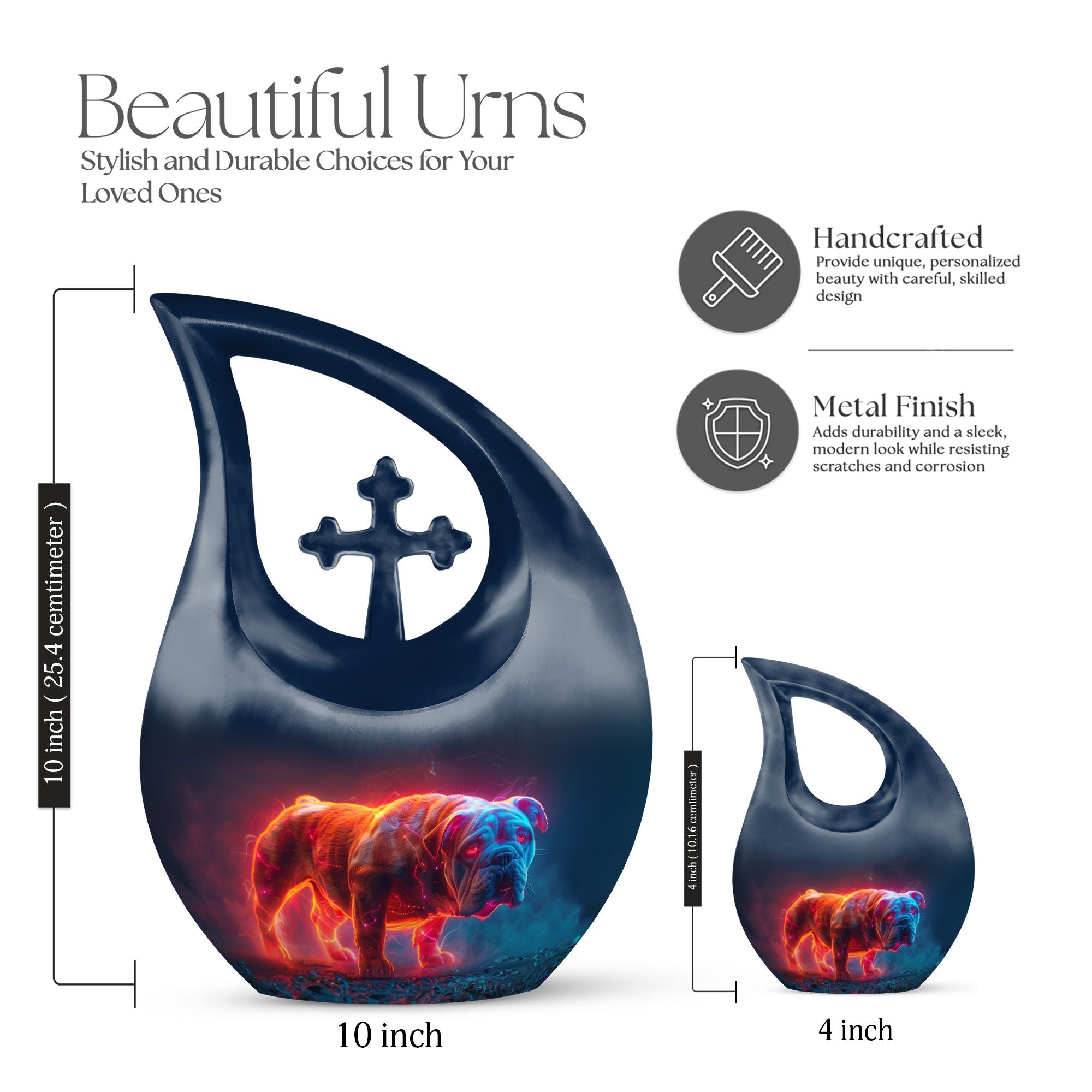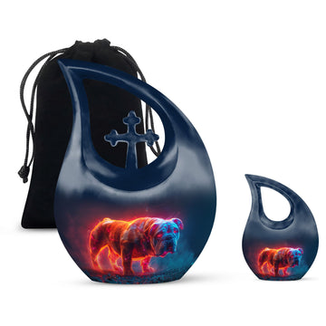 Treasure the memory of your beloved pet with our Canine Combustion Urn. It is one of our large urns, meticulously crafted using high-quality aluminium. Standing at 10 inches, with a weight of just 3.3 pounds, it elegantly displays a distinctive 'Cross Drop' motif which embraces the theme of Canine Combustion. With an impressive capacity of 200 cubic inches, it ensures sufficient space for the containment of ashes. For secure storage, the package includes a velvet pouch. Adding further essence to memorial urns, our customization service allows you to personalize your canine's final resting place by engraving their name. Refrain from settling for the ordinary, rather, select our custom-made urn, which serves as a worthy tribute to your treasured pet. Whether looking for keepsake urns or cremation boxes, our urns bridge the gap between quality craftsmanship and emotional honor.