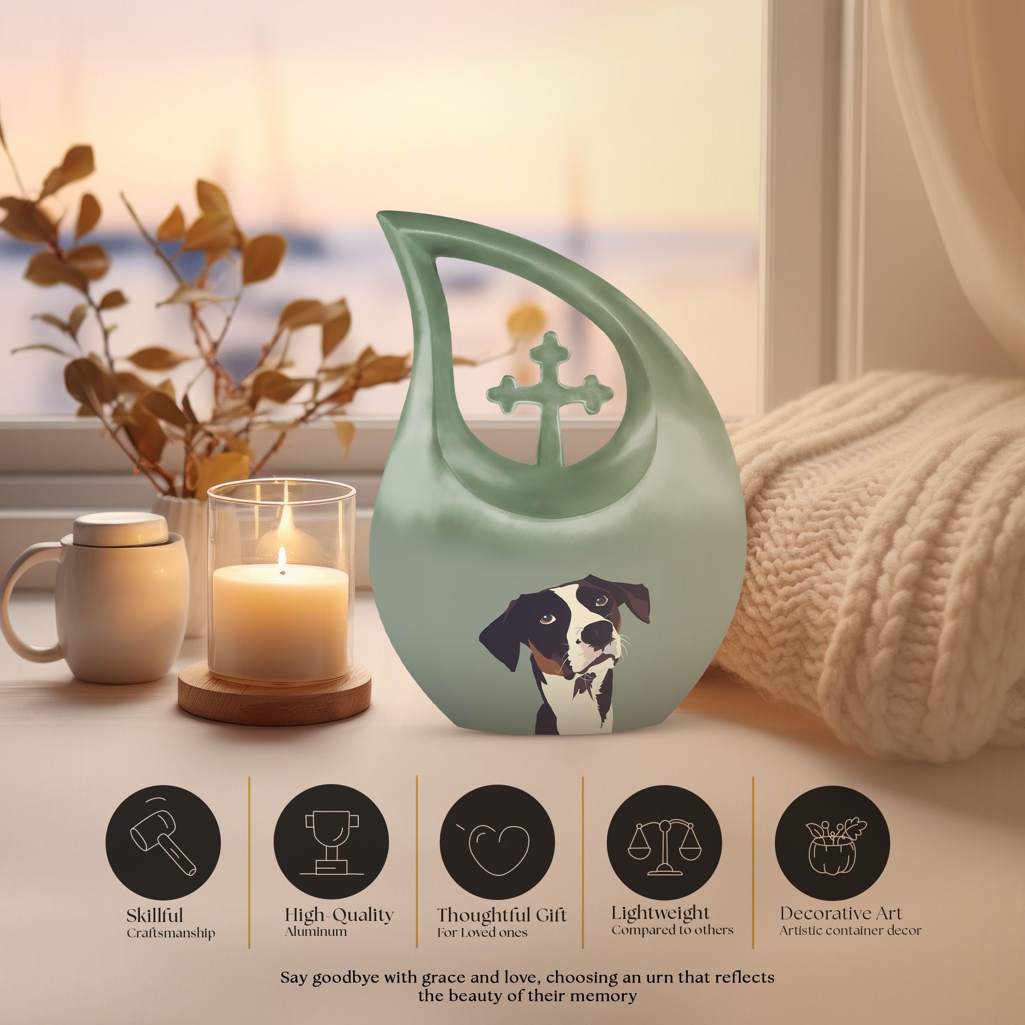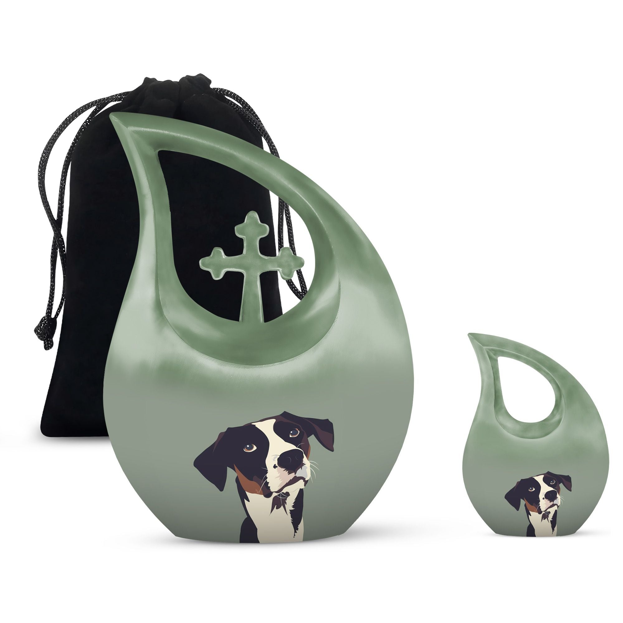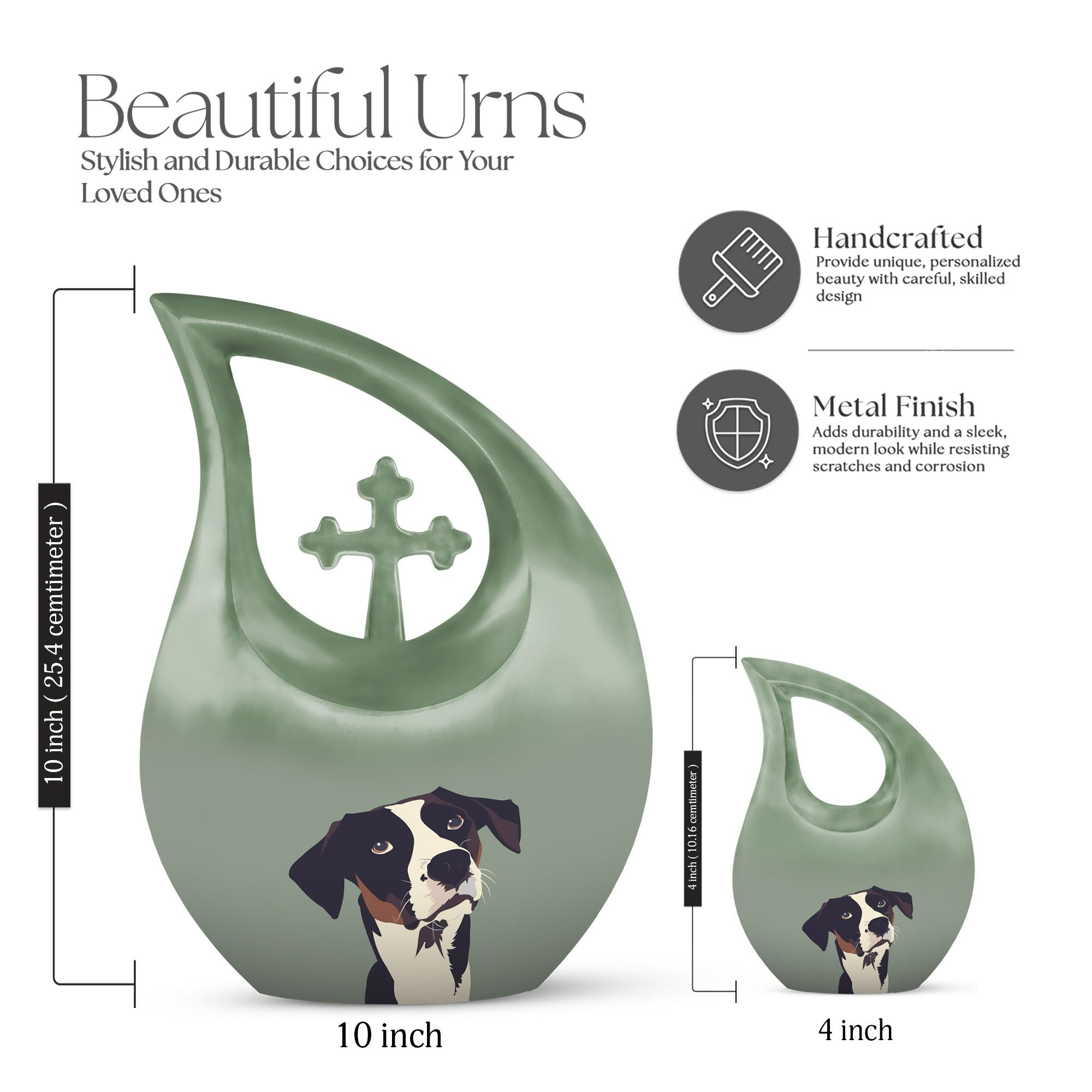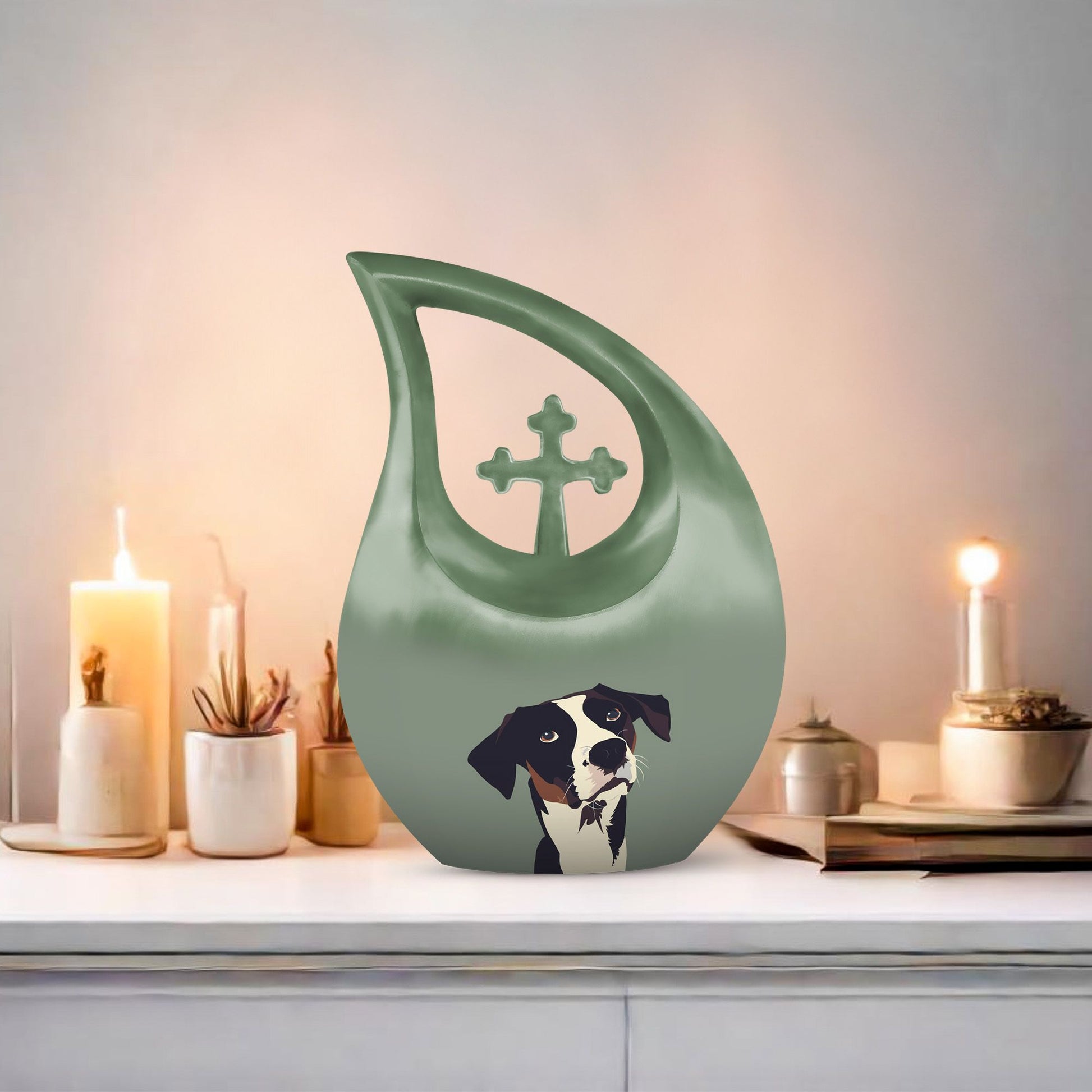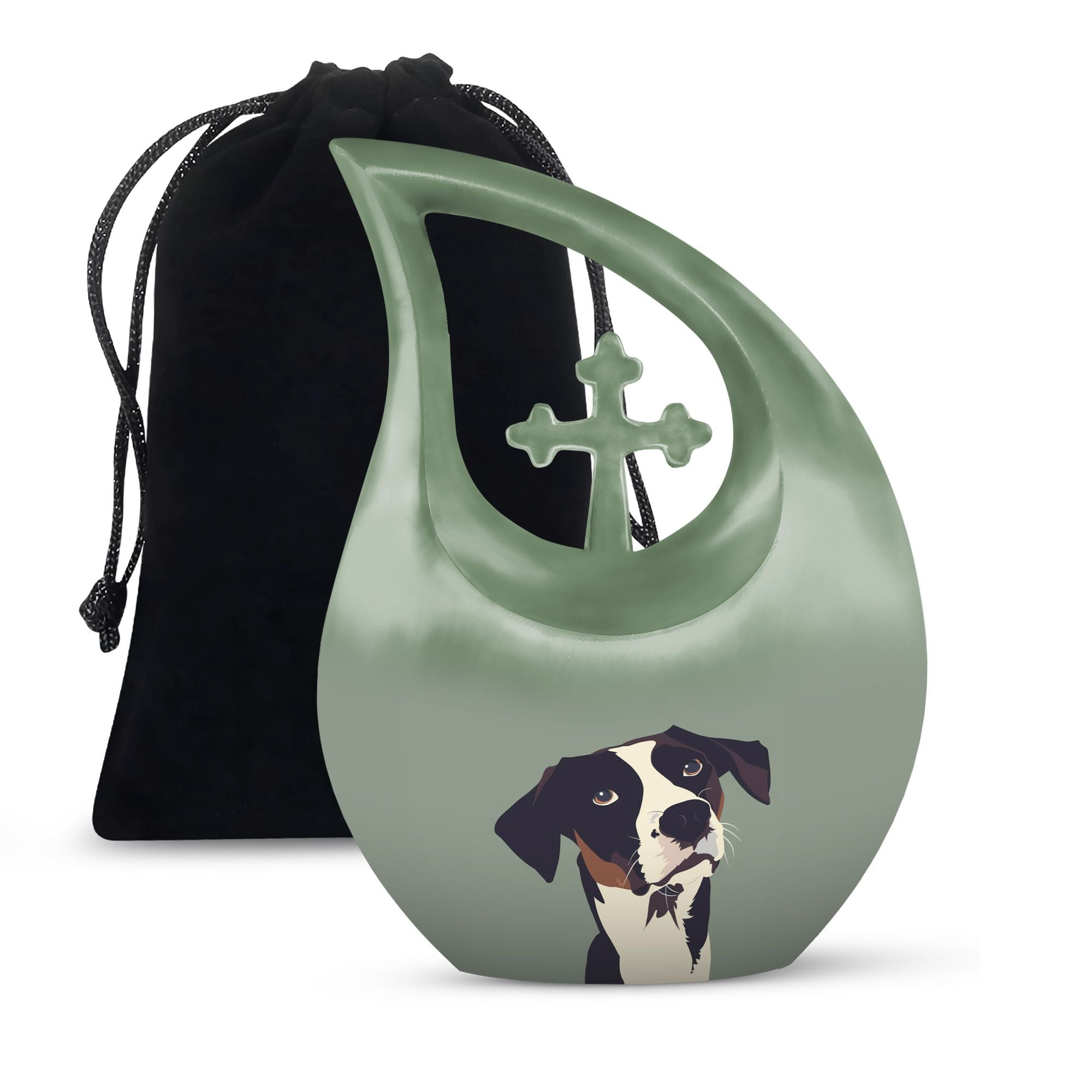 Pay tribute to your beloved canine companion with our unique Canine Minimalism Urn. An Extra Large urn conveniently designed for a capacity of 200-cubic inches of ashes. It stands perfectly at 10 inches in height and weighs in at 3.3 pounds, demonstrating sturdy build quality. Made from high-grade Aluminium, it holds firm against the test of time. The fulfilment of custom desires is also acknowledged as one can easily personalize the urn with engraved names. This urn is extra-large in volume and comes with a velvet pouch for safe containment and transport of ashes. Unique keywords associated with such urns include 'Burial Urns For Sale, 'Urns For Mother's Ashes', and 'Small Urns for Dad'. Perfectly sized for use in different ceremonial usages. Note that the urn boasts a 'Cross Drop' envisage, delivering a warm ambiance to the remembrance of your loved one.