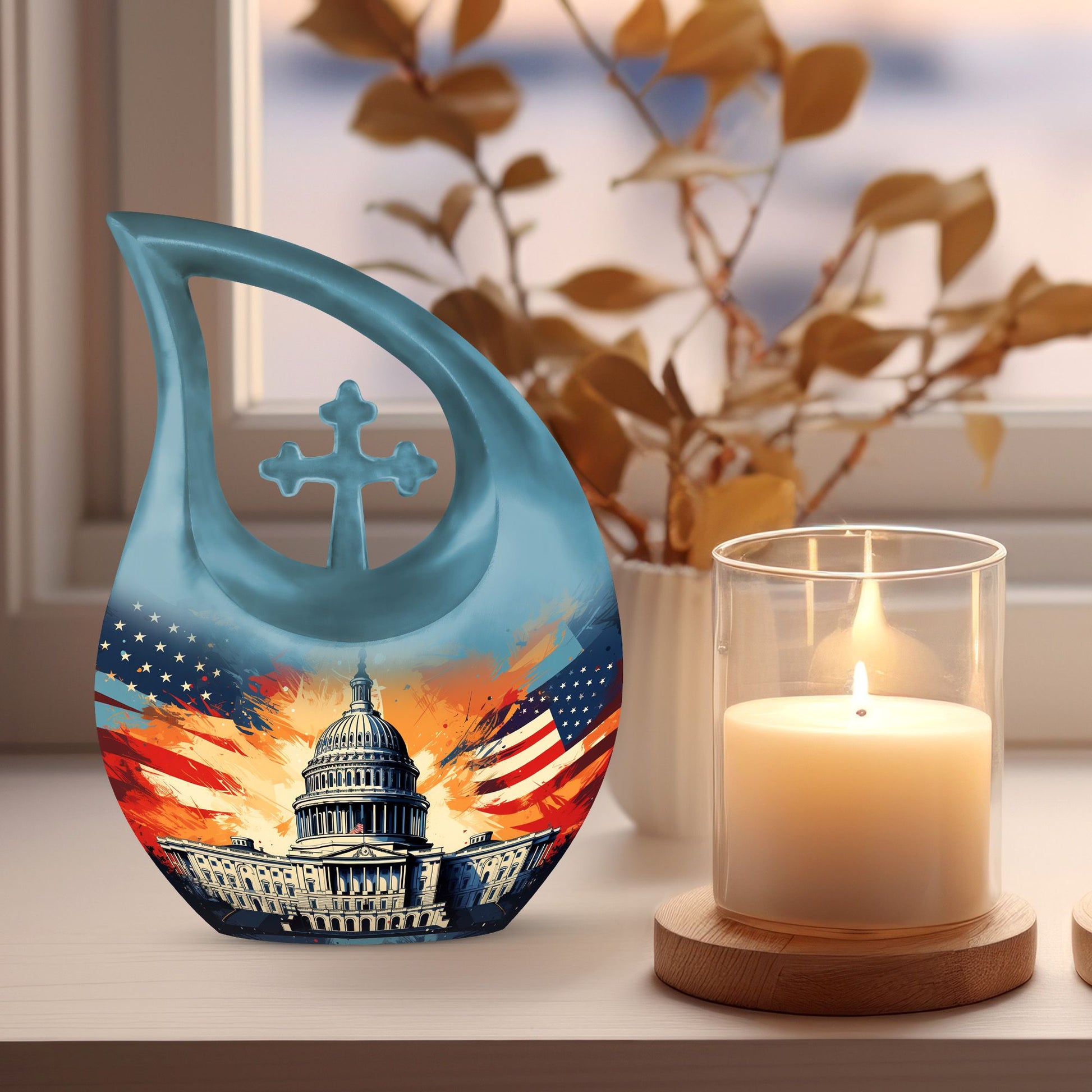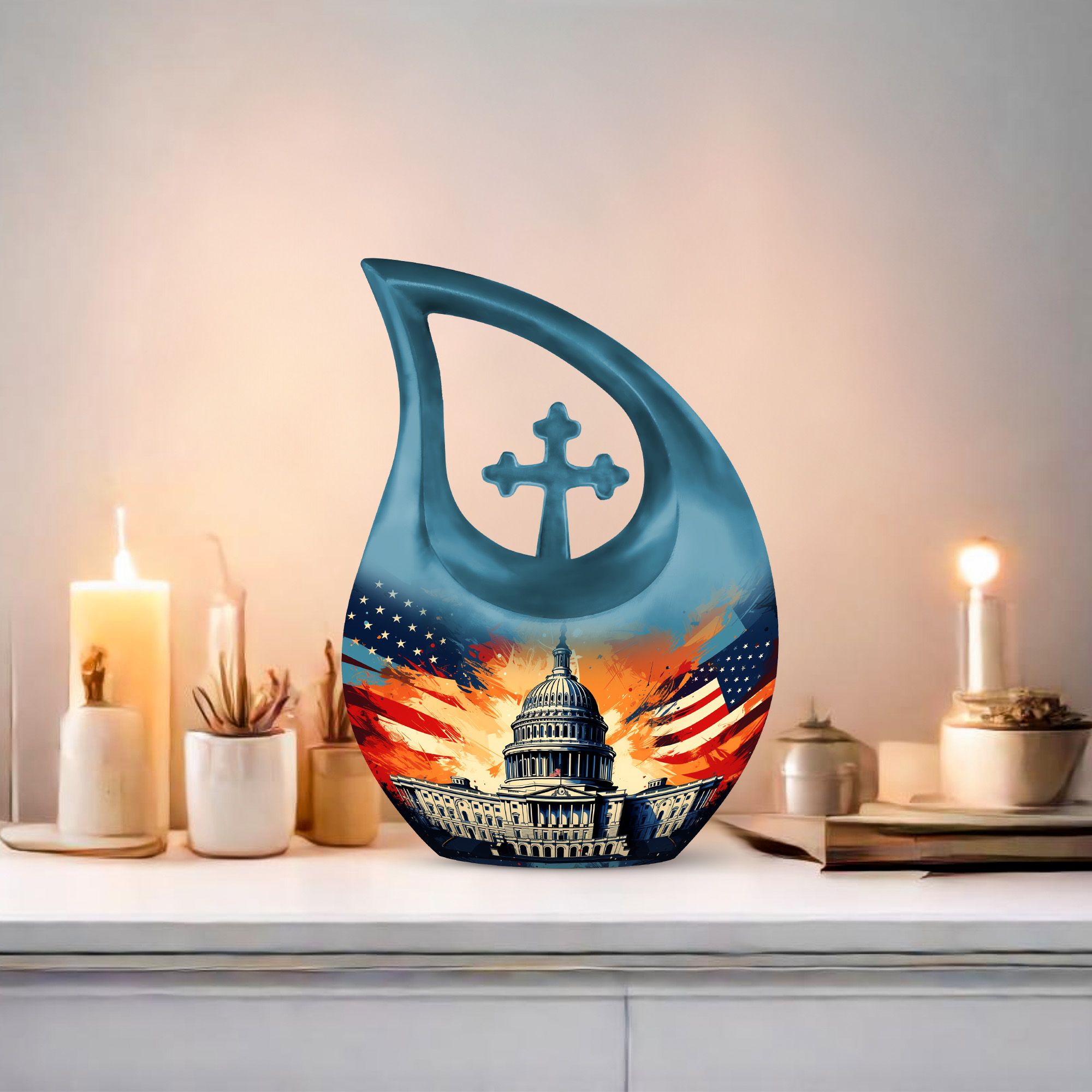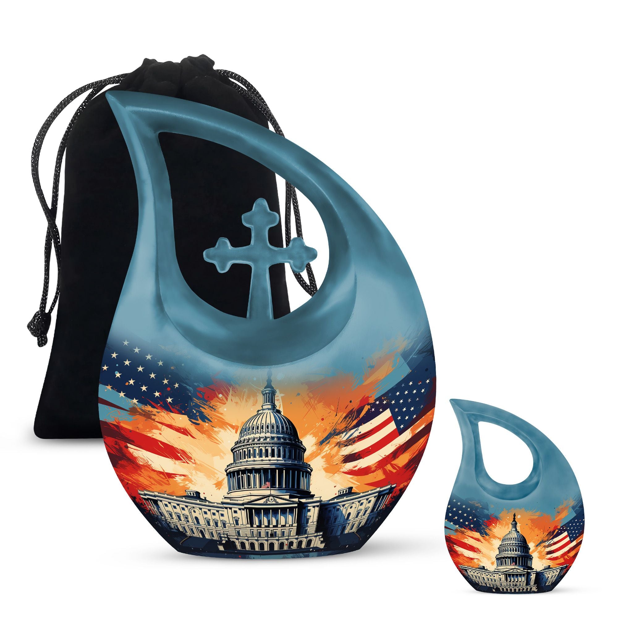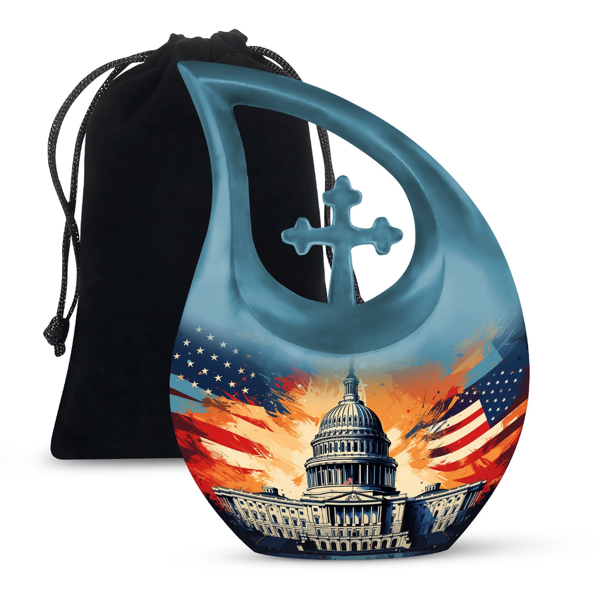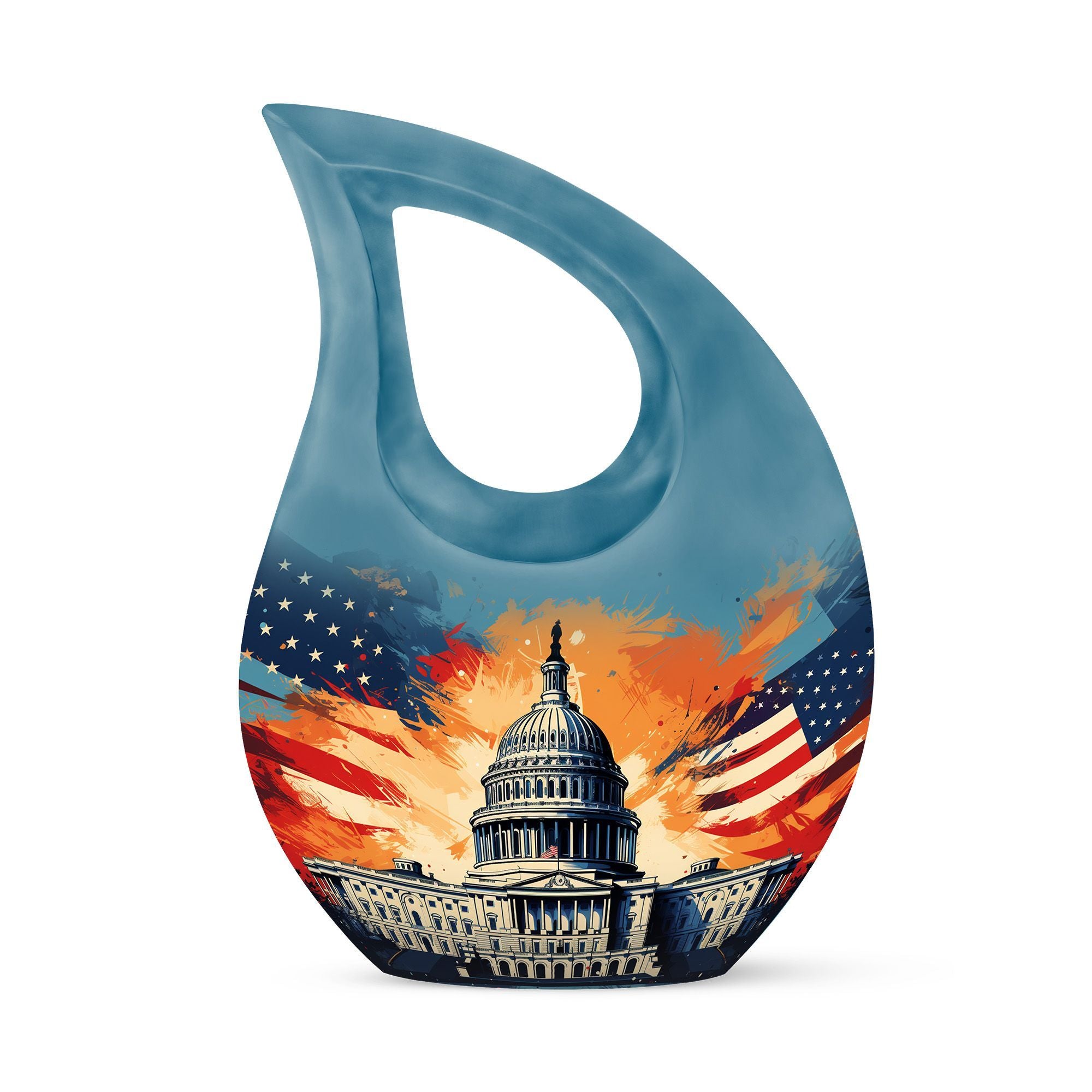 Honor a life of courage and integrity with the US Capitol Building Cremation Urn – Patriotic Blue Teardrop Urn. Inspired by the nation’s symbol of unity and service, this urn is a heartfelt tribute for those who lived with dignity and devotion. Designed as a cremation urn large and urn for ashes adult male large, it captures the essence of legacy, love, and patriotic remembrance.
