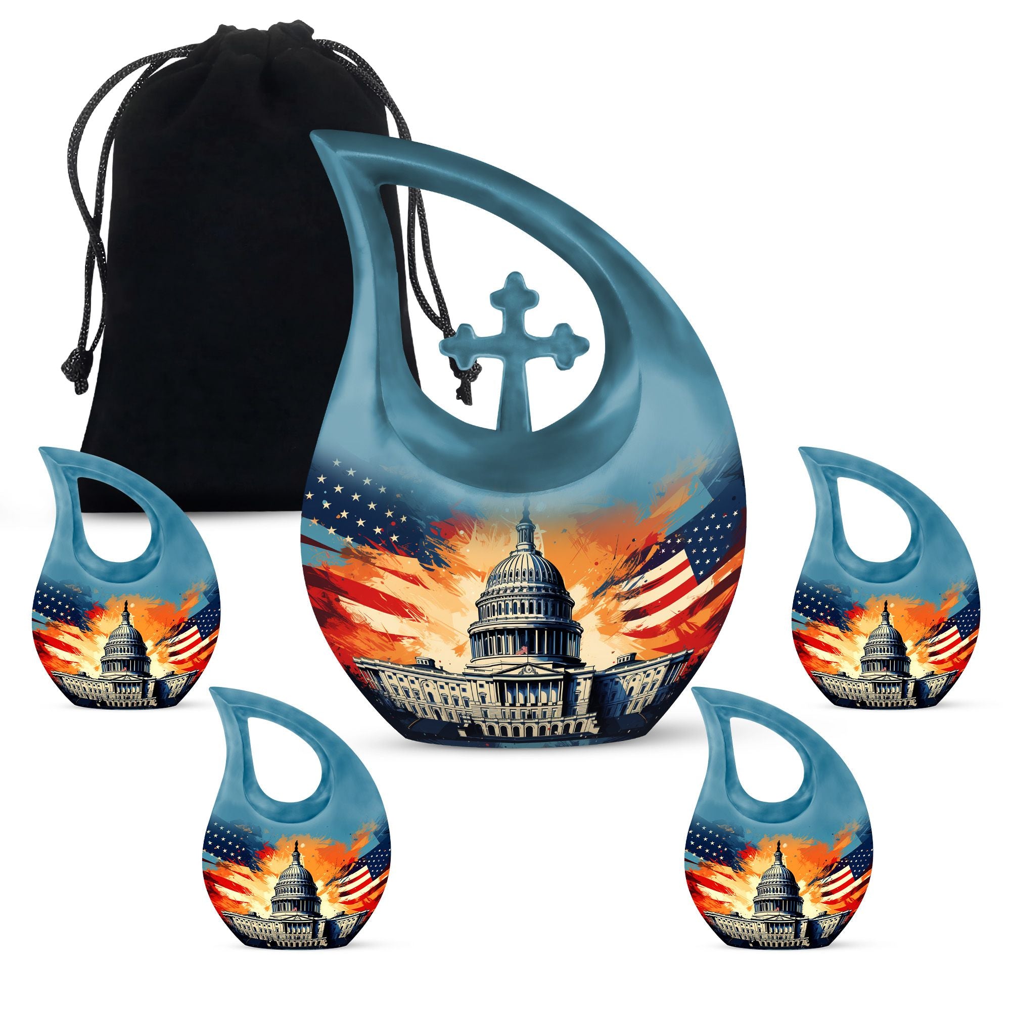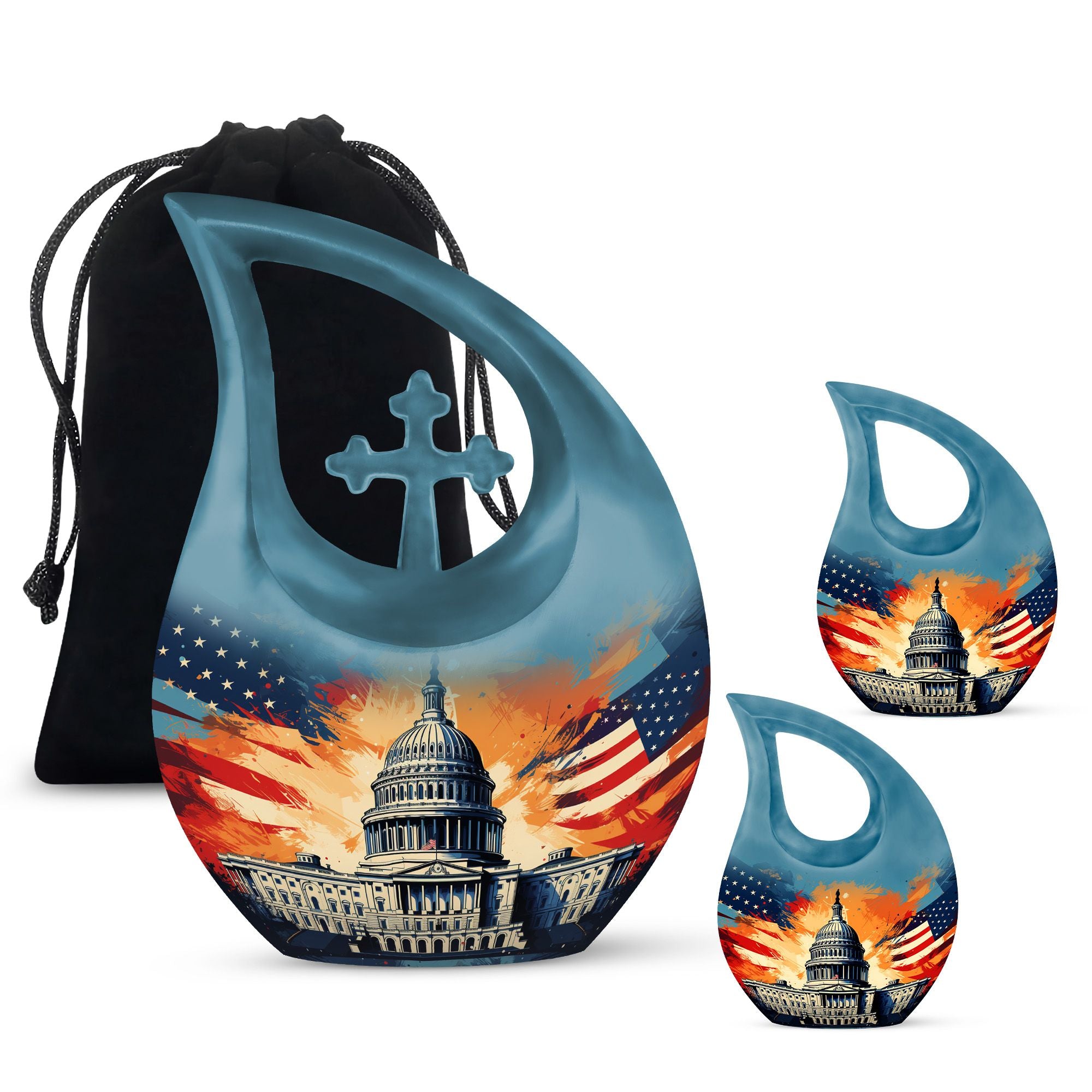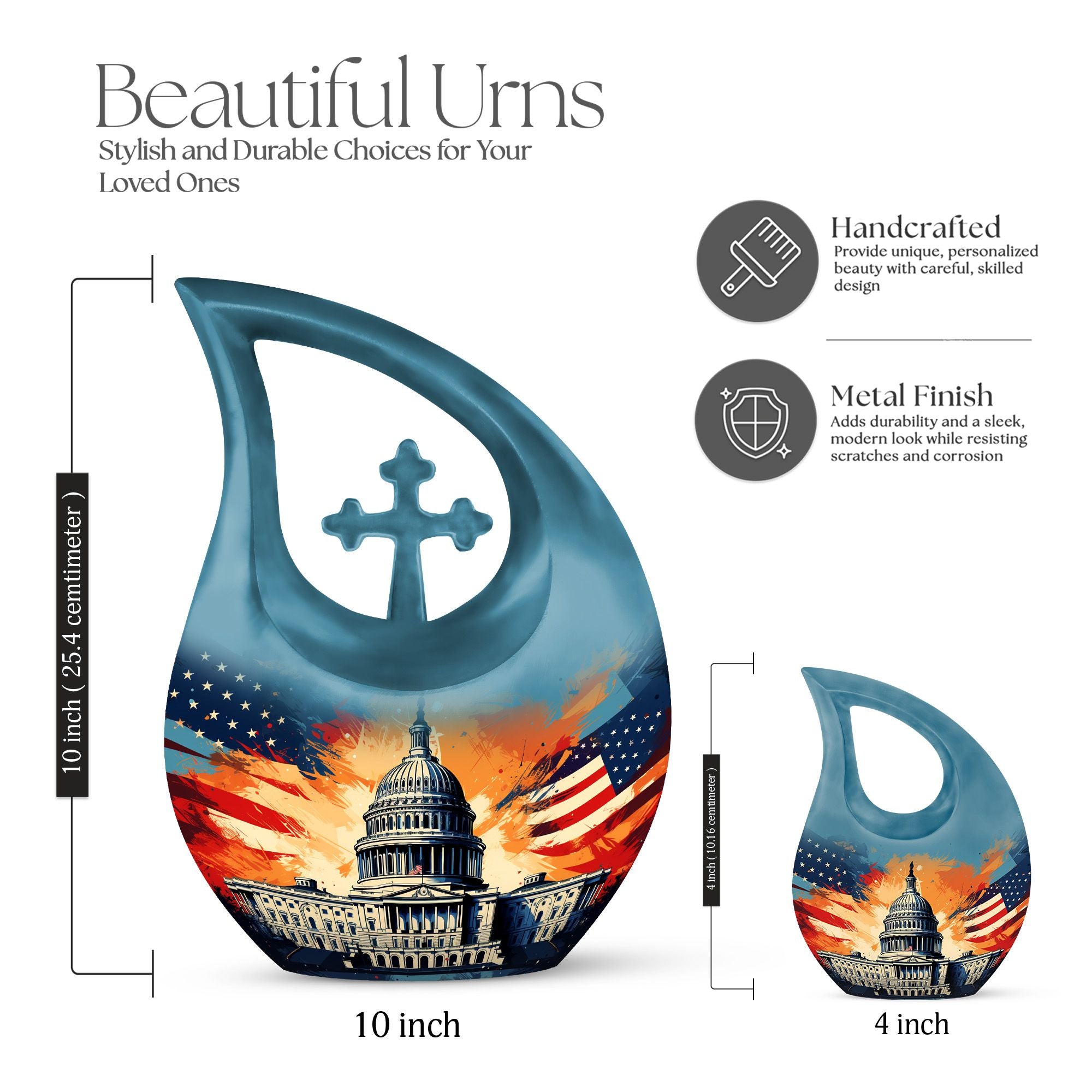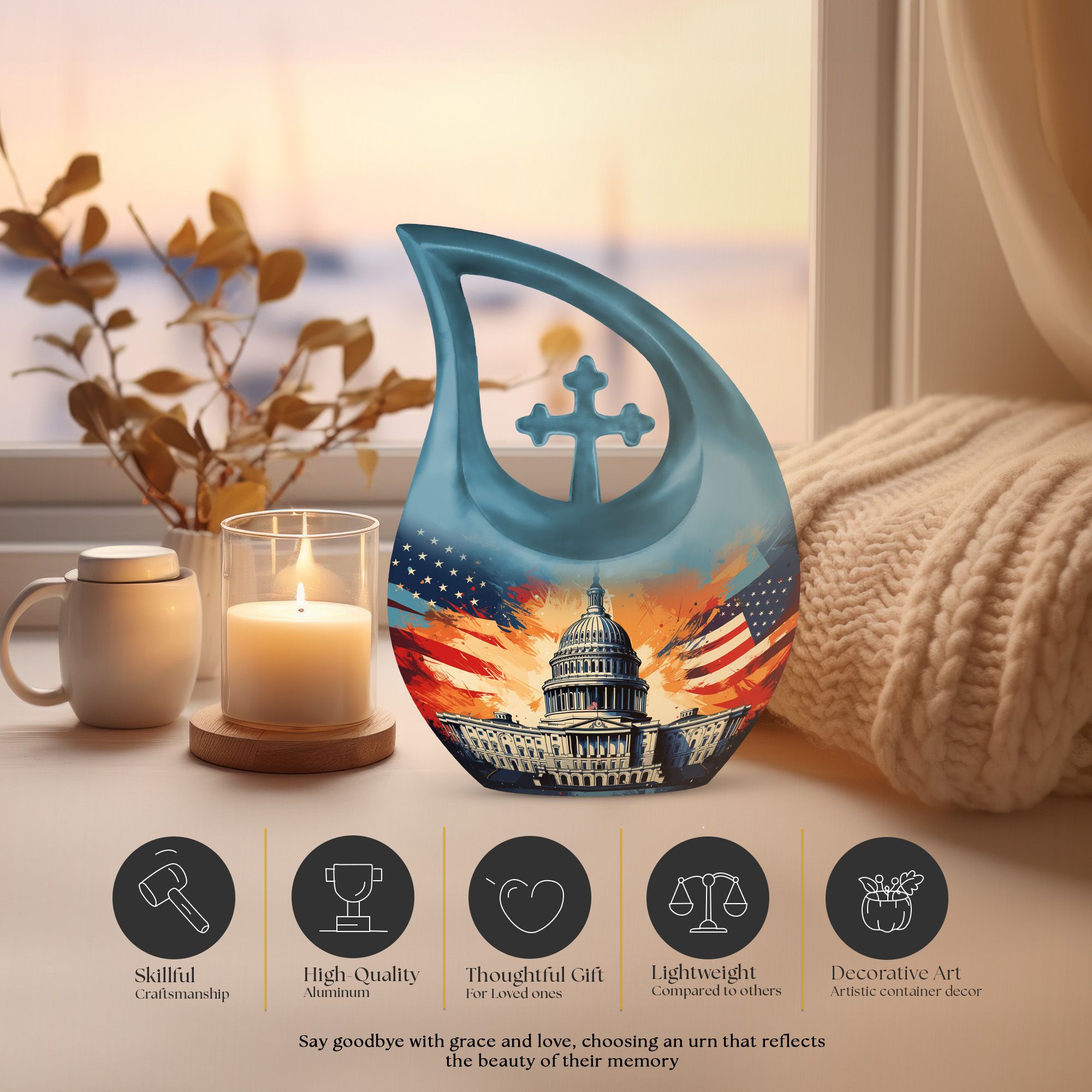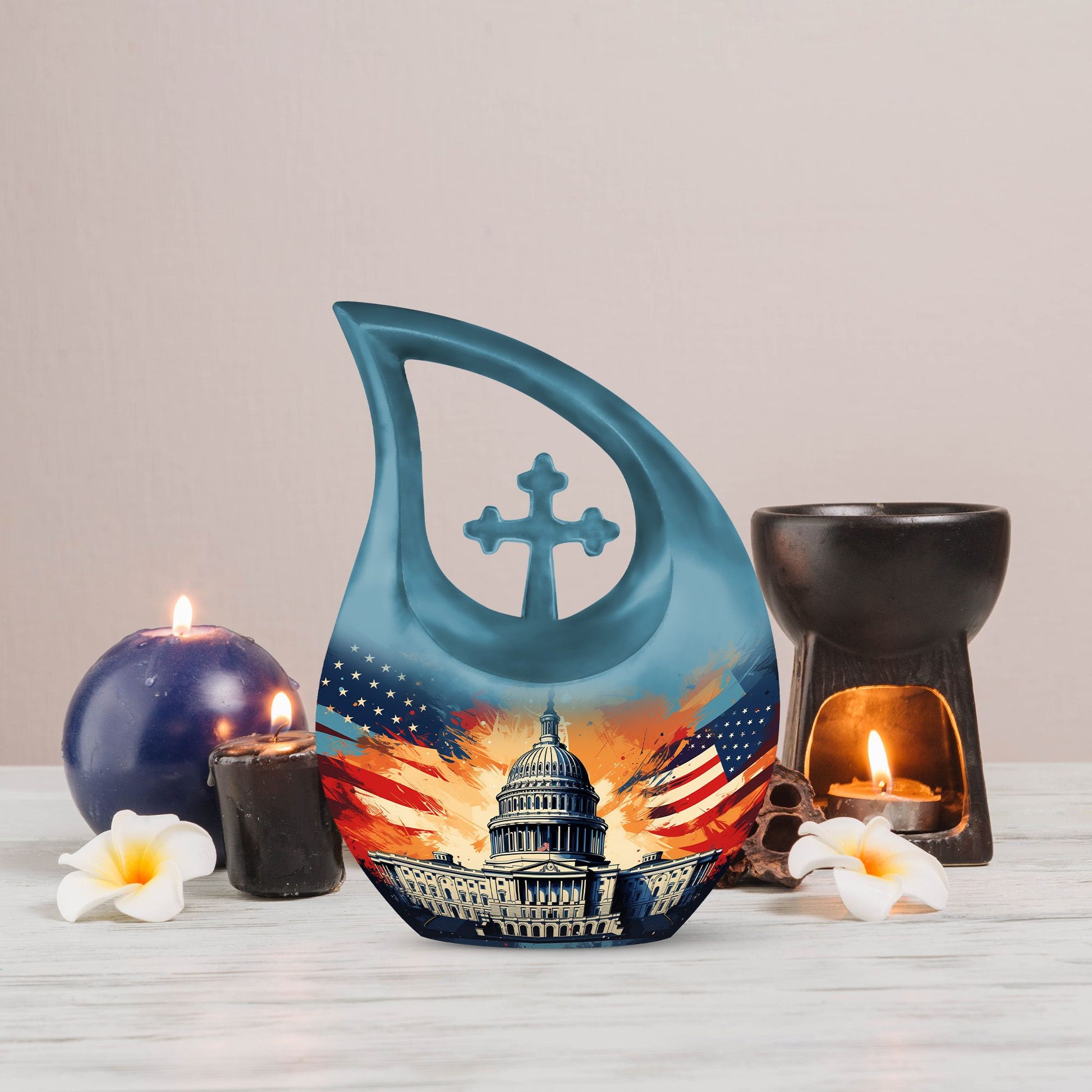 Honor a life of courage and integrity with the US Capitol Building Cremation Urn – Patriotic Blue Teardrop Urn. Inspired by the nation’s symbol of unity and service, this urn is a heartfelt tribute for those who lived with dignity and devotion. Designed as a cremation urn large and urn for ashes adult male large, it captures the essence of legacy, love, and patriotic remembrance.