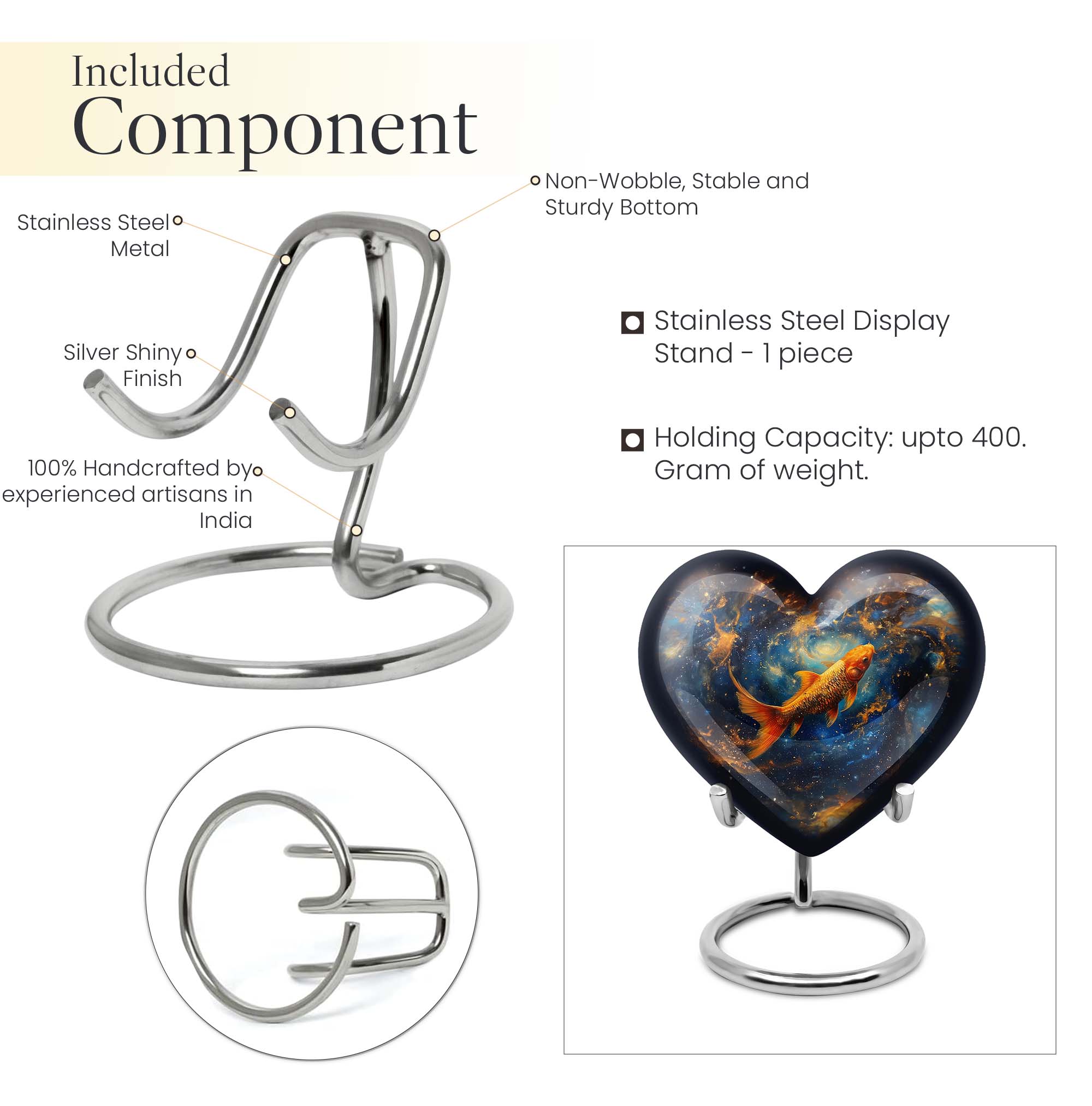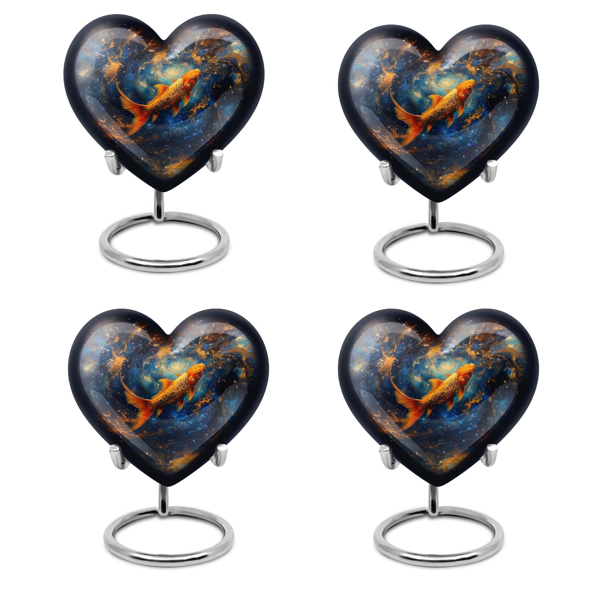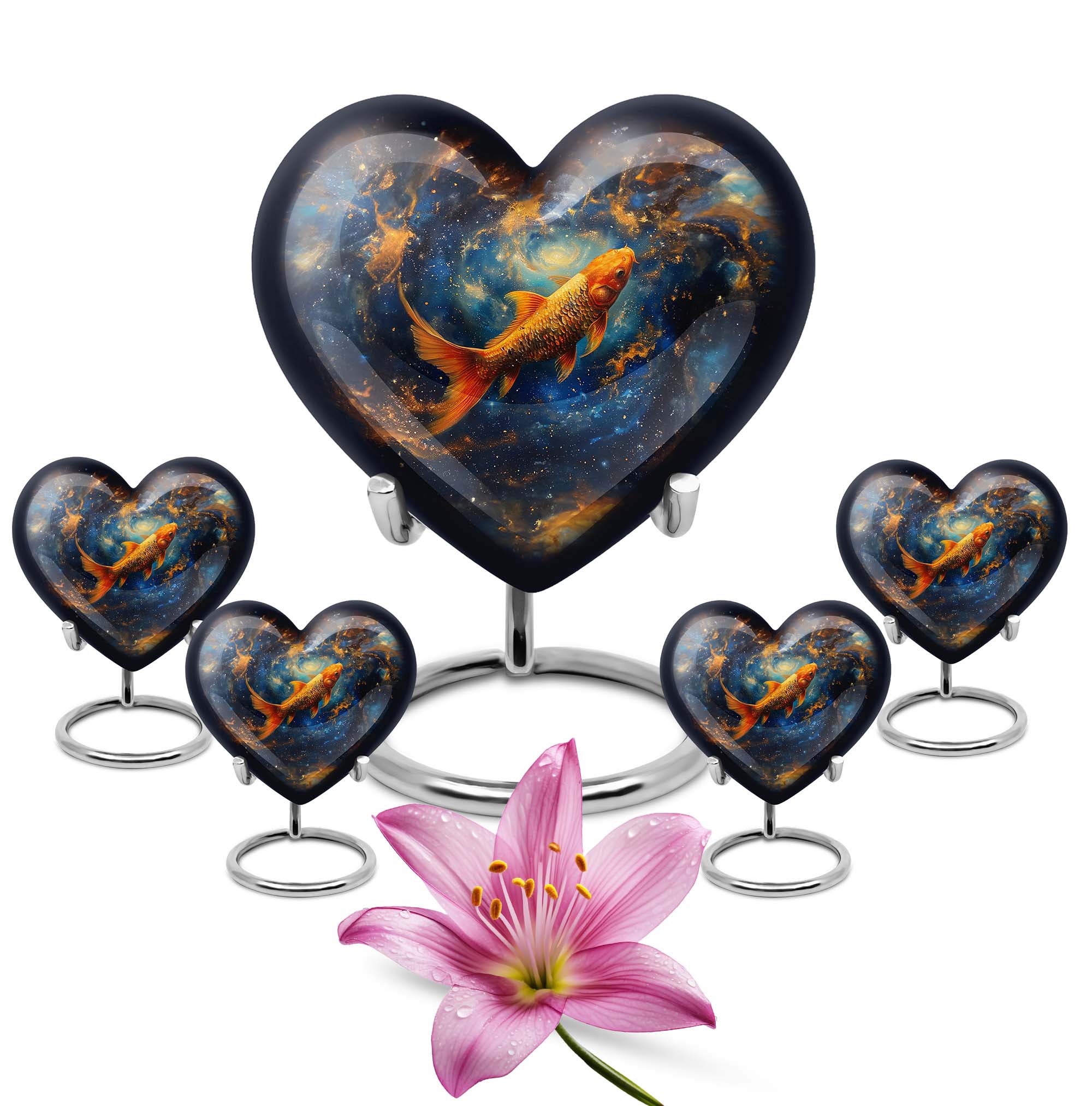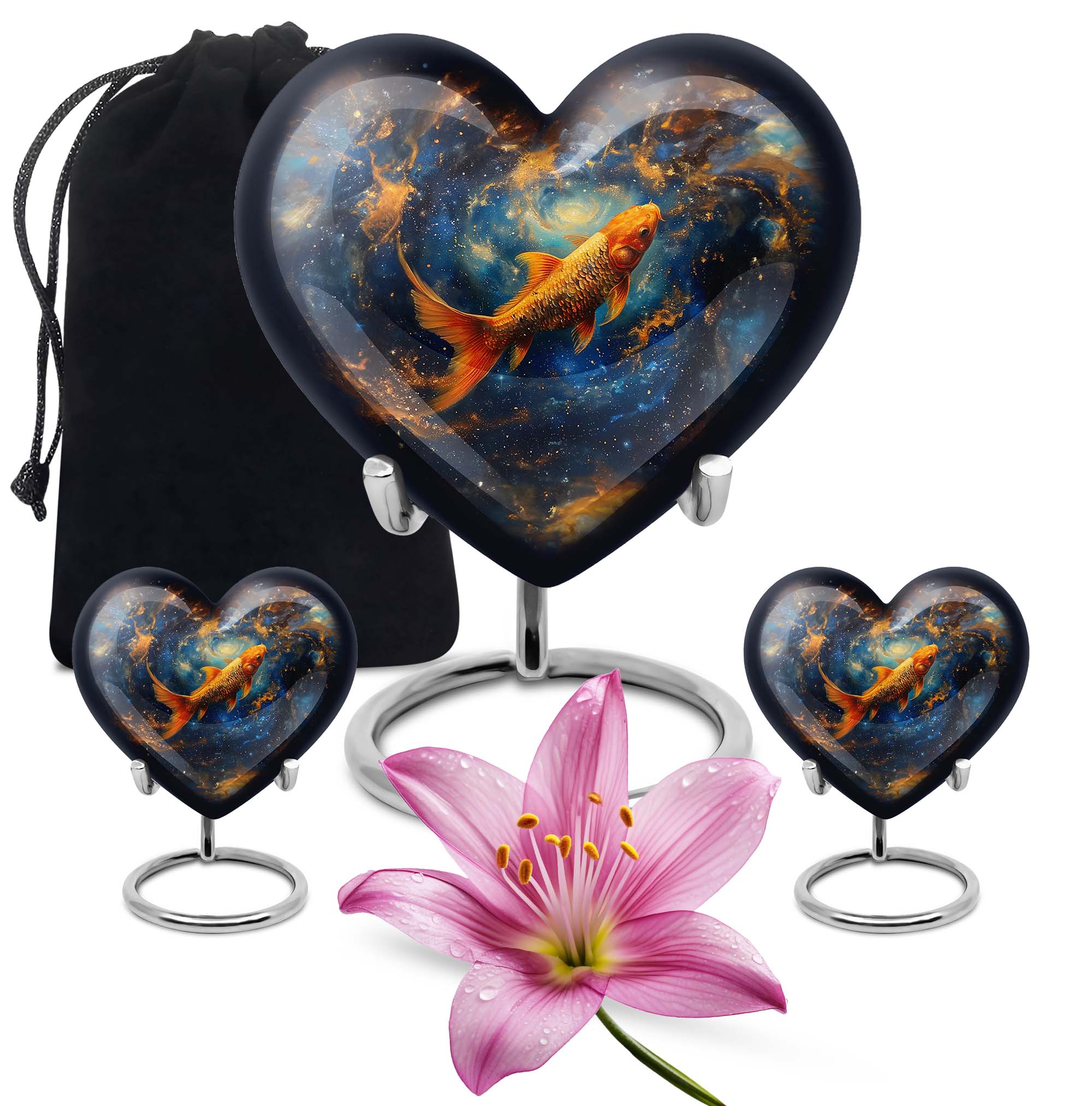 Experience solace and honor your loved ones with our uniquely heart-shaped, large fish Urn. Crafted from high-quality aluminium, this memorial human urn for ashes signifies eternal love and memories. This 10-inch urn is capable of holding up 200 cubic inches of ashes, making it a suitable choice for adults. Weighing 3.3 pounds, it symbolizes the weighty, love-filled memories you cherish. This adult burial urn elegantly pairs deep meaning with subtle design, carrying an abstract theme that radiates mysterious beauty. As a highly personal touch, you can opt to personalize it with engraved names, tailored exclusively to reflect the beauty of your memories. Each urn comes with a soft velvet pouch for cherished containment of the ashes. In your heartbreaking moments of loss, find comfort and serenity in the ashes of love held securely in our metal large urn. Ideal for memorial ceremonies, seldom will you find a bespoke memorial funeral urn that fuses emotion, love, and durability as seamlessly as this.