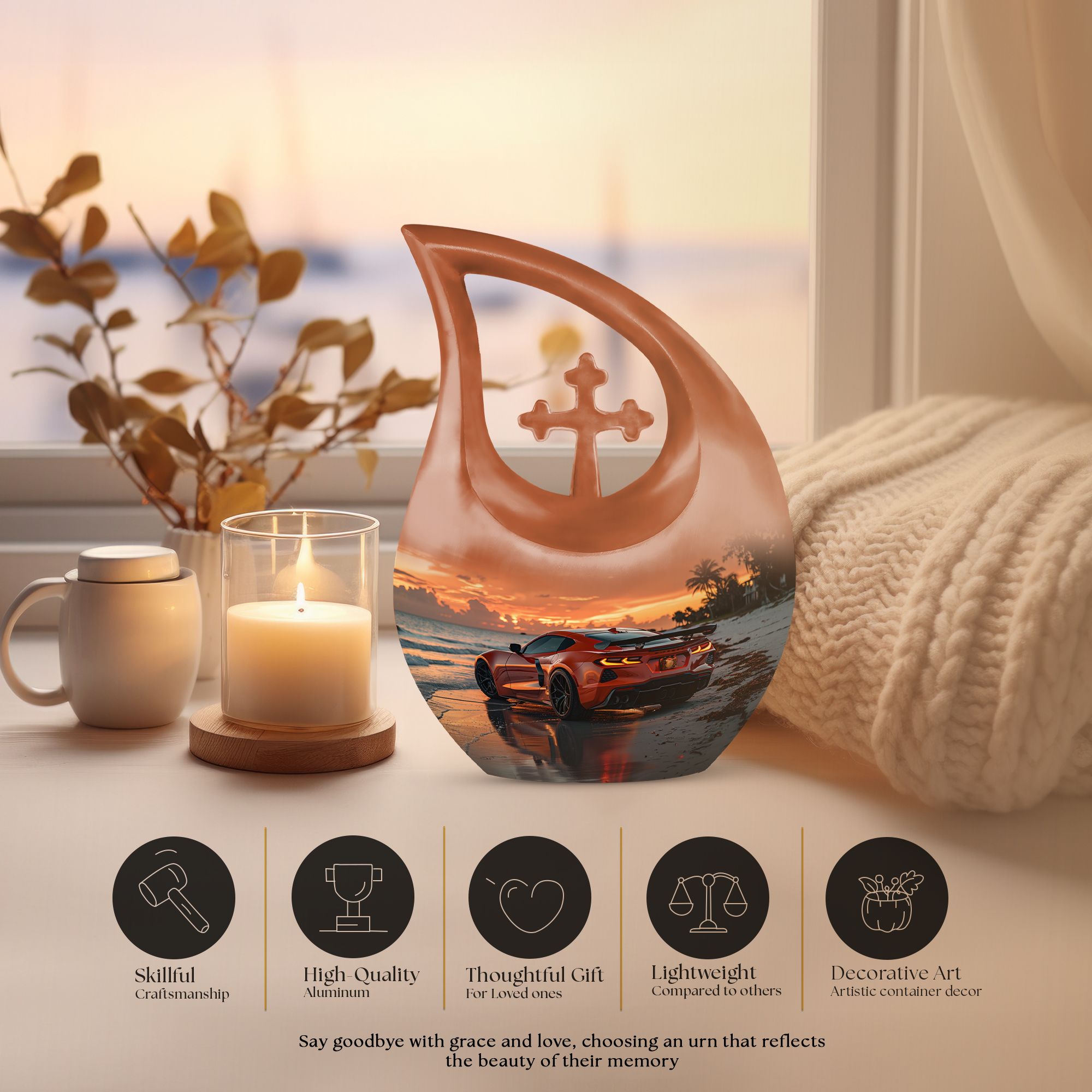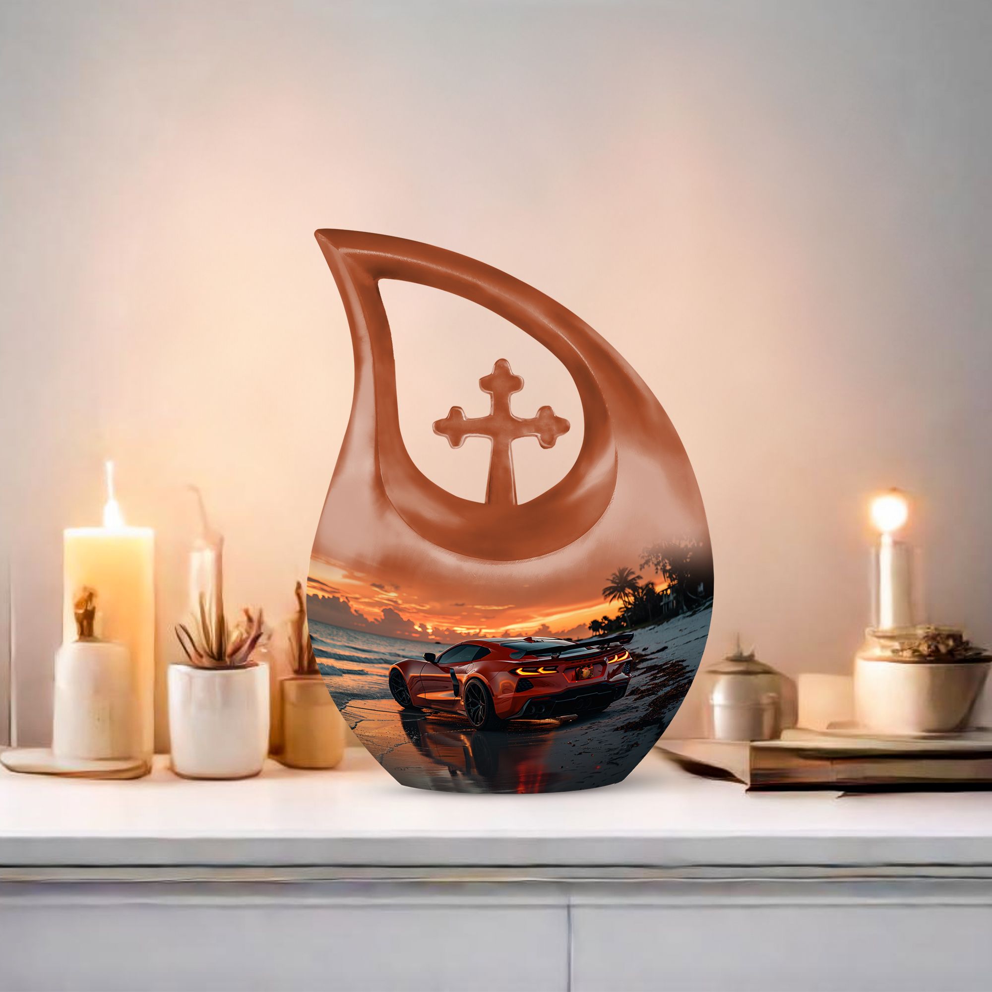 Fully recognize and cherish the memories of your loved one with our uniquely styled Cross Drop Car Urn. This exquisite, yet robust aluminium memorial urn lends an understated elegance to your remembrance. A size of 10 inches and weighing 3.3 pounds, this large, car-themed Urn is designed to securely hold up to 200 cubic inches of ashes. Available with the option to personalize with names engraved, it's a truly unique token of memory. As an added convenience, every Car Urn comes with a plush velvet pouch, perfect for the containment of ashes. This grand memento not only serves as a personalized tribute but also as a tasteful decorative piece. Forget about common butterfly urns for ashes or double urns, this car urn stands out, offering a meaningful way to keep your departed dear one in your thoughts. Whether you are seeking to turn ashes into keepsakes or want a decorative urn for ashes, our Car Urn answers exactly to such requisites.