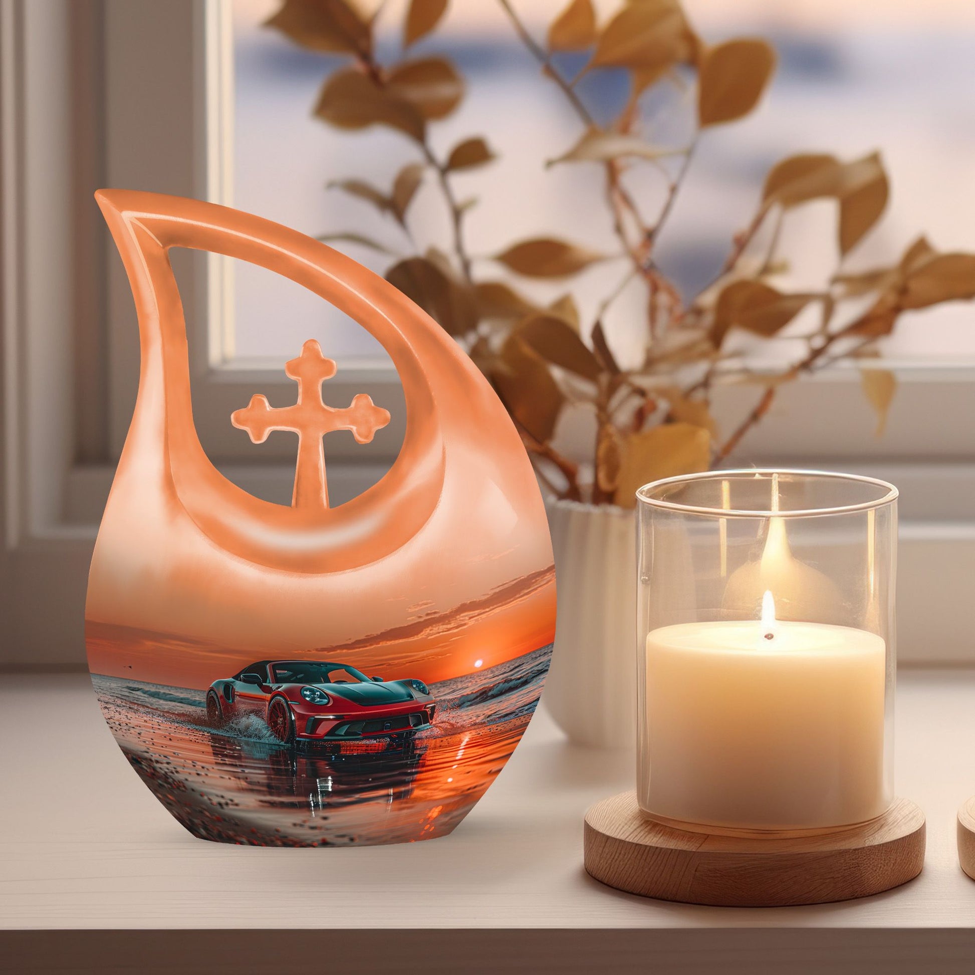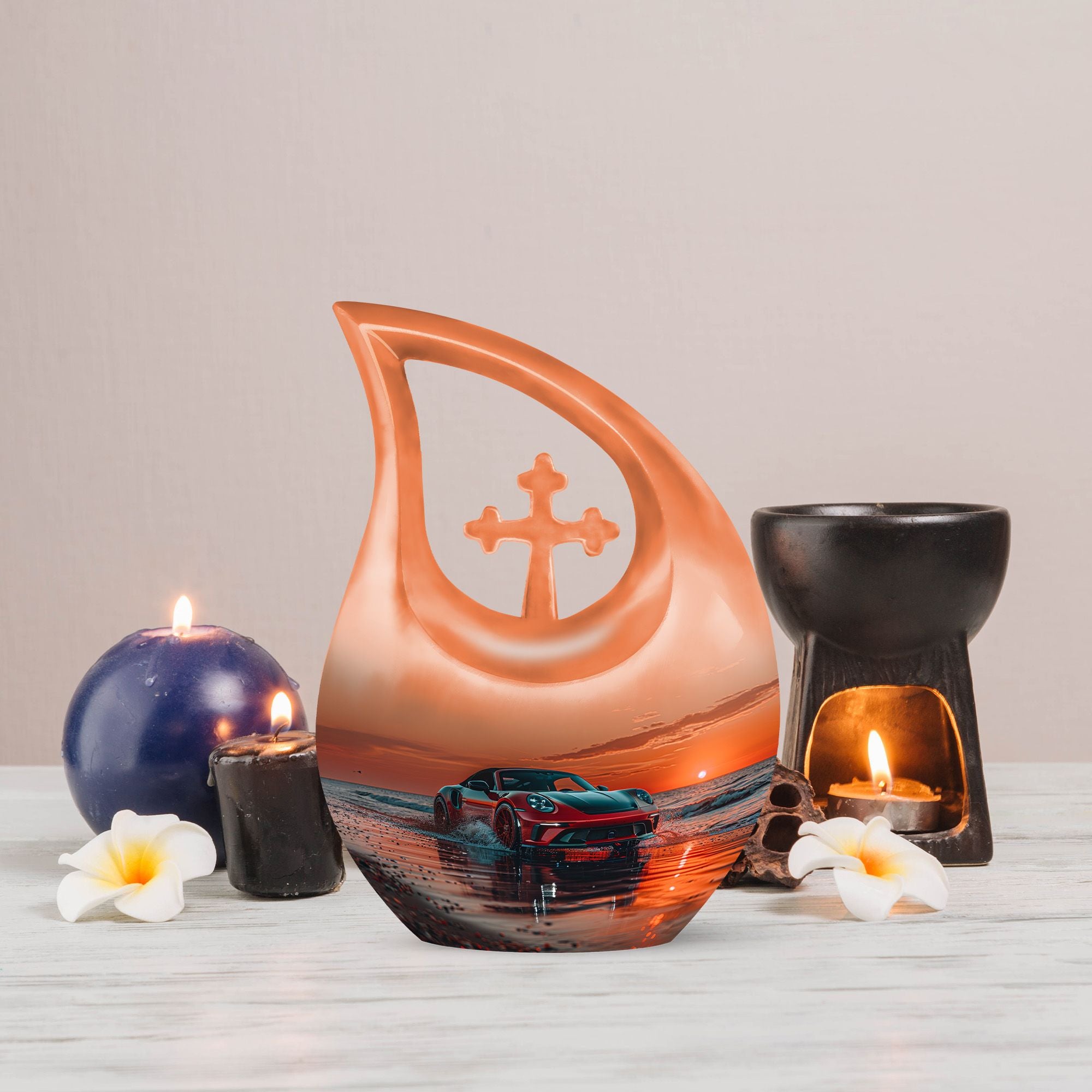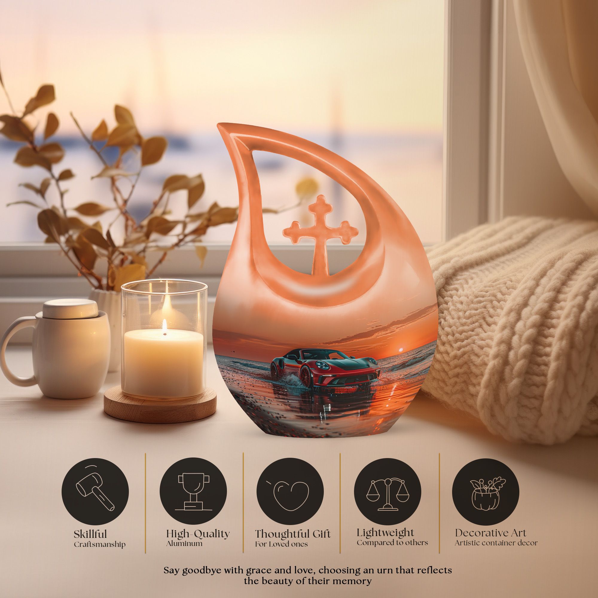 Honor your loved one's memory and keep their essence with you always with this beautiful 10-inch Car Urn. Expertly toting an inspiring 'Cross Drop' design, it not just pays homage to their life, but also aligns perfectly with your spiritual beliefs. The urn, made from high-quality aluminium, is robust, durable, and designed to last a lifetime. Weighing just 3.3 pounds and with a holding capacity of 200 cubic inches, this urn for ashes seamlessly blends efficacy with artistry. Our funeral urns offer a way for you to remember your loved ones with dignity and grace. Add a personal touch to the urn by opting for our customization options, get names engraved and make your tribute unique. Our package includes a luxurious velvet pouch for containment of ashes, providing an elegant final resting place for your beloved. Choose this large urn as a fitting tribute and practical funeral option during these difficult times. Perfect for searches including 'Urn For Mom', 'Funeral Urns For Ashes,' or 'Beautiful Urns', this product links heartfelt emotion with superior craftsmanship.