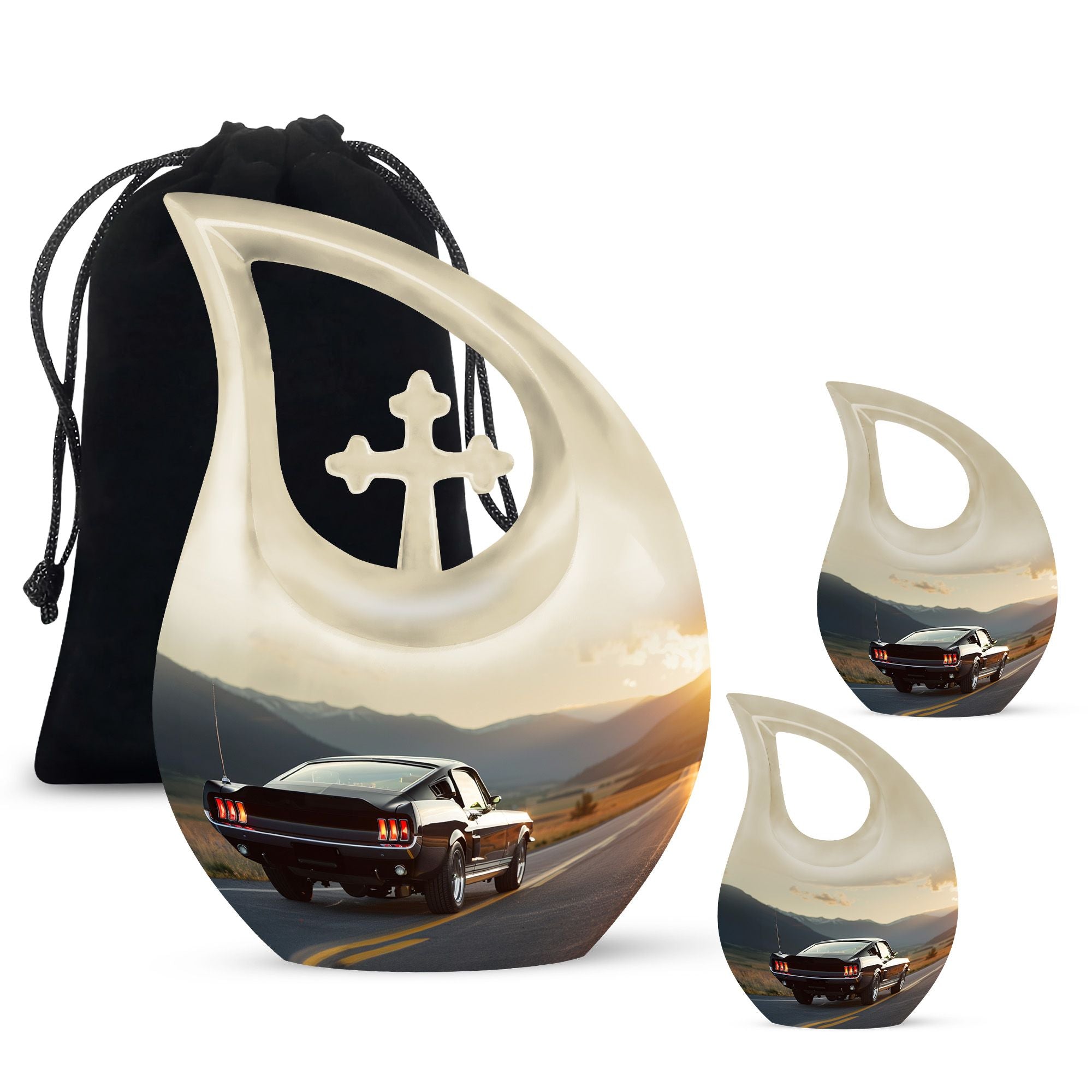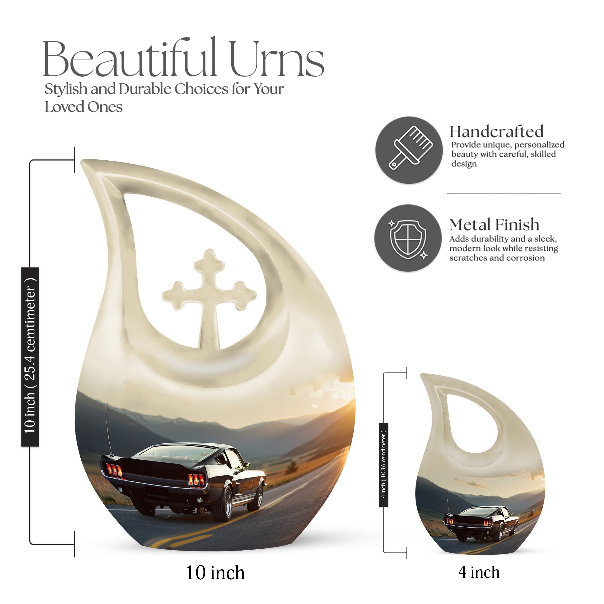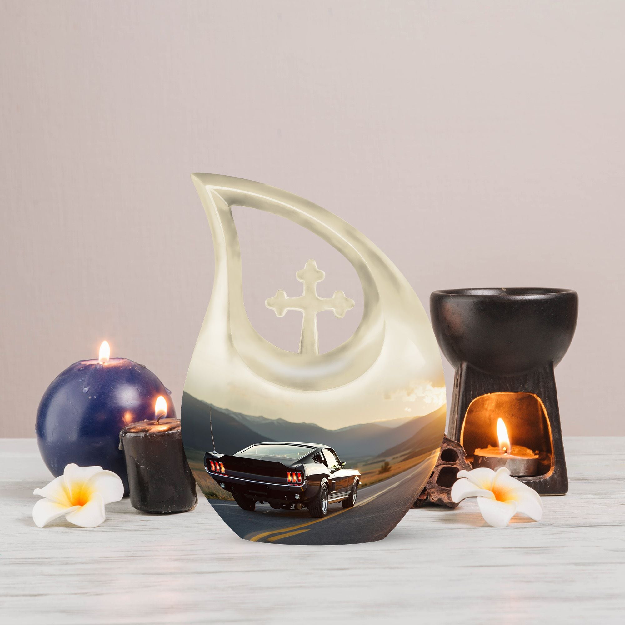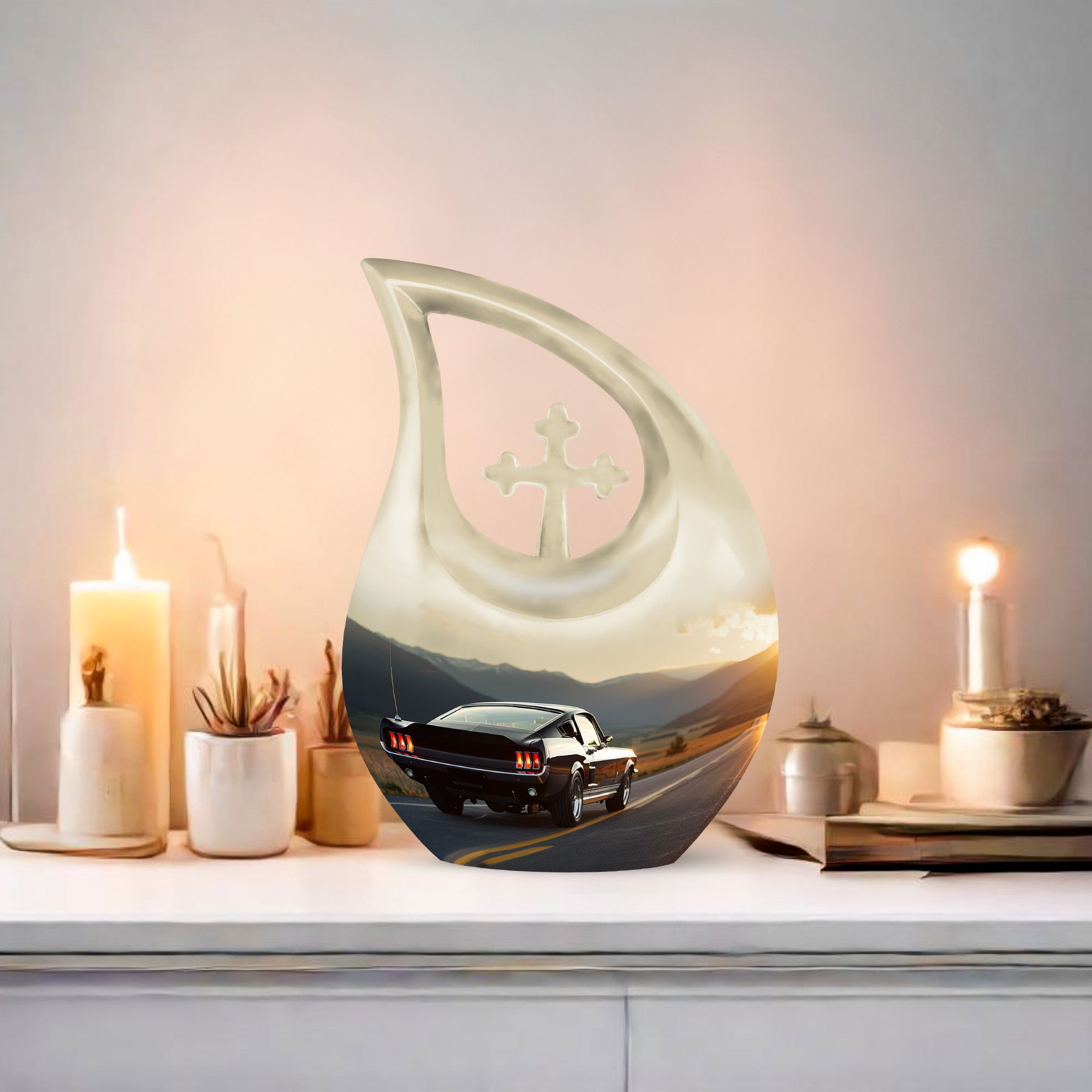 Illuminate your memorial space with a beautiful touch of fond remembrance. Our elegant Cross Drop Car Urn infuses both love and dignity into any setting. Sized optimally at 10 inches and weighing 3.3 pounds, this large-sized urn is robust and durable. Crafted from high-quality aluminium, it ensures long-lasting keepsake value. The urn possesses a magnificent capacity of 200 cubic inches for containment of ashes, packaged neatly in an accompanying, plush velvet pouch. Render a personal touch by personalizing the urn with engraved names, providing an intimate reminder of your loved one. This Pink Urn is effortlessly significant, and the car theme adds a unique appeal that will resonate with automotive enthusiasts. It is quite suitable for those looking for 'Memorial Urns', 'Personalized Urns For Human Ashes', 'Medium Urns For Human Ashes', 'Personalized Urns For Adults', or a 'Large Urn'. Remember your departed in a treasured manner with our Cross Drop Car Urn.