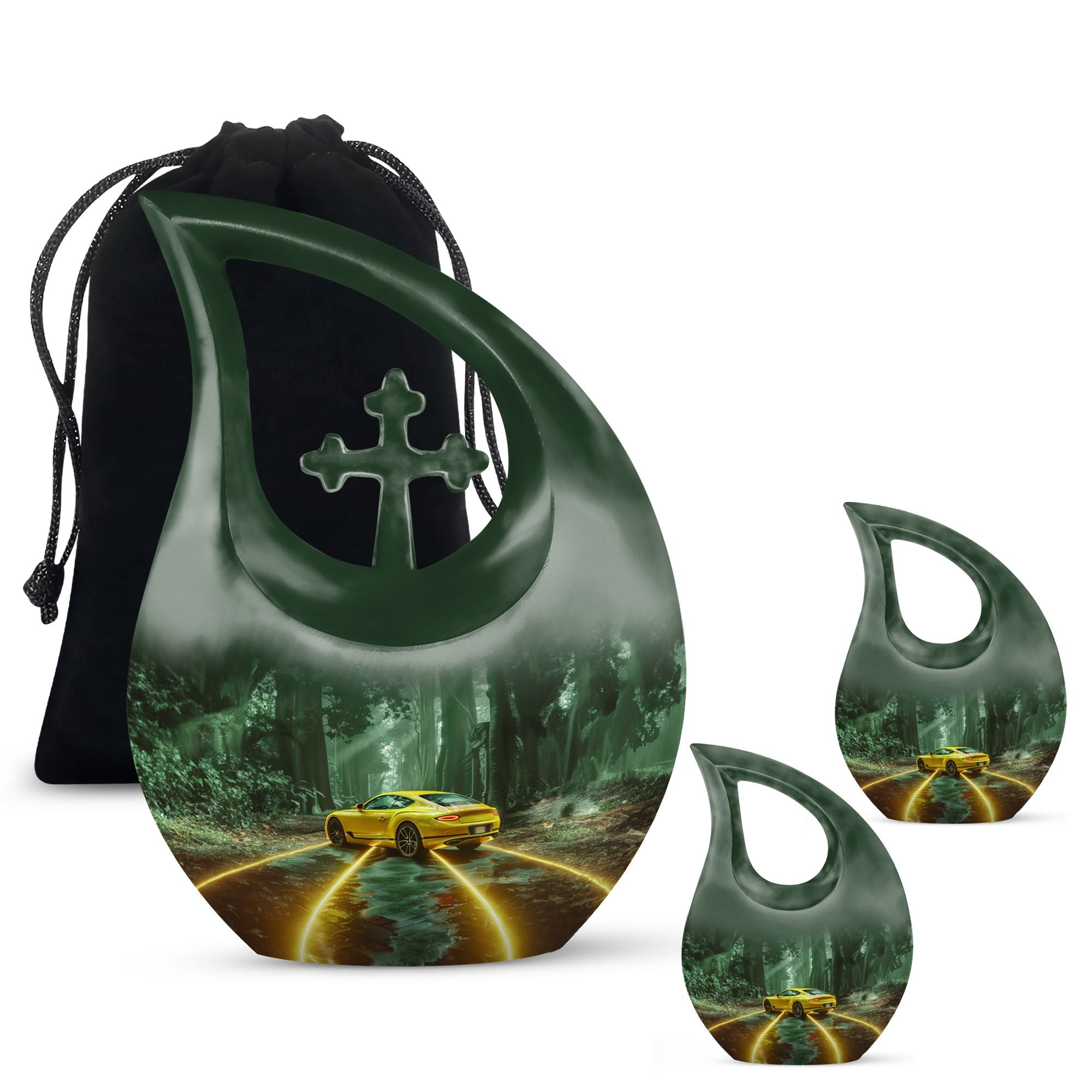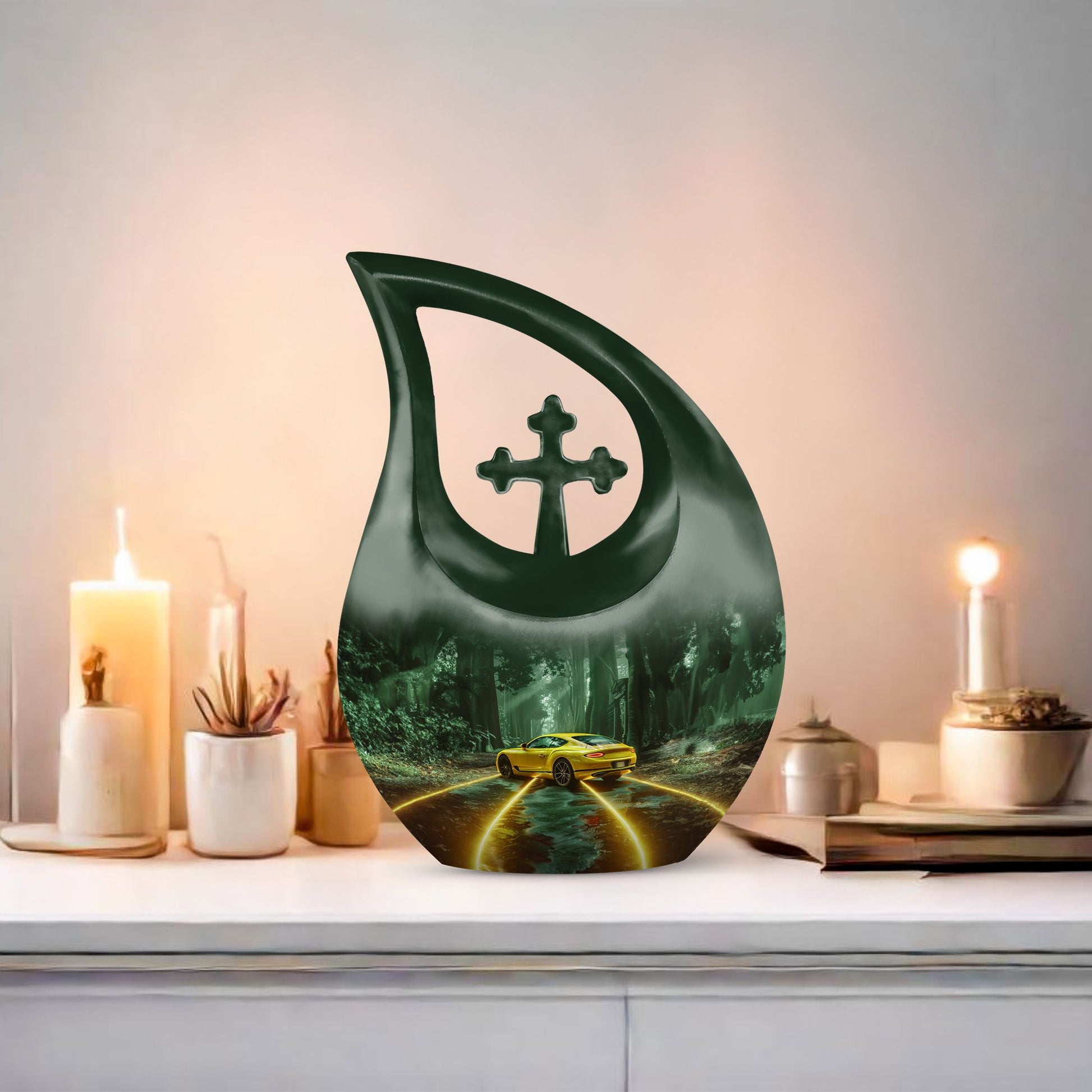 Experience a comforting and dignified way of preserving the memory of a departed loved one with our Car Urn, tailored to cater to your ceremonial needs. Crafted from durable aluminium, this urn weighs a solid 3.3 pounds and stands 10 inches tall, with a sizable capacity of 200 cubic inches. It effortlessly balances elegance and function, complete with a Cross Drop theme that exudes tranquility and serenity. This Large Urn is designed for accessibility, usability, and solidity, ensuring it contains the ashes of your dearly departed with utmost respect and reverence. Every purchase comes with a soft velvet pouch, providing a secure and dignified containment for ashes. Make it more personal with our customization option, allowing for engraved names to give it a special touch. From Small Cremation Urns to Human Urns, our product is a perfect choice for those seeking an aesthetic, functional, and enduring memorial urn. Moreover, we also offer Custom Made Urns and Butterfly Urns For Ashes. Our commitment is to provide you with a product that truly honors and celebrates the memory of your loved one.