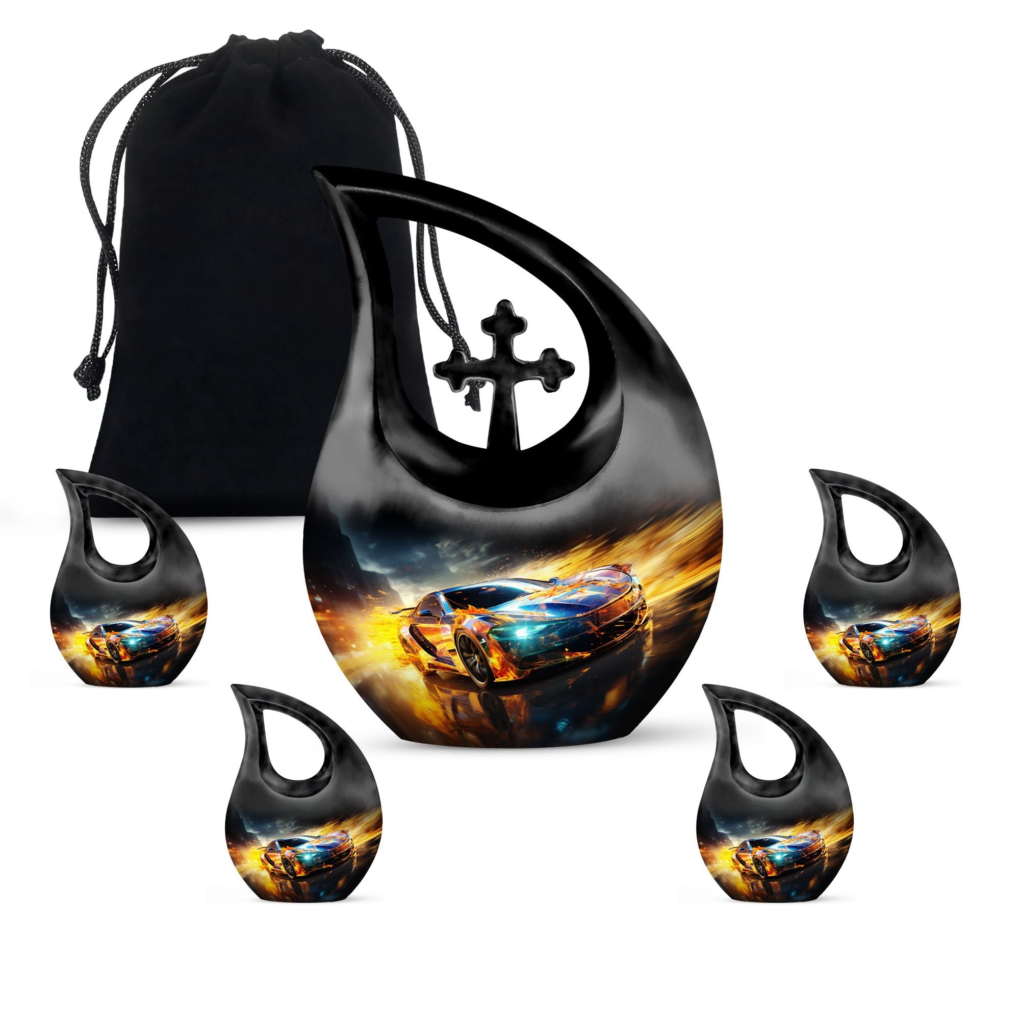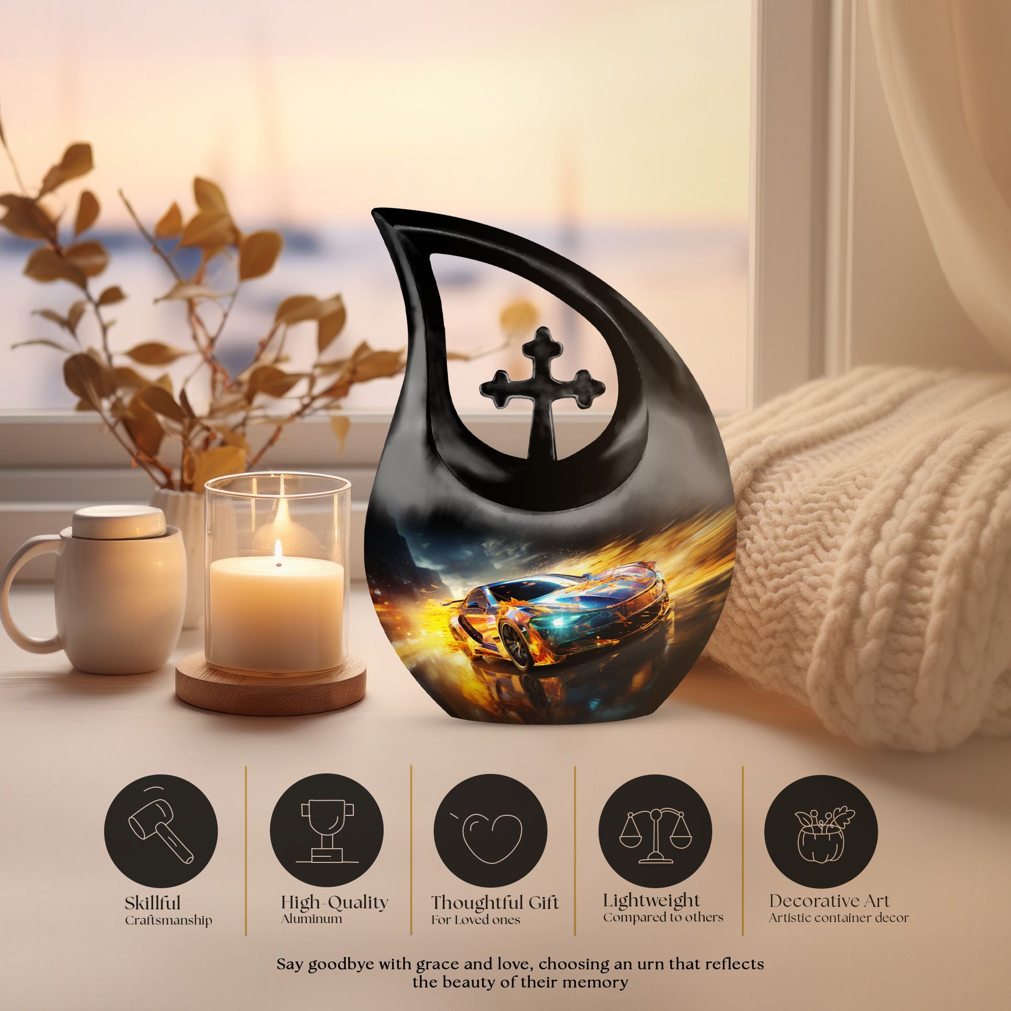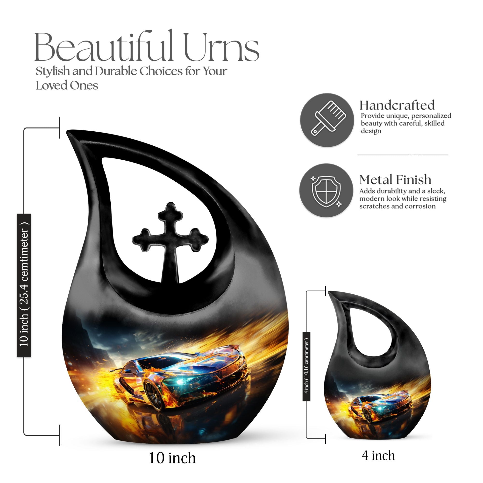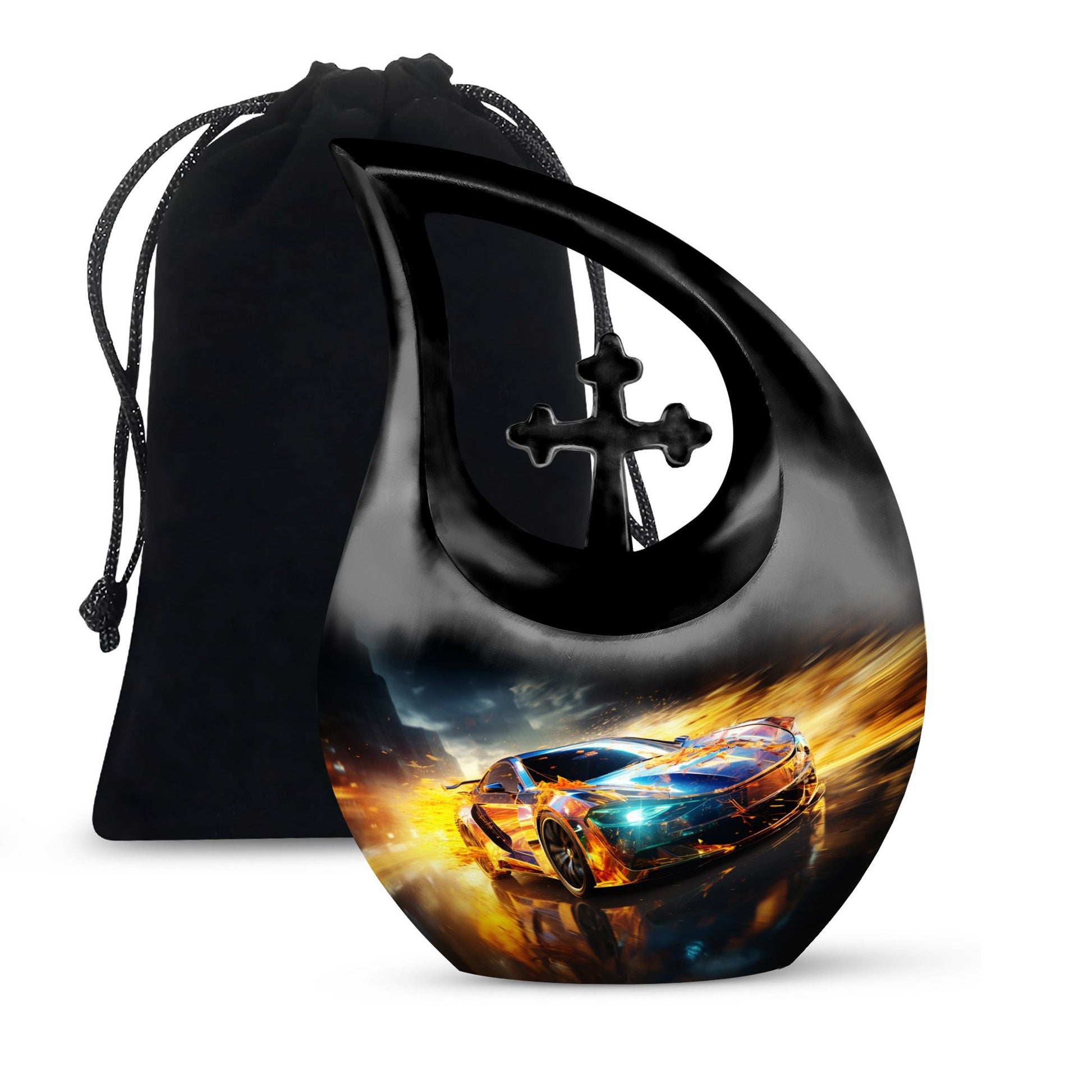 Crafted from durable aluminum, this full-size urn features a vivid sports car design that symbolizes drive, freedom, and motion. Its secure screw-top lid ensures long-term protection, making it suitable for home display, ceremonies, or private remembrance. This urn pairs beautifully with coordinating mini keepsake urns, mini urns for human ashes keepsake, or miniature urns for ashes, allowing families to share cherished memories among loved ones. It also works perfectly with keepsake mini urns, mini urn set for ashes, and decorative small pieces for display or personal comfort.