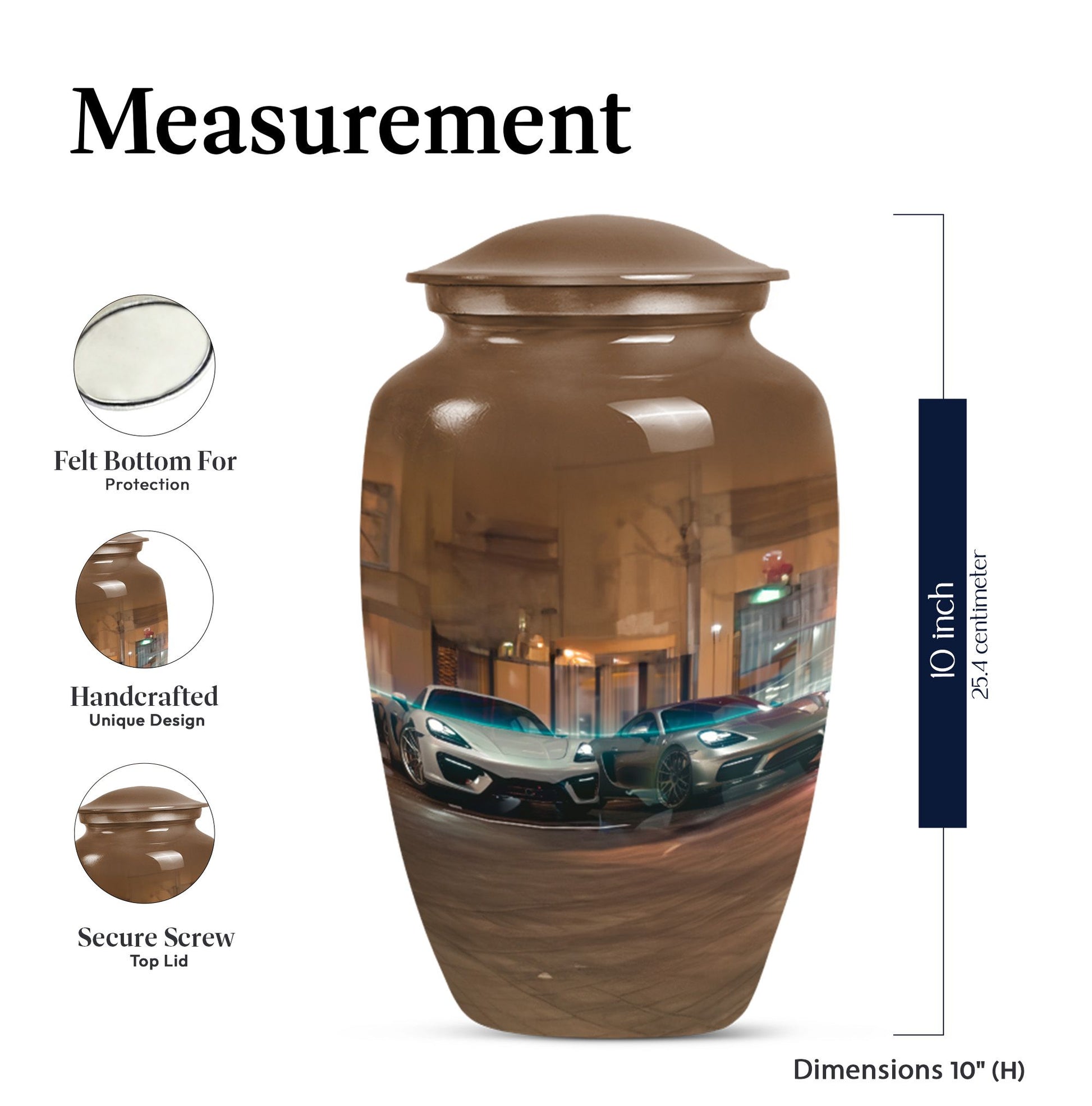 Step into a world of solace and tranquility with our butterfly themed Classic Urn. Standing at a grand 10 inches in height, this Large Urn fits in seamlessly at any ceremonial occasion or as a timeless addition to your home decor. Made from durable yet lightweight aluminium, the urn can comfortably hold up to 200 cubic inches of ash, encapsulating memories in a unique and enduring style. The Classic Urn's beauty goes beyond its imposing façade, with thoughtful details like the included velvet pouch, perfect for the discreet containment of ashes. Weighing at just 3.3 pounds, its design allows for easy handling and placement. You can also add your personal touch by engraving your loved ones' names, making it not just an urn, but a memento of the love shared. Celebrate and remember your mom or any other loved one with this car urn, this funeral urn is not just a product. It's an embrace linking the past, the present, and an eternal future. Our Classic urn captures the essence of memorial urns with an elegant and intimate touch.