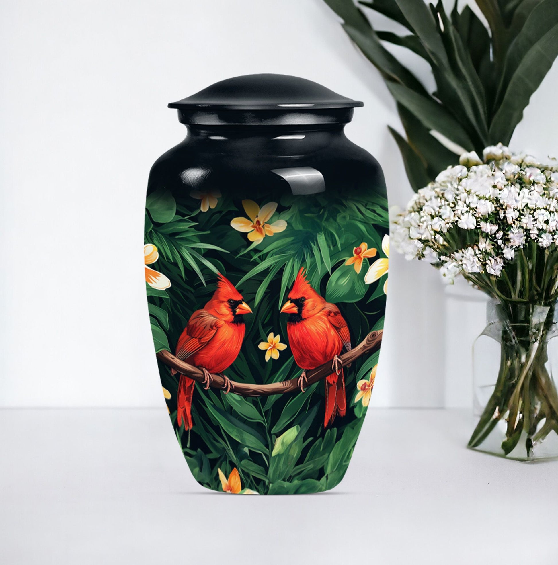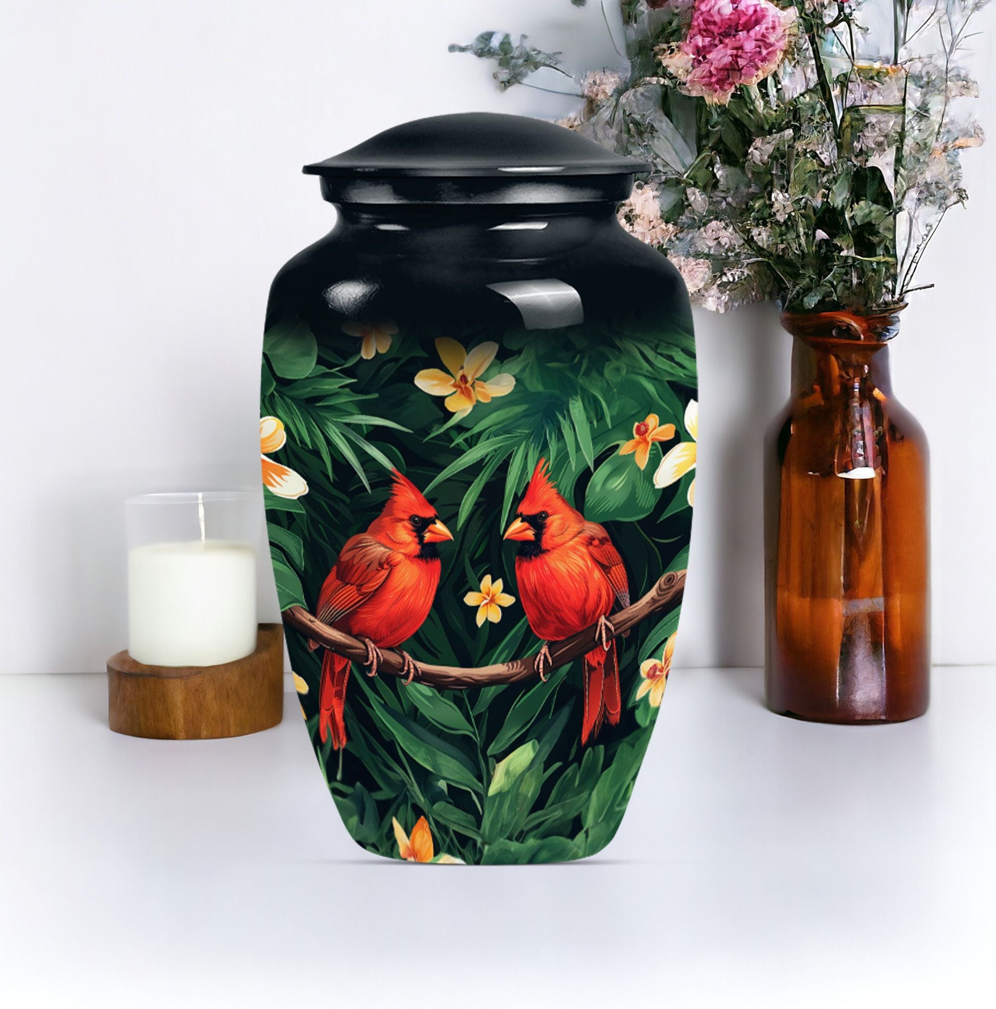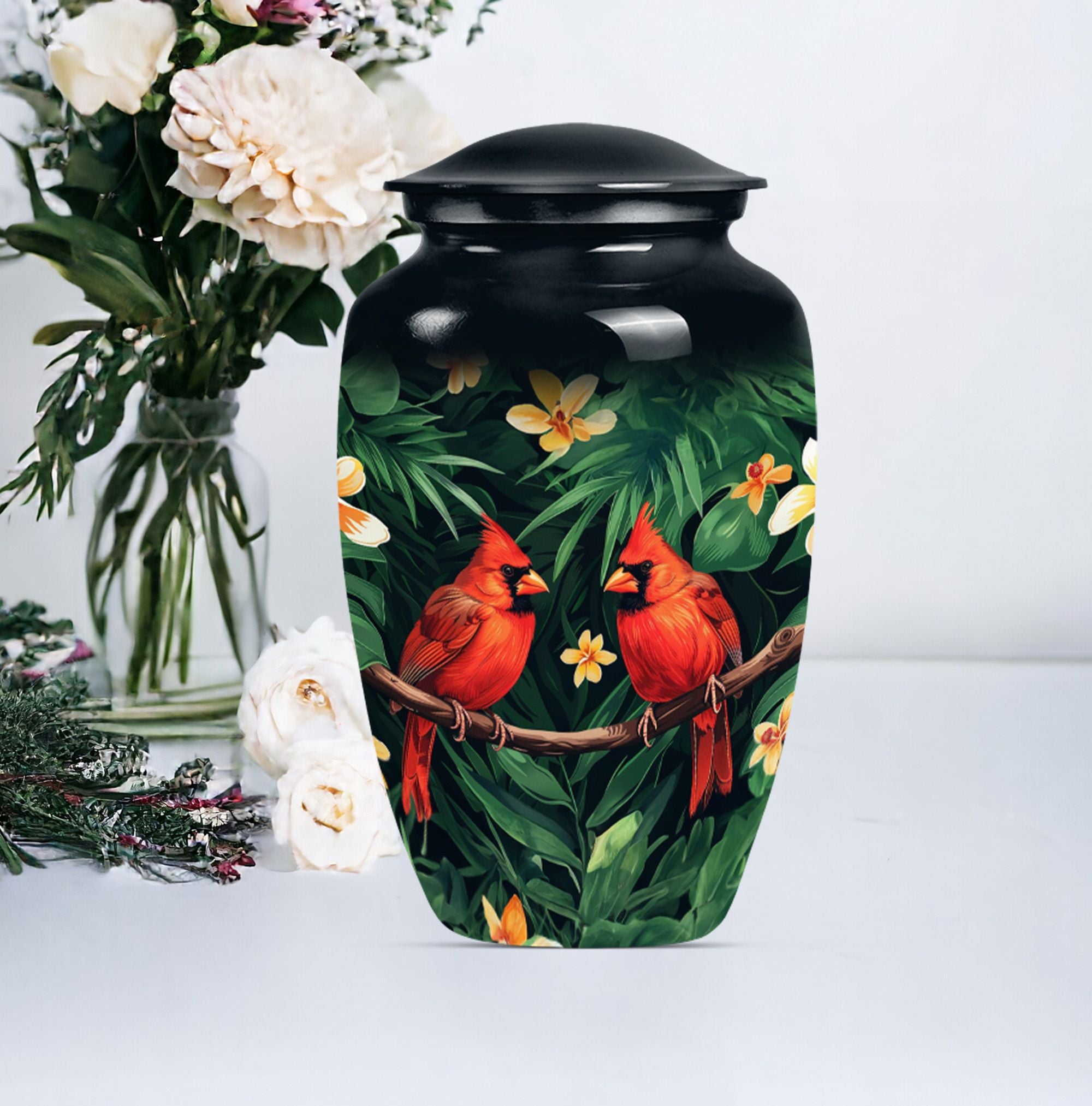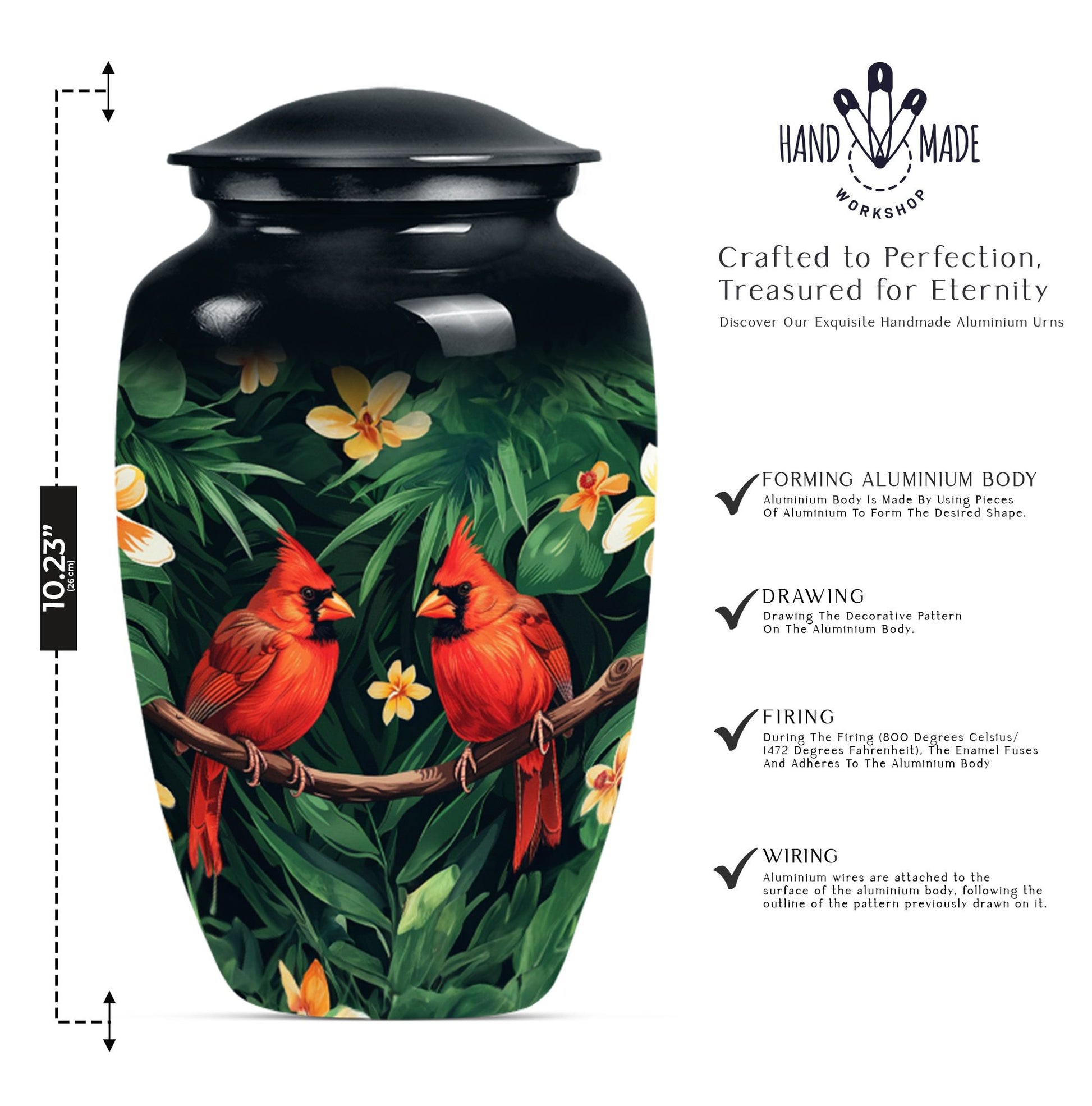 Honor the memory of your loved ones with the 10-inch 'Cardinal bird Urn.' Tailored from superior quality Aluminium, the urn embodies the narrative of life and death in its 'Wolf Howling' theme. With its classic style, this urn holds a significant amount of ashes up to 200 cubic inches. Measuring 10 inches in height and weighing 3.3 pounds, its substantial size accommodates a respectable place in your heart and home. The 'burial ash urns for humans' serves as a shrine for the departed soul, honoring them equally like the 'cremation urn for adult female ashes' or the 'urn human ash adult male.' We provide a velvet pouch, ensuring secure containment of the treasured ashes. With our personalization option, engrave the names to etch the memory forever. A symbol of appreciation for the life lived, the 'cremation urn', is a heartfelt tribute to your dear one's journey. Meet the perfect choice with our 'Large Urns,' designed to express love, respect and cherish the beloved departed soul.