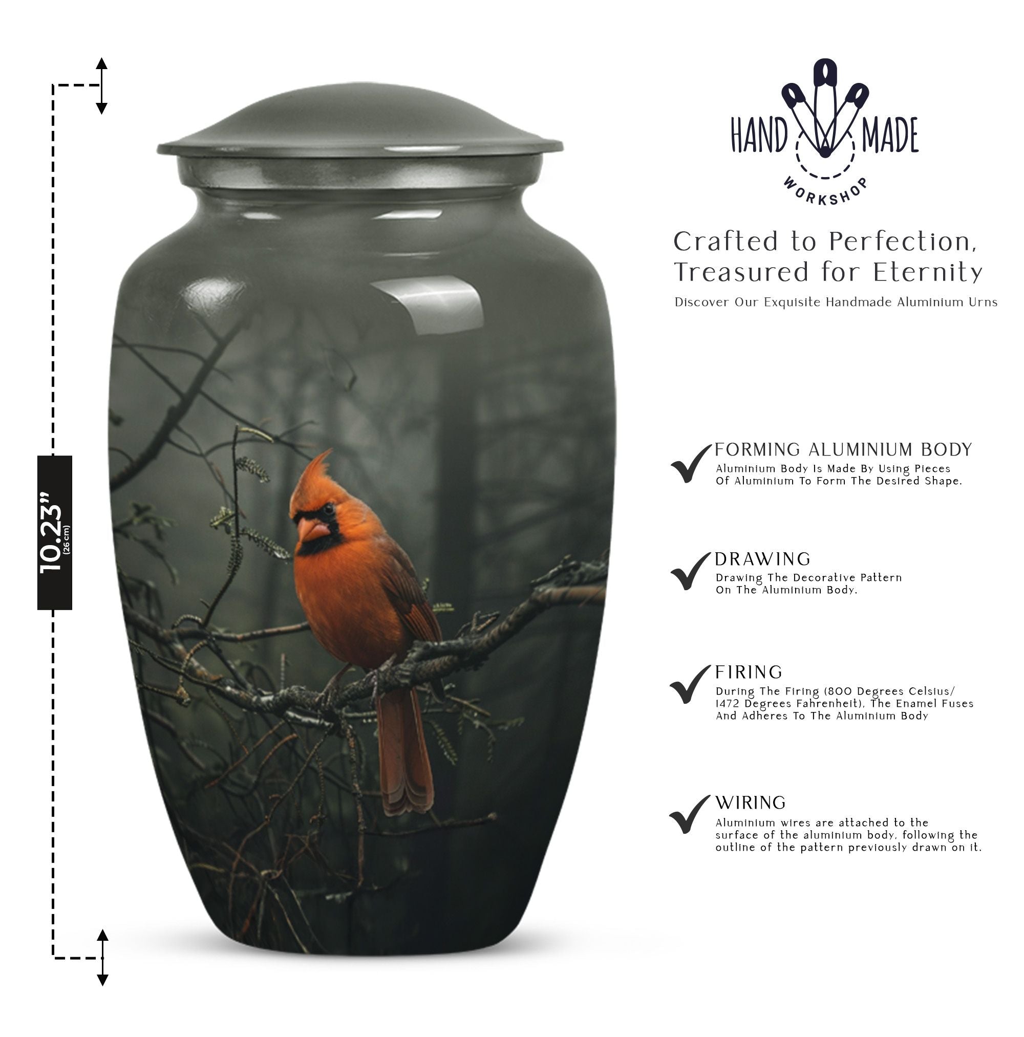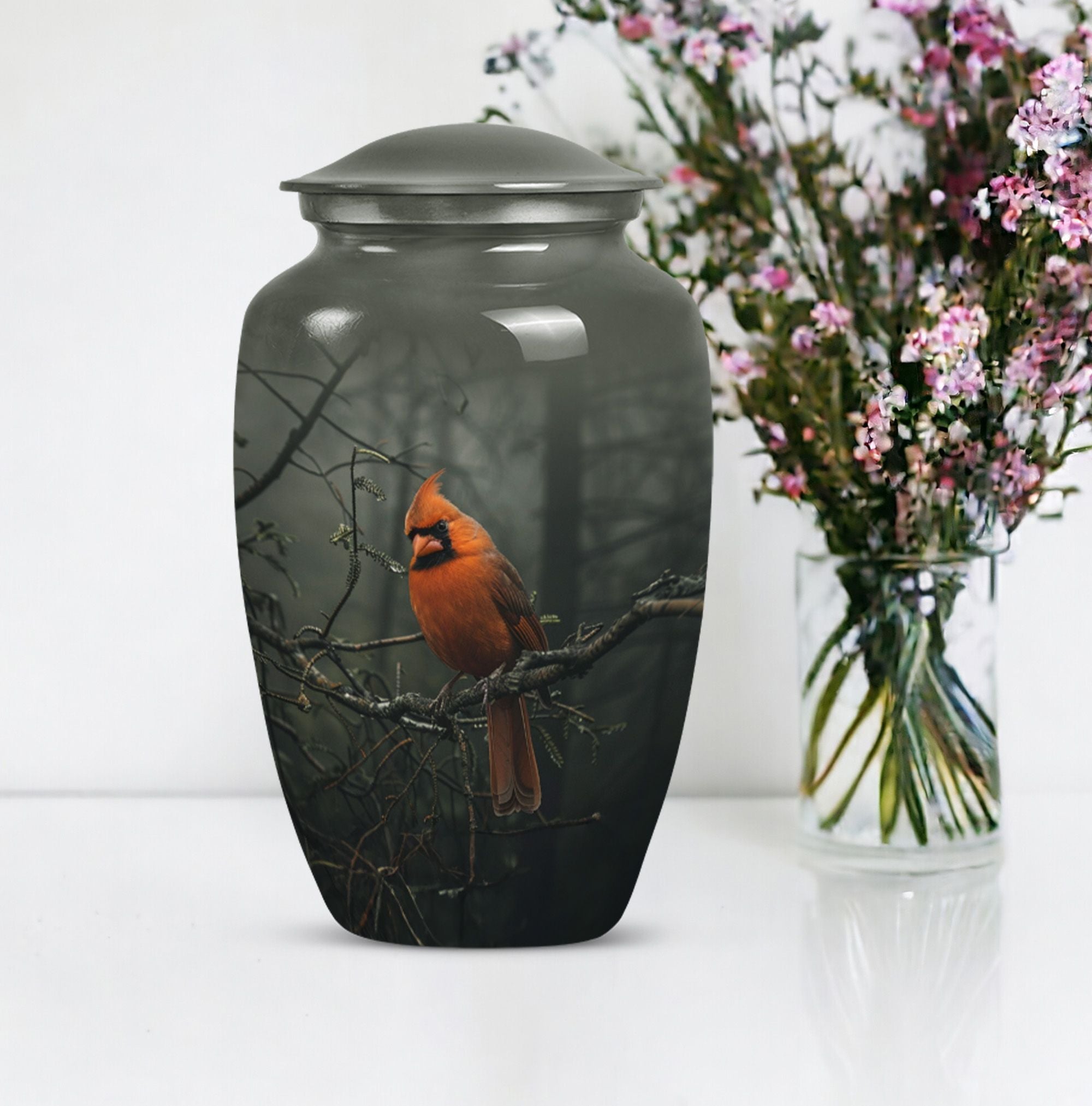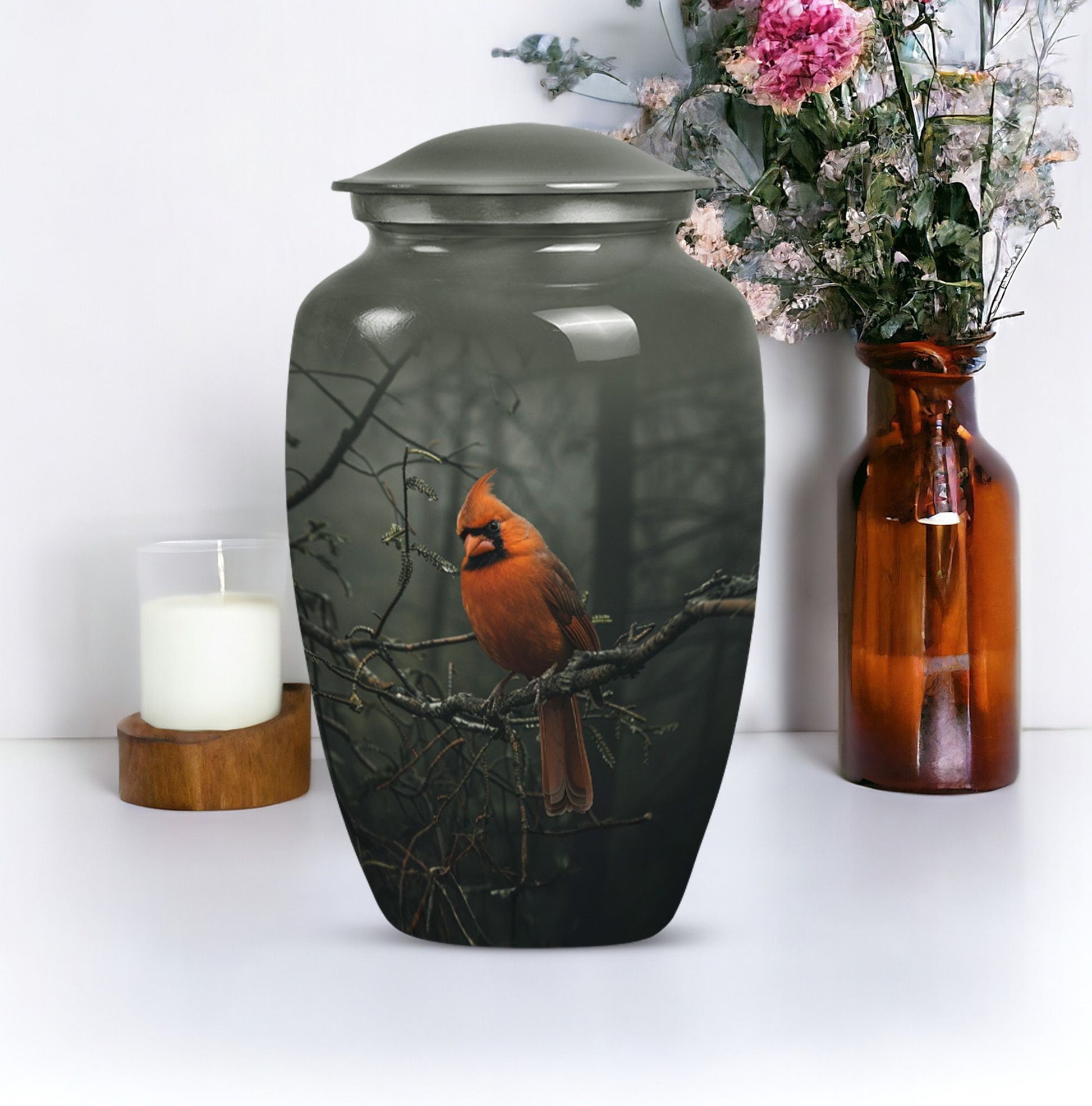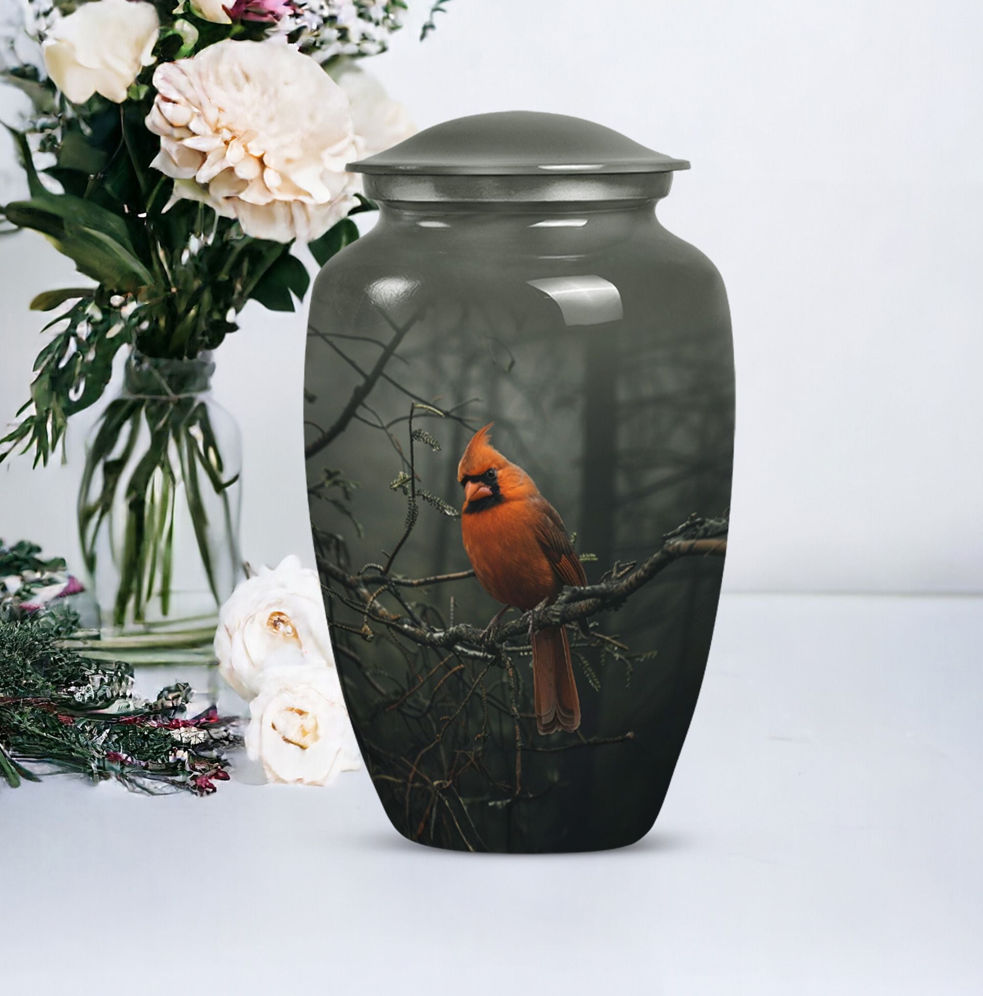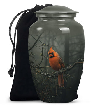 Cherish the memories of your loved ones with our Cardinal Bird Urn, a heartfelt piece in the assortment of memorial urns. Crafted carefully from sturdy Aluminum, this urn sets a tranquil town with its abstract theme. It spans an adequate 10 inches in height, offering an ample capacity of 200 cubic inches to carefully hold the ashes. This Large Urn is cloaked in a classic disposition, an affirmation of its purpose - a respectful and dedicated ceremony. The package includes a soft velvet pouch, providing containment and protection for the ashes. Furthermore, you get the scope of personalizing this urn with an engraved name, offering a unique touch to your tribute. As a cremation adult urn for human ashes, it's ideal, seemingly embracing its weight of 3.3 pounds, as if acknowledging the weight of your memories and emotions. Whether you're looking for burial urns for cremation ashes or just a deliberate ash urn, this product adapts to your intent, extending its use to both men and women.
