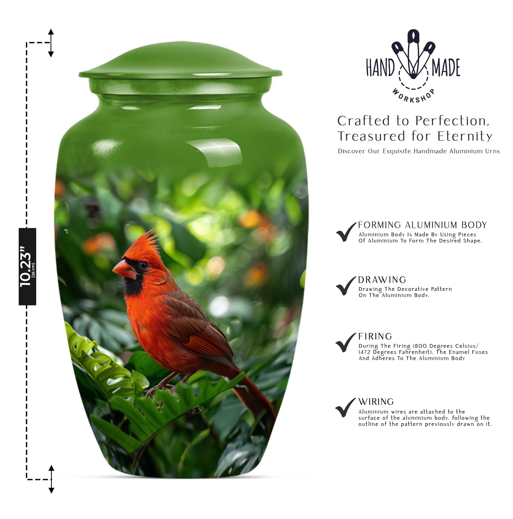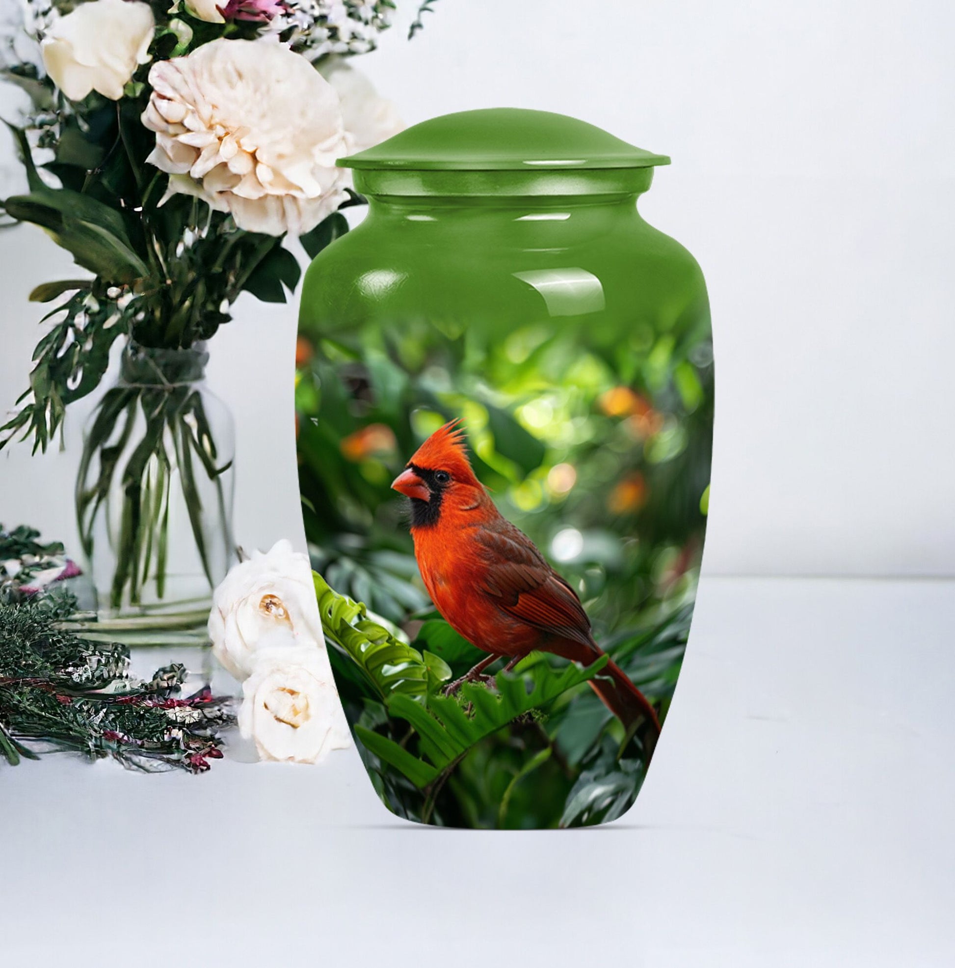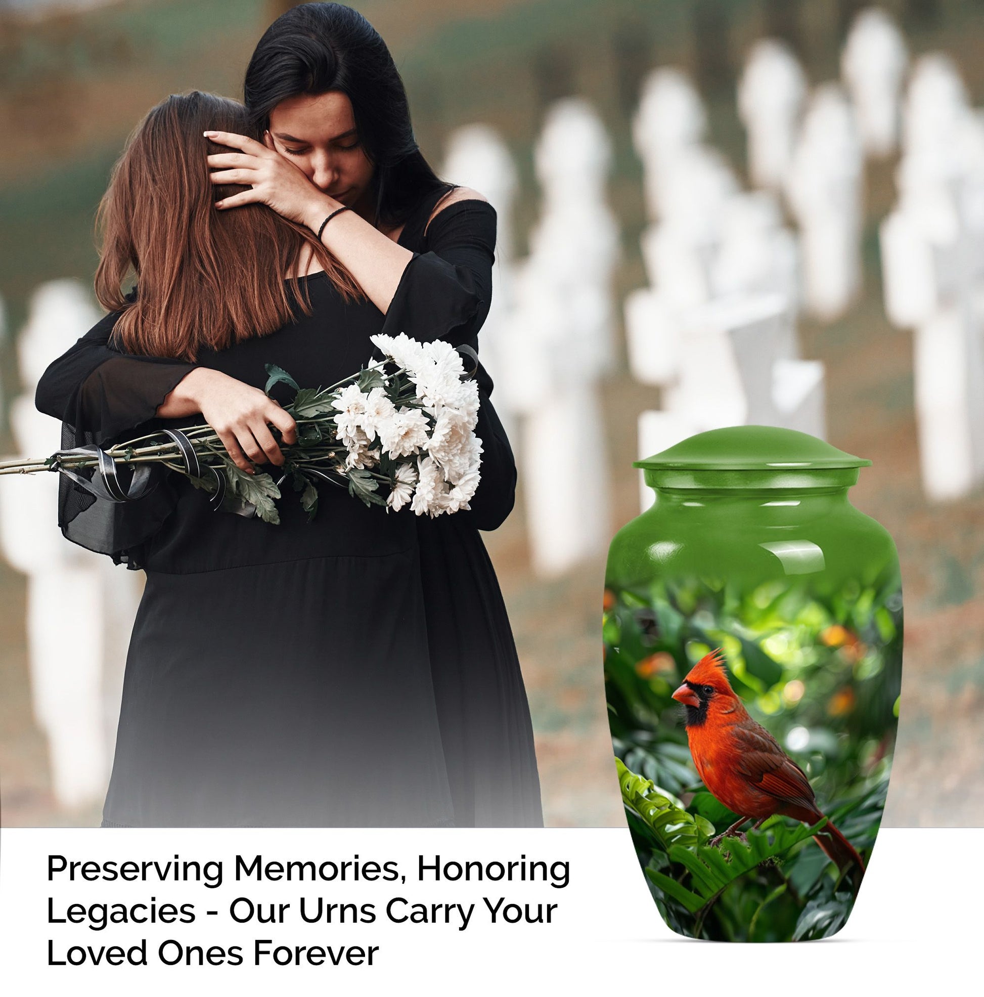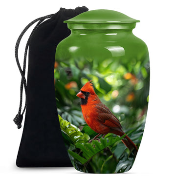 Honor your beloved's journey to eternity with our striking Cardinal bird urn, the perfect selection in our category of Memorial Ceremony Supplies designed for adults and seniors. This burial urn for human ashes is a beautiful tribute to your loved one's life. Crafted from high-quality aluminium, the Cardinal bird urn showcases a magnificent 'Wolf Howling' Theme that transcends time. Measuring 10 inches in height and weighing around 3.3 pounds, the urn offers a substantial capacity of 200 cubic inches, designed to respectfully hold your loved ones' remains. You can further personalize this urn with engraved names, adding a special touch to this resting place. The urn is also accompanied by a sumptuous velvet pouch for containment of ashes, ensuring dignity and respect. Ideal for memorial urns' searchers, its heart-warming presence connects visually to sentiments of remembrance, peace, and forever love. Its 'Classic Urn' style fuses tradition with timeless magnificence, making it a thoughtful and lasting homage.