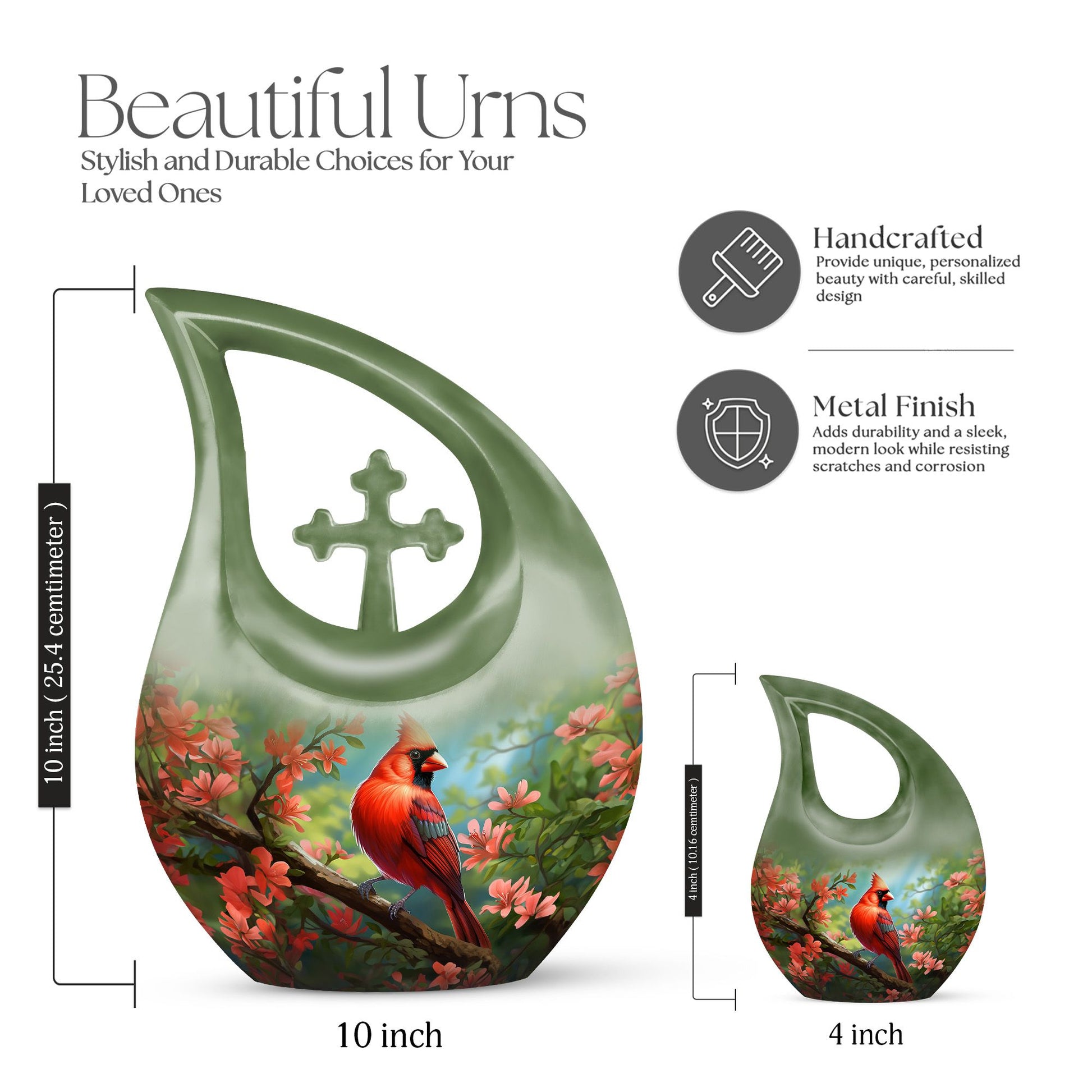 Expertly made from durable, high-quality aluminum, this large adult urn combines exceptional craftsmanship with timeless artistry. The vivid red cardinal design on a soft background reflects eternal love and faith, making it a beautiful addition to any memorial space. Whether you’re seeking an urn for mom ashes large or a large decorative urn for human ashes, this piece ensures both security and beauty. Each urn human ashes large features a secure screw-top lid, ensuring ashes remain safely preserved for generations.