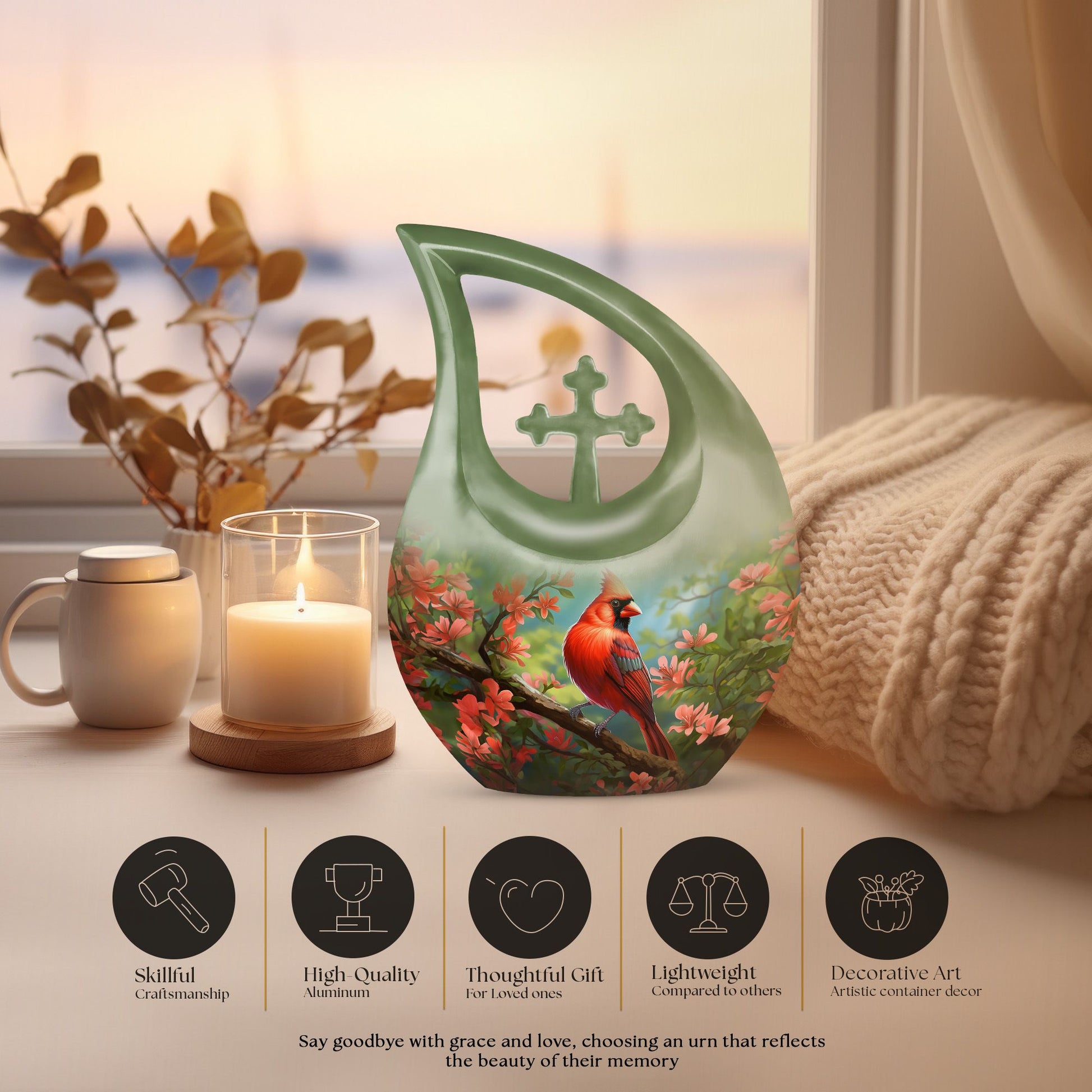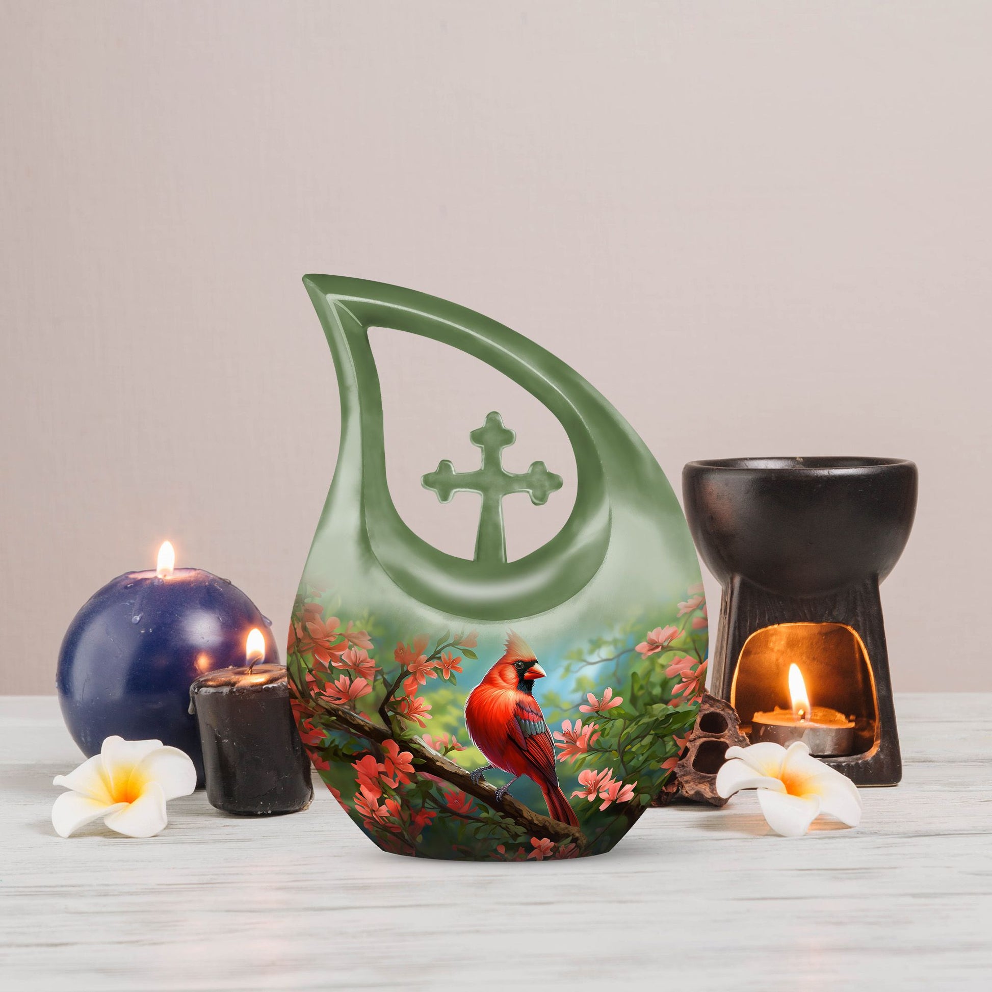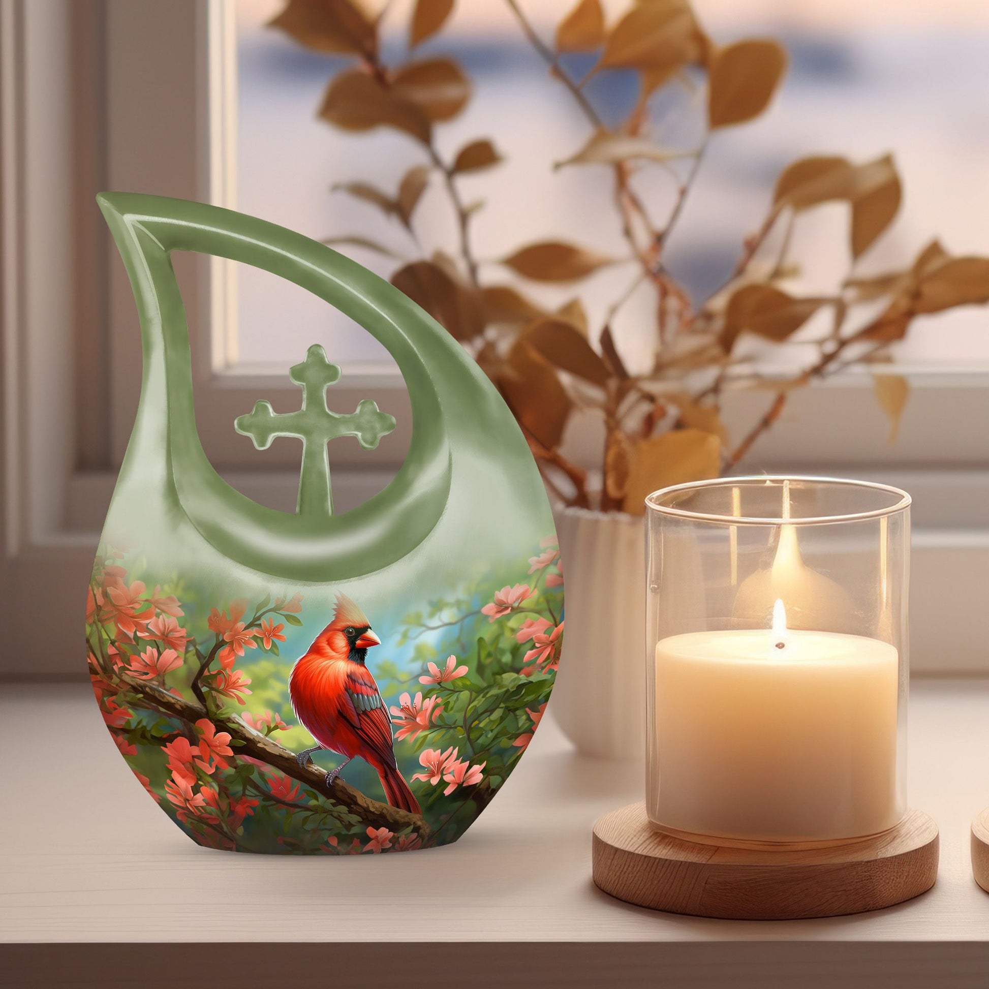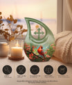 A symbol of faith and hope, the cardinal design reminds us that our loved ones never truly leave us—they live on in spirit and memory. This large decorative urn for human ashes stands as a loving tribute to a beautiful life remembered with grace.