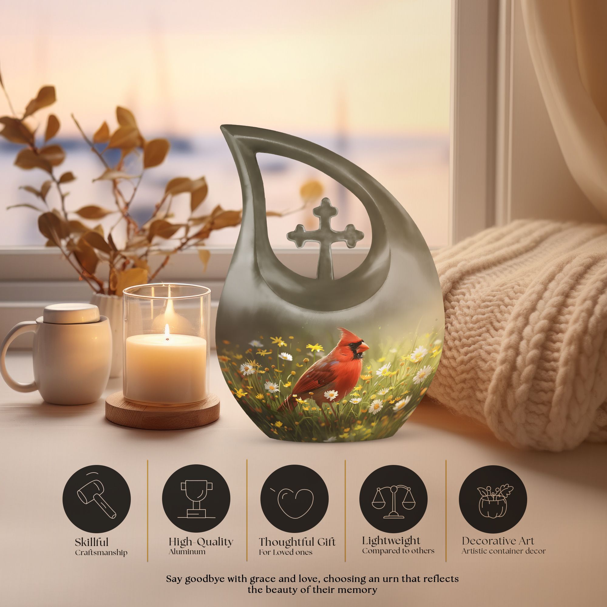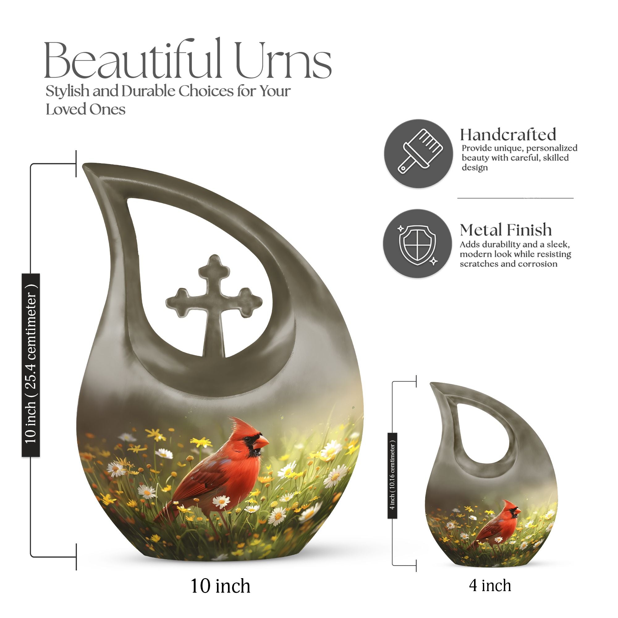 Crafted from durable aluminum, the full-size 10 inch urn features a serene cardinal motif symbolizing peace, presence, and spiritual connection. Its secure screw-top lid ensures long-term protection, while the coordinating keepsakes—such as a small ashes keepsake, small keepsake urns for ashes, or urns for ashes small keepsake—offer smaller, personal memorials that can be displayed at home, kept close, or gifted to family members. The design pairs beautifully with small decorative urn options and individualized memorials like a small urn for ashes keepsake mom or small urns for human ashes keepsake dad.