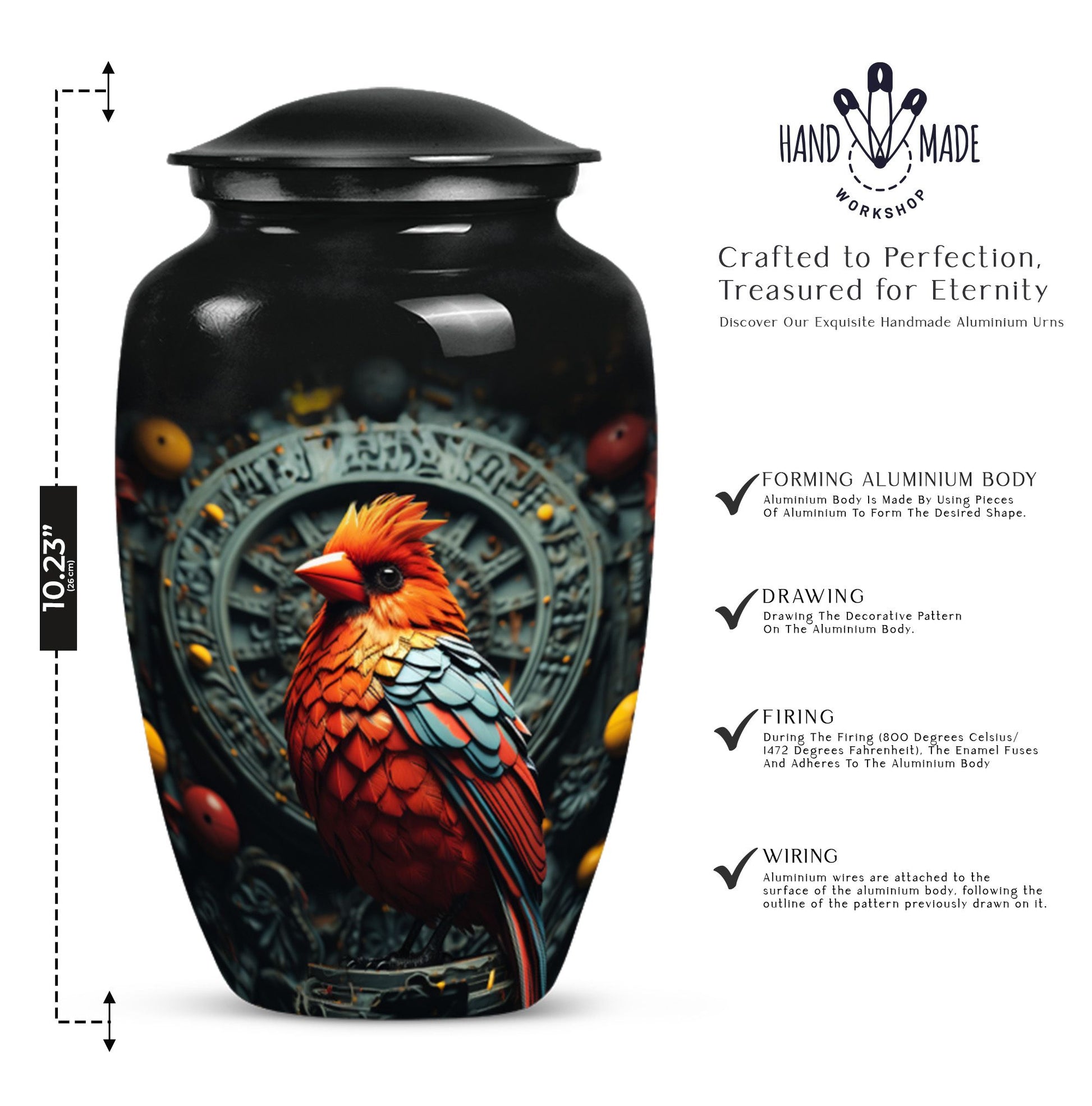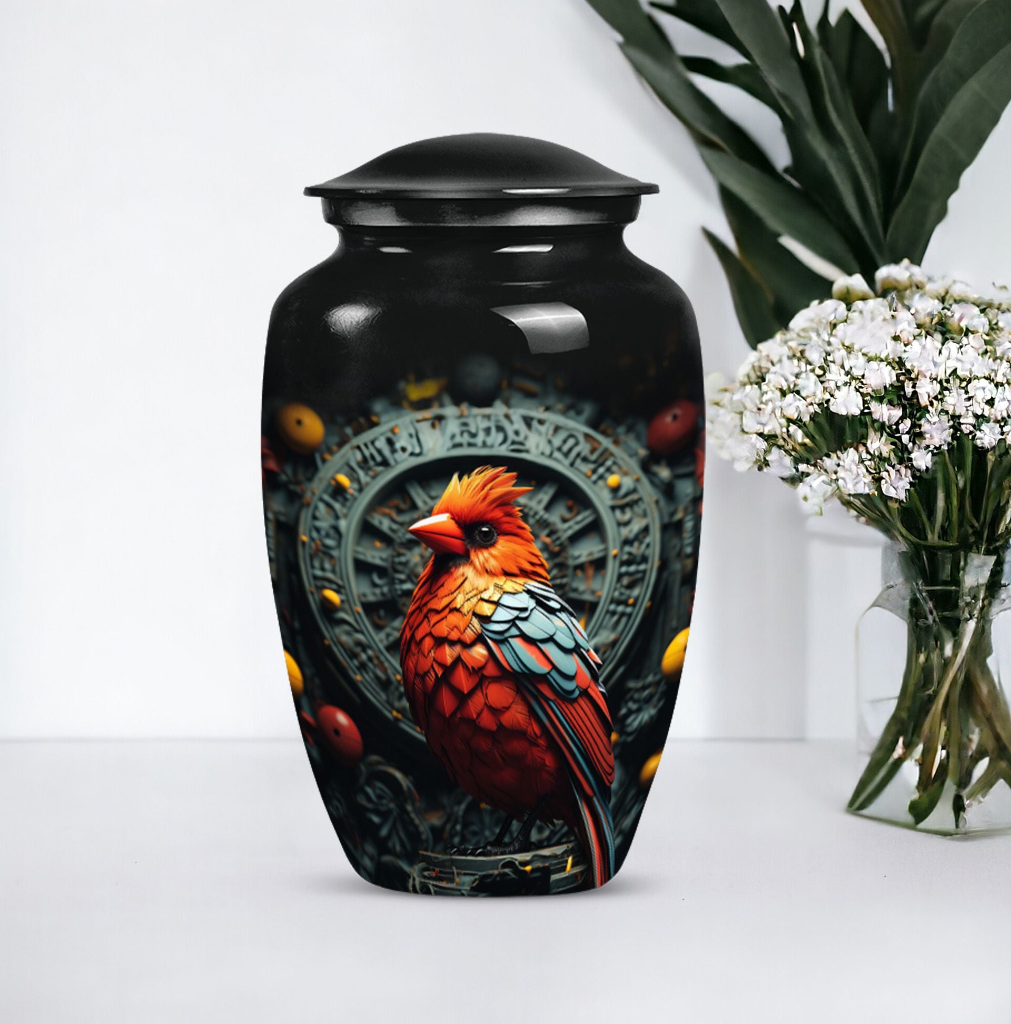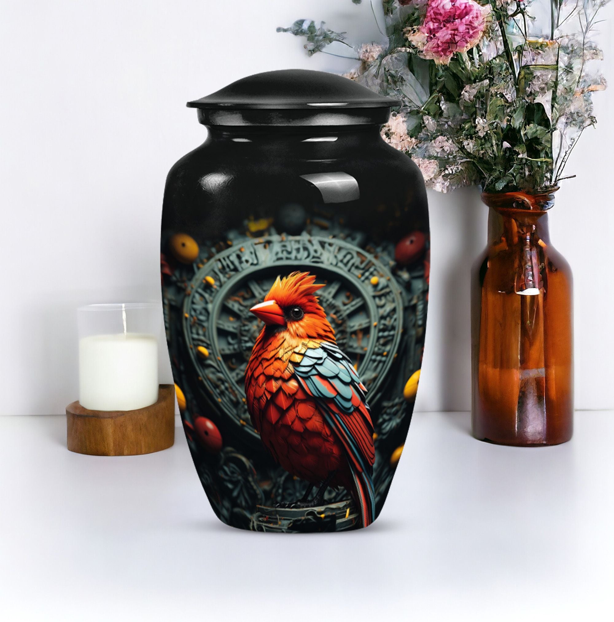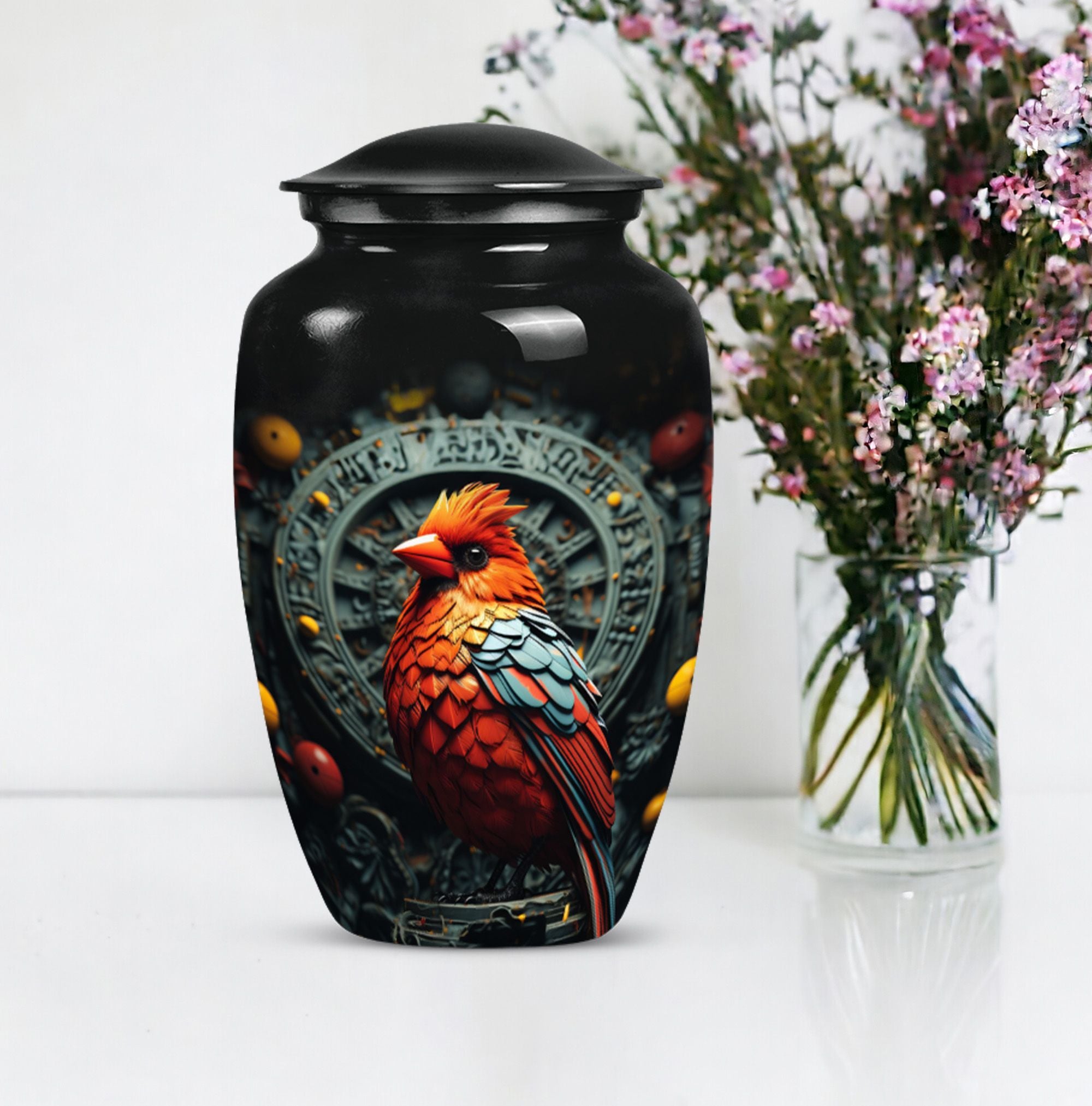 Preserve the memory of your loved ones with our elegant and timeless 'Cardinal Bird Urn'. Created primarily for seniors and adults seeking meaningful memorial ceremony supplies, this large urn is a sophisticated homing for human ashes. Measuring at 10 inches, the urn's capacity is substantial at 200 cubic inches, able to hold the ashes of an adult human. Managed a hefty weight of 3.3 pounds, this piece is robust and substantial. Handcrafted from high-quality aluminium, this urn provides longevity and durability. The abstract theme adds a touch of personal touch that is both unique and evocative. Our Cardinal Bird Urn ensures the containment of ashes remained respectful and modest, with a complimentary velvet pouch included in the package. Offering the option to personalize through engraved names, our urn serves not only as a resting place but a personal tribute to the departed soul. Please note that the urn style is a classic urn and does not reflect any particular design variation. Imbued with deep symbolic resonance, the Cardinal Bird Urn provides an ideal choice amongst cremation urns for men or human ash ashes for adult female.