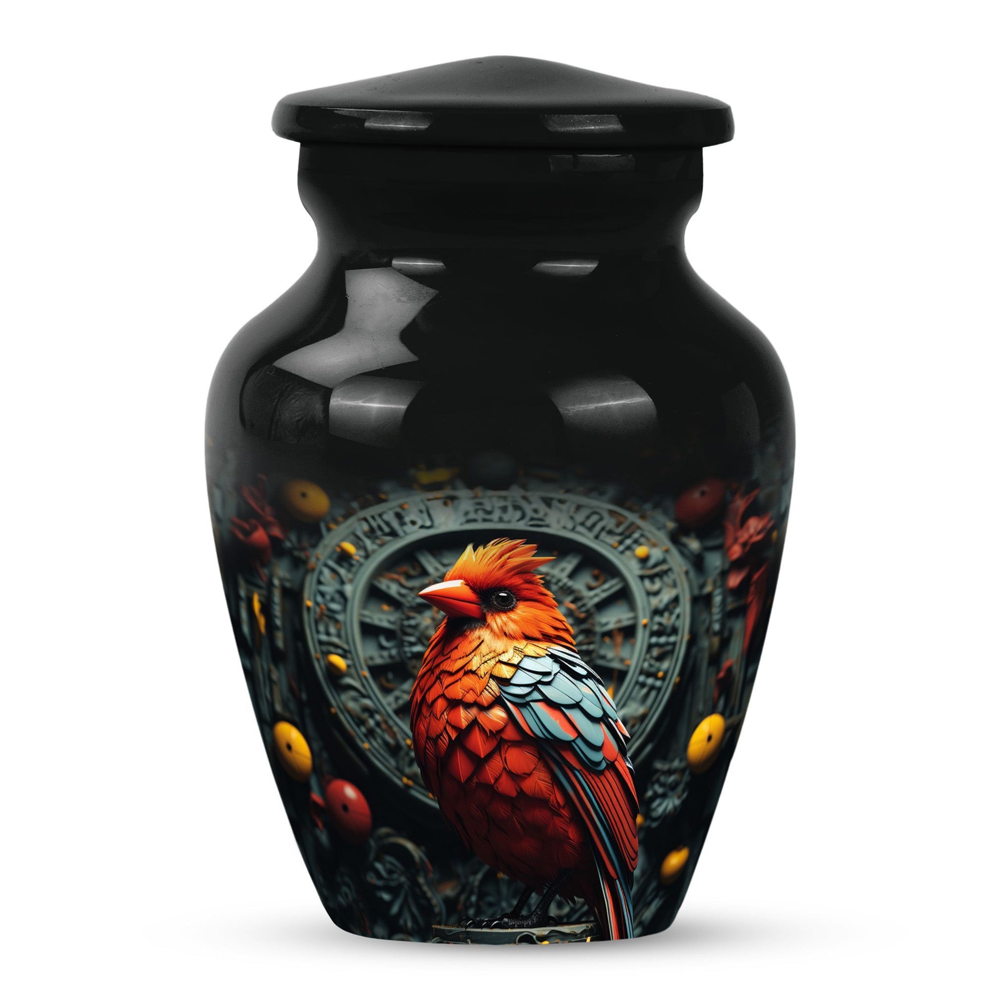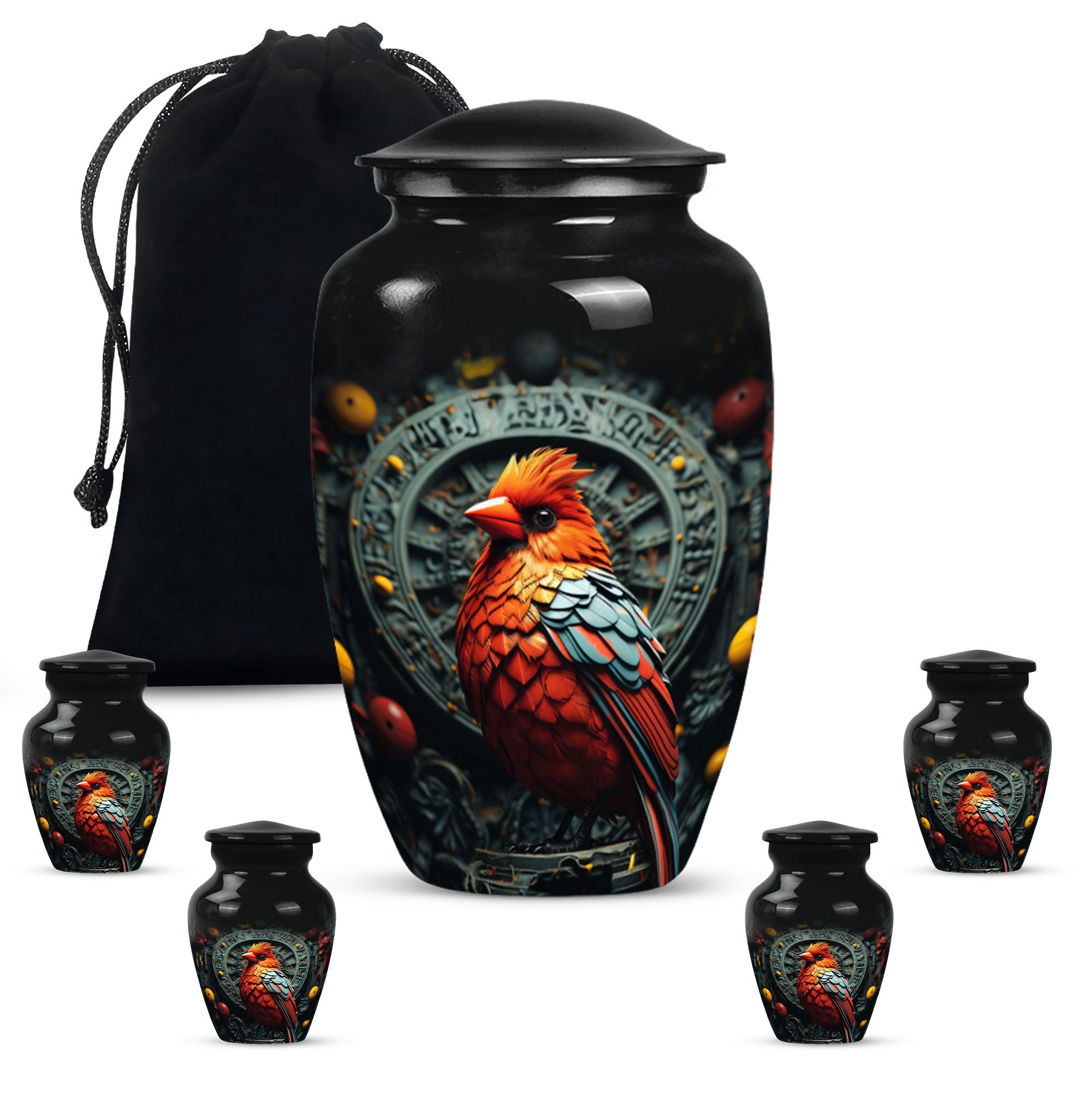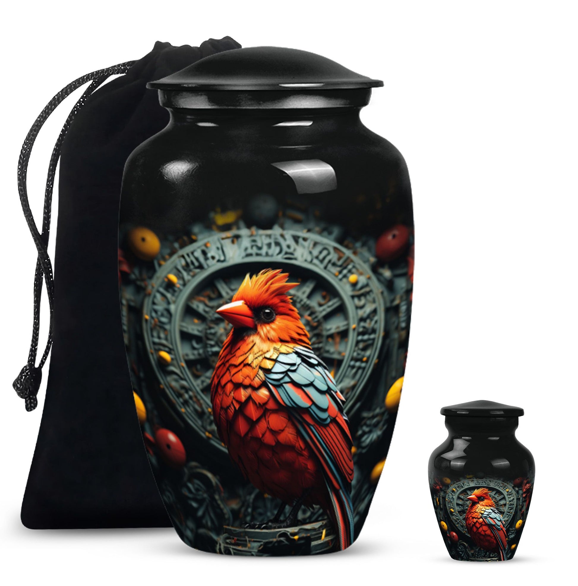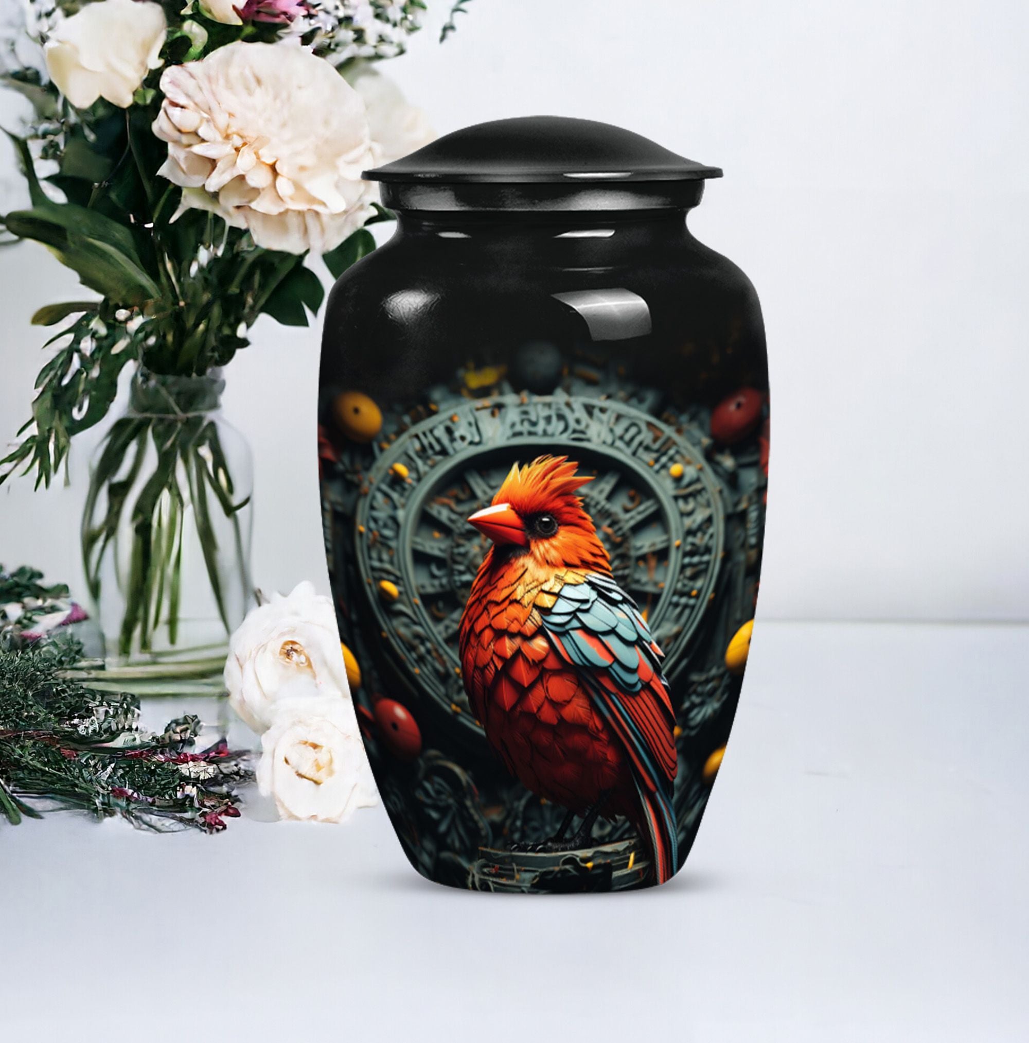 Preserve the memory of your loved ones with our elegant and timeless 'Cardinal Bird Urn'. Created primarily for seniors and adults seeking meaningful memorial ceremony supplies, this large urn is a sophisticated homing for human ashes. Measuring at 10 inches, the urn's capacity is substantial at 200 cubic inches, able to hold the ashes of an adult human. Managed a hefty weight of 3.3 pounds, this piece is robust and substantial. Handcrafted from high-quality aluminium, this urn provides longevity and durability. The abstract theme adds a touch of personal touch that is both unique and evocative. Our Cardinal Bird Urn ensures the containment of ashes remained respectful and modest, with a complimentary velvet pouch included in the package. Offering the option to personalize through engraved names, our urn serves not only as a resting place but a personal tribute to the departed soul. Please note that the urn style is a classic urn and does not reflect any particular design variation. Imbued with deep symbolic resonance, the Cardinal Bird Urn provides an ideal choice amongst cremation urns for men or human ash ashes for adult female.