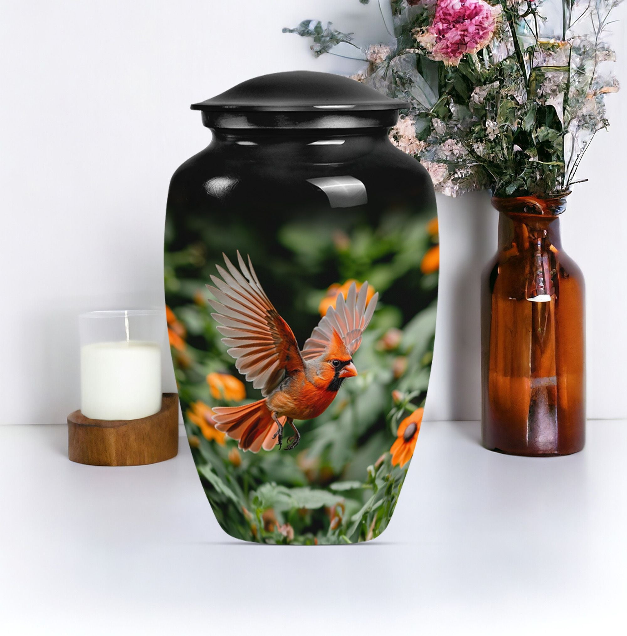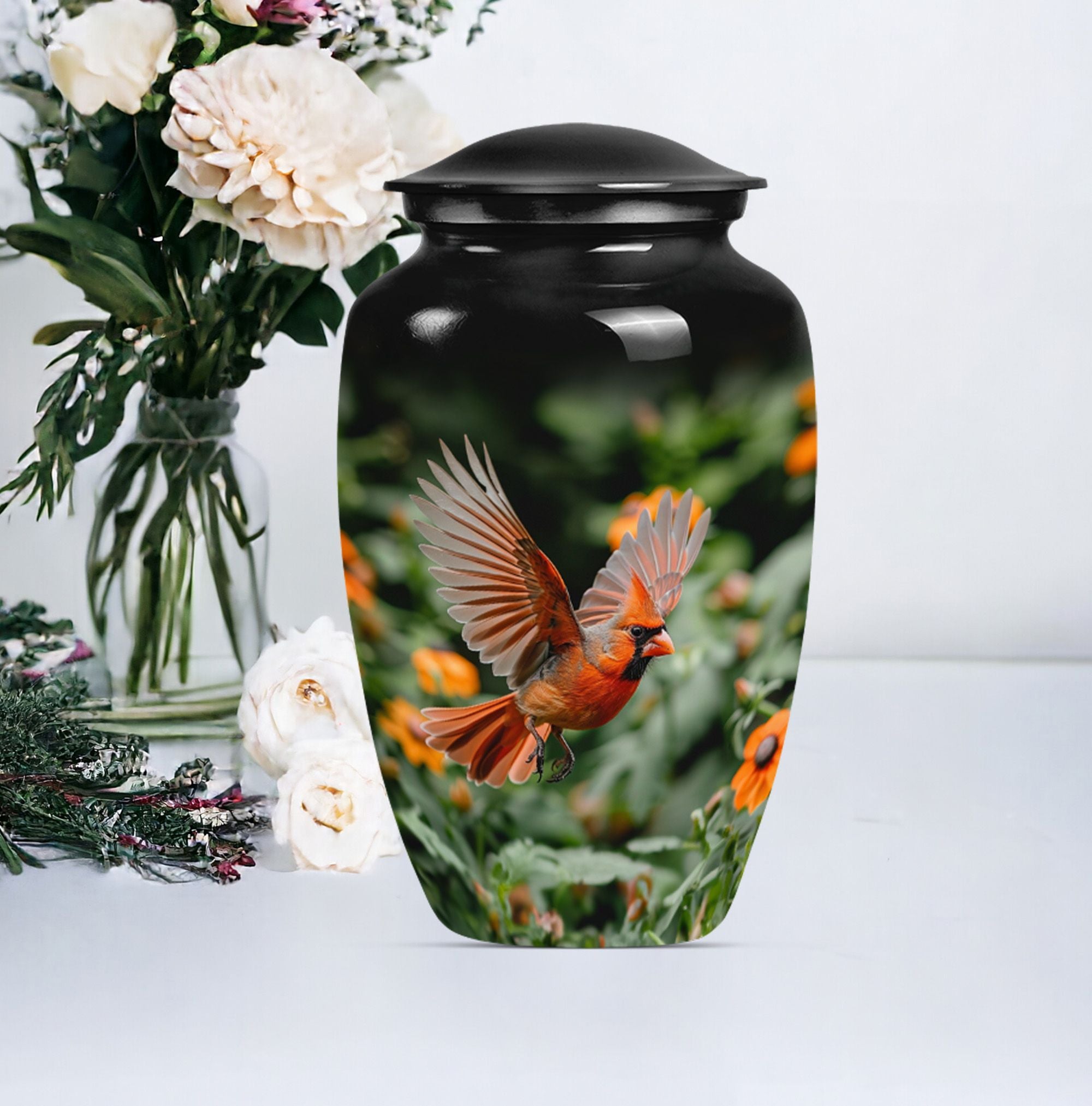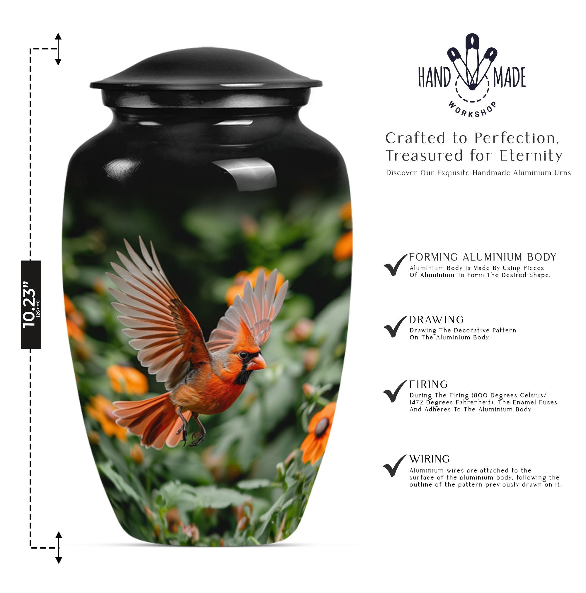 Our Cardinal bird Urn, part of our funeral unique urns for human ashes selection, brings an air of dignity and tranquility to your memorial ceremony. This cremation urn is a large urn, 10-inches in height and weighing 3.3 pounds. It's carefully crafted from high-quality Aluminium, ensuring a robust structure that will honor a lifetime of memories. The urn carries a theme of 'Wolf Howling,' a rare design that adds a peace-at-night atmosphere to any setting. The unit's capacity is 200 cubic inches, large enough to hold the ashes of your cherished one safely. Each of our Cardinal bird Urns comes with a velvet pouch that brings a luxurious touch to the containment of ashes. Plus, you may personalize it with engraved names, adding a special touch to memorialize your loved one. Explore our memorial medium urns for ashes and discover cremation urn burial options that are more than just funeral cremation urns - they are a testament to a life well-lived.