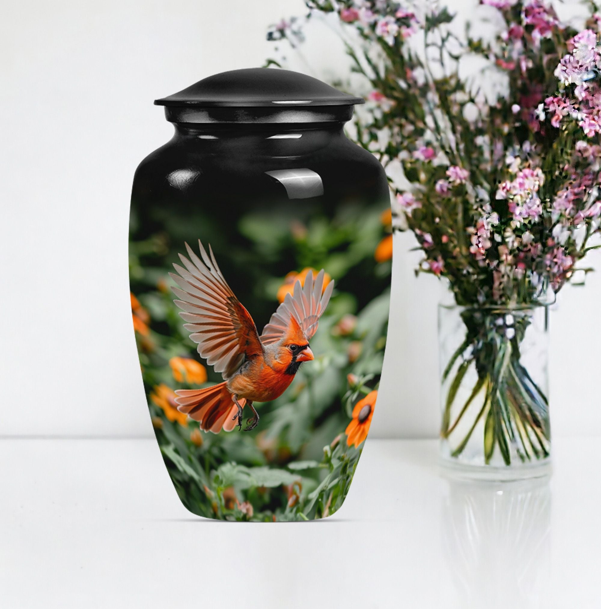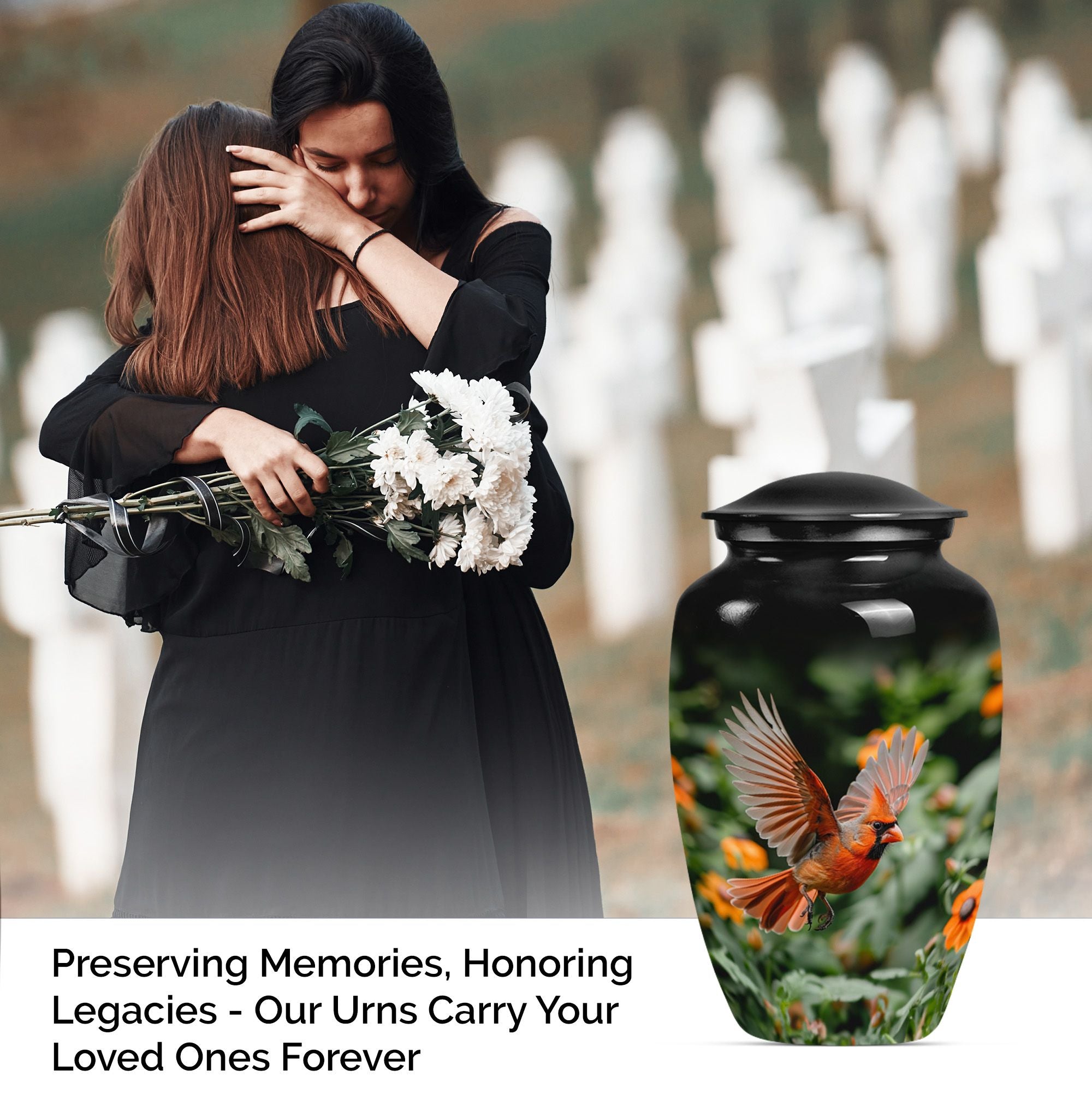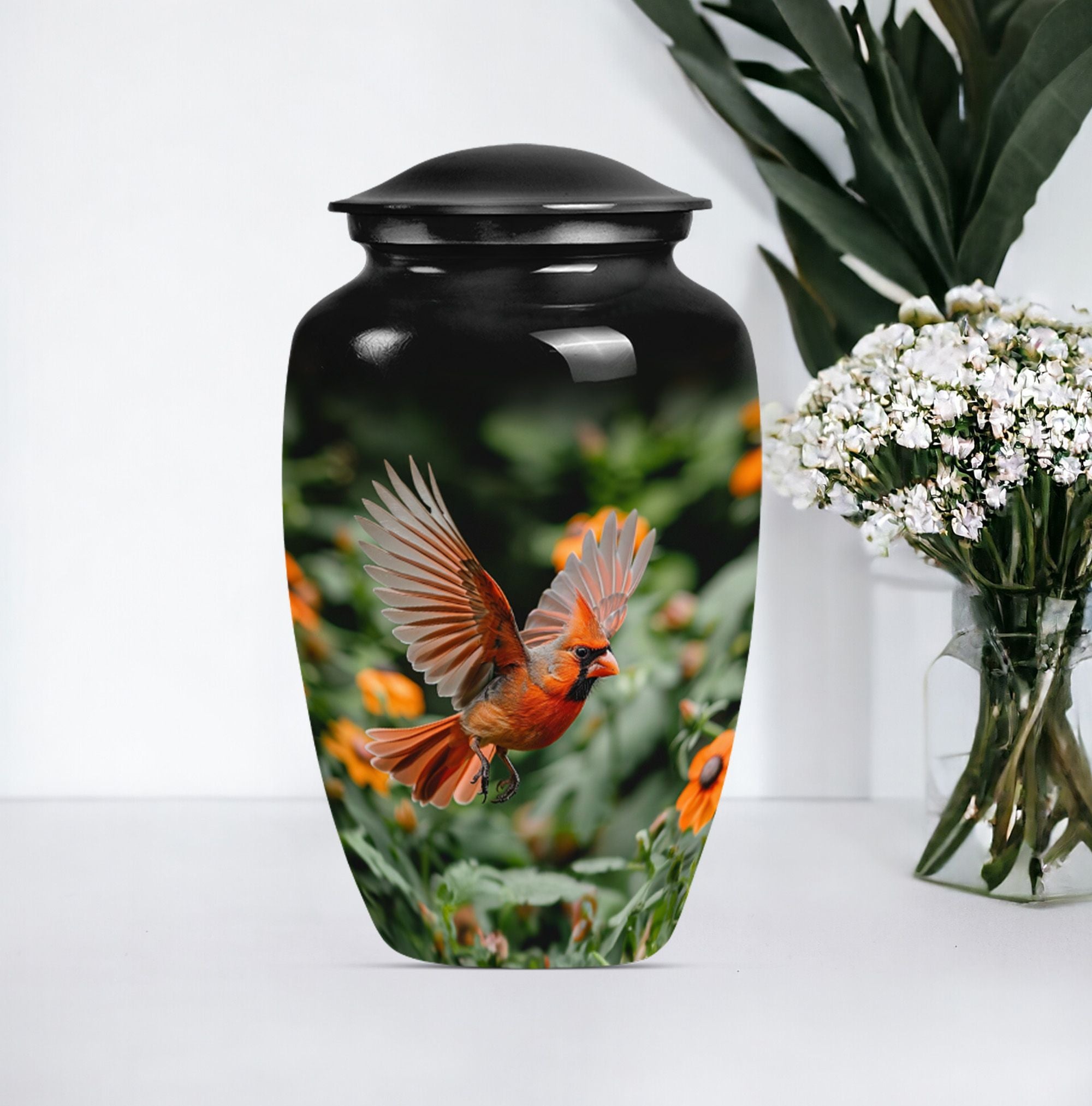 Our Cardinal bird Urn, part of our funeral unique urns for human ashes selection, brings an air of dignity and tranquility to your memorial ceremony. This cremation urn is a large urn, 10-inches in height and weighing 3.3 pounds. It's carefully crafted from high-quality Aluminium, ensuring a robust structure that will honor a lifetime of memories. The urn carries a theme of 'Wolf Howling,' a rare design that adds a peace-at-night atmosphere to any setting. The unit's capacity is 200 cubic inches, large enough to hold the ashes of your cherished one safely. Each of our Cardinal bird Urns comes with a velvet pouch that brings a luxurious touch to the containment of ashes. Plus, you may personalize it with engraved names, adding a special touch to memorialize your loved one. Explore our memorial medium urns for ashes and discover cremation urn burial options that are more than just funeral cremation urns - they are a testament to a life well-lived.
