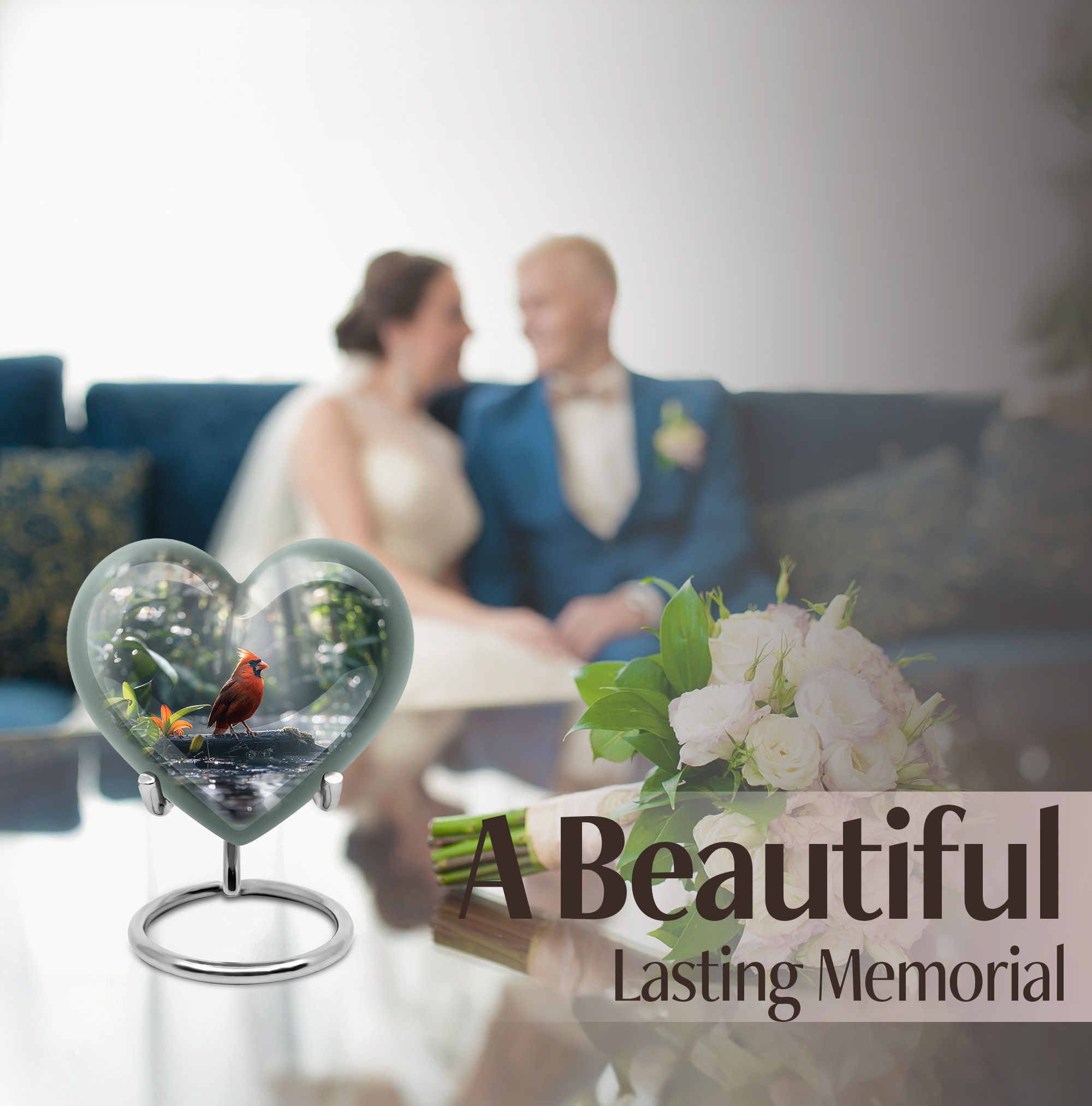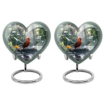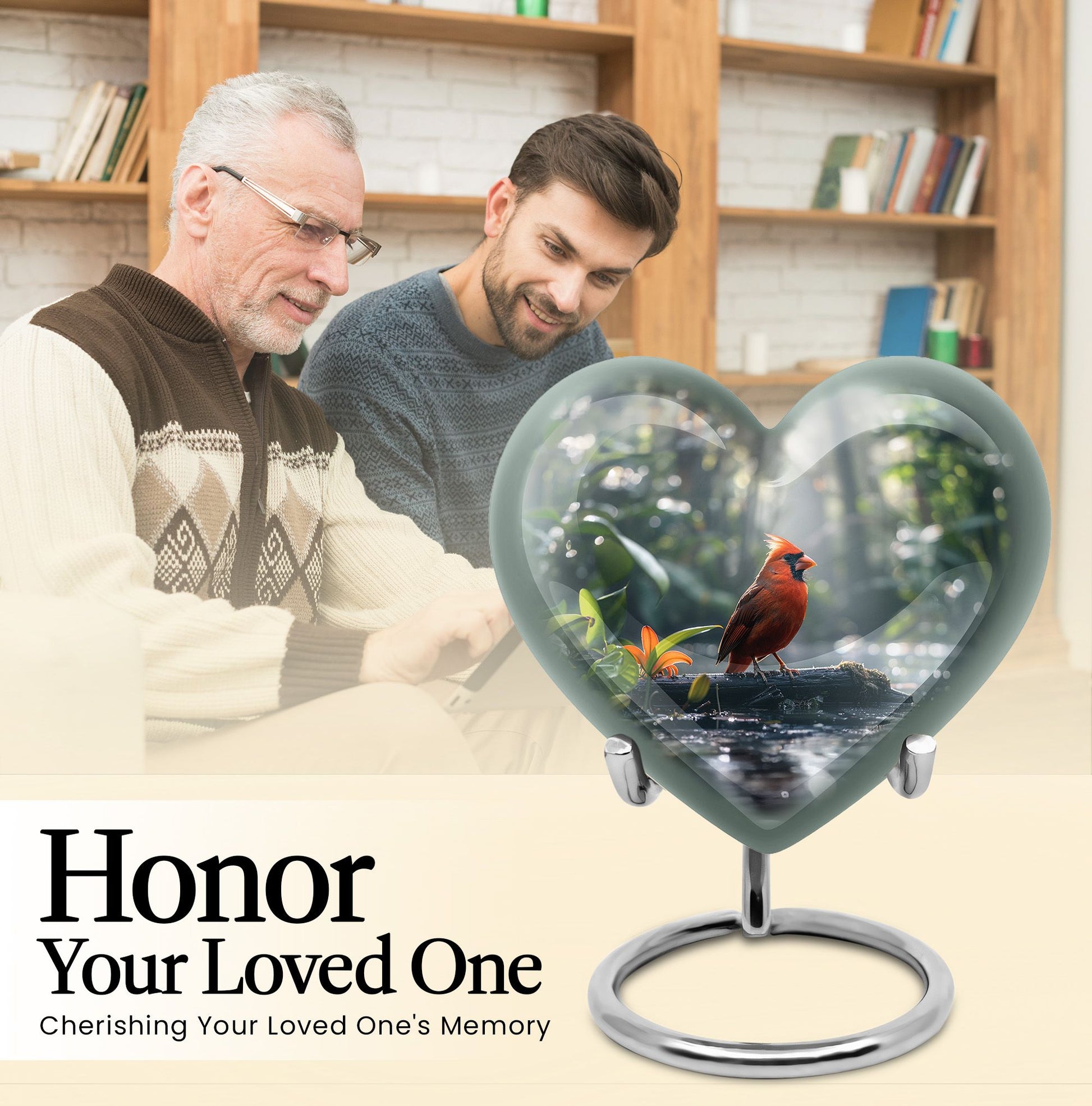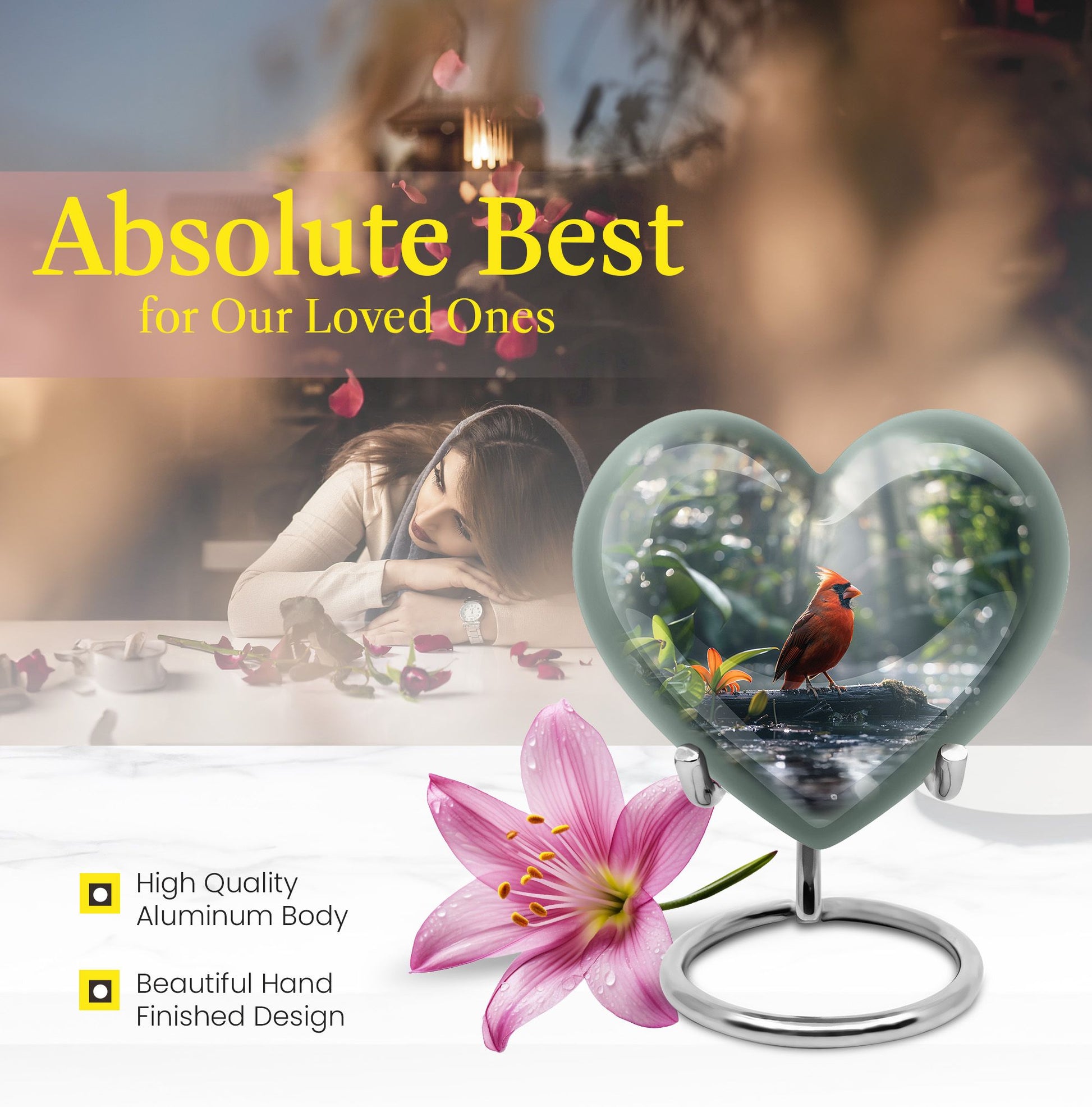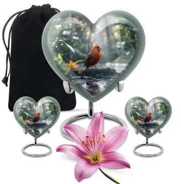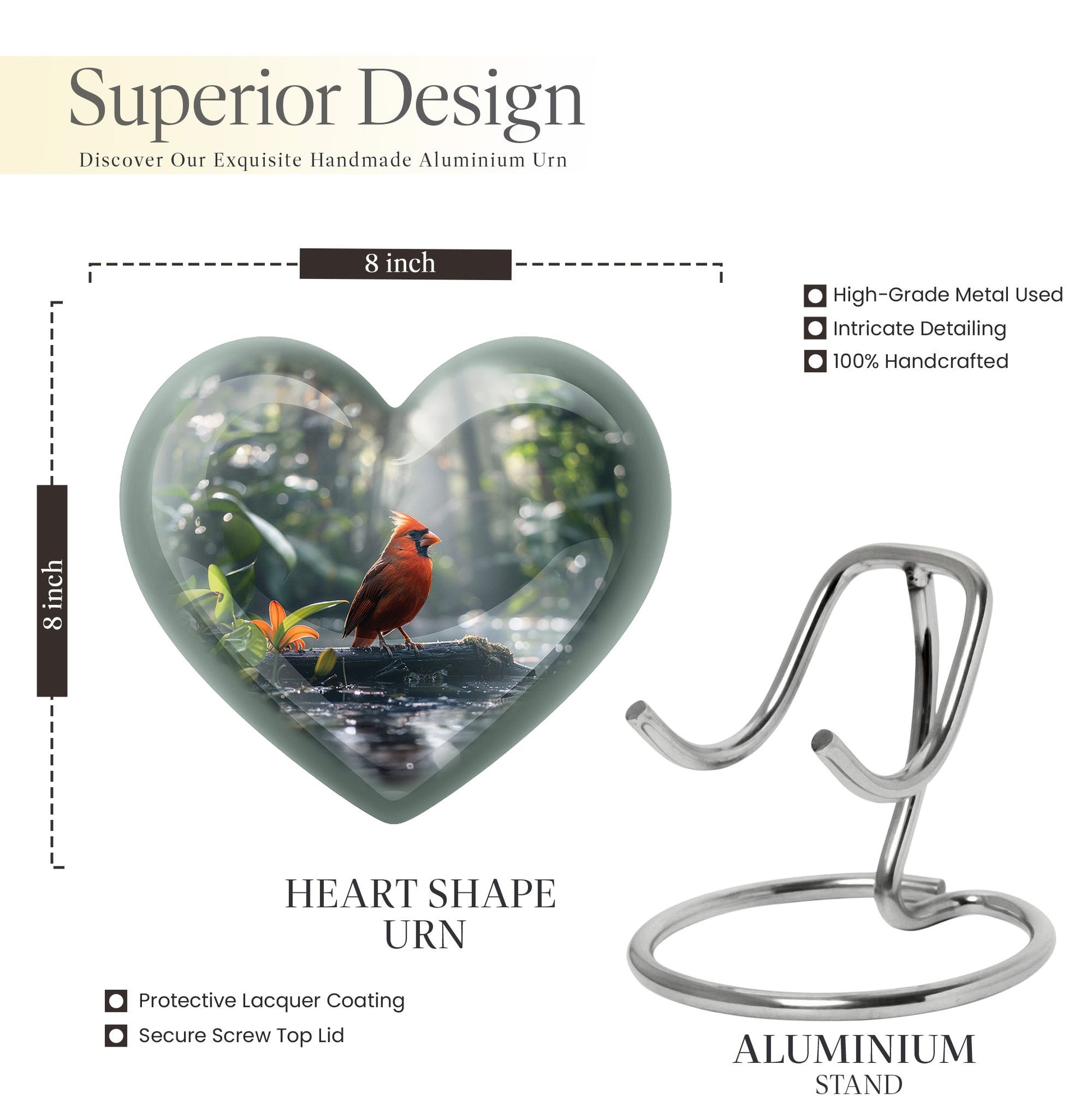 Presenting a majestic piece, the 10-inch Cardinal Bird Urn, an abstract-themed cremation companion meant for memorialization that transcends the ordinary. Crafted finely with lightweight yet durable aluminum, it weighs merely 3.3 pounds, rendering it portable yet steady. This large urn is ideal for human ashes from adults, regardless of gender. Brimming with a capacity of 200 cubic inches, it can safely hold the ashes of your loved ones with respect and grace. Moreover, our Cardinal Bird Urn comes in a heart-shaped design, linking directly to the essence of love and remembrance. We also provide an elegant velvet pouch for the containment of ashes, ensuring the dignity in handling is retained. Moreover, our funeral urn permits customization, allowing the engraved names to make it more personal and attached to your dear departed. Perfect for those searching for 'cremation urns' or 'memorial urns', this unique artefact is not only a vessel for ashes but also a tribute of enduring love.
