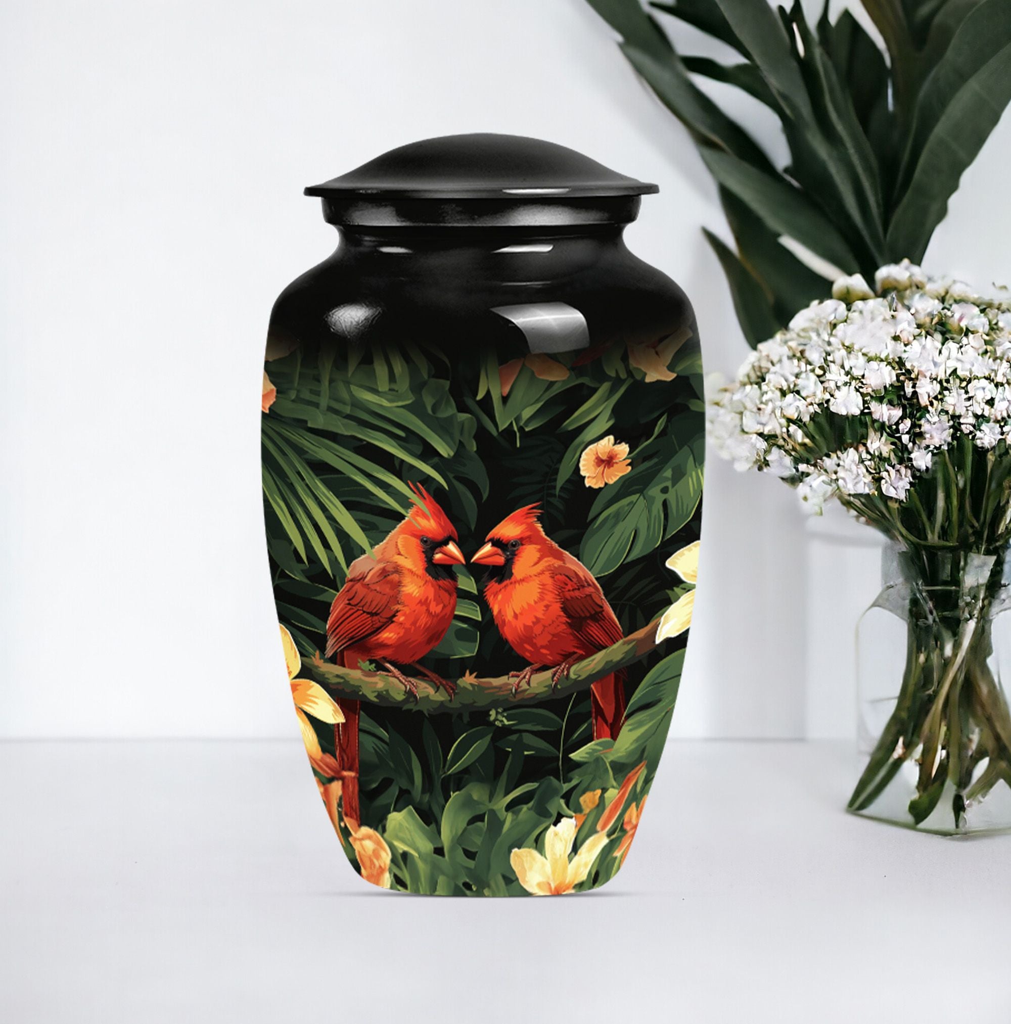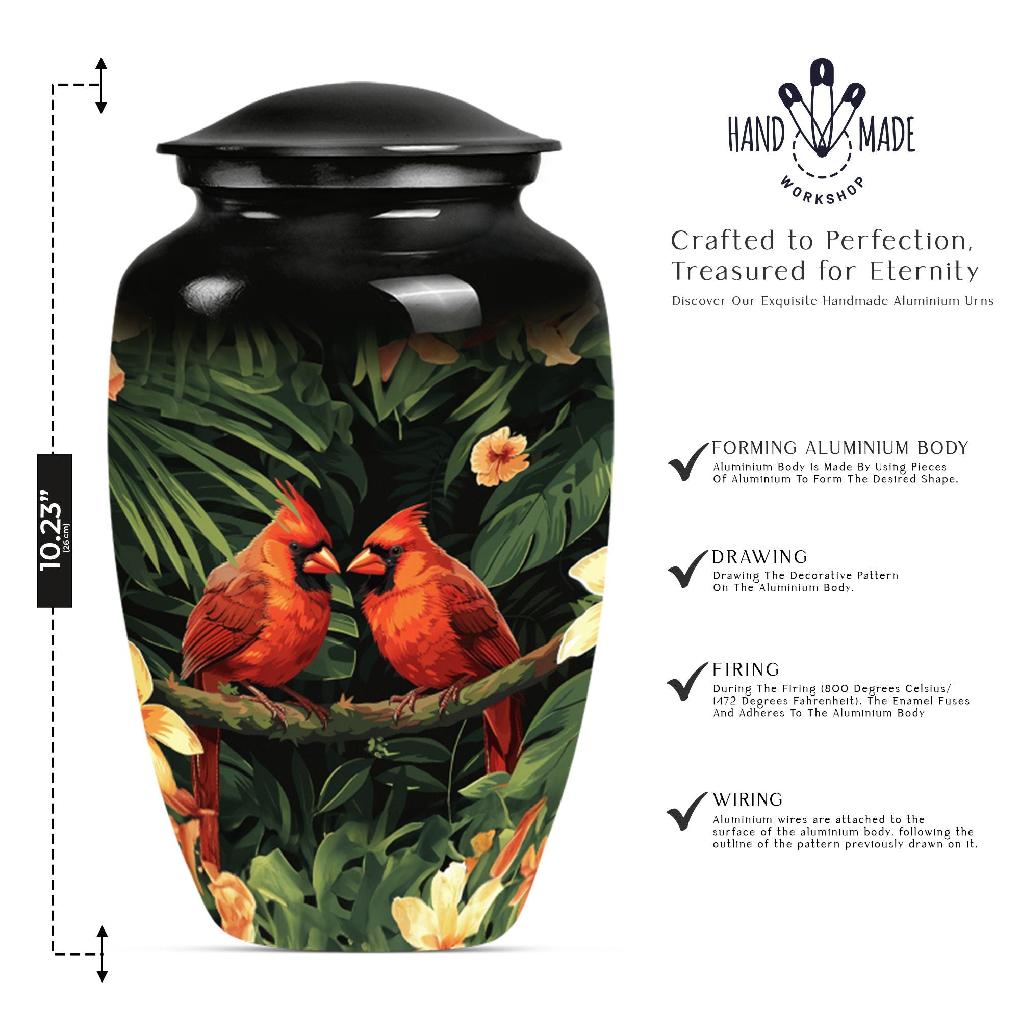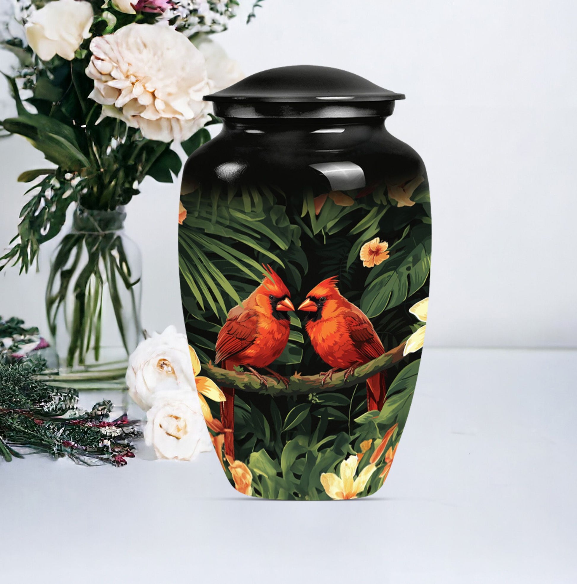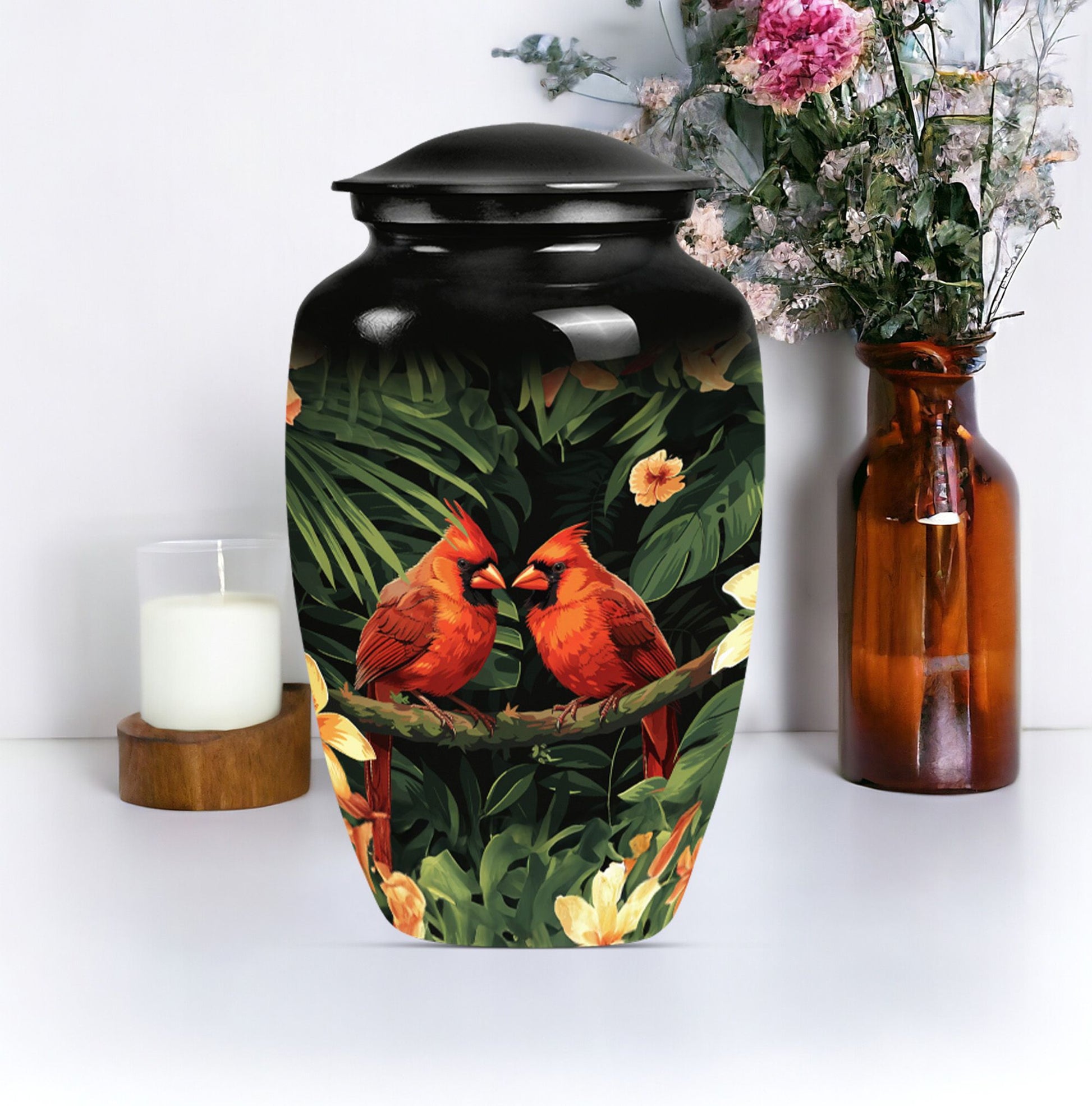 Honour your departed loved ones with our distinctly fashioned Cardinal bird urn. This adult memorial urn presents a remarkable craftsmanship, hailing from premium quality aluminium and standing tall at 10 inches. It's a large urn, constructed to accommodate up to 200 cubic inches of ash and weighing a solid 3.3 pounds. With a theme representing a Wolf Howling - this crestor of the wild brings about a unique sense of respect and remembrance. The cremation urn comes complete with a velvet pouch to safely contain the ashes of your loved one. Plus, you have the option to enhance its sentimentality through further personalization by engraving names. This 'Cardinal bird Urn' is not just a cremation container for human ashes, but also an elegant piece of art that sincerely venerates the memory of the departed. Whether for funeral burial urns or human ash urns needs, this gracefully designed urn stands out with its aesthetic appeal. Envelop the ashes of your cherished one in this cardinal bird urn, and let their spirit forever resonate in your heart.