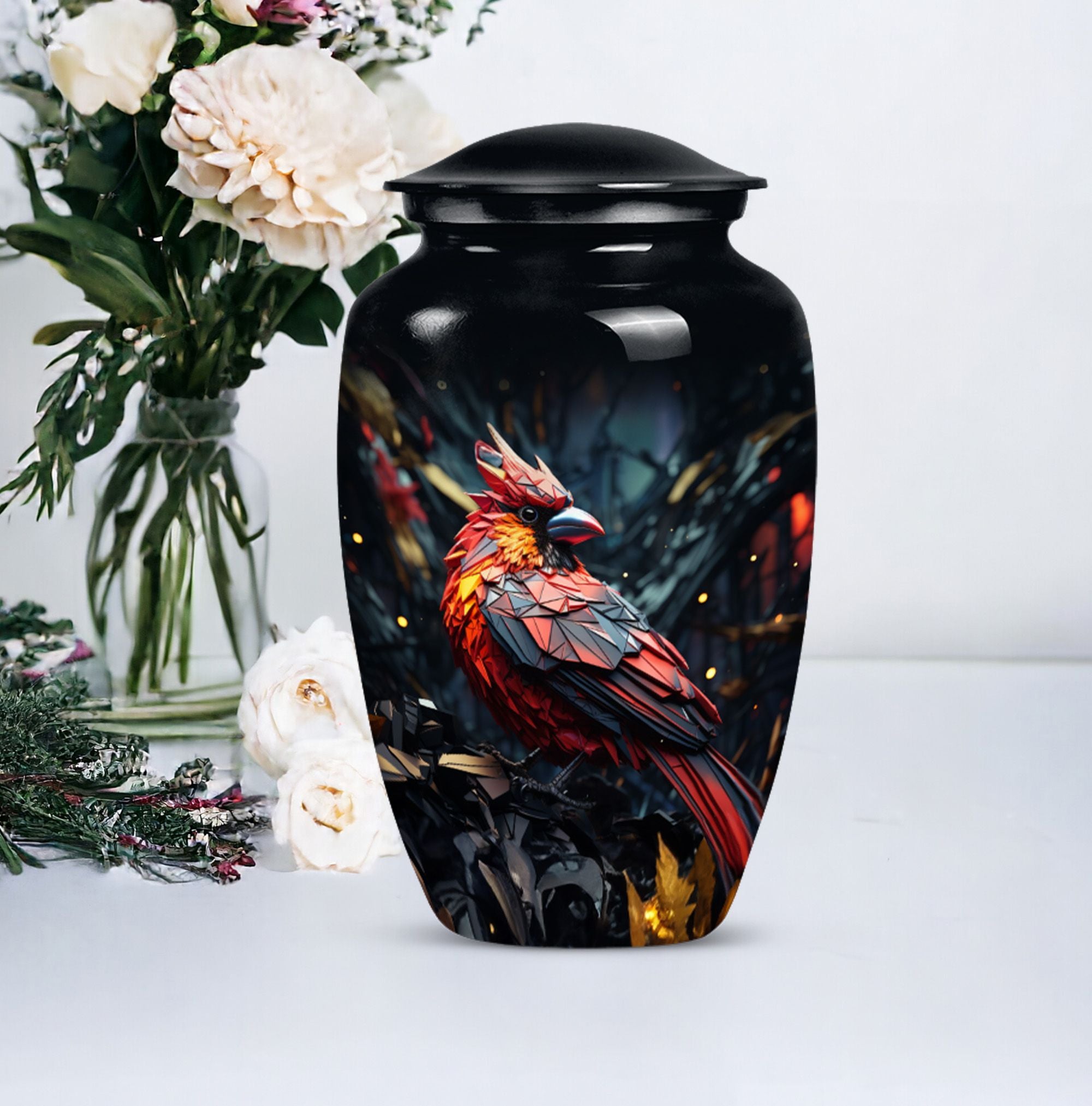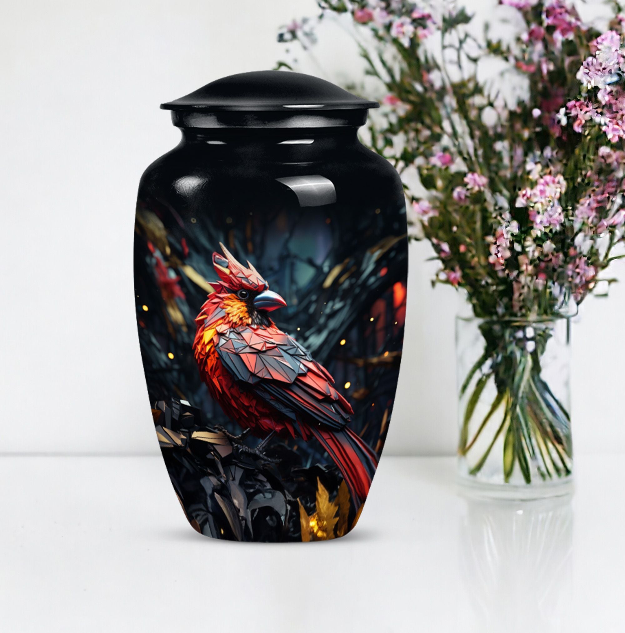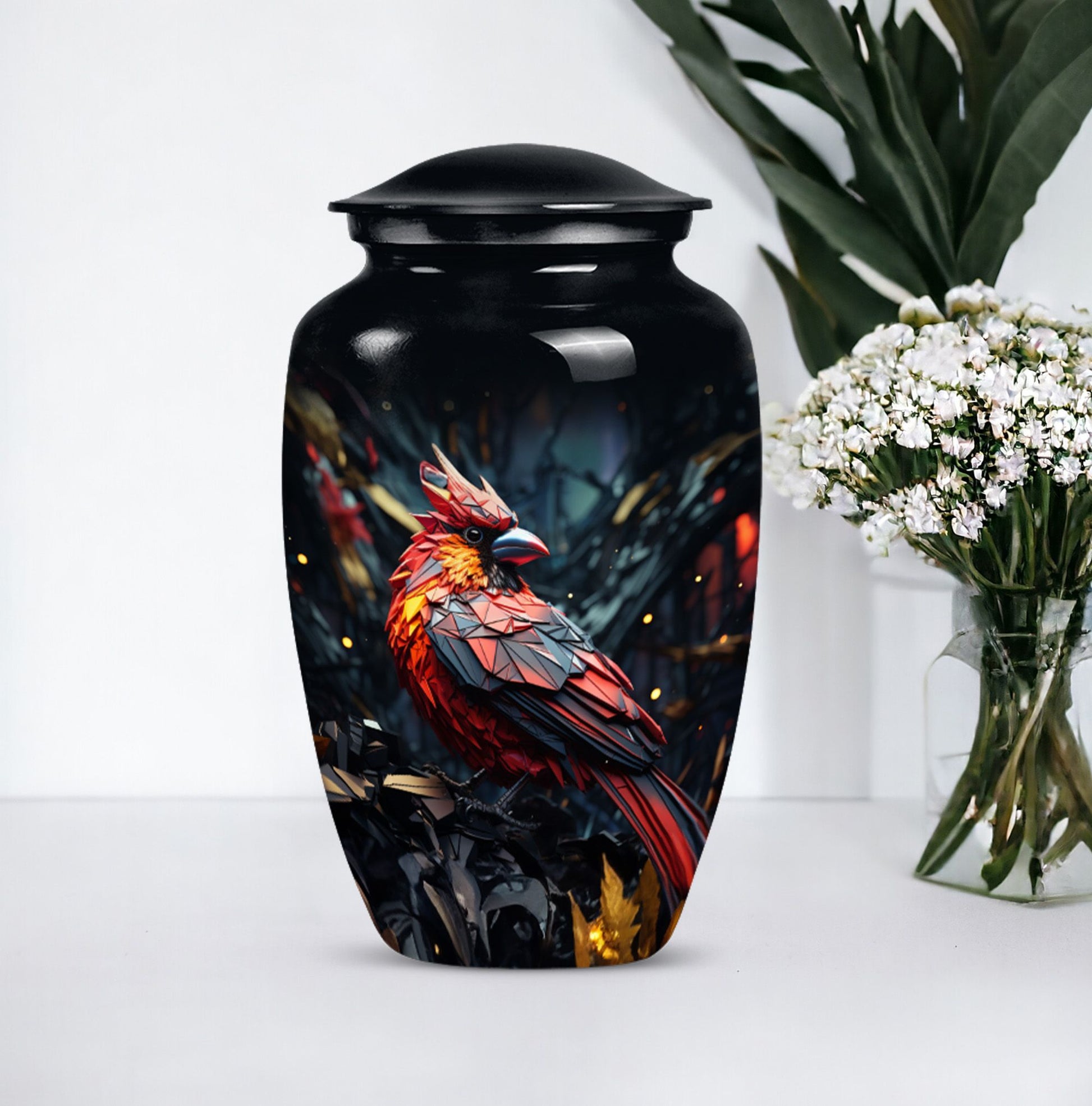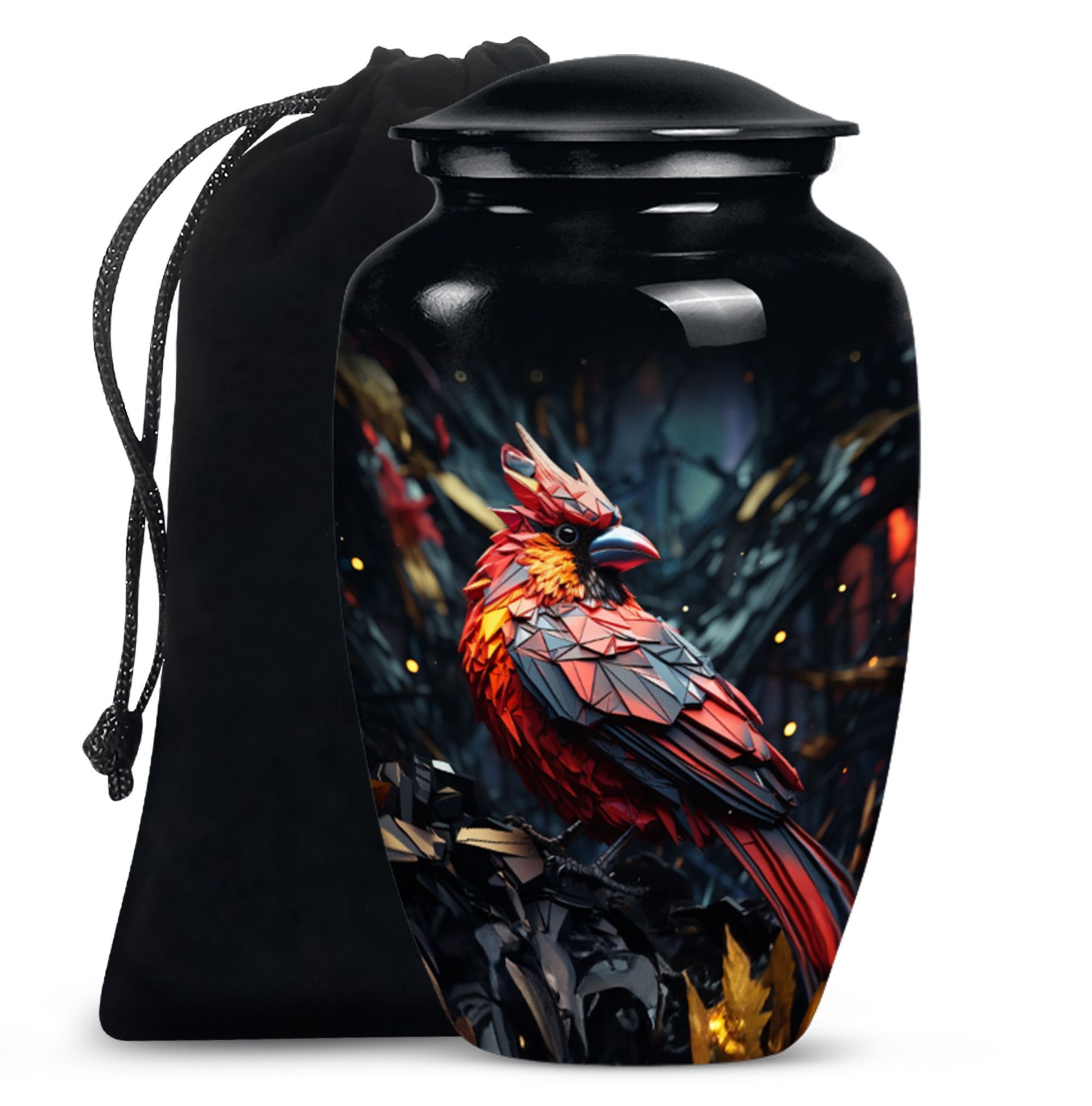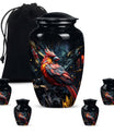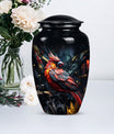 Embrace a beautiful tribute to your loved one with our 10-inch Cardinal Bird Urn, a timeless solution to honor their legacy. This tier-one funeral burial urn is designed to store adult human ashes, serving as a heartfelt memorial. Its classic urn design, paired with an abstract theme handcrafted in high-quality aluminium, accentuates its simple elegance. The sizeable capacity of 200 cubic inches ensures it can effortlessly contain your precious memories. Weighing a comfortable 3.3 pounds, and measuring 10 inches in height, this large urn can seamlessly fit into any designated space or shaped shelf. It comes with a cosy velvet pouch for tasteful containment of ashes, adding an essential touch of privacy and respect. To make this piece even more special, it offers customization options, letting you personalize it with engraved names. This unique, cardinal bird urn, often searched as 'memorial urns' or 'burial large urn' brings a sense of calm and closure in difficult times. Please note, this product does not include design-related attributes.
