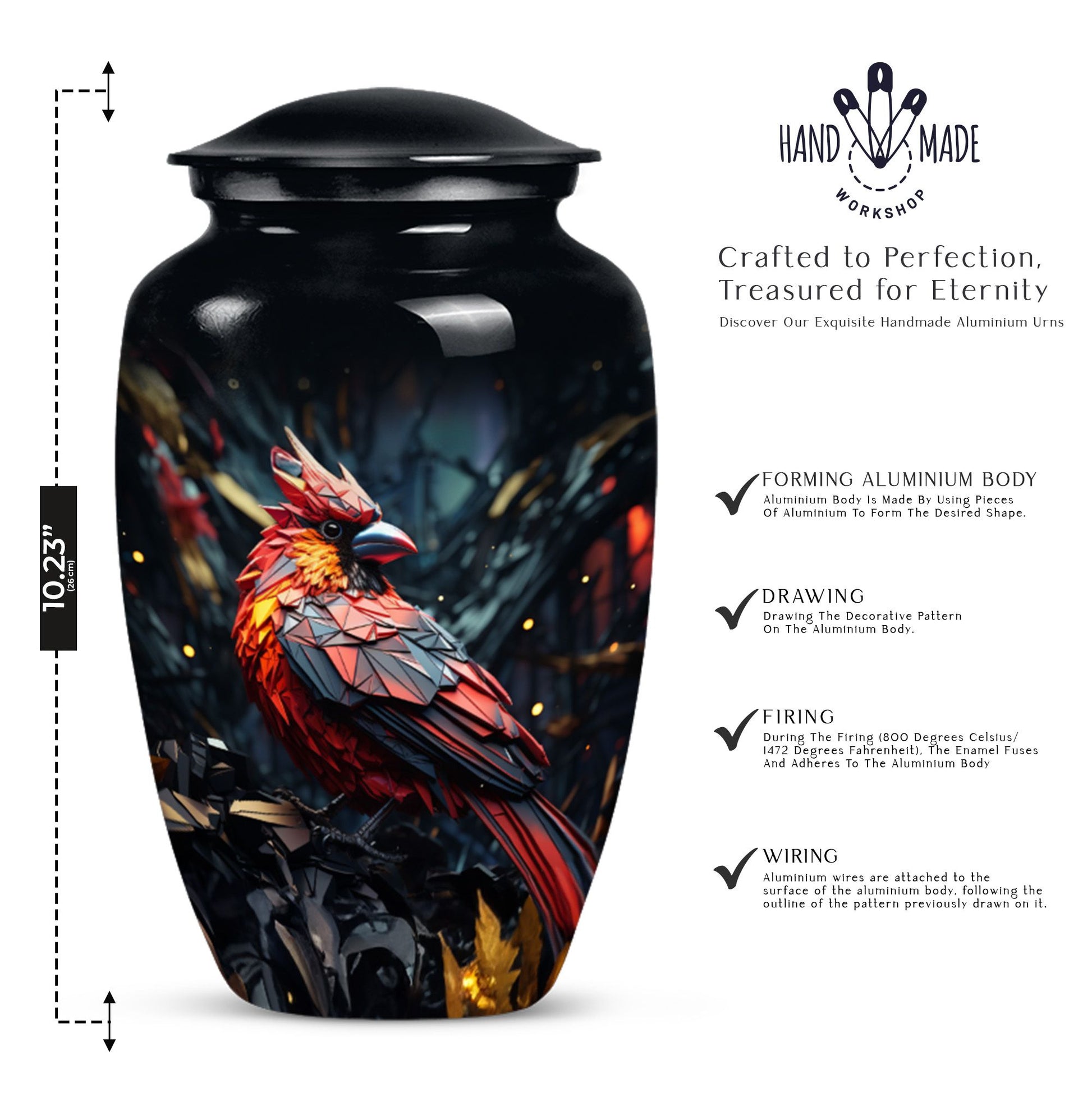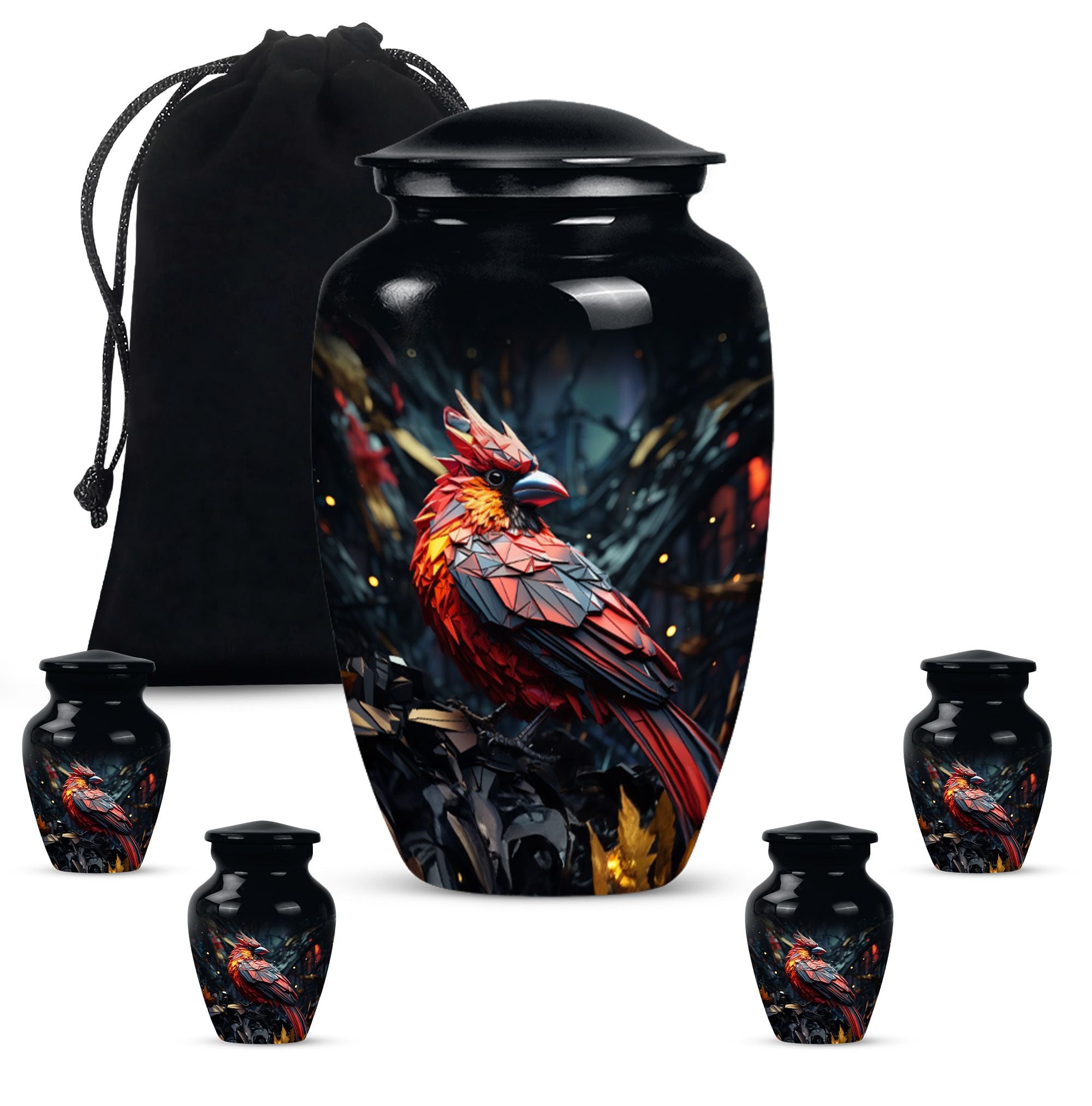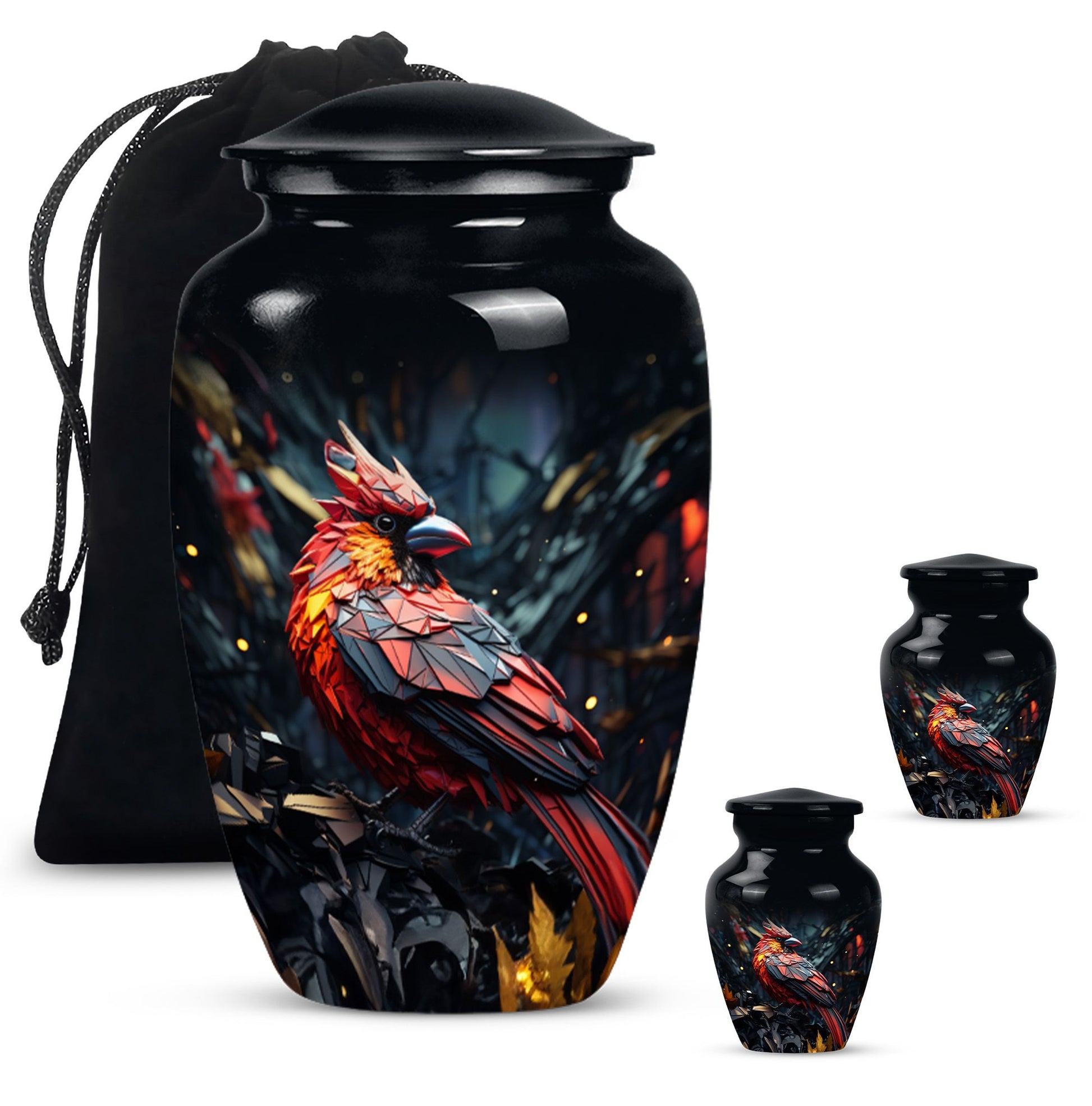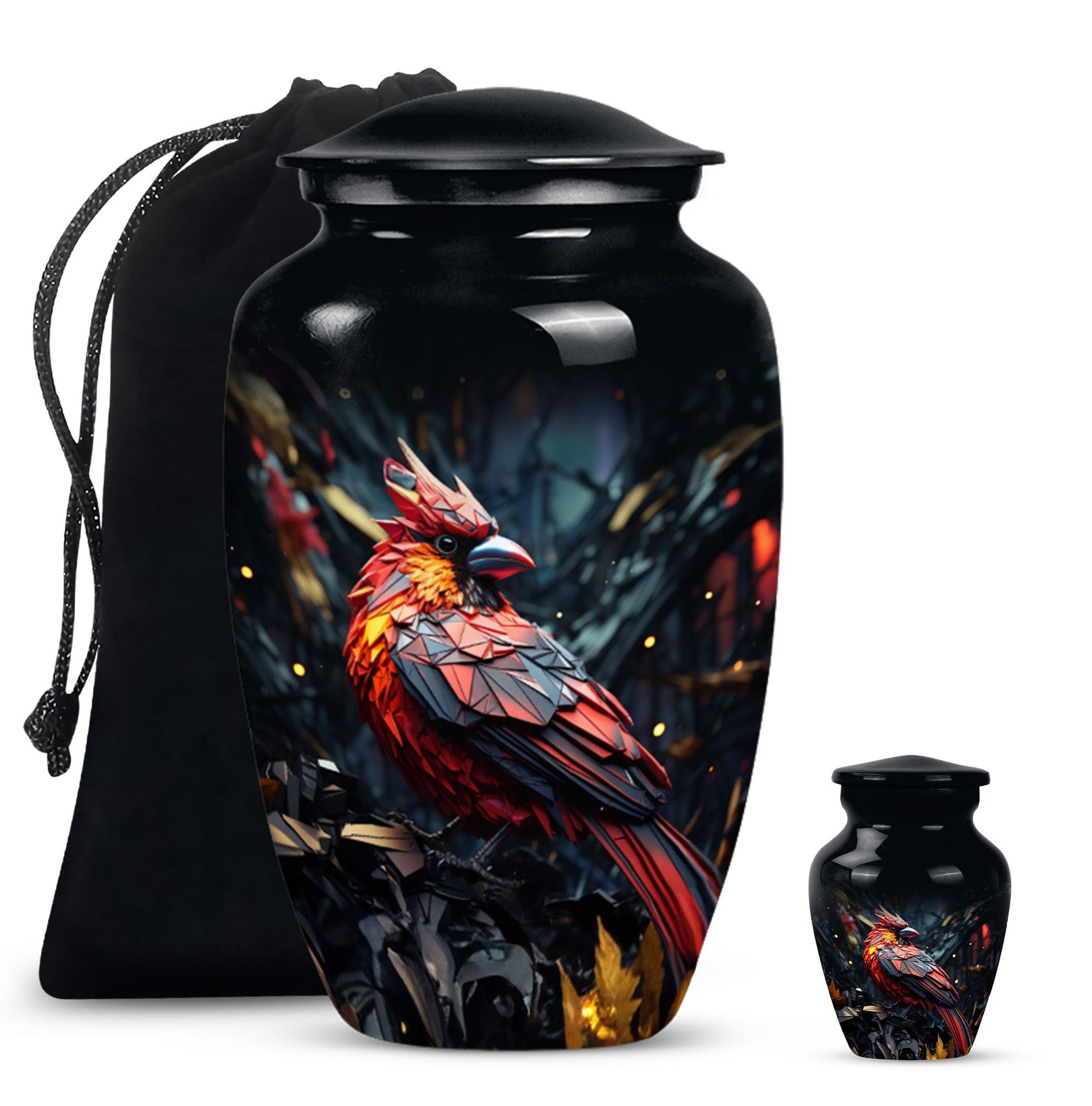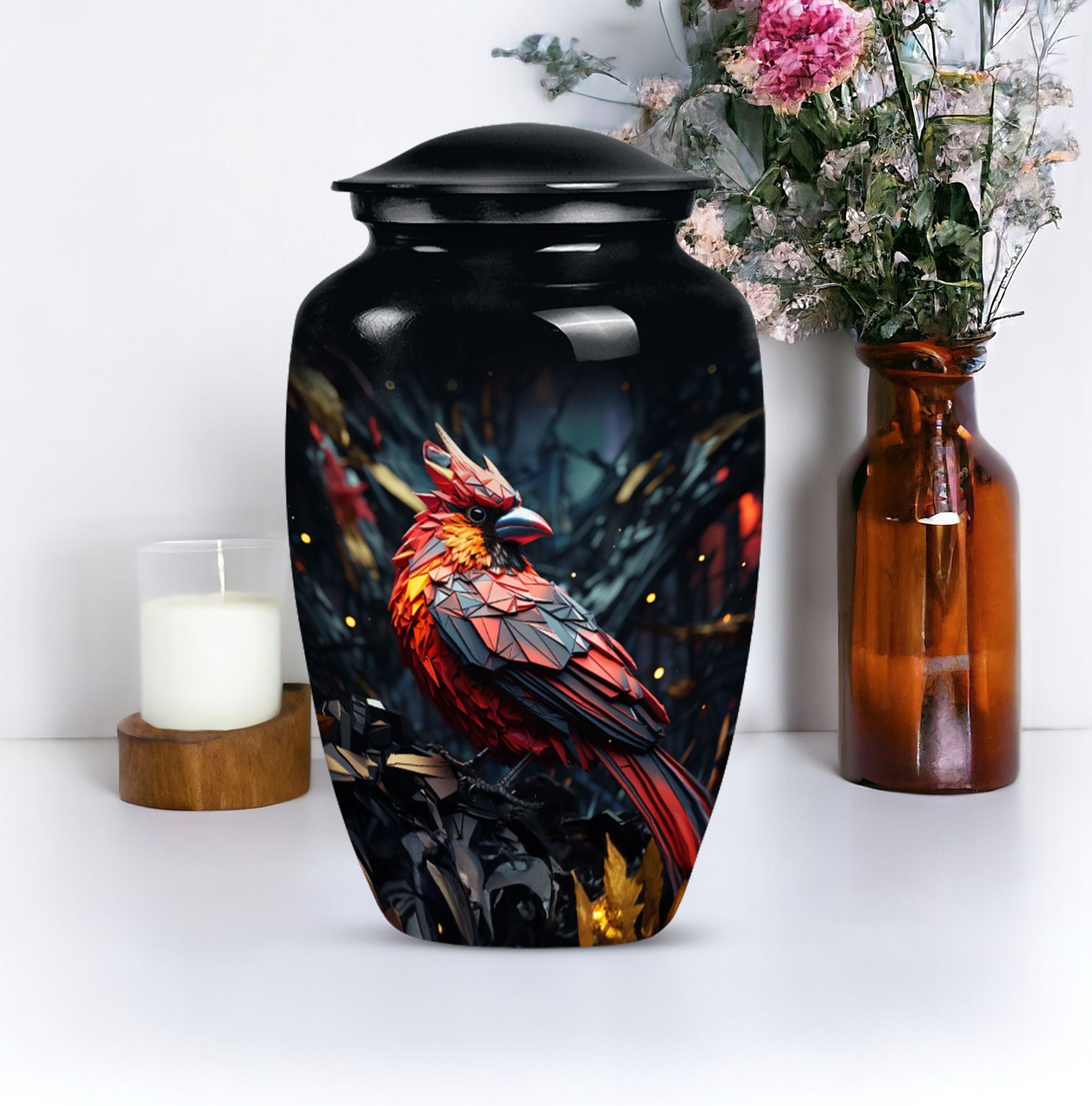 Embrace a beautiful tribute to your loved one with our 10-inch Cardinal Bird Urn, a timeless solution to honor their legacy. This tier-one funeral burial urn is designed to store adult human ashes, serving as a heartfelt memorial. Its classic urn design, paired with an abstract theme handcrafted in high-quality aluminium, accentuates its simple elegance. The sizeable capacity of 200 cubic inches ensures it can effortlessly contain your precious memories. Weighing a comfortable 3.3 pounds, and measuring 10 inches in height, this large urn can seamlessly fit into any designated space or shaped shelf. It comes with a cosy velvet pouch for tasteful containment of ashes, adding an essential touch of privacy and respect. To make this piece even more special, it offers customization options, letting you personalize it with engraved names. This unique, cardinal bird urn, often searched as 'memorial urns' or 'burial large urn' brings a sense of calm and closure in difficult times. Please note, this product does not include design-related attributes.