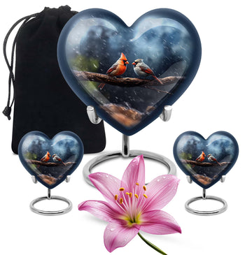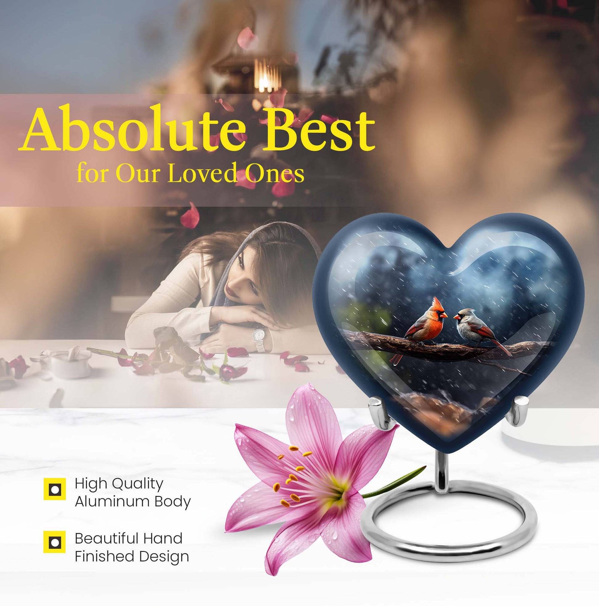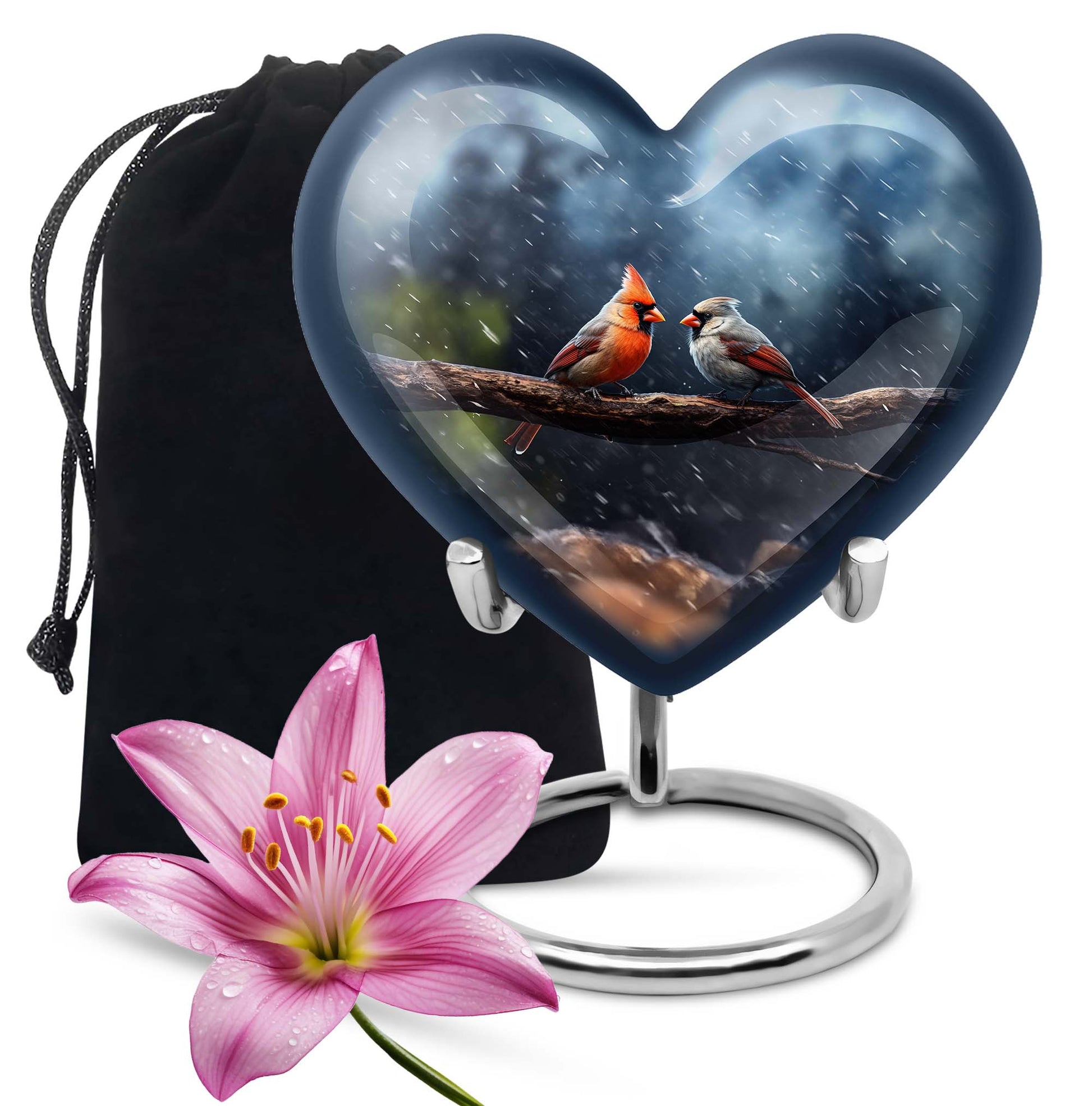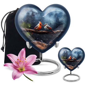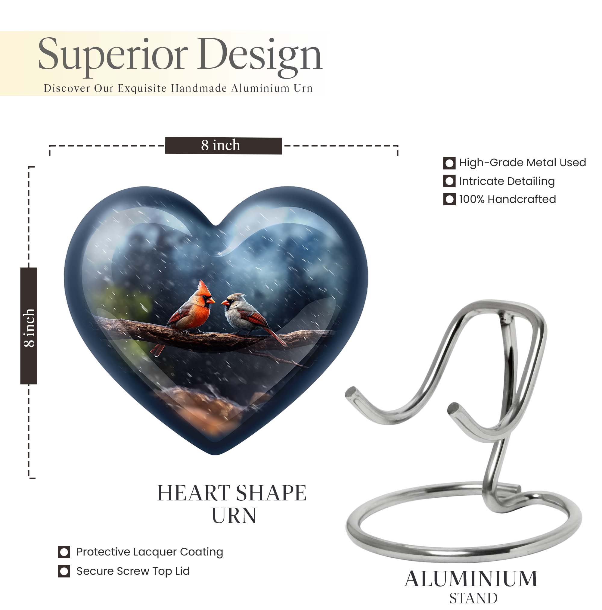 Immerse yourself in a profound moment of remembrance with this exquisite Cardinal Bird Urn, a timeless symbol for the embarkation of the soul's celestial journey. Carefully crafted from high-quality Aluminium, this 10-inch large urn weighs 3.3 pounds and exhibits an abstract theme that whispers comfort through its sublime artistry. Shaped beautifully in a heart design, the urn profoundly represents an unending bond of love and devotion toward the departed soul. It offers a substantial capacity of 200 cubic inches, ensuring a secure and dignified containment of ashes. What makes this cremation funeral urn genuinely distinctive, is the possibility to make it even more personal. You can add your loved one's engraved name on it, making it an everlasting memorial. This package of memorial urns also includes a velvet pouch, perfect for holding the cremains safely and respectfully. Finally, the cardinal bird urn integrates well with relevant search queries such as funeral decorative urns, human urn ashes, urns for ashes, and cremation urns for human ashes adult male, making it highly discoverable via SEO. Remember, honor, and cherish your departed loved ones with this thoughtfully crafted, Cardinal Bird Urn.