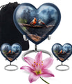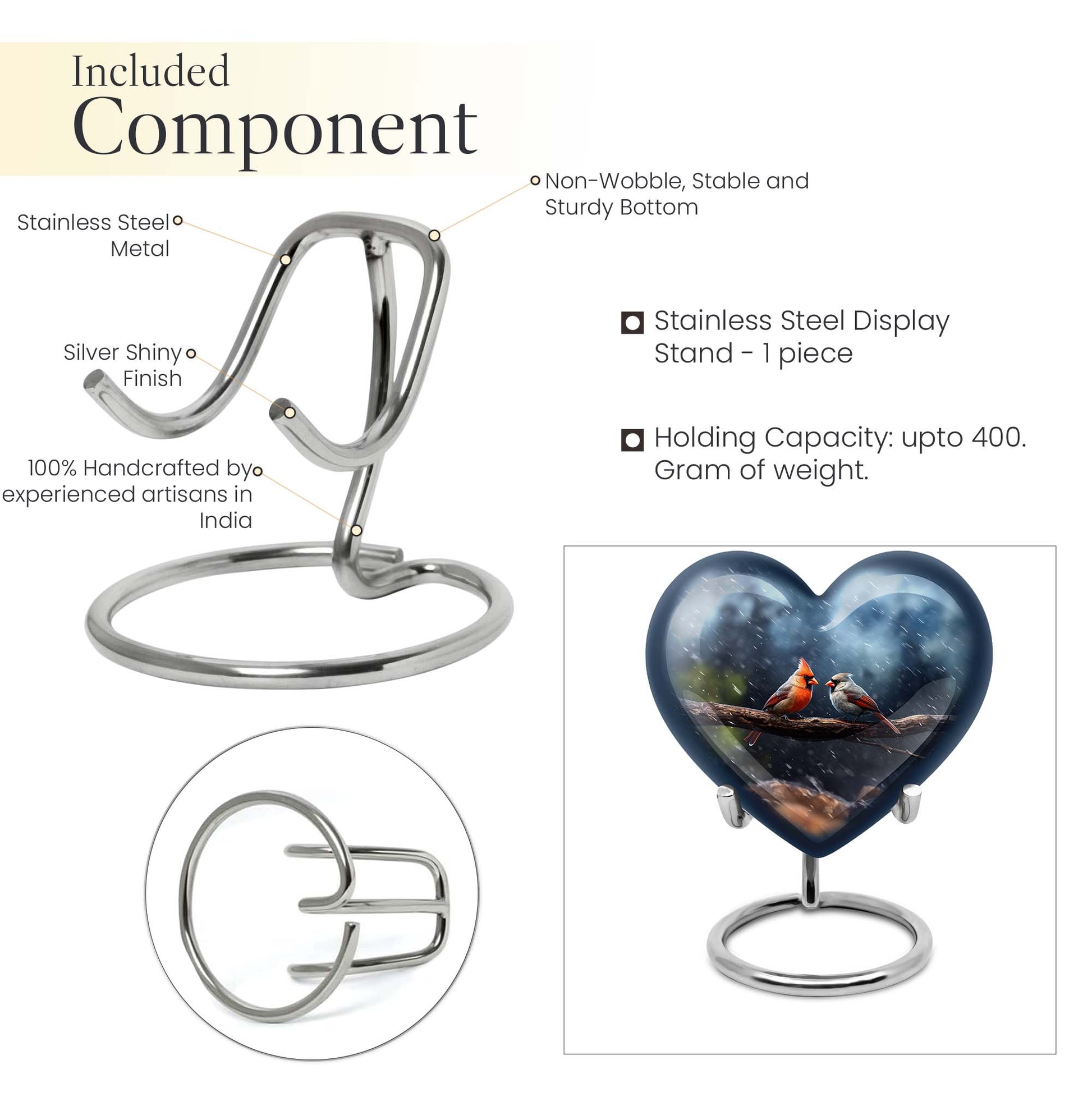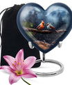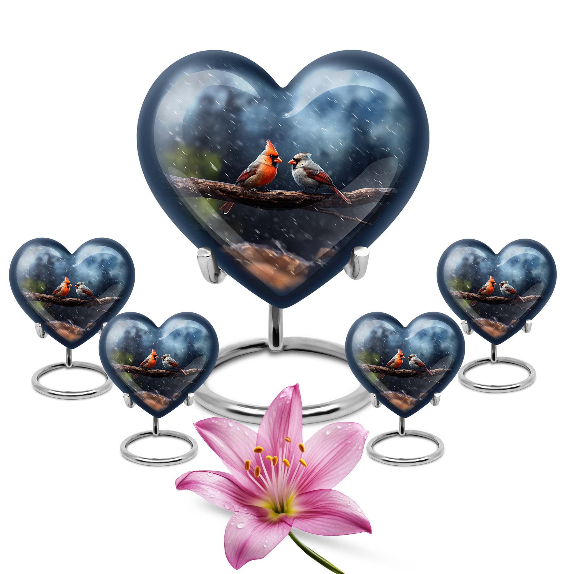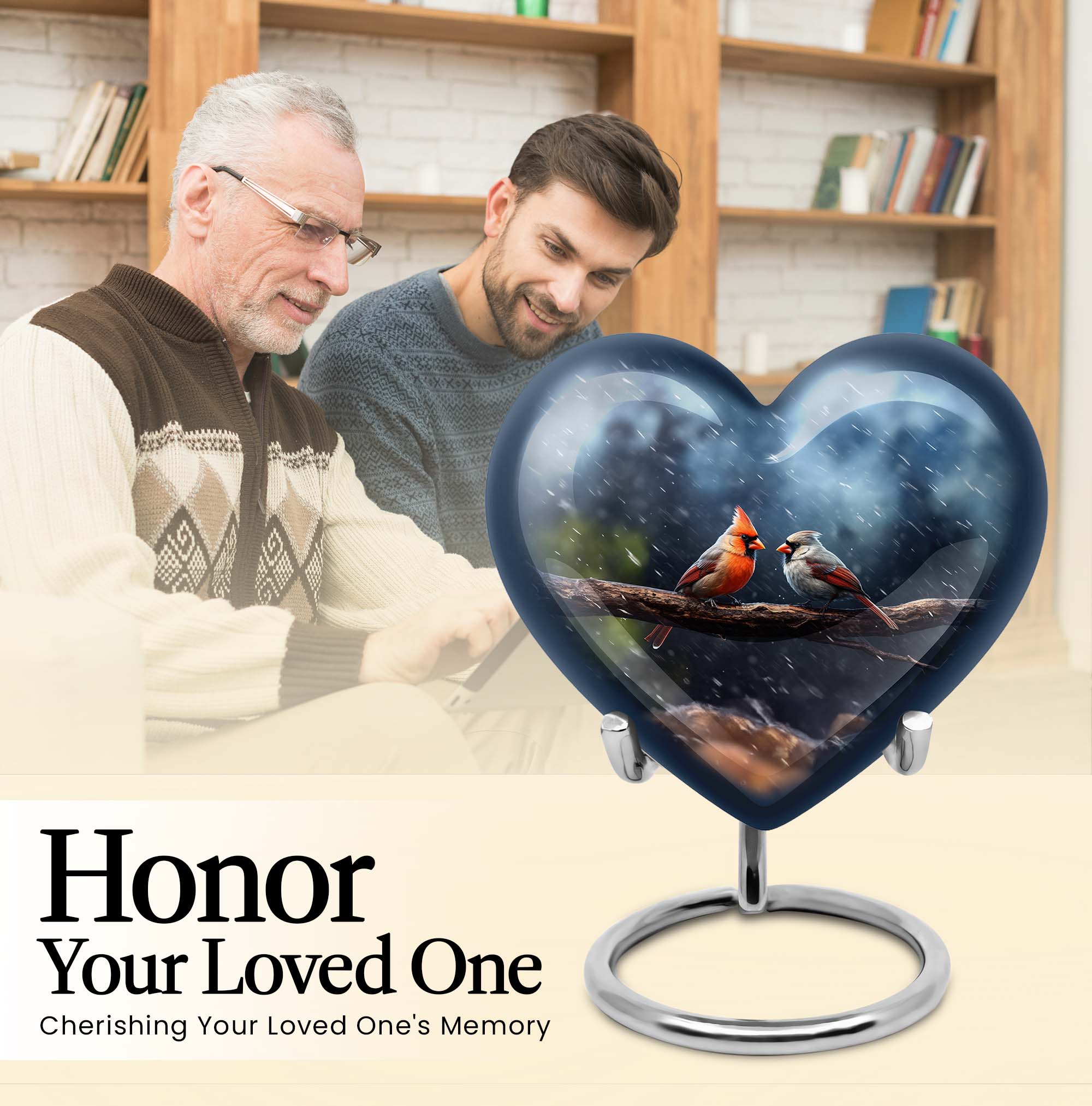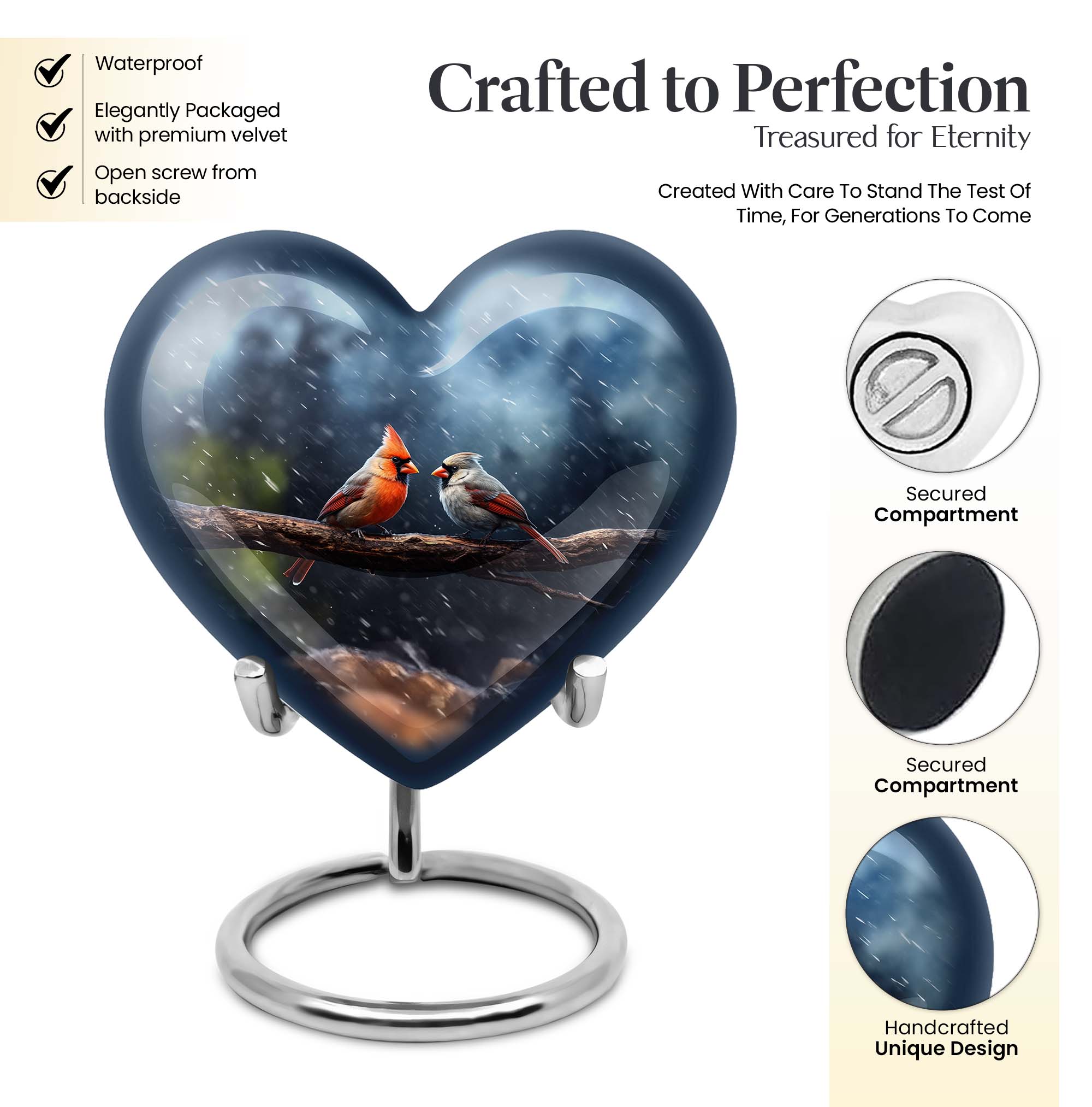 Immerse yourself in a profound moment of remembrance with this exquisite Cardinal Bird Urn, a timeless symbol for the embarkation of the soul's celestial journey. Carefully crafted from high-quality Aluminium, this 10-inch large urn weighs 3.3 pounds and exhibits an abstract theme that whispers comfort through its sublime artistry. Shaped beautifully in a heart design, the urn profoundly represents an unending bond of love and devotion toward the departed soul. It offers a substantial capacity of 200 cubic inches, ensuring a secure and dignified containment of ashes. What makes this cremation funeral urn genuinely distinctive, is the possibility to make it even more personal. You can add your loved one's engraved name on it, making it an everlasting memorial. This package of memorial urns also includes a velvet pouch, perfect for holding the cremains safely and respectfully. Finally, the cardinal bird urn integrates well with relevant search queries such as funeral decorative urns, human urn ashes, urns for ashes, and cremation urns for human ashes adult male, making it highly discoverable via SEO. Remember, honor, and cherish your departed loved ones with this thoughtfully crafted, Cardinal Bird Urn.
